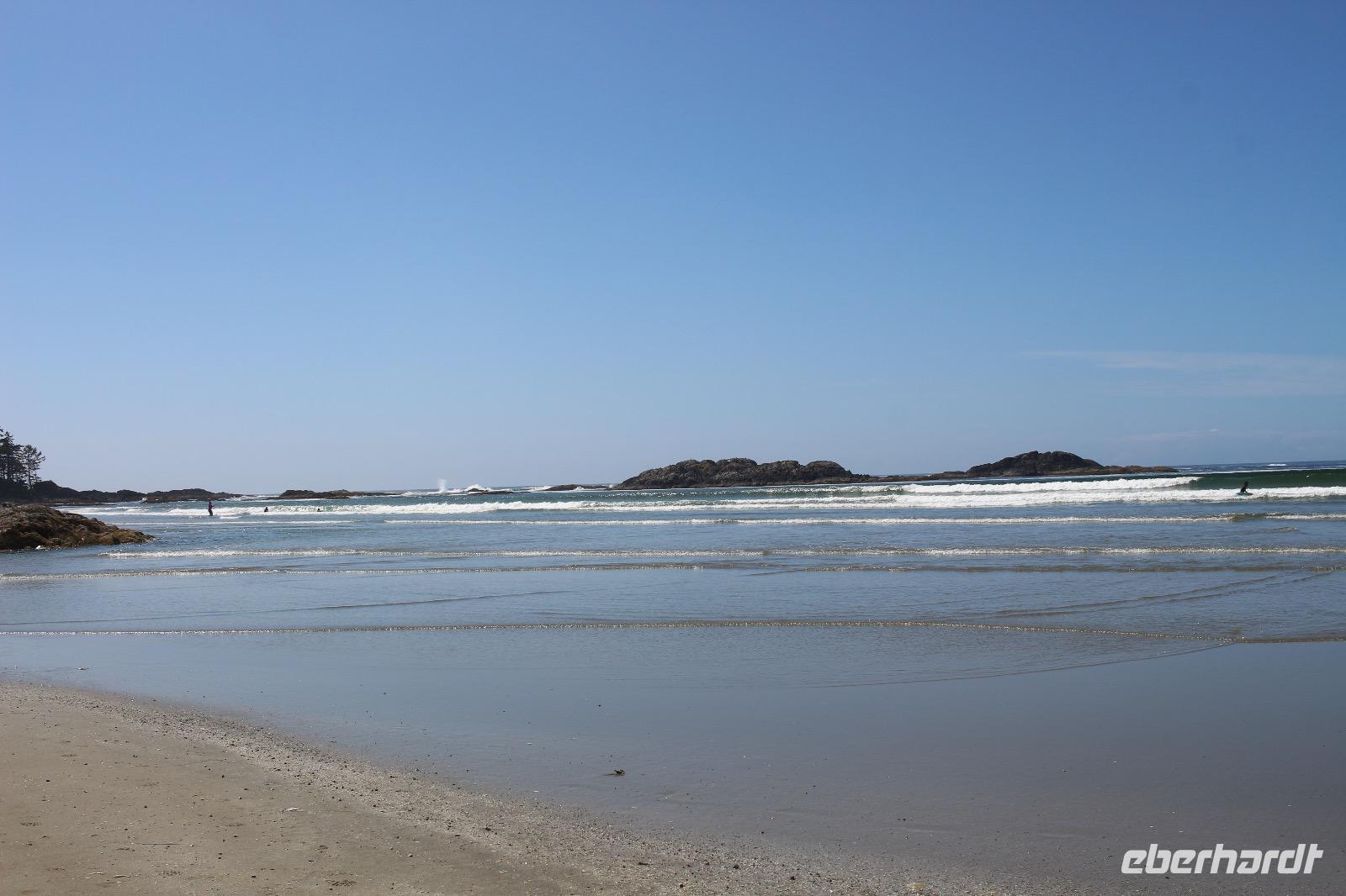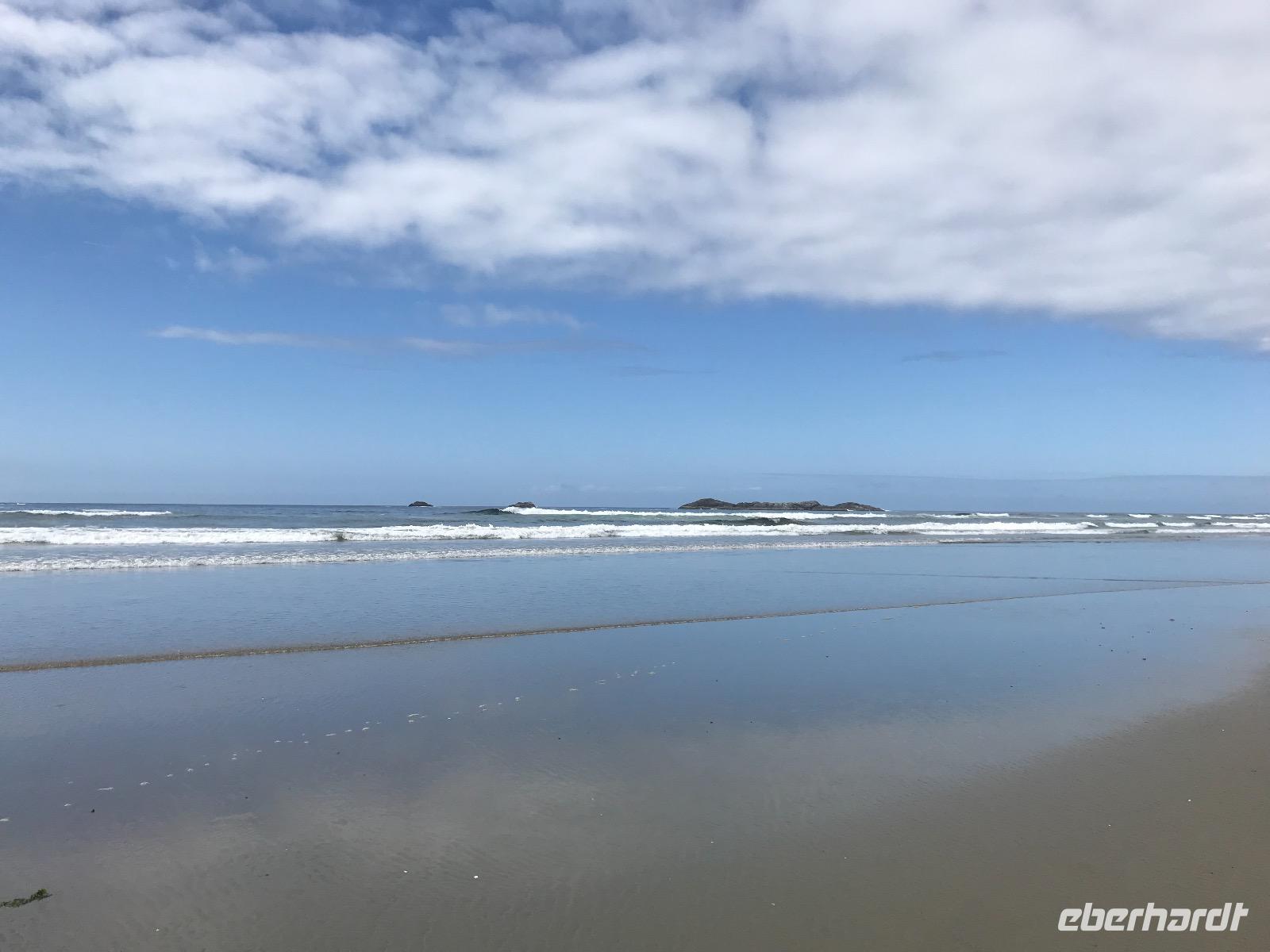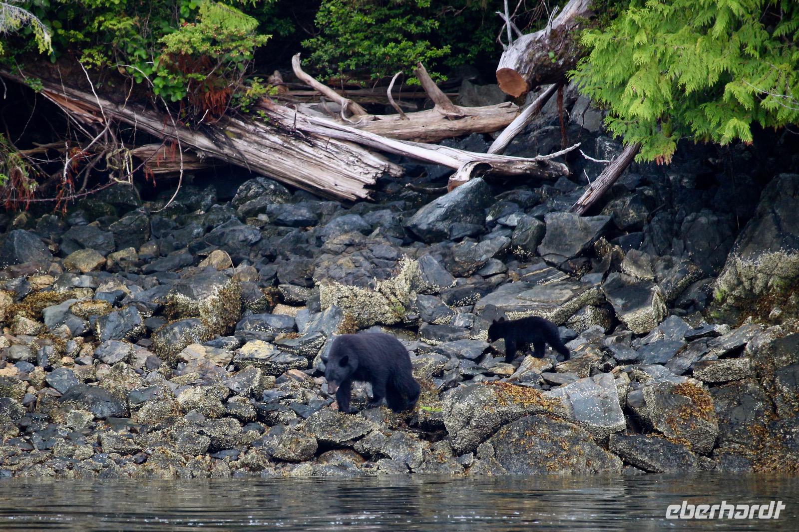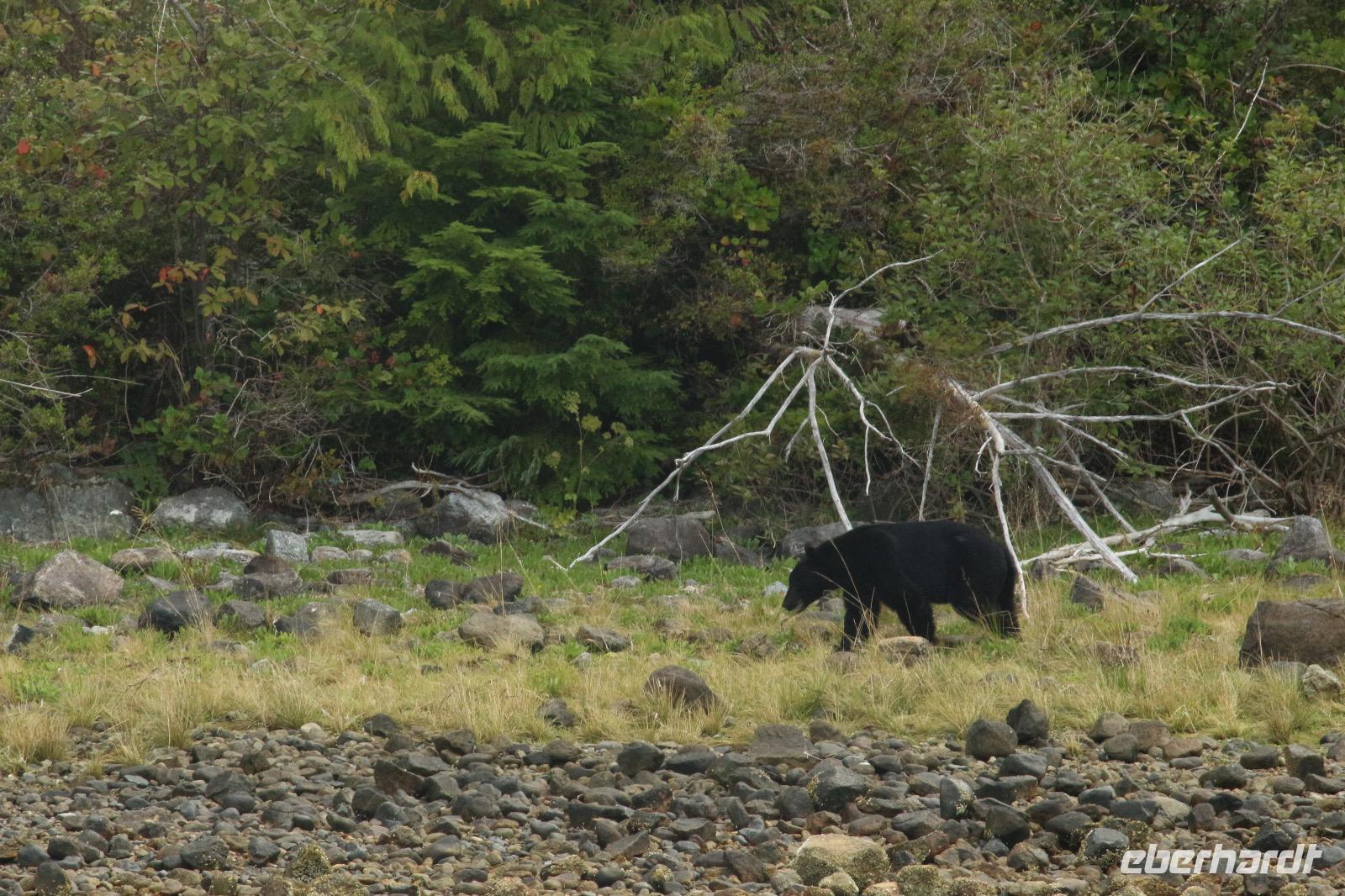 Heute begann der Tag in aller Frühe und bereits vor dem Frühstück trafen wir uns am Bus. Jedoch sollte niemand Hunger leiden, so stand für alle ein Frühstückspaket bereit. Nach einer kurzen Busfahrt kamen wir an einem Bootshaus an, wo wir uns für die heutige Bärenbeobachtungstour eincheckten. Nachdem die Formalitäten geklärt waren, blieb noch etwas Zeit, um unser Frühstück zu verzehren, wobei bereits die ersten Tiere gesichtet wurden: Fischotter. Zufrieden mit diesem ersten Erfolgserlebnis gingen wir schließlich an Bord unseres mit 500 PS ausgestatteten Bootes. Unser Kapitän und Reiseleiter für diesen Ausflug brachte uns zunächst etwas weg von der Ortschaft, wobei wir die Kraft des Motors durch die hohe Fahrtgeschwindigkeit erstmals erahnen konnten. Aktuell herrschte Ebbe vor, sodass die hier ansässigen Schwarzbären normalerweise herauskommen, um auf dem schlammigen Boden nach Nahrung zu suchen. Unter den Steinen finden sie zahlreiche Leckereien, wie beispielsweise Muscheln und kleine Krabben. In der Hoffnung, ein solches Szenario beobachten zu können, hielten wir fleißig Ausschau. Unsere Geduld sollte belohnt werden, denn schon bald zeigte sich ein ausgewachsener Schwarzbär mit seinen zwei Jungen. Wir fotografierten fleißig und unser Kapitän brachte uns immer weiter heran. Nach kurzer Weiterfahrt konnte bereits der nächste Bär verzeichnet werden, diesmal ein einzelner. Auch er befand sich auf Nahrungssuche und wurde von uns dabei bestens beobachtet uns natürlich fotografiert. Auf dem Rückweg entdeckten wir nochmal eine Mutter mit ihrem Jungen, jedoch in weiterer Entfernung, sowie schließlich zum Abschluss noch einen Weißkopfadler. Während der Tour hatten wir auch viel gelernt, sodass wir mit zahlreichen neuen Erkenntnissen wieder in Tofino ankamen. Hier wurden wir mit heißem Pfefferminztee erwartet, bevor wir mit dem Bus zum Pacific Rim Nationalpark aufbrachen.