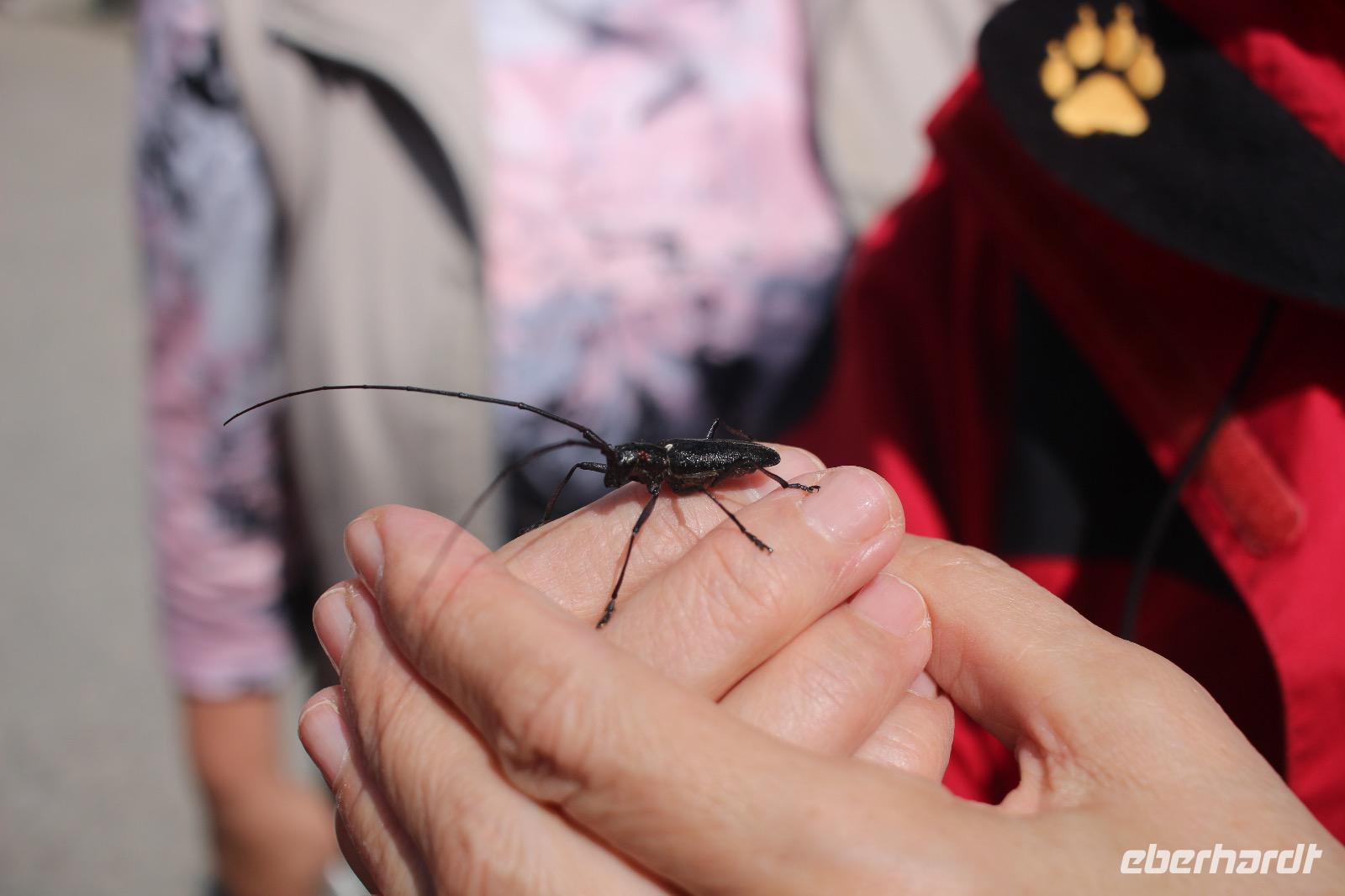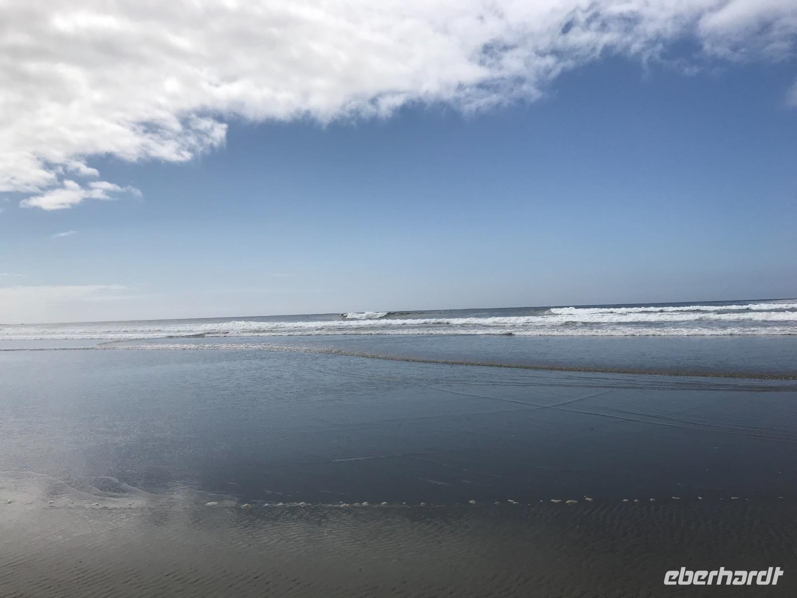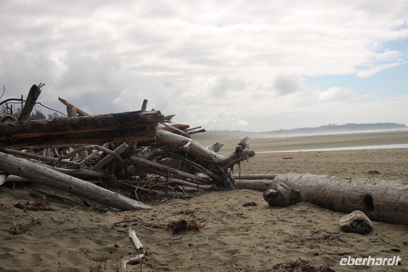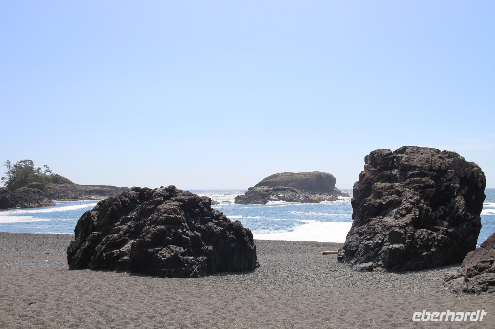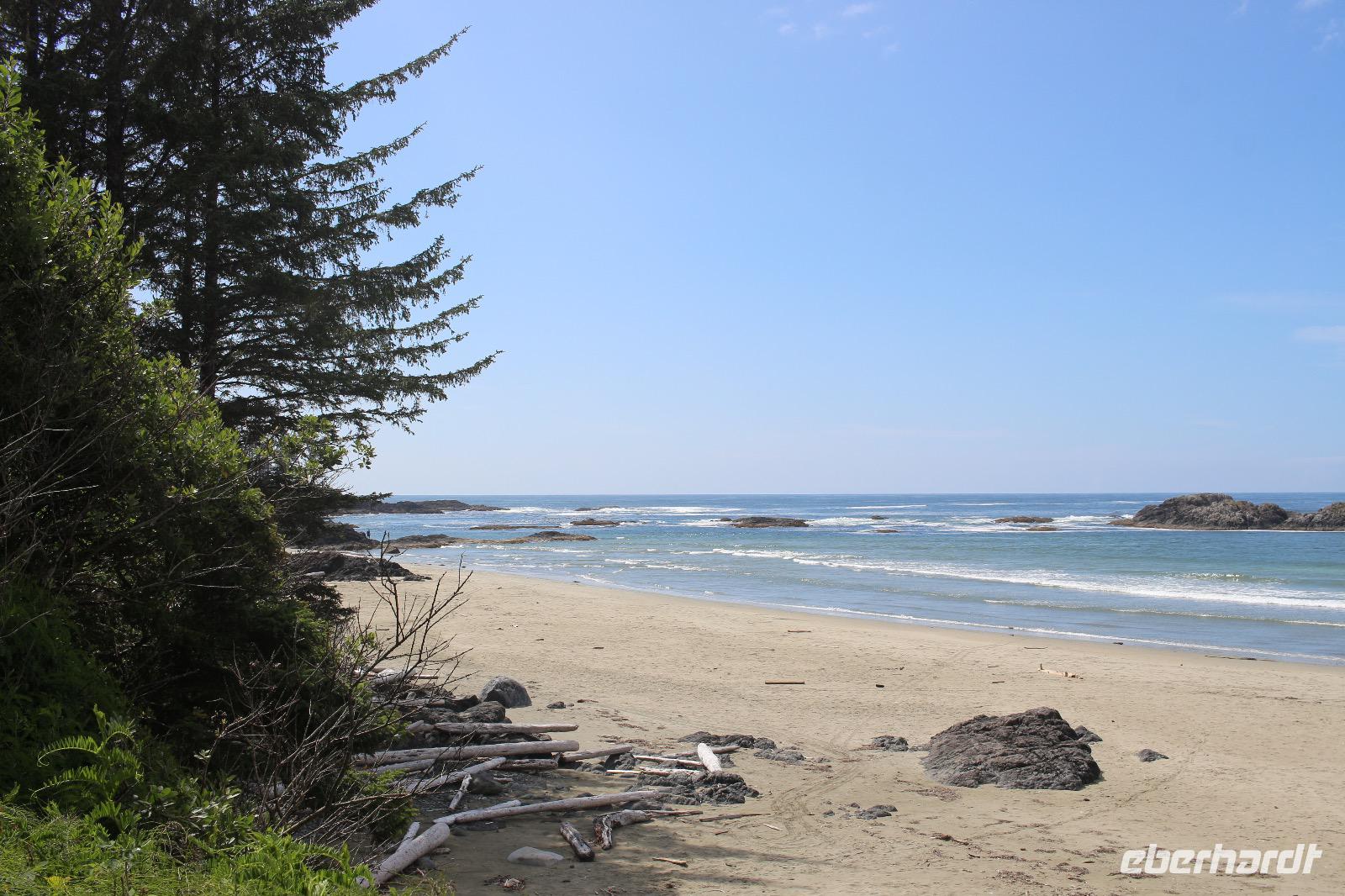 Heute begann der Tag in aller Frühe und bereits vor dem Frühstück trafen wir uns am Bus. Jedoch sollte niemand Hunger leiden, so stand für alle ein Frühstückspaket bereit. Nach einer kurzen Busfahrt kamen wir an einem Bootshaus an, wo wir uns für die heutige Bärenbeobachtungstour eincheckten. Nachdem die Formalitäten geklärt waren, blieb noch etwas Zeit, um unser Frühstück zu verzehren, wobei bereits die ersten Tiere gesichtet wurden: Fischotter. Zufrieden mit diesem ersten Erfolgserlebnis gingen wir schließlich an Bord unseres mit 500 PS ausgestatteten Bootes. Unser Kapitän und Reiseleiter für diesen Ausflug brachte uns zunächst etwas weg von der Ortschaft, wobei wir die Kraft des Motors durch die hohe Fahrtgeschwindigkeit erstmals erahnen konnten. Aktuell herrschte Ebbe vor, sodass die hier ansässigen Schwarzbären normalerweise herauskommen, um auf dem schlammigen Boden nach Nahrung zu suchen. Unter den Steinen finden sie zahlreiche Leckereien, wie beispielsweise Muscheln und kleine Krabben. In der Hoffnung, ein solches Szenario beobachten zu können, hielten wir fleißig Ausschau. Unsere Geduld sollte belohnt werden, denn schon bald zeigte sich ein ausgewachsener Schwarzbär mit seinen zwei Jungen. Wir fotografierten fleißig und unser Kapitän brachte uns immer weiter heran. Nach kurzer Weiterfahrt konnte bereits der nächste Bär verzeichnet werden, diesmal ein einzelner. Auch er befand sich auf Nahrungssuche und wurde von uns dabei bestens beobachtet uns natürlich fotografiert. Auf dem Rückweg entdeckten wir nochmal eine Mutter mit ihrem Jungen, jedoch in weiterer Entfernung, sowie schließlich zum Abschluss noch einen Weißkopfadler. Während der Tour hatten wir auch viel gelernt, sodass wir mit zahlreichen neuen Erkenntnissen wieder in Tofino ankamen. Hier wurden wir mit heißem Pfefferminztee erwartet, bevor wir mit dem Bus zum Pacific Rim Nationalpark aufbrachen.