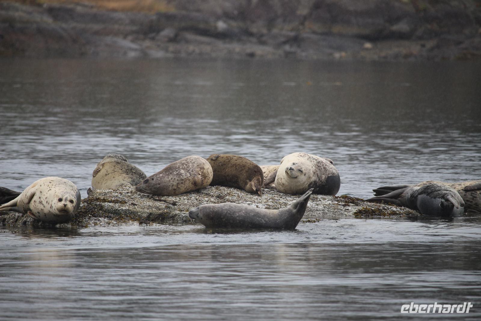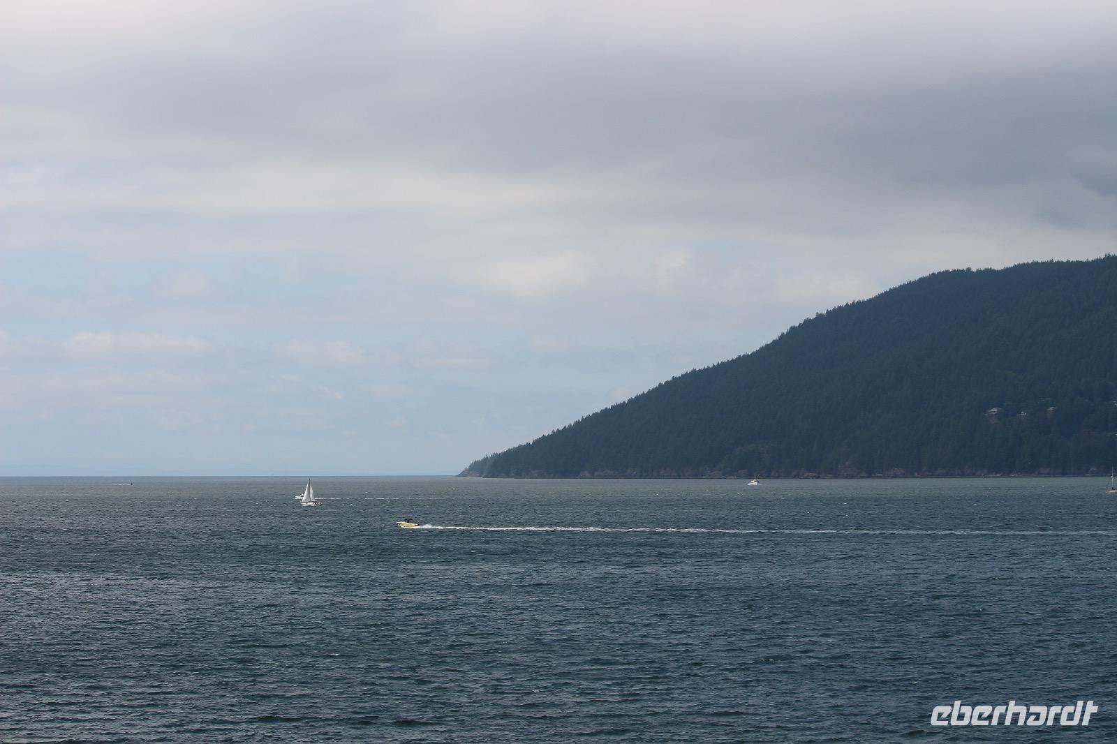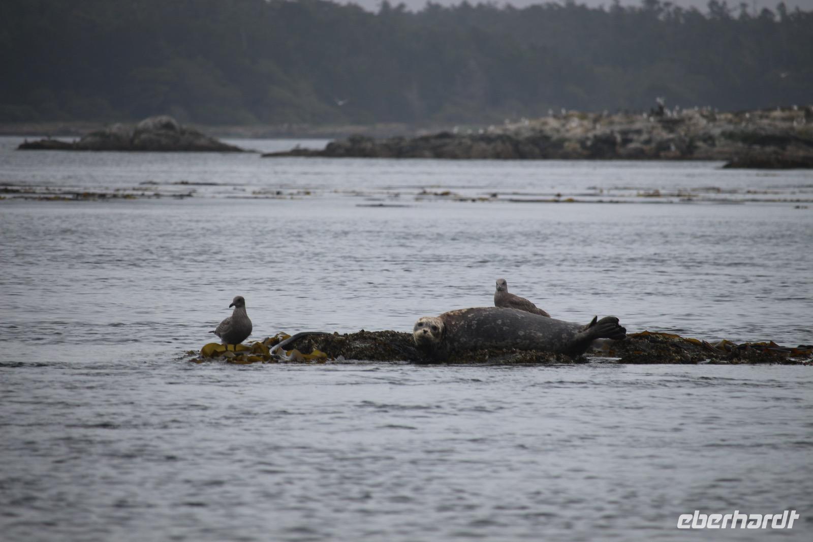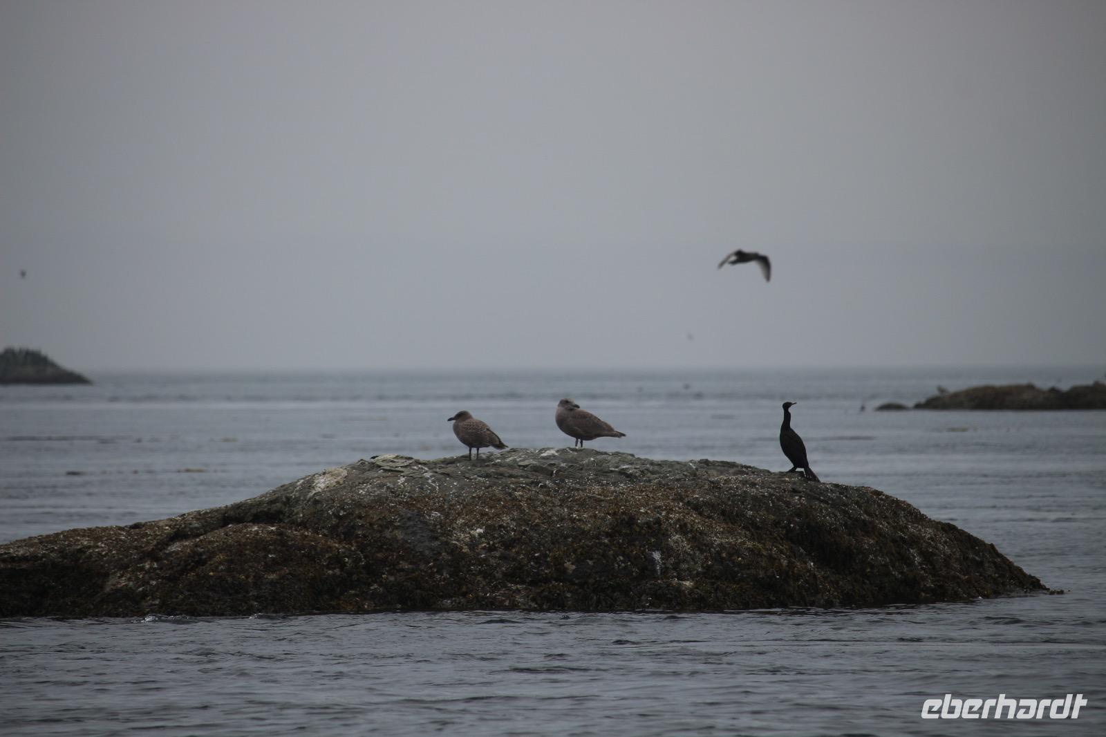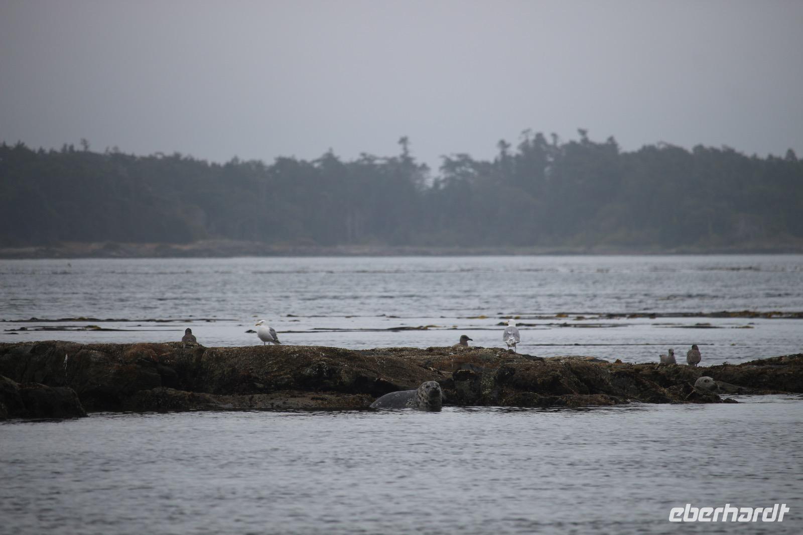 Heute verließen wir das Hotel nach dem Frühstück und begaben uns zum Hafen von Victoria, um die Walbeobachtung zu unternehmen. Zunächst wurden wir mit wärmenden Anzügen versorgt, in welchen wir uns ein wenig wie Michelin-Männchen fühlten. Anschließend ging es an Bord des Zodiacs und wir fuhren auf das Meer hinaus. Nach kurzer Zeit konnten wir in weiter Ferne bereits einige Orkas entdecken. Mit viel Geduld und guten Augen gelang es uns, noch weitere Tiere dieser Art erspähen. Viel Geschick sowie auch Glück waren gefragt, wenn man das eine oder andere gute Foto erhaschen wollte. Doch nicht nur Wale gab es zu entdecken, auch Möwen und Robben zeigten sich uns sehr zahlreich und waren auch wesentlich besser zu fotografieren. Nach ca. 2,5-stündiger Tour setzte mehr und mehr der Regen ein, sodass wir zurück zum Hafen fuhren. Sehr zufrieden begaben wir uns zum Fährhafen, um Vancouver Island nun zu verlassen.