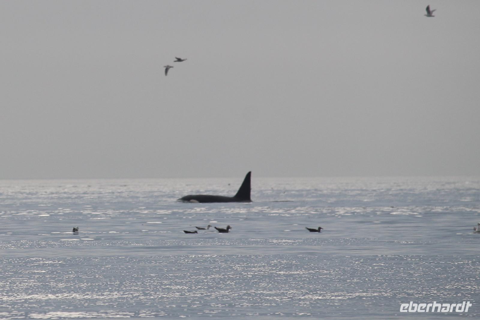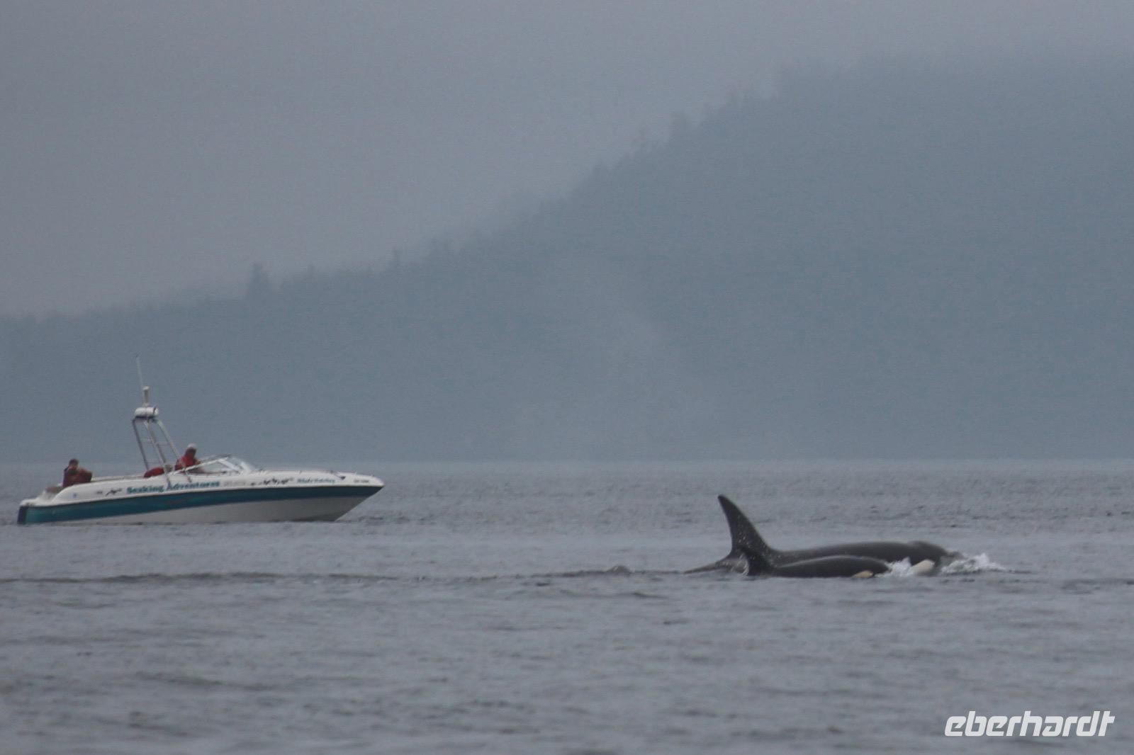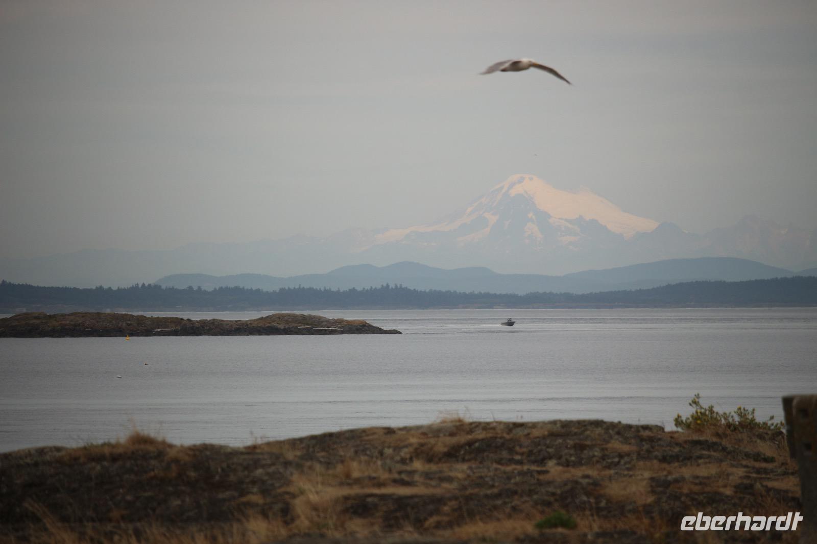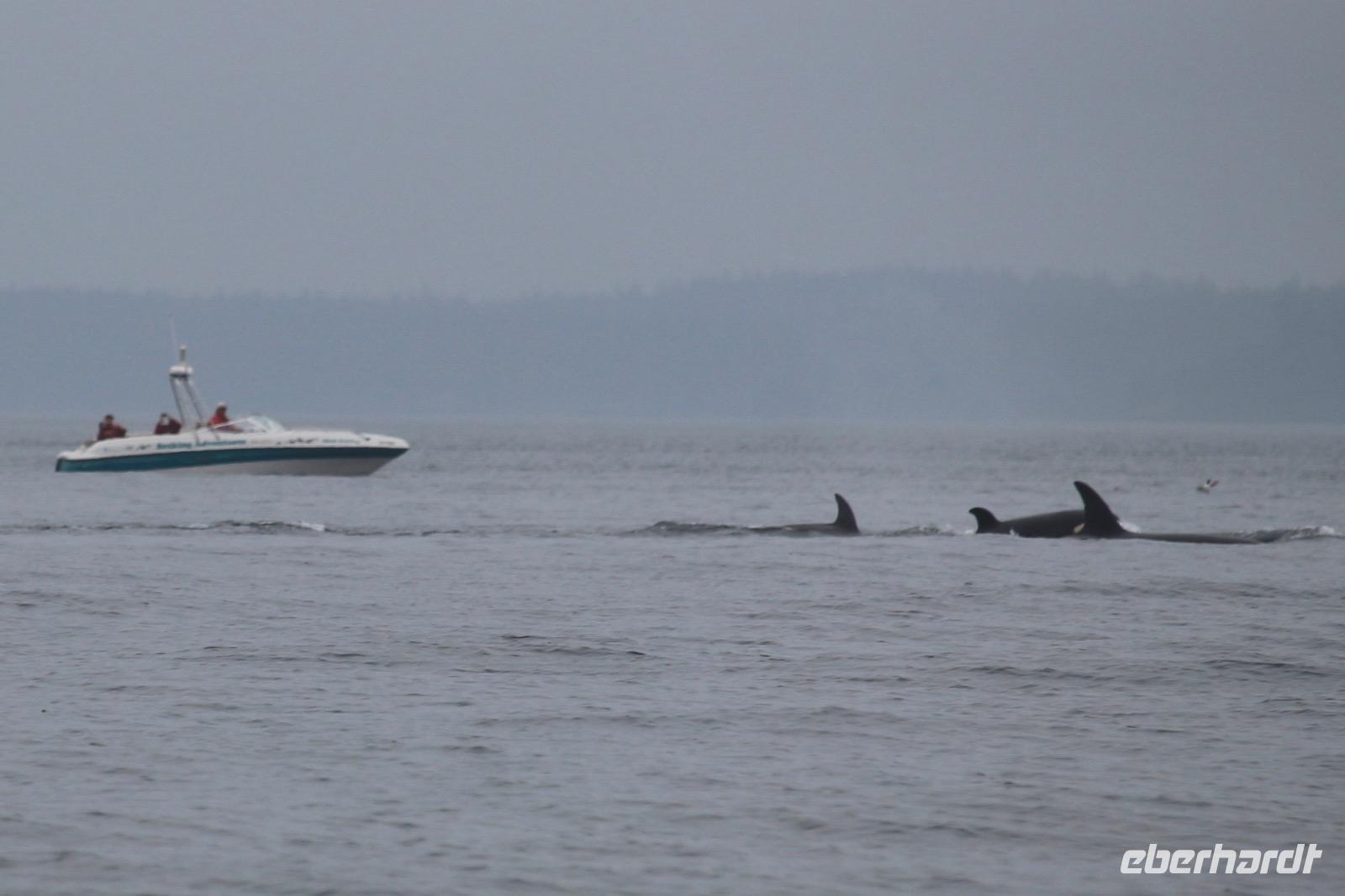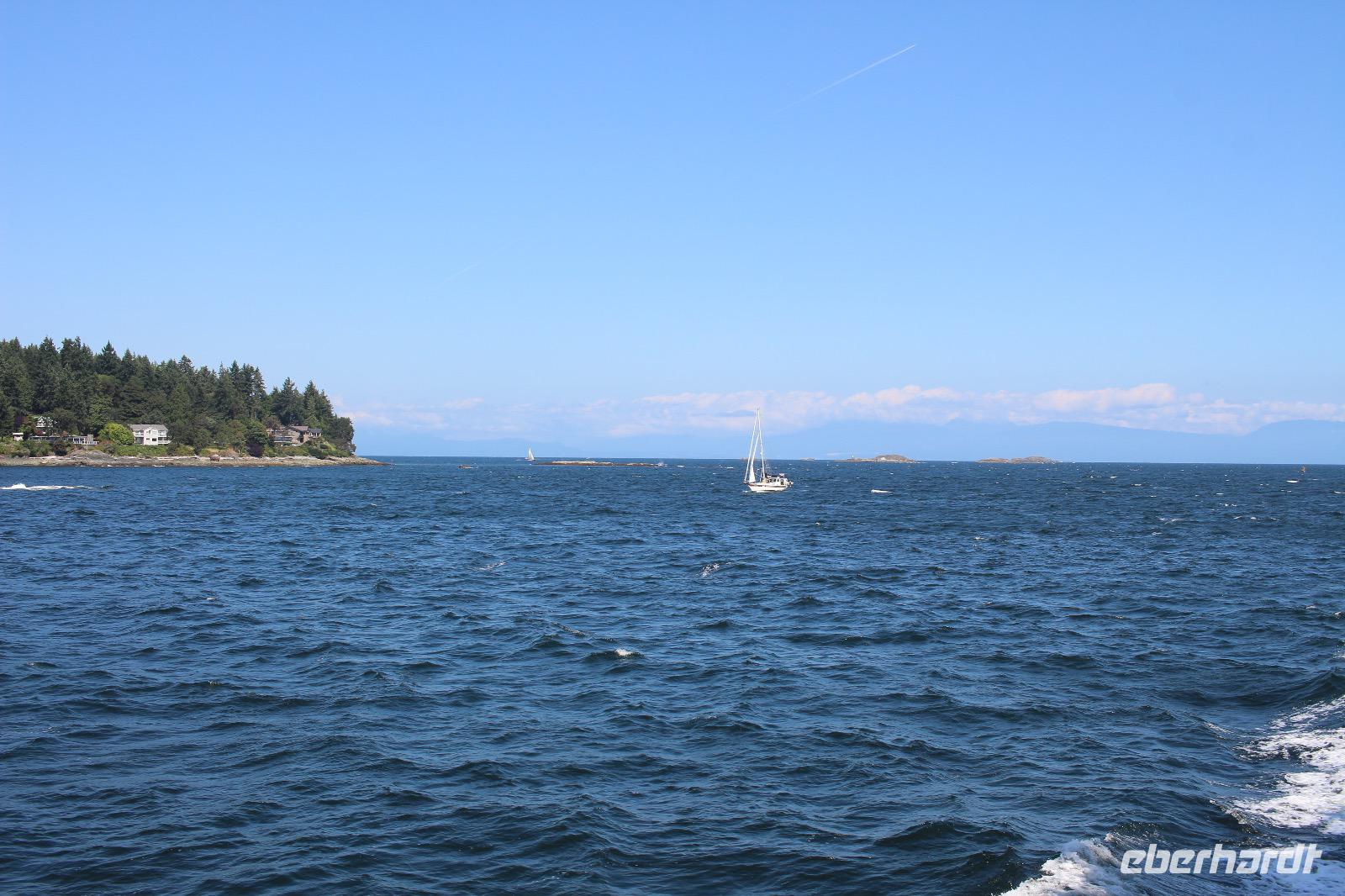 Heute verließen wir das Hotel nach dem Frühstück und begaben uns zum Hafen von Victoria, um die Walbeobachtung zu unternehmen. Zunächst wurden wir mit wärmenden Anzügen versorgt, in welchen wir uns ein wenig wie Michelin-Männchen fühlten. Anschließend ging es an Bord des Zodiacs und wir fuhren auf das Meer hinaus. Nach kurzer Zeit konnten wir in weiter Ferne bereits einige Orkas entdecken. Mit viel Geduld und guten Augen gelang es uns, noch weitere Tiere dieser Art erspähen. Viel Geschick sowie auch Glück waren gefragt, wenn man das eine oder andere gute Foto erhaschen wollte. Doch nicht nur Wale gab es zu entdecken, auch Möwen und Robben zeigten sich uns sehr zahlreich und waren auch wesentlich besser zu fotografieren. Nach ca. 2,5-stündiger Tour setzte mehr und mehr der Regen ein, sodass wir zurück zum Hafen fuhren. Sehr zufrieden begaben wir uns zum Fährhafen, um Vancouver Island nun zu verlassen.