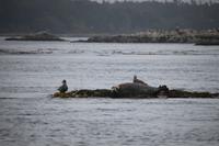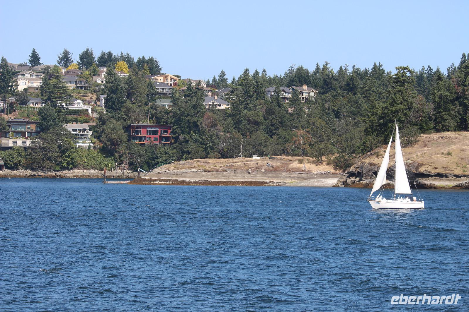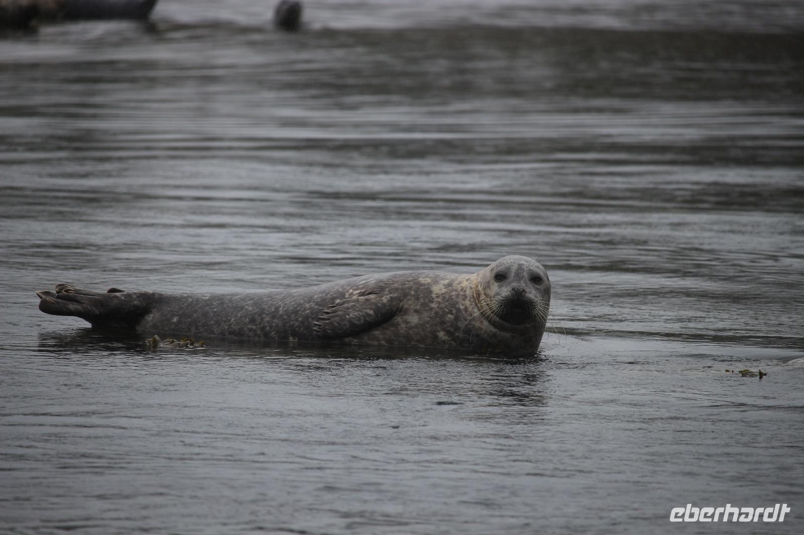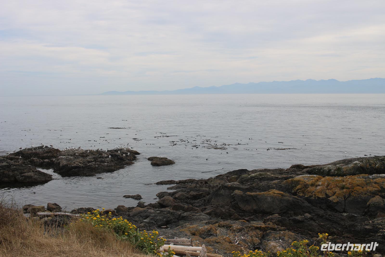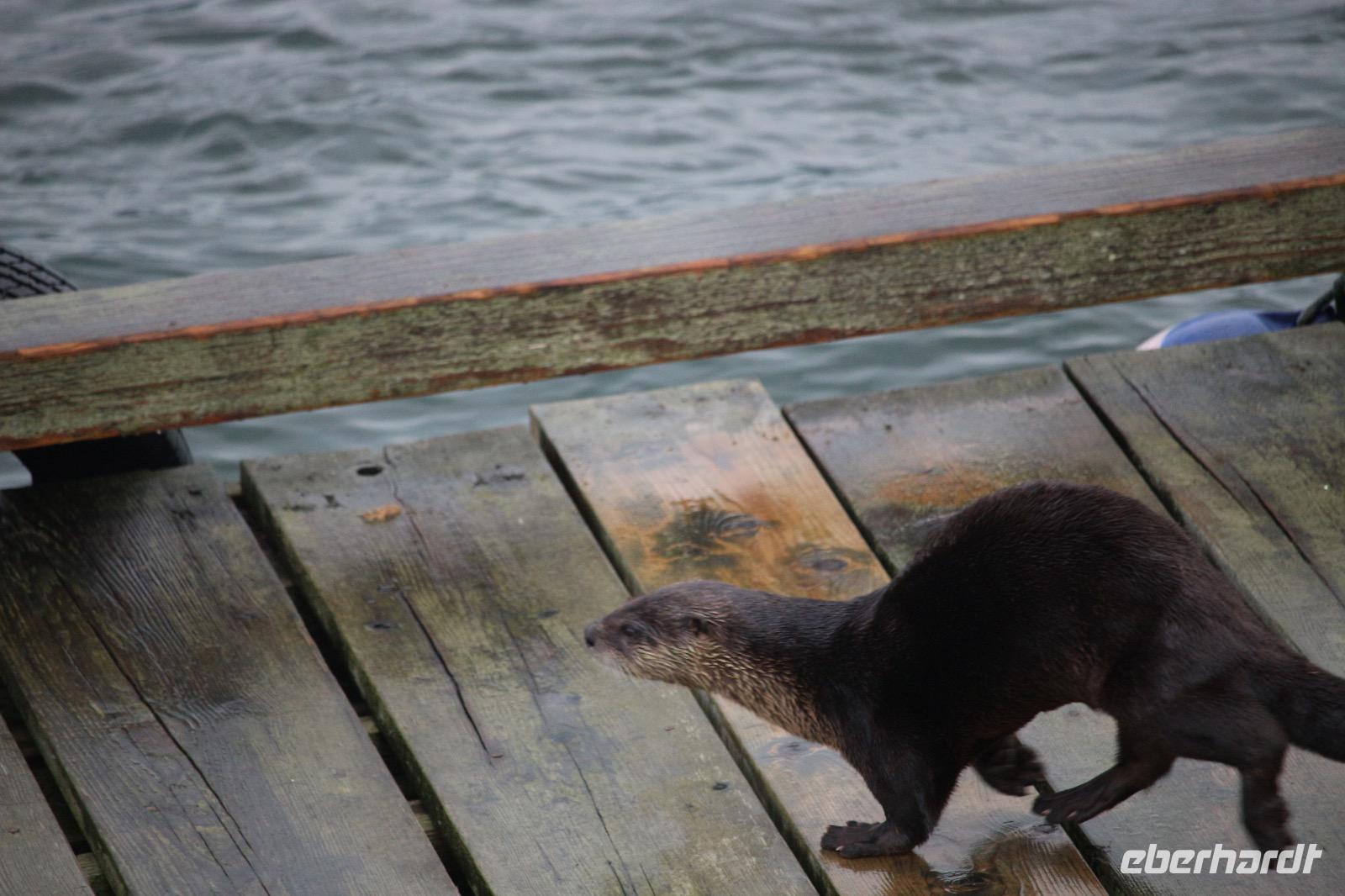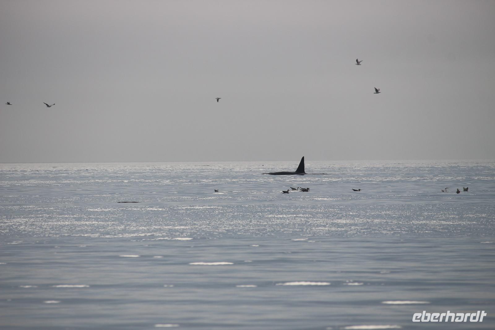 Heute verließen wir das Hotel nach dem Frühstück und begaben uns zum Hafen von Victoria, um die Walbeobachtung zu unternehmen. Zunächst wurden wir mit wärmenden Anzügen versorgt, in welchen wir uns ein wenig wie Michelin-Männchen fühlten. Anschließend ging es an Bord des Zodiacs und wir fuhren auf das Meer hinaus. Nach kurzer Zeit konnten wir in weiter Ferne bereits einige Orkas entdecken. Mit viel Geduld und guten Augen gelang es uns, noch weitere Tiere dieser Art erspähen. Viel Geschick sowie auch Glück waren gefragt, wenn man das eine oder andere gute Foto erhaschen wollte. Doch nicht nur Wale gab es zu entdecken, auch Möwen und Robben zeigten sich uns sehr zahlreich und waren auch wesentlich besser zu fotografieren. Nach ca. 2,5-stündiger Tour setzte mehr und mehr der Regen ein, sodass wir zurück zum Hafen fuhren. Sehr zufrieden begaben wir uns zum Fährhafen, um Vancouver Island nun zu verlassen.