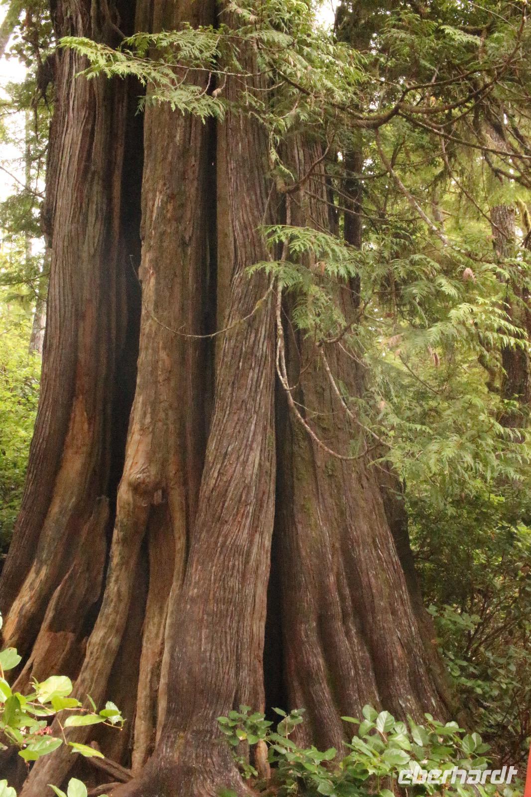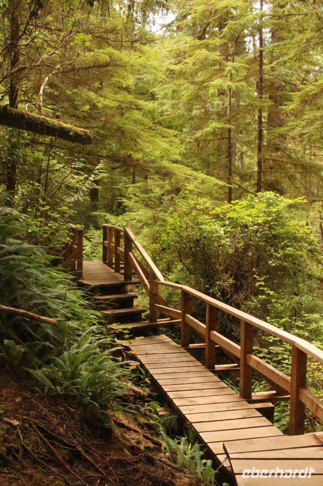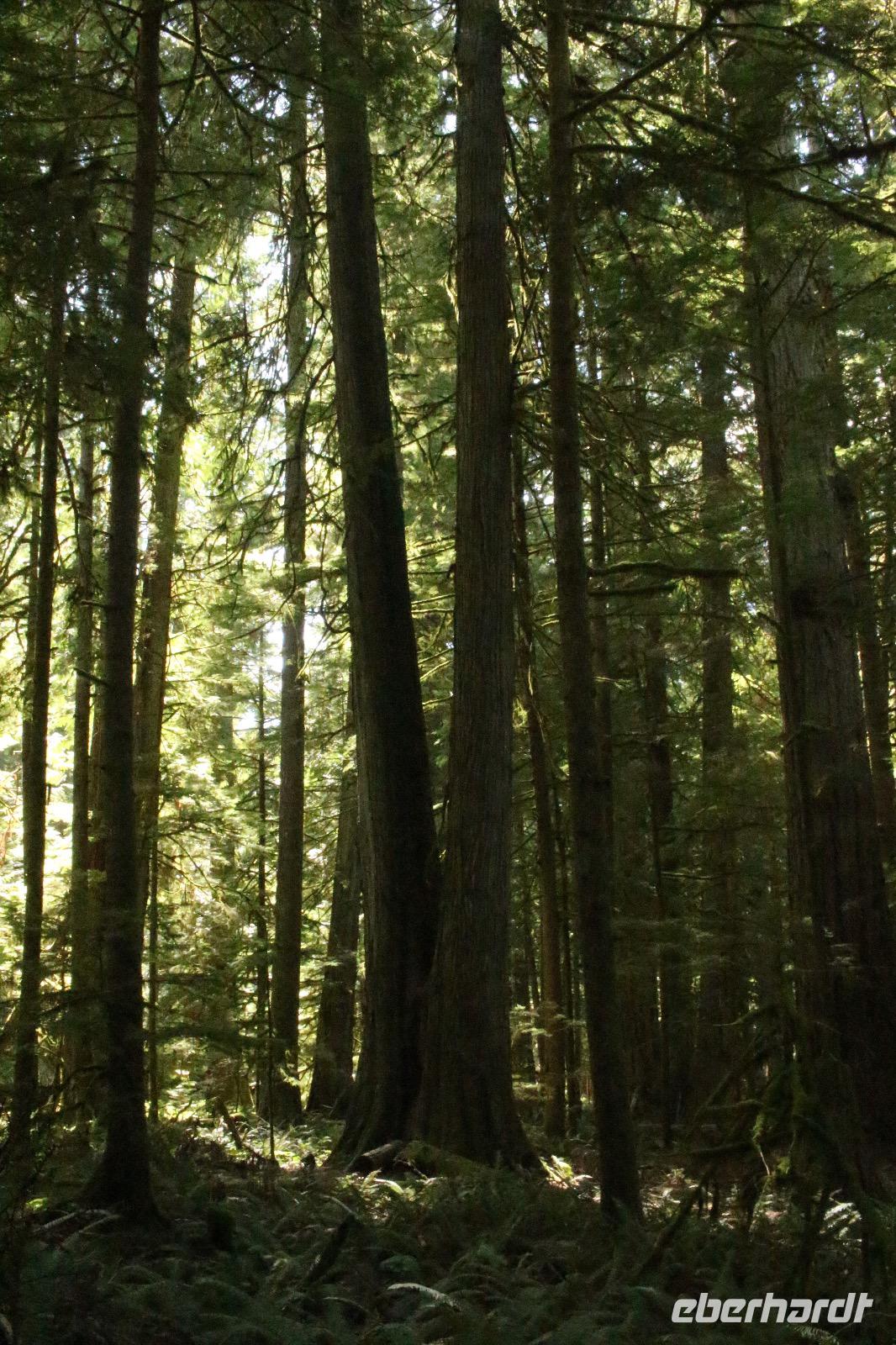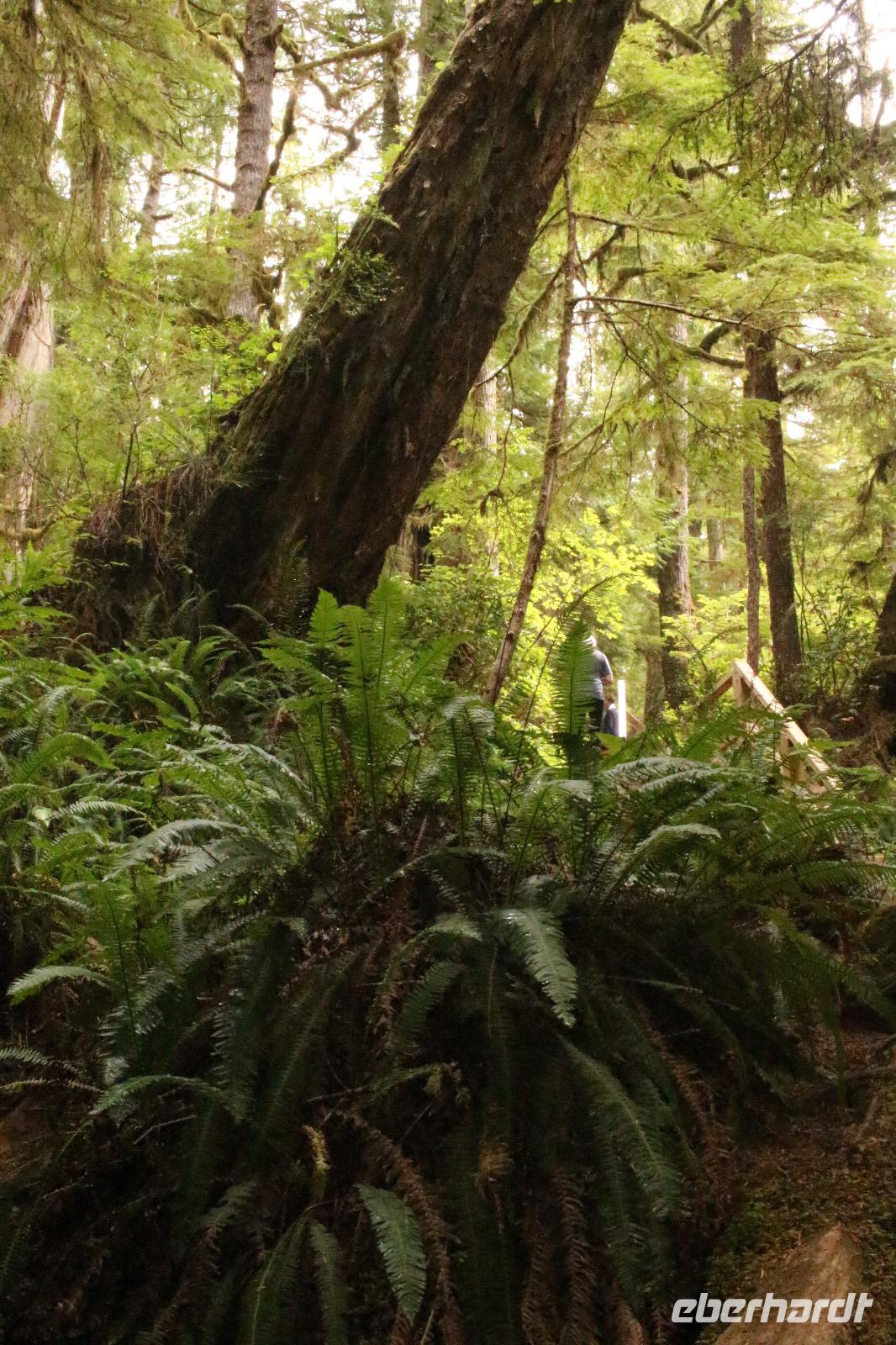 Nach dem Frühstück, welches es heute außerhalb des Hotels gab, verließen wir die Stadt Whistler wieder und fuhren weiter in Richtung Küste. Nach einem kurzen Stop an einem weiteren sehr schönen Wasserfall erreichten wir schließlich die Horseshoe Bay bei Vancouver. Hier gingen wir an Bord der Fähre, welche uns nach Vancouver Island bringen sollte. Wir genossen die Zeit an Bord bei einer heißen Schokolade und fotografierten vom oberen Deck aus natürlich fleißig die Umgebung. Als das Schiff schließlich anlegte, gingen wir mit unserem Bus wieder von Bord. Doch nicht allen gefiel dieser Weg, sodass auch der Fußgängerausgang genutzt wurde. Nachdem wir uns aber alle wiedergefunden hatten, setzten wir die Fahrt fort. Von Nanaimo aus fuhren wir in Richtung Norden, bis wir schließlich den MacMillan Provincial Park erreichten. Schon während der Fahrt war uns eine gewisse Veränderung der Landschaft bewusst geworden, doch nun erwartete uns nun eine vollkommen andere Landschaftsform als zunächst auf dem kanadischen Festland. Plötzlich befanden wir uns inmitten eines Regenwaldes - mit von Farnen überwucherten Böden, Schlingpflanzen und uralten Douglasien. Auf zwei Rundwegen erkundeten wir diese dichten Wälder und bestaunten dabei bis zu 800 Jahre alte Douglasien mit einem Umfang von bis zu neun Metern und einer Höhe von bis zu 70 Metern. Nach jeder Kurve entdeckten wir neue Giganten, die ein Foto in jedem Falle wert waren. Mit tausenden neuen Fotos im Gepäck setzten wir schließlich unsere Fahrt nach Tofino fort. Das Städtchen erreichten wir am Abend und bezogen auch direkt unsere Hotelzimmer. Der gegen Ende der Fahrt aufgetretene Regen hatte sich auch bald verzogen, sodass wir trockenen Fußes zum Restaurant spazieren konnten. In gemütlicher Atmosphäre genossen wir ein sehr schmackhaftes Menü und ließen einen weiteren schönen Reisetag gemeinsam ausklingen.