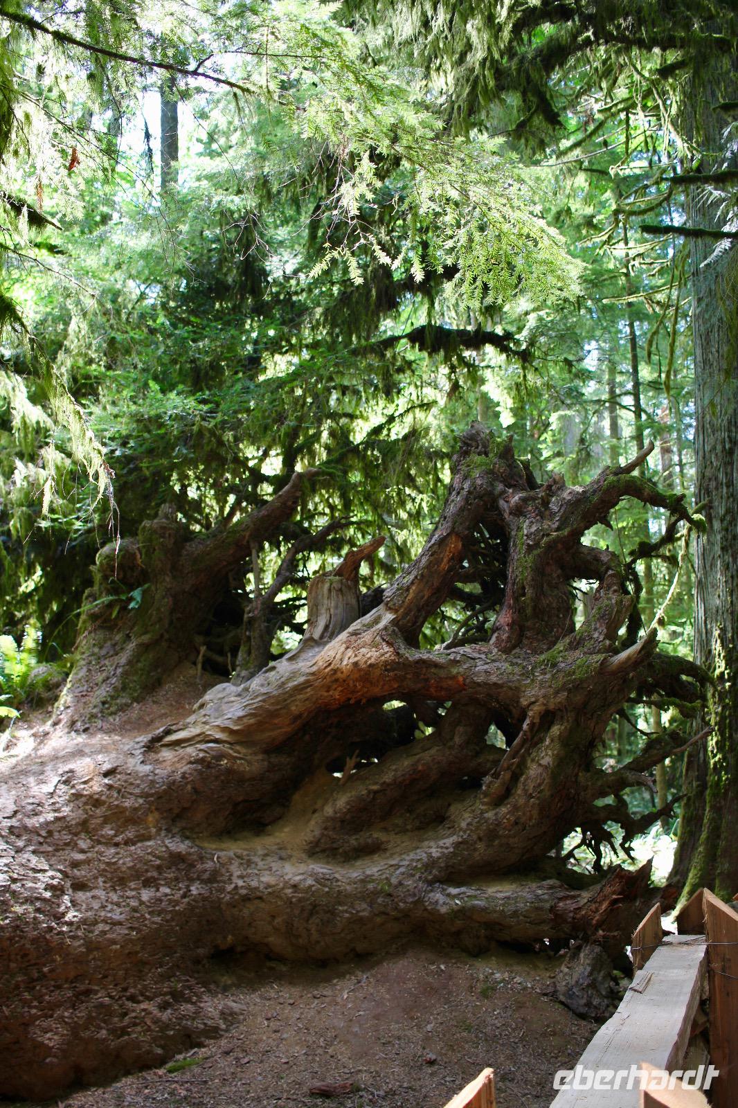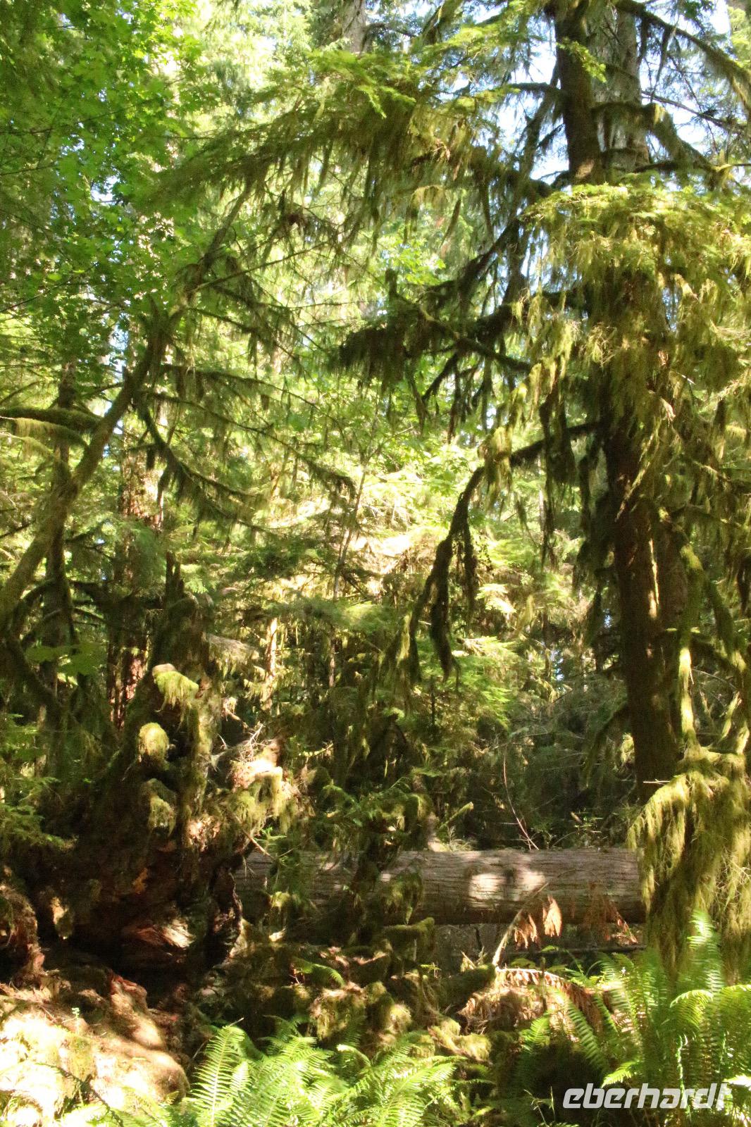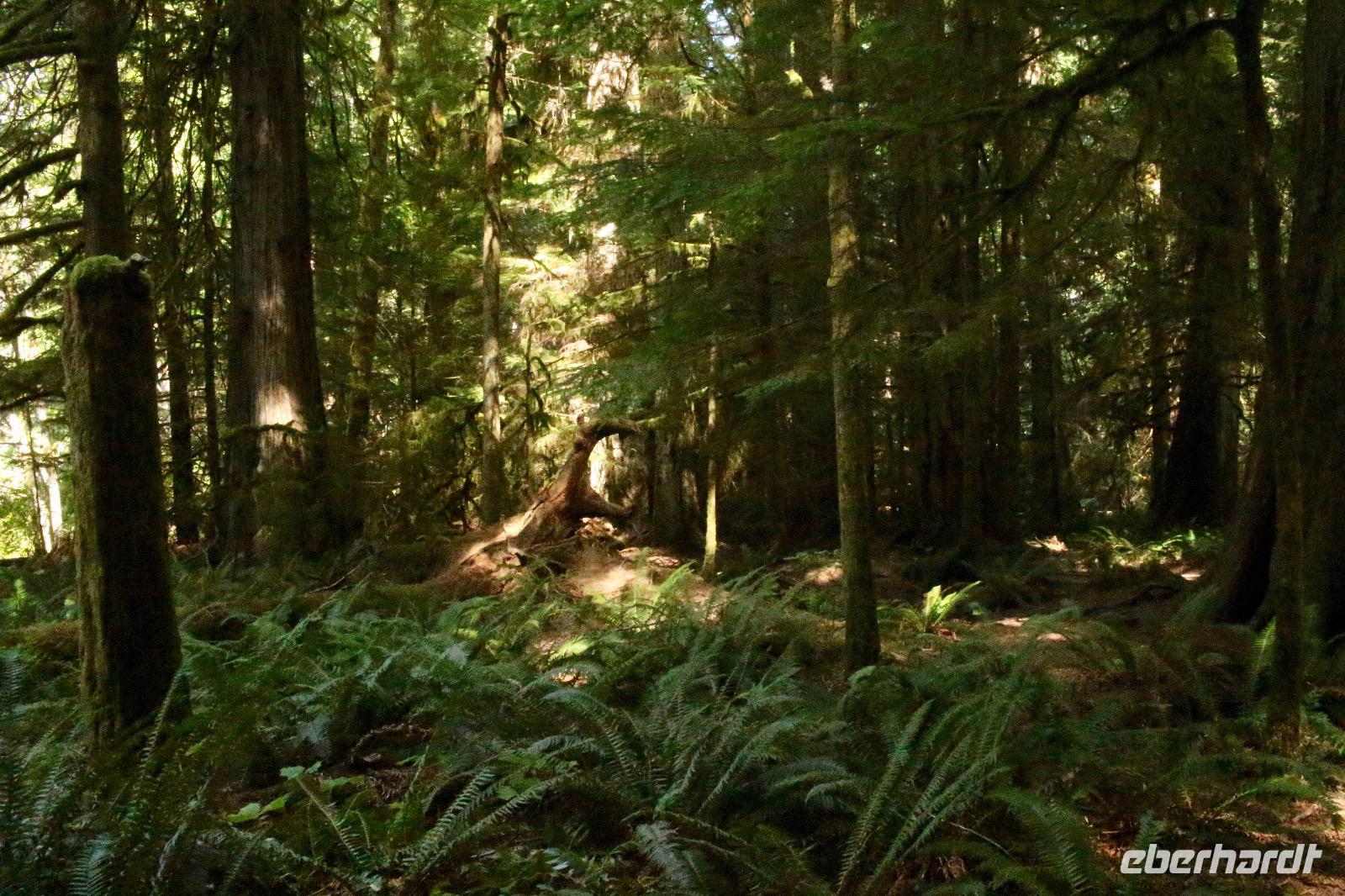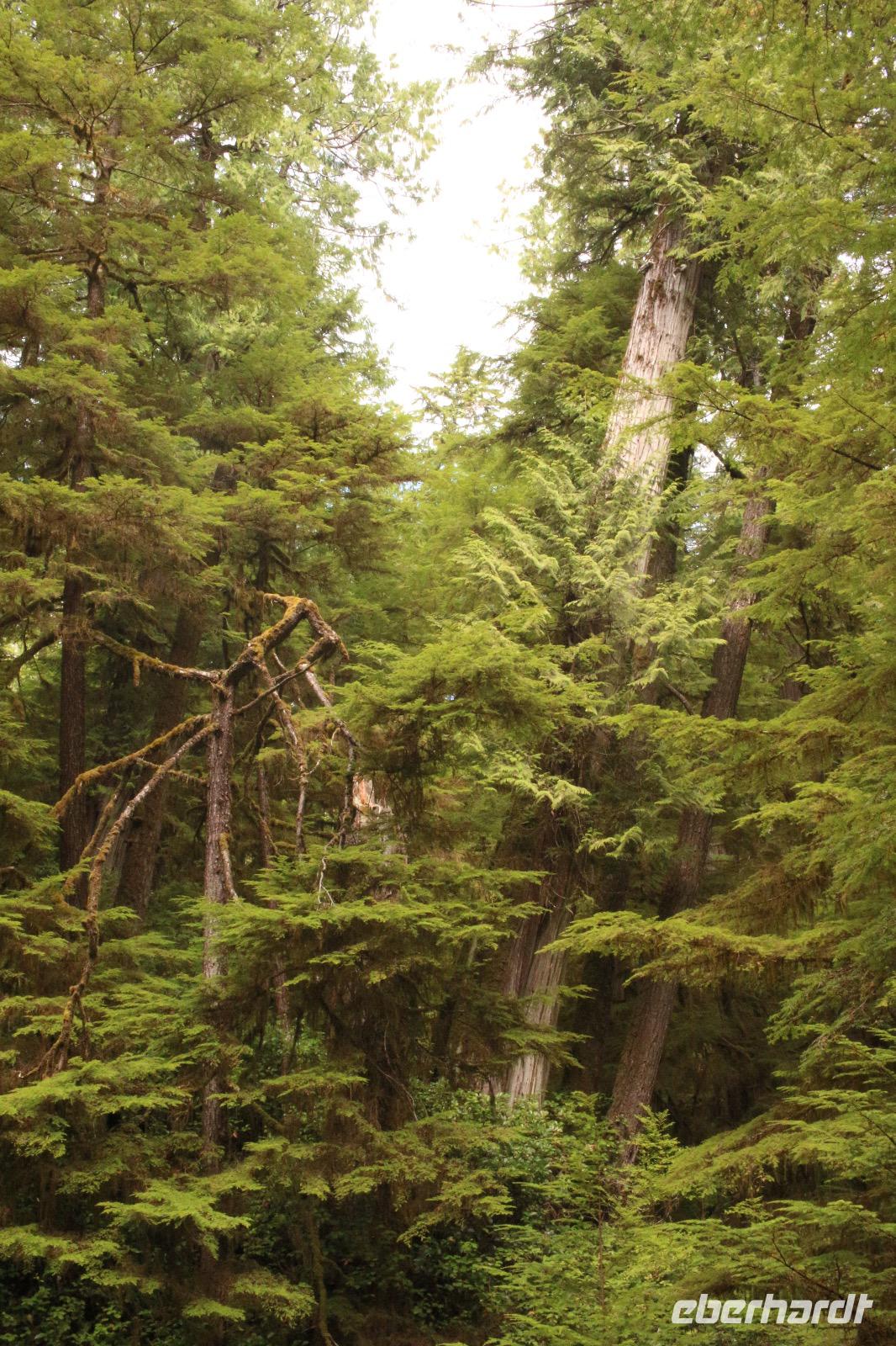 Nach dem Frühstück, welches es heute außerhalb des Hotels gab, verließen wir die Stadt Whistler wieder und fuhren weiter in Richtung Küste. Nach einem kurzen Stop an einem weiteren sehr schönen Wasserfall erreichten wir schließlich die Horseshoe Bay bei Vancouver. Hier gingen wir an Bord der Fähre, welche uns nach Vancouver Island bringen sollte. Wir genossen die Zeit an Bord bei einer heißen Schokolade und fotografierten vom oberen Deck aus natürlich fleißig die Umgebung. Als das Schiff schließlich anlegte, gingen wir mit unserem Bus wieder von Bord. Doch nicht allen gefiel dieser Weg, sodass auch der Fußgängerausgang genutzt wurde. Nachdem wir uns aber alle wiedergefunden hatten, setzten wir die Fahrt fort. Von Nanaimo aus fuhren wir in Richtung Norden, bis wir schließlich den MacMillan Provincial Park erreichten. Schon während der Fahrt war uns eine gewisse Veränderung der Landschaft bewusst geworden, doch nun erwartete uns nun eine vollkommen andere Landschaftsform als zunächst auf dem kanadischen Festland. Plötzlich befanden wir uns inmitten eines Regenwaldes - mit von Farnen überwucherten Böden, Schlingpflanzen und uralten Douglasien. Auf zwei Rundwegen erkundeten wir diese dichten Wälder und bestaunten dabei bis zu 800 Jahre alte Douglasien mit einem Umfang von bis zu neun Metern und einer Höhe von bis zu 70 Metern. Nach jeder Kurve entdeckten wir neue Giganten, die ein Foto in jedem Falle wert waren. Mit tausenden neuen Fotos im Gepäck setzten wir schließlich unsere Fahrt nach Tofino fort. Das Städtchen erreichten wir am Abend und bezogen auch direkt unsere Hotelzimmer. Der gegen Ende der Fahrt aufgetretene Regen hatte sich auch bald verzogen, sodass wir trockenen Fußes zum Restaurant spazieren konnten. In gemütlicher Atmosphäre genossen wir ein sehr schmackhaftes Menü und ließen einen weiteren schönen Reisetag gemeinsam ausklingen.