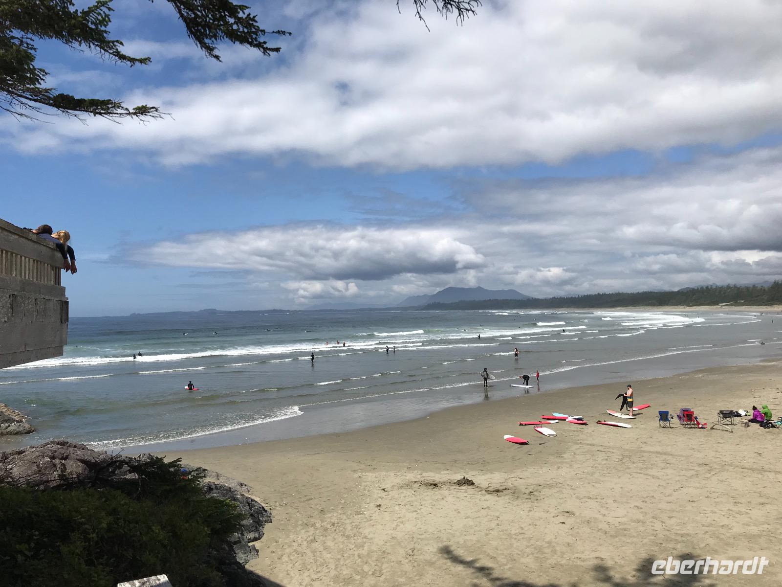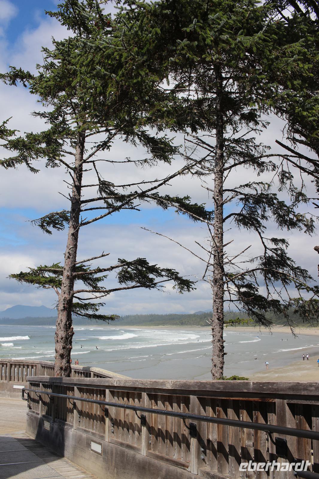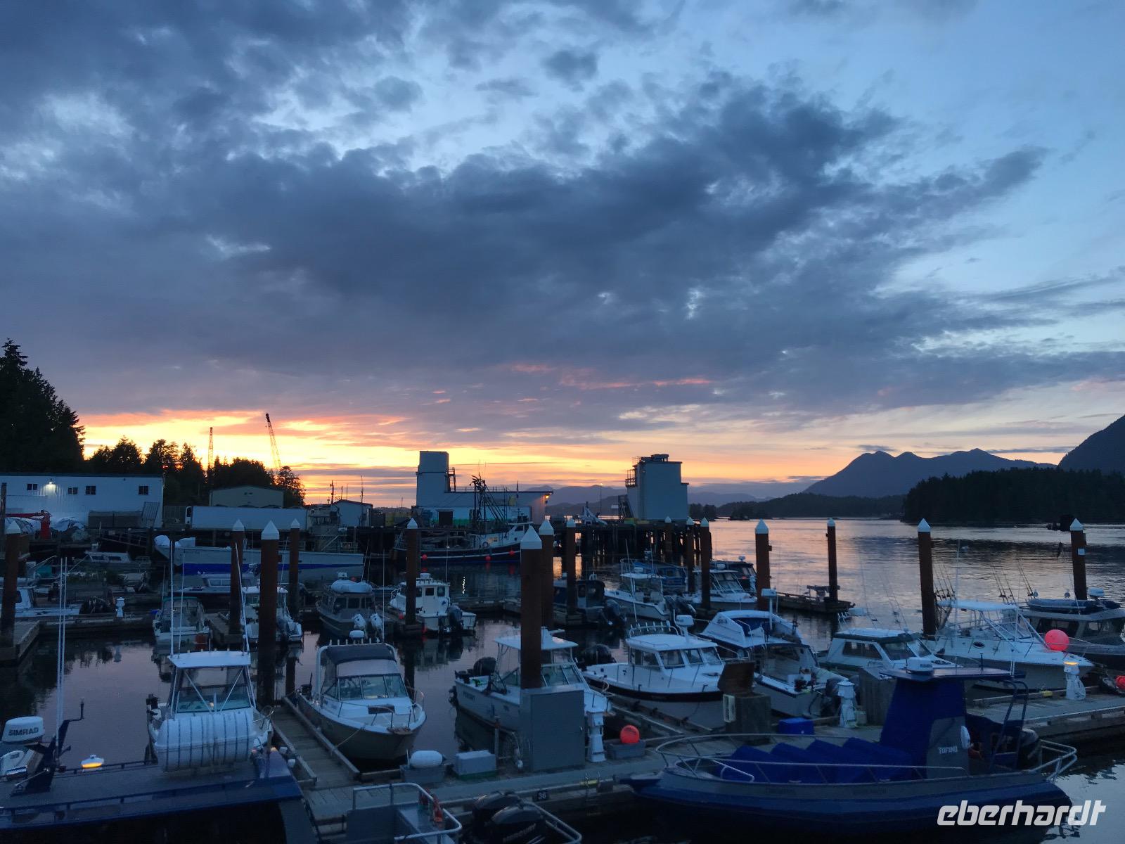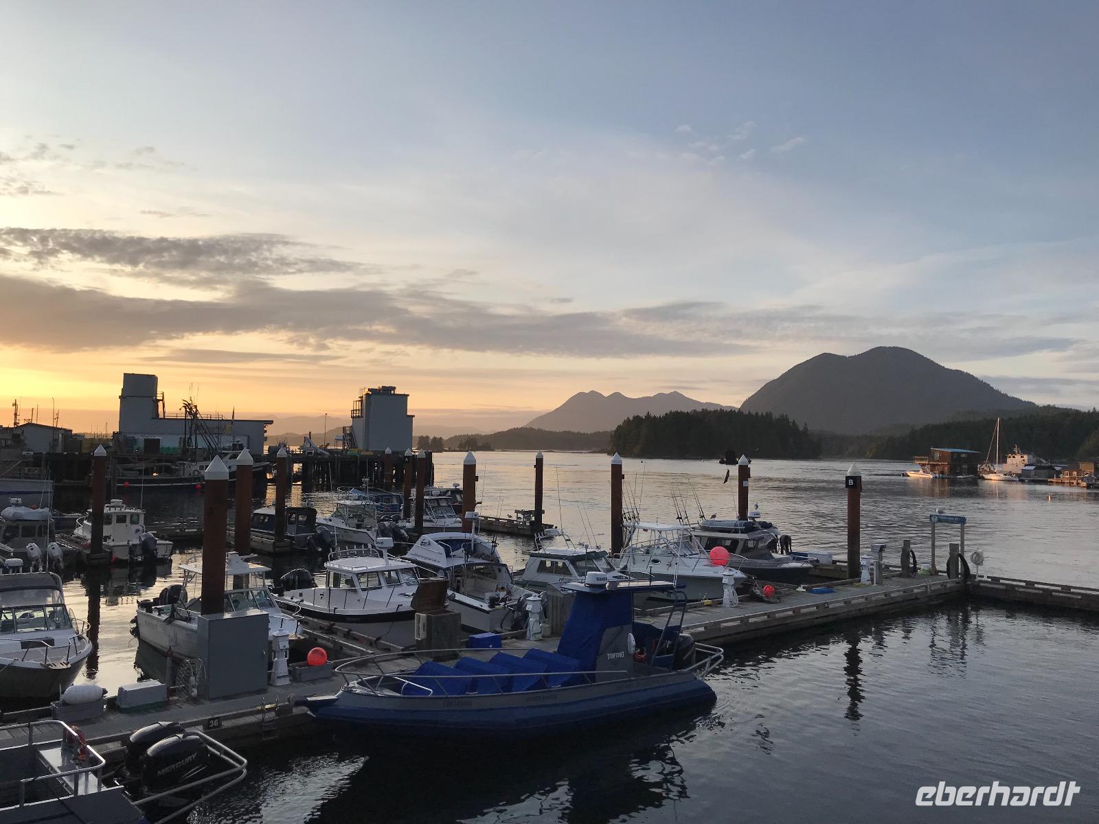 Ein erster kurzer Spaziergang führte uns durch den dichten Wald bis hin zu einem herrlichen Pazifikstrand, dem Combers Beach. Wir genossen die herrliche Luft und spazierten am Strand entlang, natürlich immer sehr vorsichtig, denn langsam kam die Flut zurück. Nach einer kurzen Fahrtstrecke gelangten wir zu einem weiteren Rundweg, dem ca. 1km langen Rainforest-Trail. Auch diesen absolvierten wir, wobei uns zahlreiche Treppenstufen erwarteten. Doch die einmalige Landschaft um uns entschädigte für alles. Wir bestaunten die dichten Regenwälder, die sich in ihrer Art doch wieder sehr vom gestrigen Regenwald unterschieden. Zahlreiche Pflanzenarten erstreckten sich vor uns, wobei wir die eine oder andere erkannten. Begeistert von diesen Eindrücken fuhren wir mit dem Bus noch ein Stück weiter, bis wir am Wickaninnish Beach ankamen. Im Gegensatz zu dem ersten heute besuchten Strand, war dieser recht gut besucht, insbesondere von zahlreichen Surfern. Wir spazierten am Meer entlang, genossen den herrlichen Sonnenschein und beobachten die Wellenreiter, sowohl die erfahreneren als auch die gerade erst lernenden Surfschüler. Anschließend besuchten wir das kleine Museum, welches Informationen zum Leben der Ureinwohner sowie zur Flora und Fauna der Region vermittelte. Voller Enthusiasmus begaben wir uns danach auf eine weitere Wanderung, den 2,5km langen Nuu-chah-nulth-Trail. Entgegen unserer Erwartungen gab es auch hier einige Treppenstufen zu überwinden, sodass wir doch recht kaputt am Bus ankamen. Hier wurden wir mit einem kleinen Snack erwartet und schließlich zum Hotel gebracht, wo nach diesem Wandernachmittag noch ausreichend Zeit zur Erholung blieb, bevor wir uns zum Abendessen trafen, wobei wir die Abendstimmung am Hafen genießen konnten.