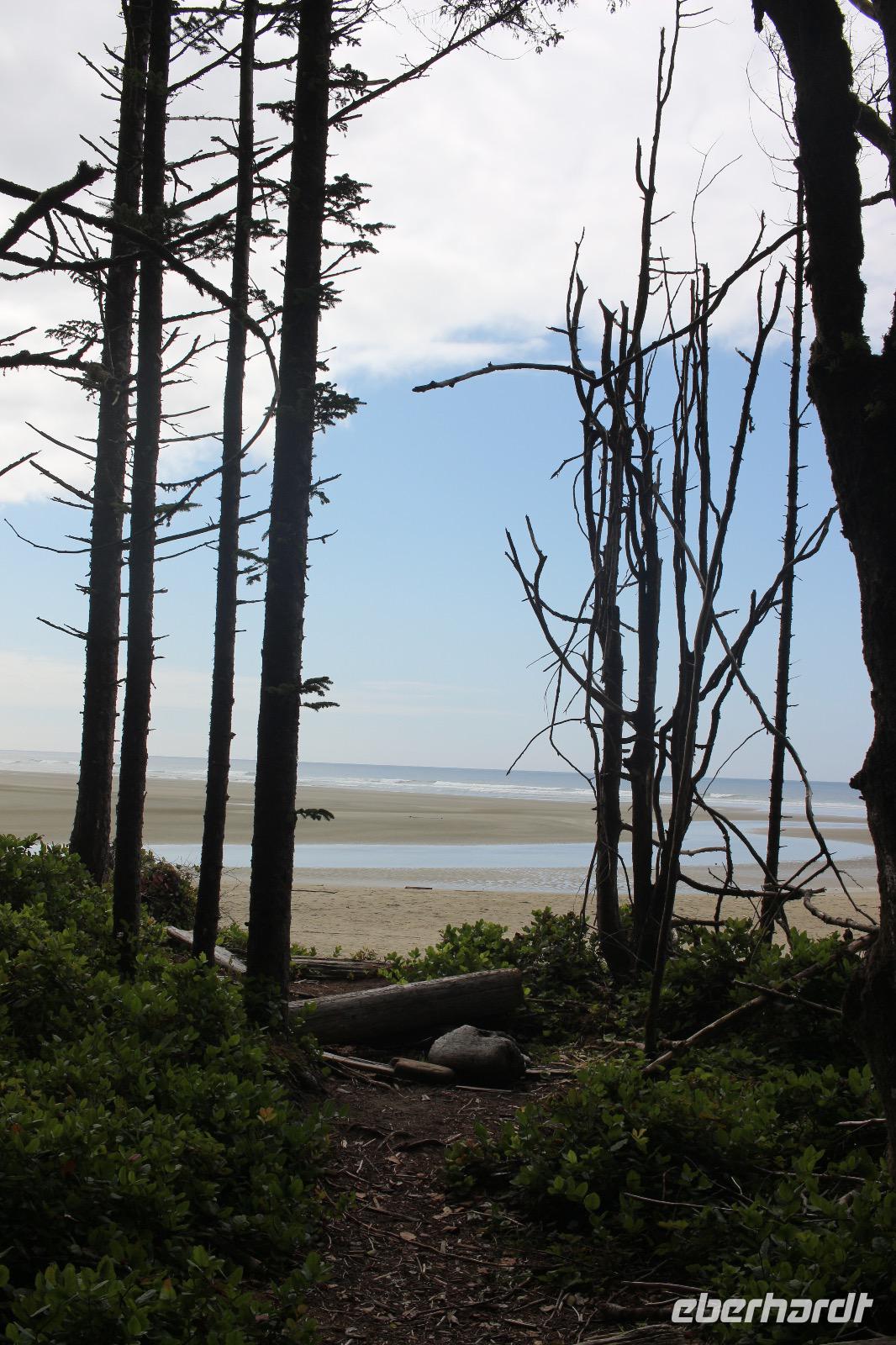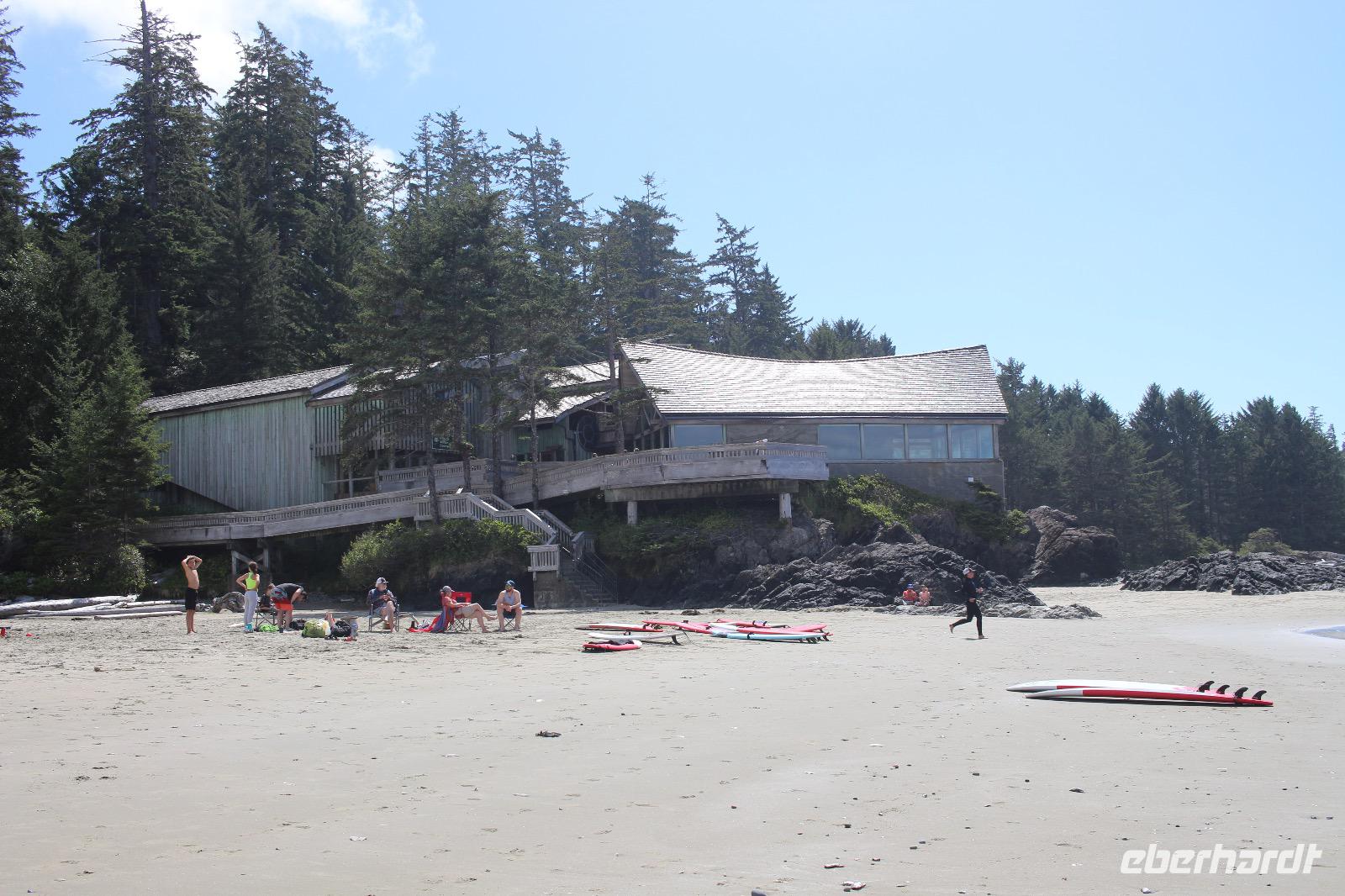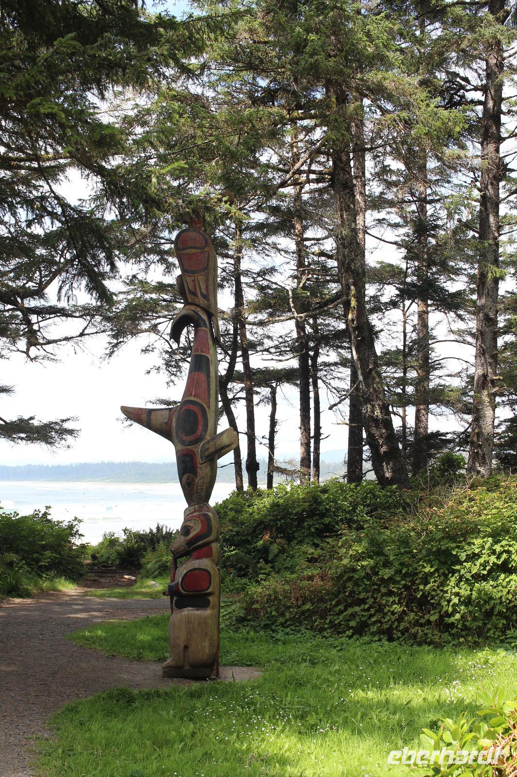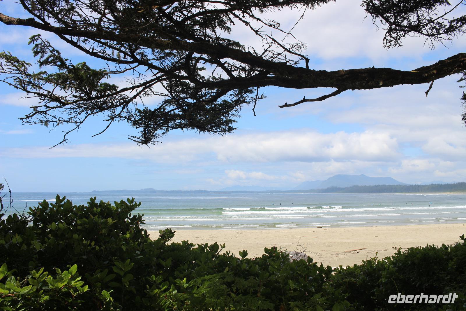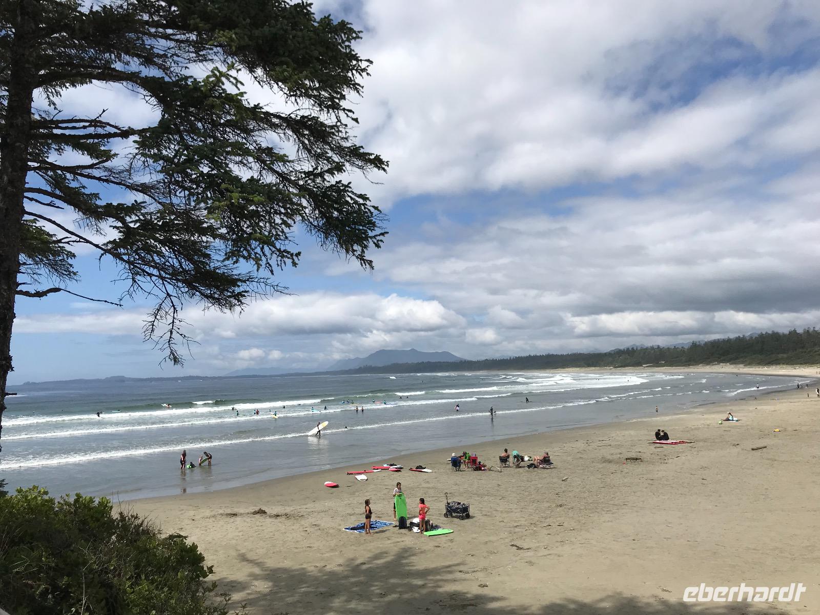 Ein erster kurzer Spaziergang führte uns durch den dichten Wald bis hin zu einem herrlichen Pazifikstrand, dem Combers Beach. Wir genossen die herrliche Luft und spazierten am Strand entlang, natürlich immer sehr vorsichtig, denn langsam kam die Flut zurück. Nach einer kurzen Fahrtstrecke gelangten wir zu einem weiteren Rundweg, dem ca. 1km langen Rainforest-Trail. Auch diesen absolvierten wir, wobei uns zahlreiche Treppenstufen erwarteten. Doch die einmalige Landschaft um uns entschädigte für alles. Wir bestaunten die dichten Regenwälder, die sich in ihrer Art doch wieder sehr vom gestrigen Regenwald unterschieden. Zahlreiche Pflanzenarten erstreckten sich vor uns, wobei wir die eine oder andere erkannten. Begeistert von diesen Eindrücken fuhren wir mit dem Bus noch ein Stück weiter, bis wir am Wickaninnish Beach ankamen. Im Gegensatz zu dem ersten heute besuchten Strand, war dieser recht gut besucht, insbesondere von zahlreichen Surfern. Wir spazierten am Meer entlang, genossen den herrlichen Sonnenschein und beobachten die Wellenreiter, sowohl die erfahreneren als auch die gerade erst lernenden Surfschüler. Anschließend besuchten wir das kleine Museum, welches Informationen zum Leben der Ureinwohner sowie zur Flora und Fauna der Region vermittelte. Voller Enthusiasmus begaben wir uns danach auf eine weitere Wanderung, den 2,5km langen Nuu-chah-nulth-Trail. Entgegen unserer Erwartungen gab es auch hier einige Treppenstufen zu überwinden, sodass wir doch recht kaputt am Bus ankamen. Hier wurden wir mit einem kleinen Snack erwartet und schließlich zum Hotel gebracht, wo nach diesem Wandernachmittag noch ausreichend Zeit zur Erholung blieb, bevor wir uns zum Abendessen trafen, wobei wir die Abendstimmung am Hafen genießen konnten.
