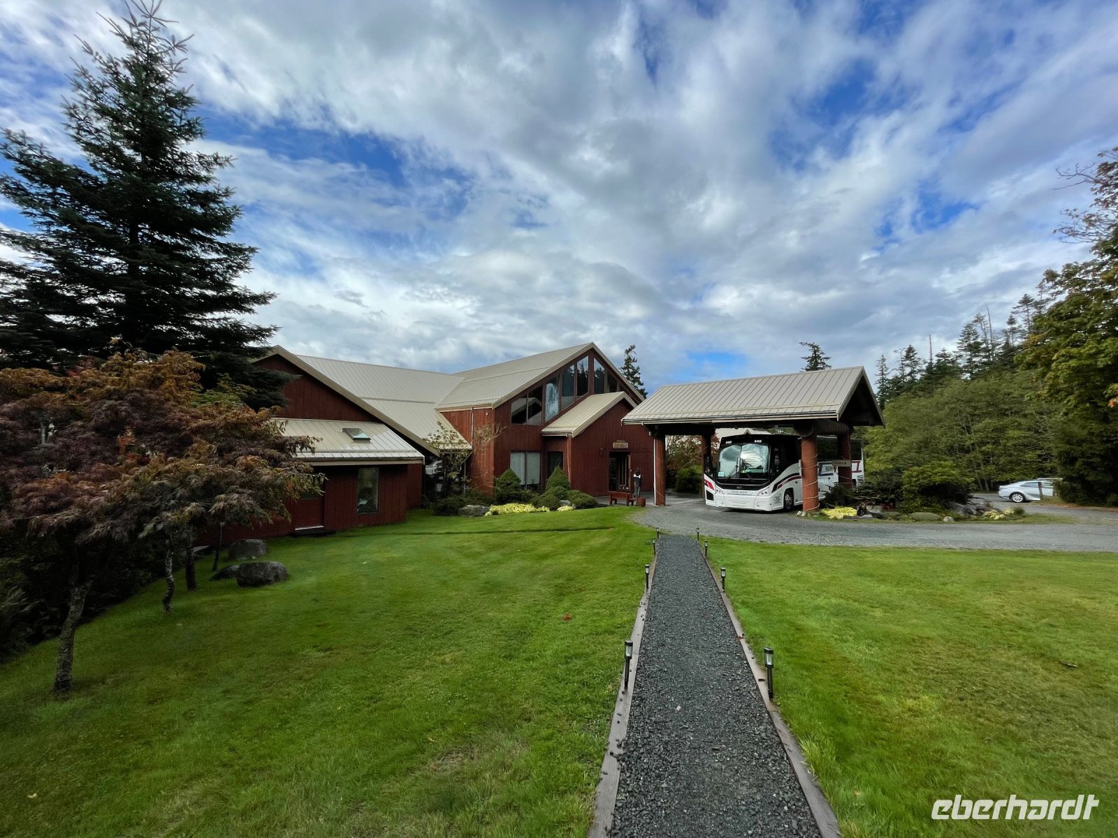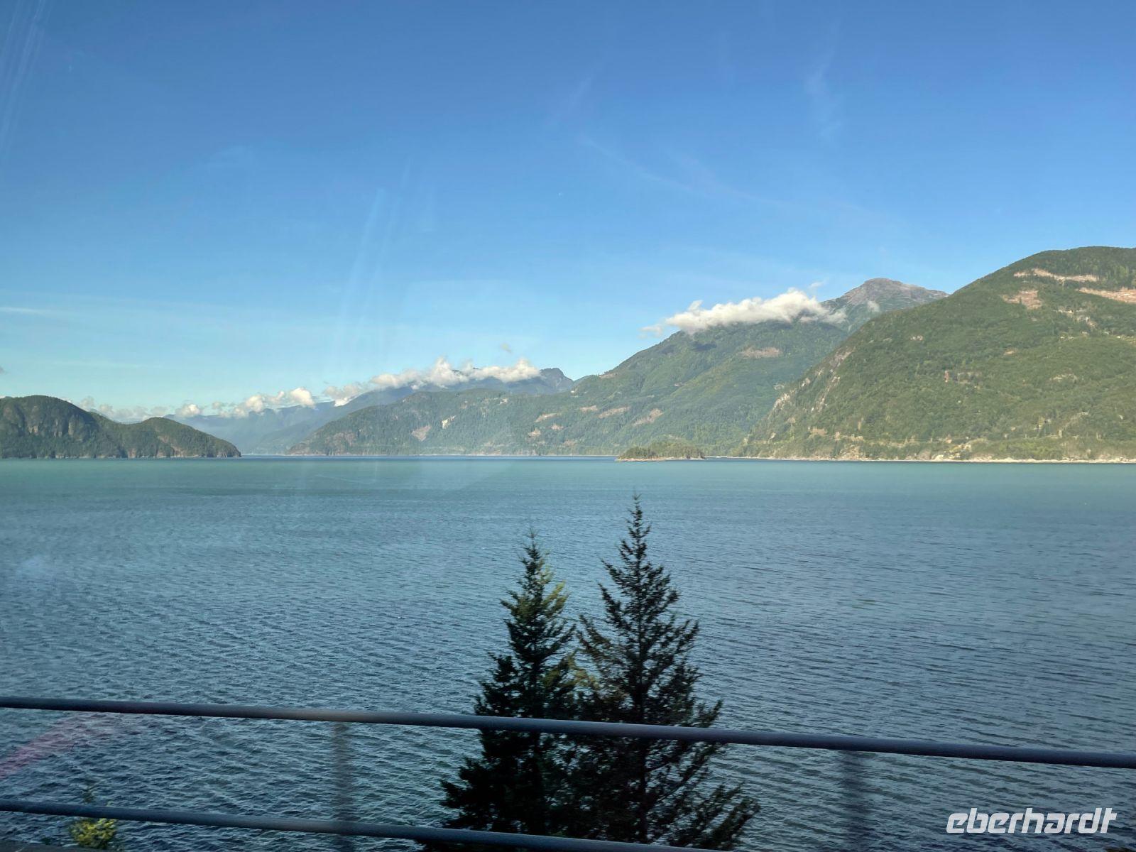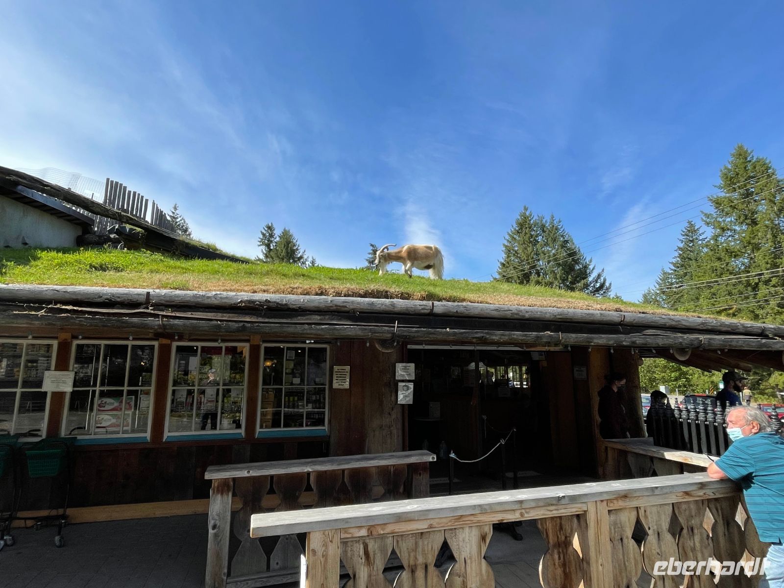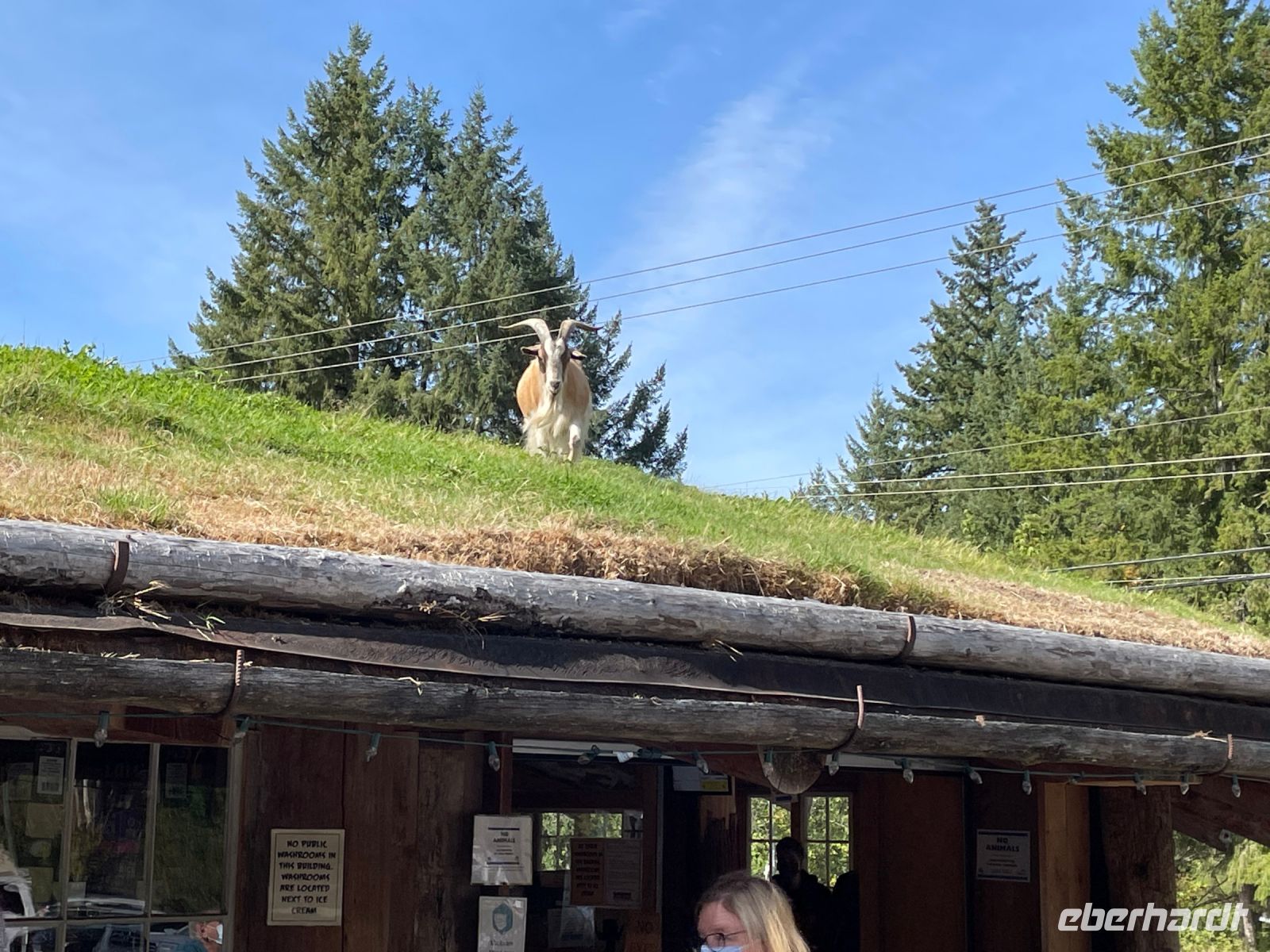Heute beginnt der zweite Teil unserer Reise und wir verlassen die Berge, um die Westküste Kanadas zu bereisen. Wir durchqueren das Örtchen Squamisch und halten für einen Fotostopp am „Tantalus Lookout“ wo wir zum letzten Mal auf die Bergwelt von Whistler und Umgebung blicken. Angekommen in Horseshoe Bay setzen wir mit der Fähre nach Nanaimo auf Vancouver Island über. Auf der Insel angekommen legen wir eine Mittagspause im Hippie Ort Cooms ein, wo sich viele bunte und kreative Läden befinden. Das Highlight im Ort sind jedoch die Ziegen auf dem Grasdach eines Hauses. Weiter geht es in den MacMillan Provincial-Park wo wir einen Regenwald durchqueren, ganz im Kontrast zu den Wäldern, Bergen und Seen der letzten Tage. Uns erwarten Farne, die den Boden überwuchern, Holzbrücken, die über Bäche führen und Schlingpflanzen, die sich entlang der uralten Bäume räkeln. Die ältesten Bäume sind bis zu 800 Jahre alte Douglasienbäume – die zur Familie der Kieferngewächse zählen. Vom Regenwald geht es weiter nach Campbell River, die auch als „Lachs-Hauptstadt“ bezeichnet wird. Von dort aus setzen wir mit der Fähre nach Quadra Island über, unserem Übernachtungsziel für die nächsten beiden Tage. Wir checken ein in die Tsa Kwa Luten Lodge bzw. dem Cape Mudge Resort. Die geräumigen Zimmer bieten eine schöne Aussicht über die Discovery Passage nach Campbell River und zu den selbst im Sommer schneebedeckten Gipfeln vom White Ridge und Strathcona Provincial Park auf Vancouver Island… wenn mal die Sonne raus kommt. ??Abends kommen regelmäßig Weißwedelhirsche zu Besuch. So entdecken wir eine Kuh, die ihre beiden Jungen während der Dämmerung auf die Rasenflächen vor der Lodge führt. Die Lodge befindet sich im Eigentum der We Wai Kai Nation und wird auch von dieser betrieben. So stammt auch der Name, Tsa Kwa Luten, aus dem Indianischen und bedeutet so viel wie Versammlungsplatz. Dementsprechend wurde die Lobby ganz im Stil eines Kwagiulth Big House, eines Versammlungshauses, gebaut. Nach einem sehr leckeren Abendessen, lassen wir den Tag bei einem kanadischen Whisky-Likör (gesponsert von Eberhardt TRAVEL) in gemütlicher Runde ausklingen.
