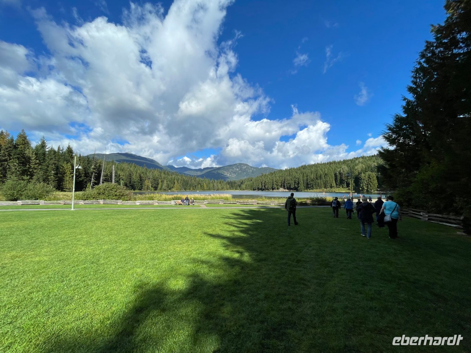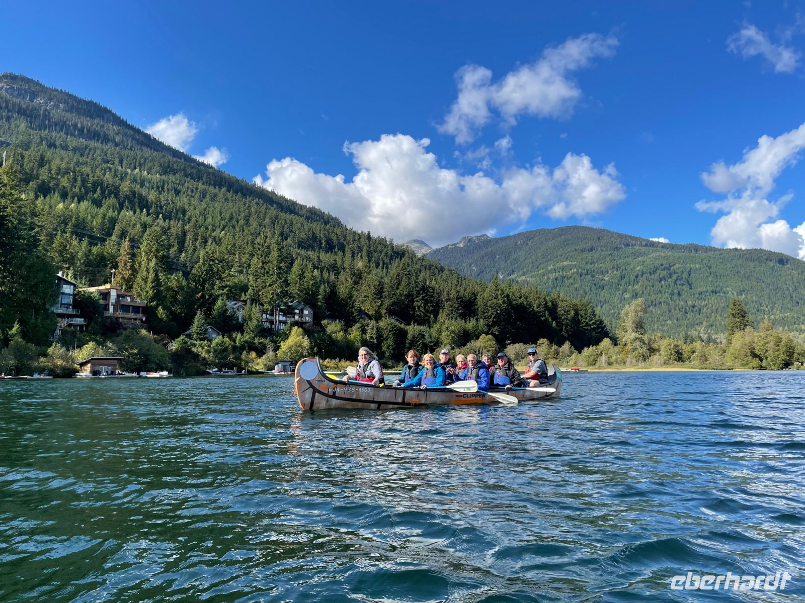 Unseren siebten Reisetag verbringen wir in Whistler. Vormittags haben wir etwas Freizeit für einen kleinen Spaziergang durch das Whistler Village, was nur für Fußgänger zugänglich ist. Wir sehen u.a. die olympischen Ringe und den Siegerehrungsplatz. Weiter geht es zum Lost Lake, nahe der Stadt. Im Hotel wieder angekommen werden wir zum Alta Lake gefahren, wo wir eine Kanutour auf dem See unternehmen. Auf dieser Tour steuert ein naturkundlich bewanderter Führer unser Voyageur-Kanu für acht Personen über den wunderschönen Alta-See. Voyageur-Kanus sind historische Kanus aus der Zeit des kanadischen Pelzhandels, die erstmals im 17. Jahrhundert eingesetzt wurden. Unser Guide bringt uns nicht nur die Natur, sondern auch die Geschichte von Whistler und Kanada näher. Am anderen Ende vom See angekommen, verzehren wir unsere mitgebrachten Sandwiches bei einer entspannten Mittagspause. Bei herrlichem Sonnenschein blicken wir auf die Berge von Whistler, bevor wir rückzu gegen den Wind paddeln. Geschafft! Nach der kleinen sportlichen Einlage geht es zurück zum Hotel, wo wir noch etwas Freizeit zum Bummeln durch Whistler Village bis zum Abendessen haben.
