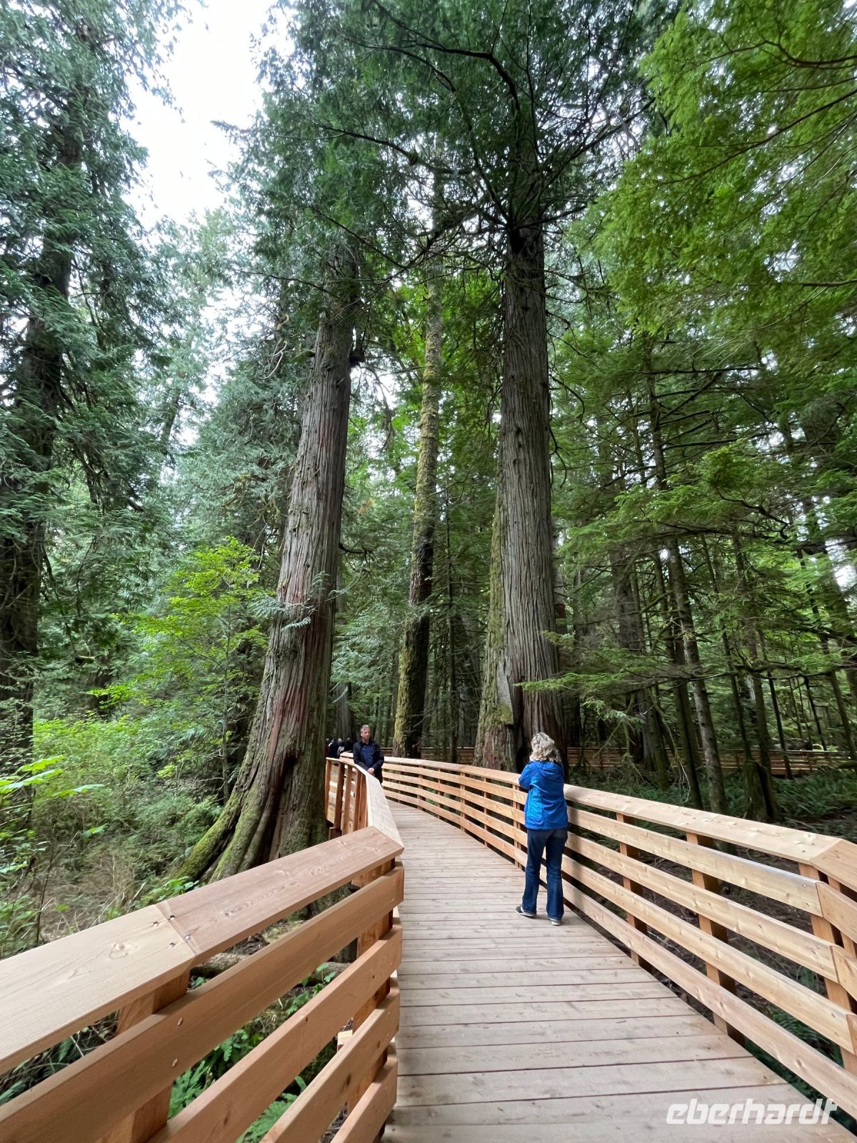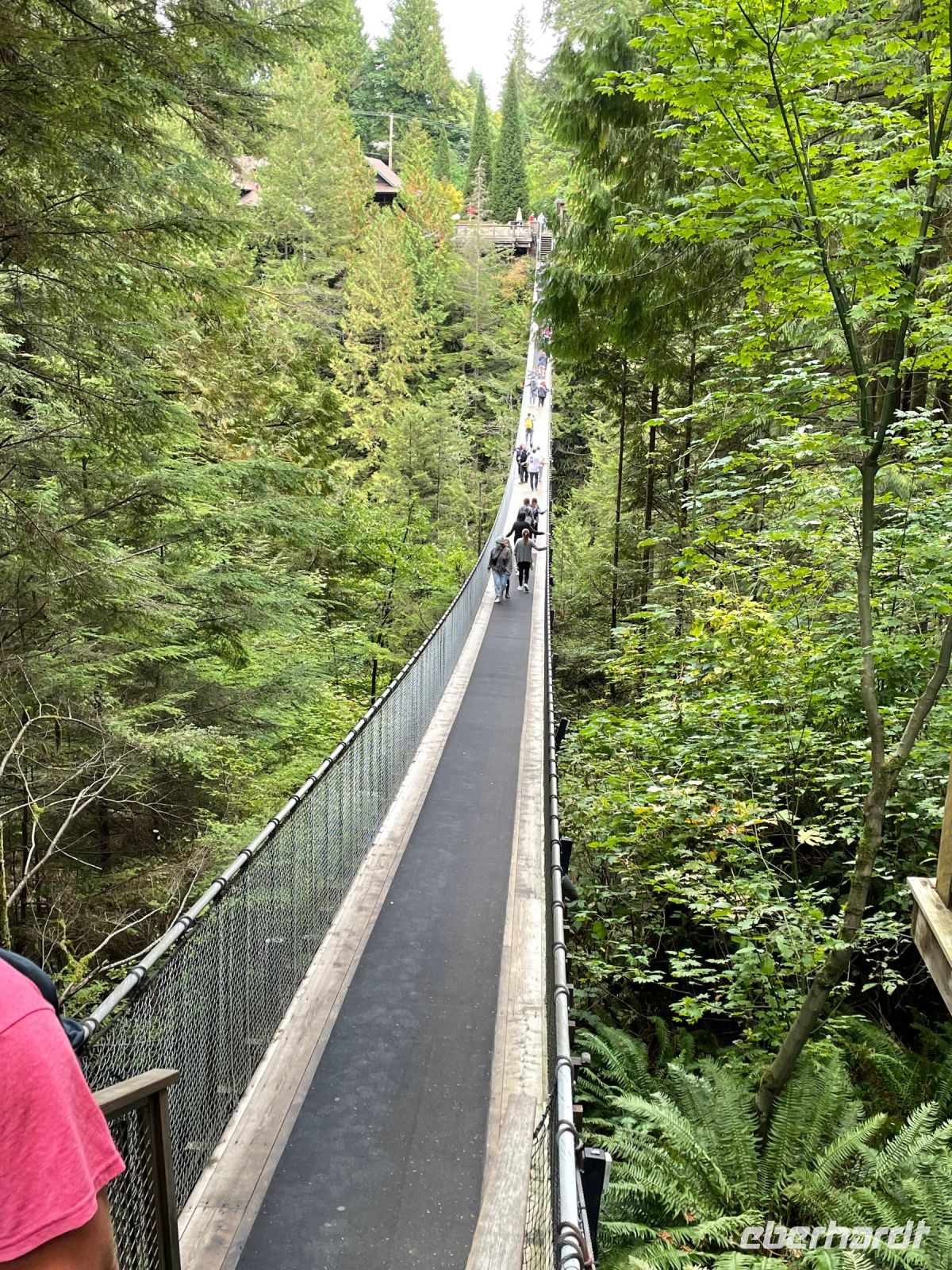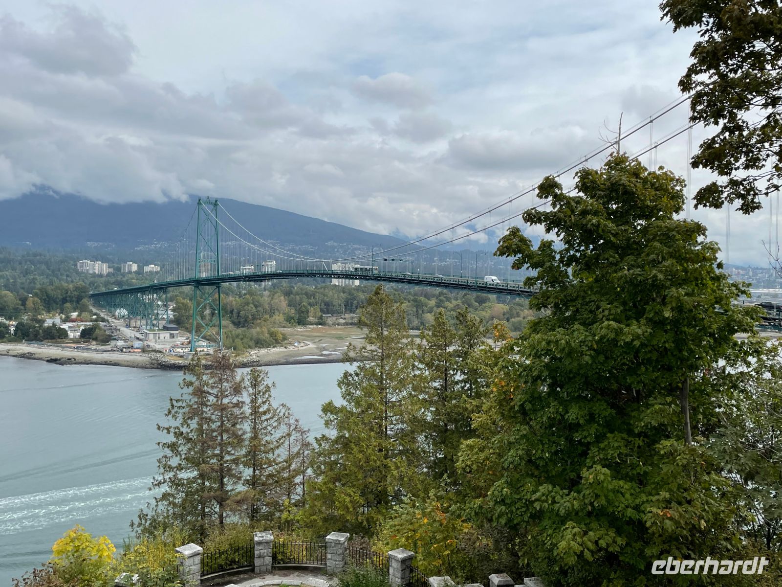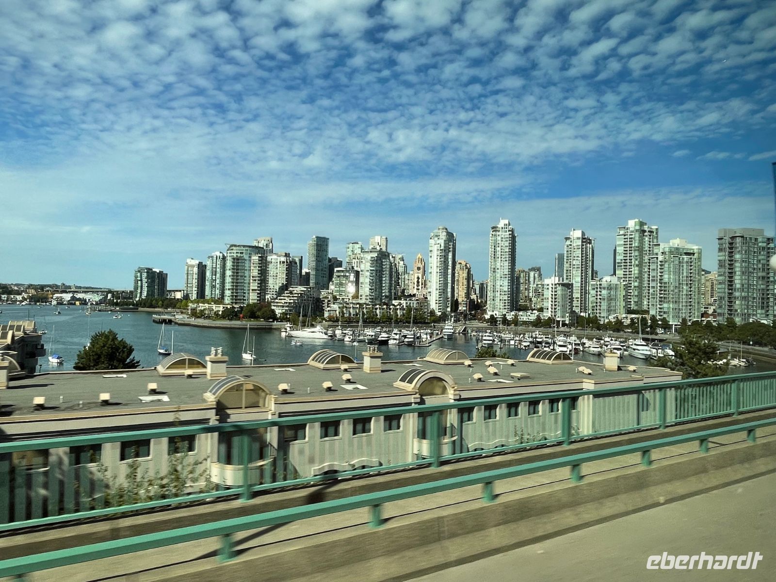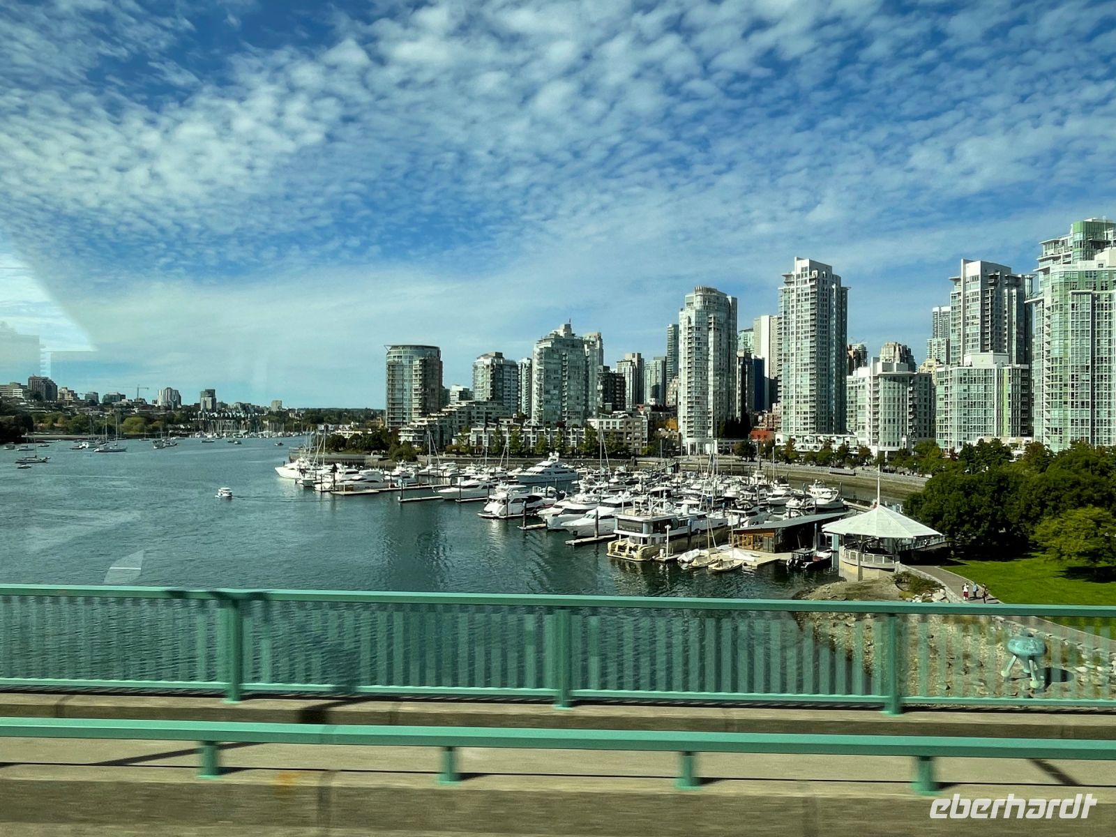 An unserem ersten Tag in der kanadischen Großstadt unternehmen wir eine Stadtrundfahrt. Wir fahren zuerst durch Downtown, Chinatown und erreichen kurze Zeit später Gastown. Dieser Teil der Stadt beeindruckt uns mit einem besonderen Charme. Die Gebäude sind im viktorianischen Stil gebaut, umgeben von Kopfsteinpflaster und vielen Restaurants. Das Wahrzeichen ist die antike Dampfuhr, die meist von vielen Besuchern umlagert wird, doch in Coronazeiten haben wir Glück und es sind nur wenige Besucher da. Weiter geht es in den Stanley Park, wo wir die Totempfähle sehen und einen tollen Blick auf die Skyline haben. Anschließend haben wir Zeit für eine ausgiebige Mittagspause auf Granville Island, dem Vergnügungsviertel der Stadt. Hier befinden sich zahlreiche Geschäfte, eine Markthalle und unzählige Restaurants. Gut gestärkt geht es nun in die Natur. Wir besuchen den Capilano Suspension Bridge Park, ein Naturpark mit Baumwipfelpfad, Naturlehrpfad, Skywalk und einer der längsten und höchsten Hängebrücken der Welt. Die frei schwingende Seilbrücke ist 70 Meter hoch und 136 Meter lang und somit eine der Topattraktionen Vancouvers.