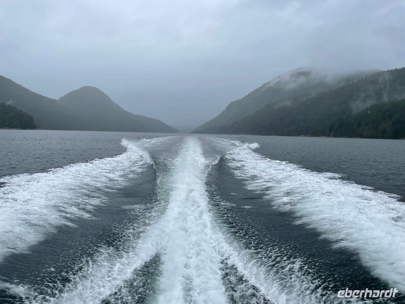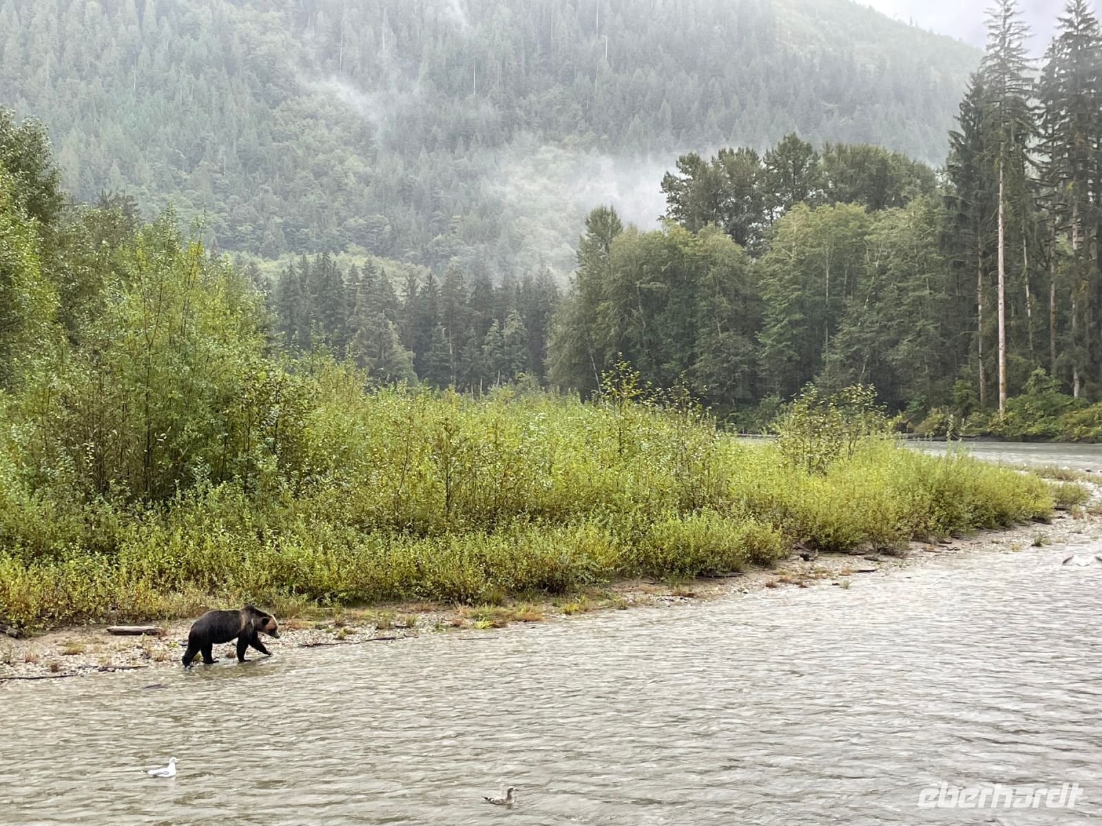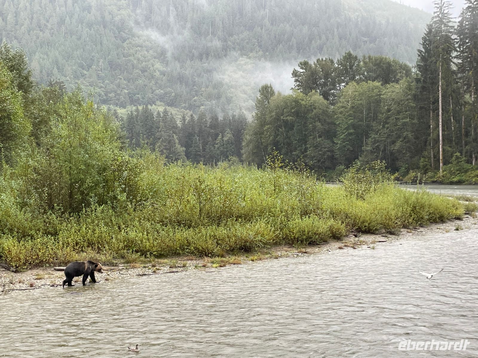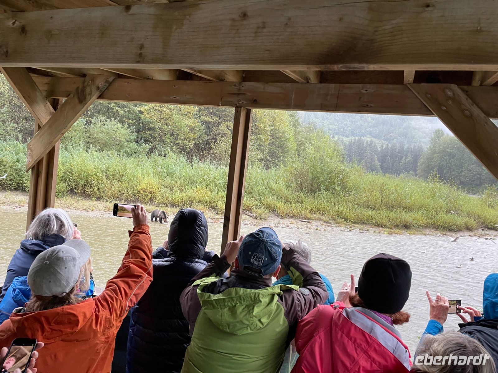 An unserem zweiten Tag auf Quadra Island haben wir die Wahl zwischen einer Bärenbeobachtung oder einer Kayaktour. Außerdem bieten sich individuelle Spaziergänge aufgrund der idyllischen Lage der Unterkunft an. Fast alle entscheiden sich für die knapp achtstündige Bärenbeobachtung und brechen gegen 11Uhr auf in Richtung angrenzendes Festland von British Columbia, da es nur dort Grizzlybären gibt. Wir starten bei strömenden Regen unsere zweistündige Bootsfahrt durch die malerische Discovery Bay. Begleitet werden wir von Heike – einer deutschsprachigen Naturkundlerin. Sie erzählt uns viel über die Tierwelt der Region. Für uns ein deutliches Upgrade der gebuchten Tour. Unterwegs ist der Wellengang mal stärker und mal schwächer. Größtenteils aber ruhig wie auf einem See. Am Ende des Fjordes angekommen, steigen wir vom Boot in einen Kleinbus um. Von nun an führen uns 2 Nativ People zu den Bären. Sie sind bewaffnet mit Pfefferspray… nur zur Sicherheit. Wir fahren kurz ins kleine Visitorcenter, wo wir nochmal auf die Toilette gehen sollen, denn für die nächsten 3 Stunden im Wald wäre es zu gefährlich. Danach fahren wir die beiden ersten Plattformen an und sehen leider nix. Doch ab der 3. Plattform sehen wir schon auf der Fahrt dahin ein Bär im Wald verschwinden… dieser taucht kurze Zeit später 25m vor unserer Kameralinse wieder auf. Wir sind begeistert! Doch das wars noch lange nicht. Wir sehen auf der anderen Seite vom Flussufer einen Bär wie er frisst. Kurze Zeit später wird er von einem anderen Bären verscheucht der auf unserer Flussseite seinen Lachs fing und nun dem anderen Bären den Fisch wegnehmen wollte. Dieser verschwand im Gebüsch und tauchte später weiter links von unserer Bärenaussichtsplattform wieder auf. Er schwimmt fast vor unserer Nase entlang… der Abstand beträgt weniger als 15m. Das ganze Spektakel zieht sich ca. eine Stunde lang hin, bis wir weiter zur nächsten Aussichtsstelle fahren und dort wieder einen Bären sehen können. Selbst auf dem Rückweg zum Boot kreuzt nochmal ein Bär unseren Weg. Was für eine tolle Tierbeobachtung! Das viele Geld hat sich zum Glück für alle Gäste gelohnt. Nun beginnt unsere 2-stündige Rückfahrt nach Quadra Island. Nach dem Abendessen spendiert uns Reiseleiterin Nadja noch eine Runde Rotwein und somit sitzen wir in gemütlicher Runde zusammen und werten die Erlebnisse des Tages aus.