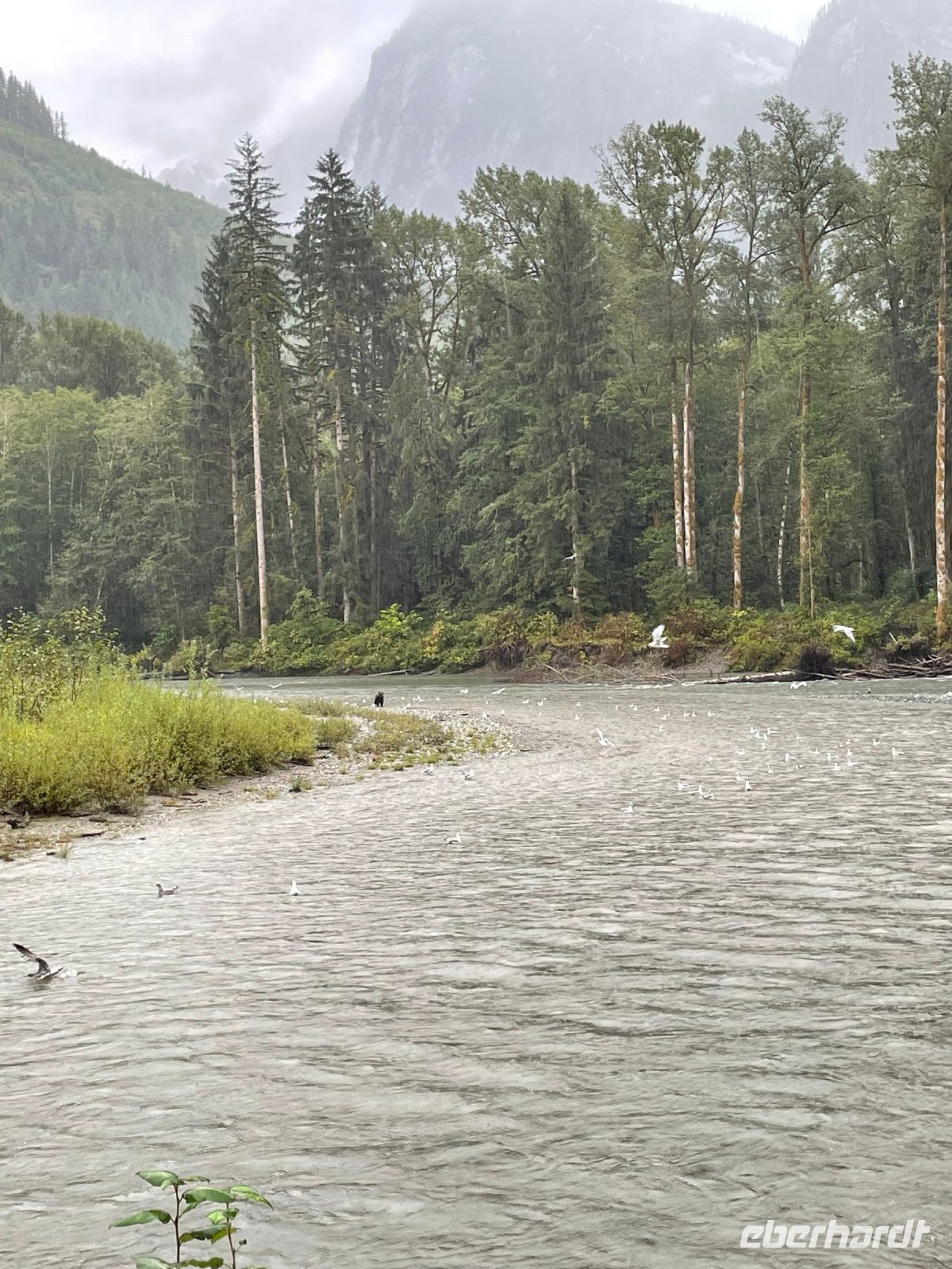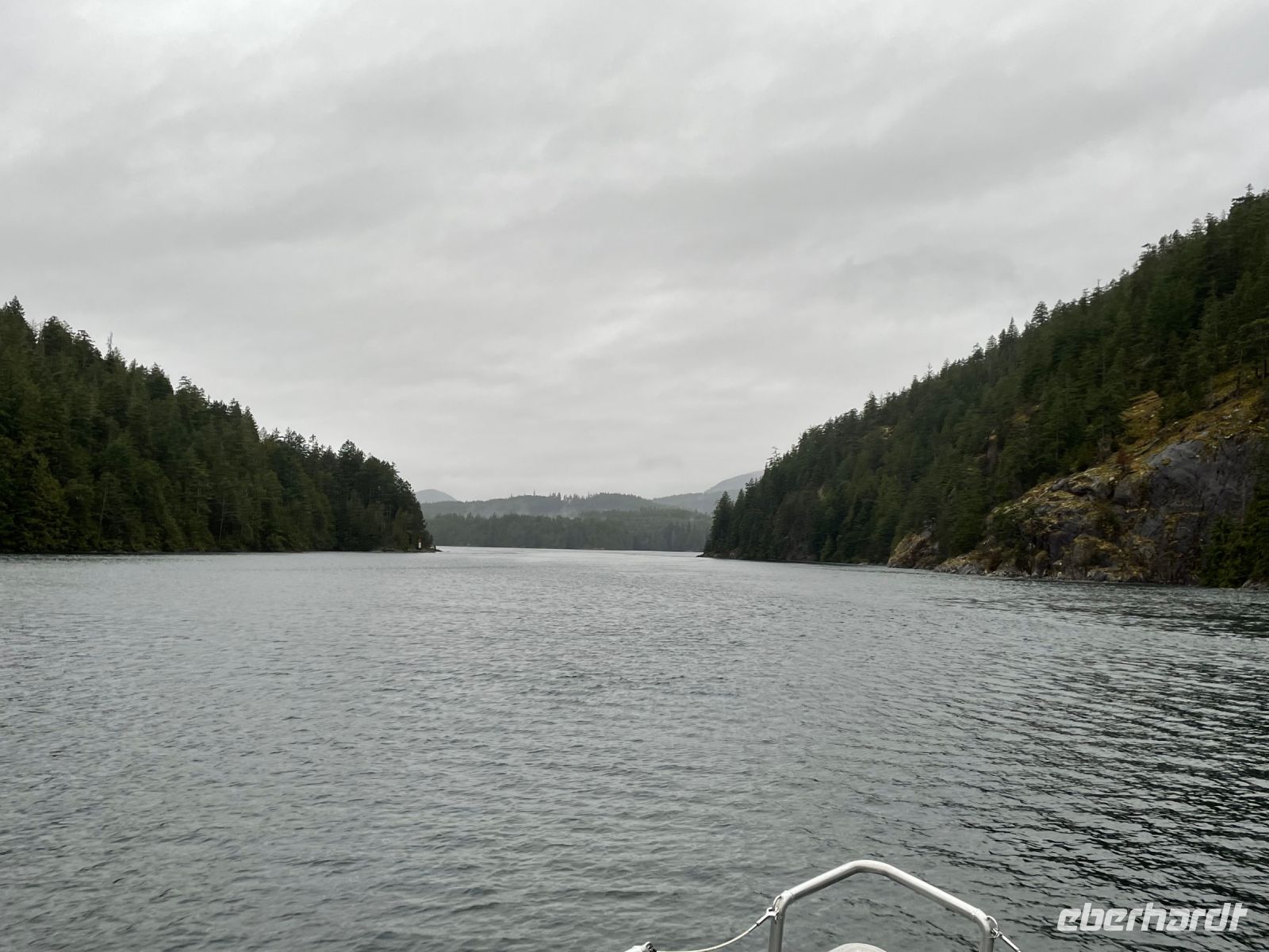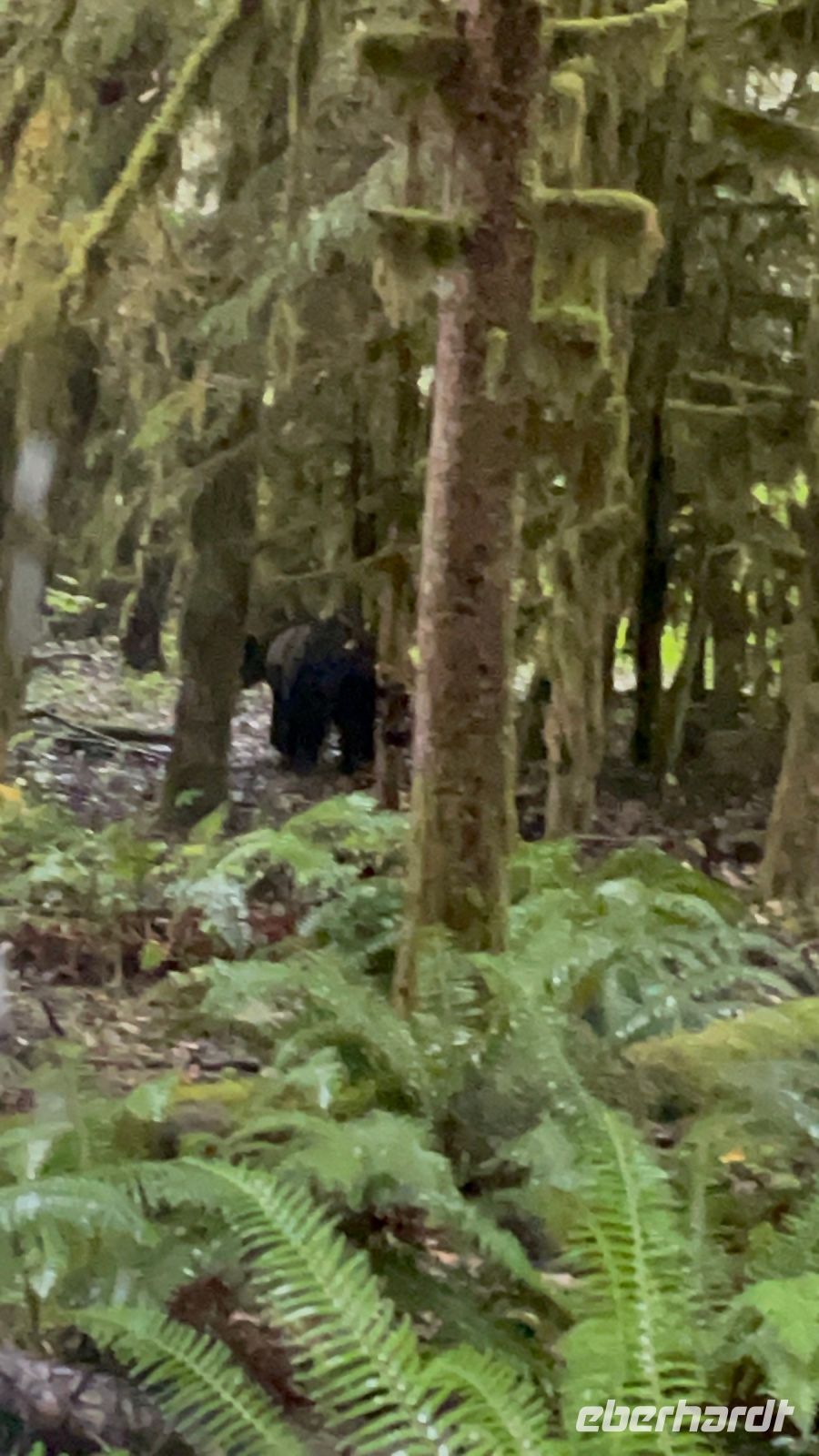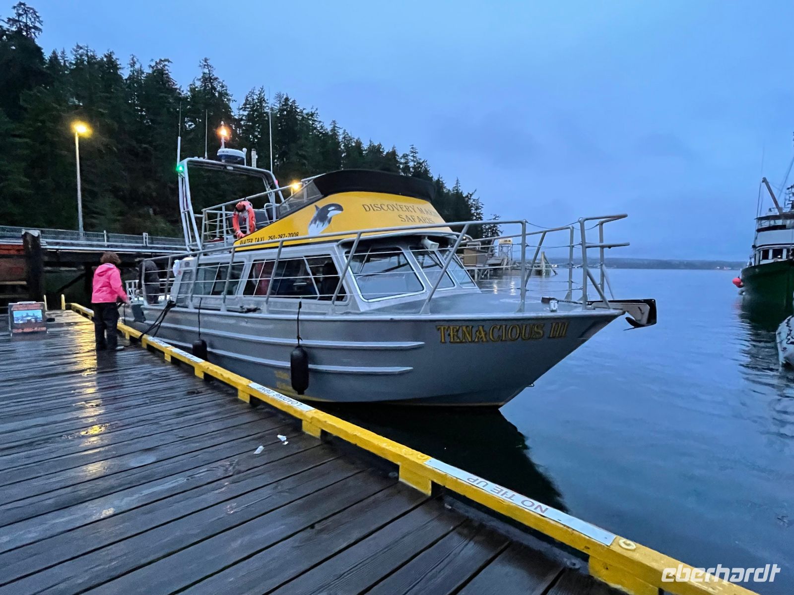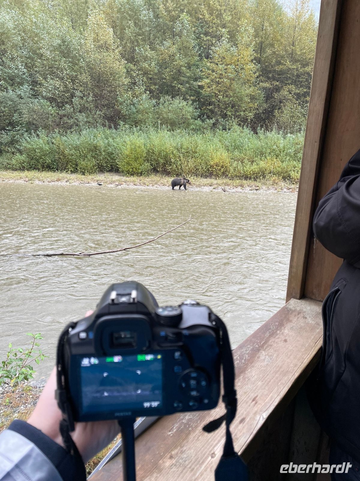 An unserem zweiten Tag auf Quadra Island haben wir die Wahl zwischen einer Bärenbeobachtung oder einer Kayaktour. Außerdem bieten sich individuelle Spaziergänge aufgrund der idyllischen Lage der Unterkunft an. Fast alle entscheiden sich für die knapp achtstündige Bärenbeobachtung und brechen gegen 11Uhr auf in Richtung angrenzendes Festland von British Columbia, da es nur dort Grizzlybären gibt. Wir starten bei strömenden Regen unsere zweistündige Bootsfahrt durch die malerische Discovery Bay. Begleitet werden wir von Heike – einer deutschsprachigen Naturkundlerin. Sie erzählt uns viel über die Tierwelt der Region. Für uns ein deutliches Upgrade der gebuchten Tour. Unterwegs ist der Wellengang mal stärker und mal schwächer. Größtenteils aber ruhig wie auf einem See. Am Ende des Fjordes angekommen, steigen wir vom Boot in einen Kleinbus um. Von nun an führen uns 2 Nativ People zu den Bären. Sie sind bewaffnet mit Pfefferspray… nur zur Sicherheit. Wir fahren kurz ins kleine Visitorcenter, wo wir nochmal auf die Toilette gehen sollen, denn für die nächsten 3 Stunden im Wald wäre es zu gefährlich. Danach fahren wir die beiden ersten Plattformen an und sehen leider nix. Doch ab der 3. Plattform sehen wir schon auf der Fahrt dahin ein Bär im Wald verschwinden… dieser taucht kurze Zeit später 25m vor unserer Kameralinse wieder auf. Wir sind begeistert! Doch das wars noch lange nicht. Wir sehen auf der anderen Seite vom Flussufer einen Bär wie er frisst. Kurze Zeit später wird er von einem anderen Bären verscheucht der auf unserer Flussseite seinen Lachs fing und nun dem anderen Bären den Fisch wegnehmen wollte. Dieser verschwand im Gebüsch und tauchte später weiter links von unserer Bärenaussichtsplattform wieder auf. Er schwimmt fast vor unserer Nase entlang… der Abstand beträgt weniger als 15m. Das ganze Spektakel zieht sich ca. eine Stunde lang hin, bis wir weiter zur nächsten Aussichtsstelle fahren und dort wieder einen Bären sehen können. Selbst auf dem Rückweg zum Boot kreuzt nochmal ein Bär unseren Weg. Was für eine tolle Tierbeobachtung! Das viele Geld hat sich zum Glück für alle Gäste gelohnt. Nun beginnt unsere 2-stündige Rückfahrt nach Quadra Island. Nach dem Abendessen spendiert uns Reiseleiterin Nadja noch eine Runde Rotwein und somit sitzen wir in gemütlicher Runde zusammen und werten die Erlebnisse des Tages aus.