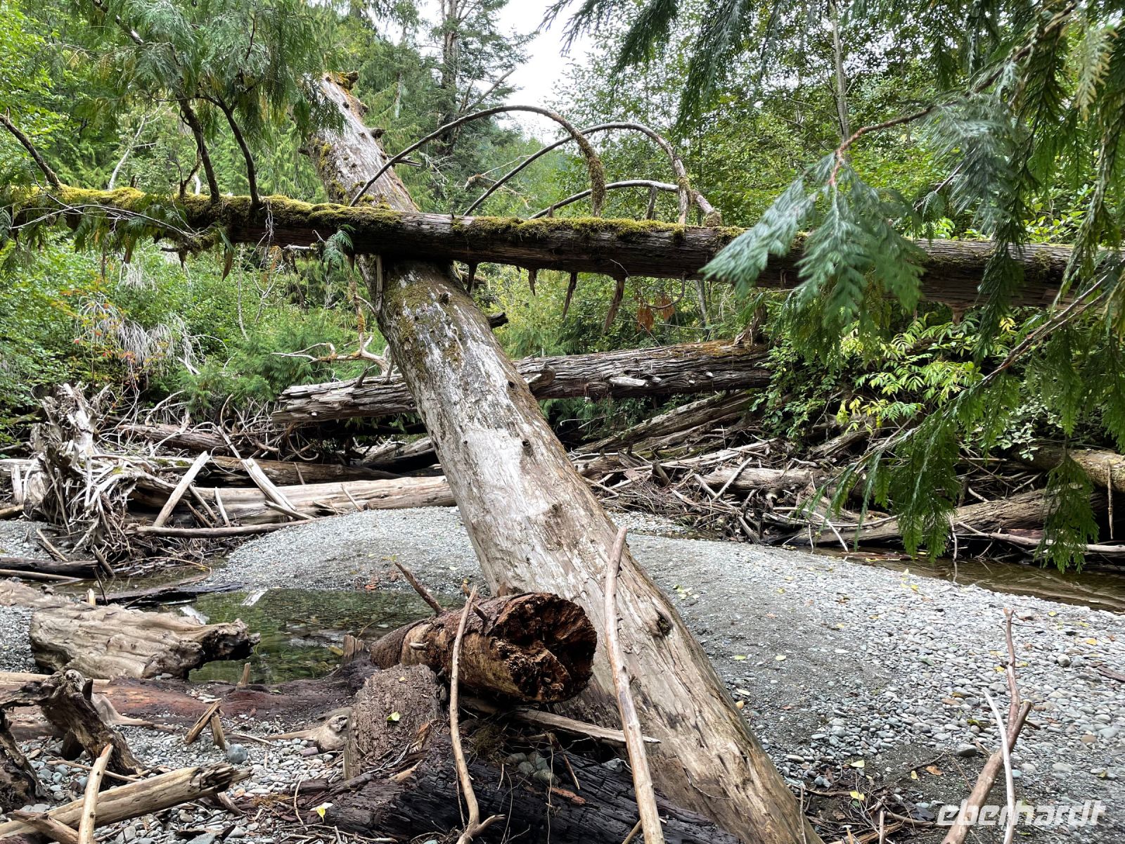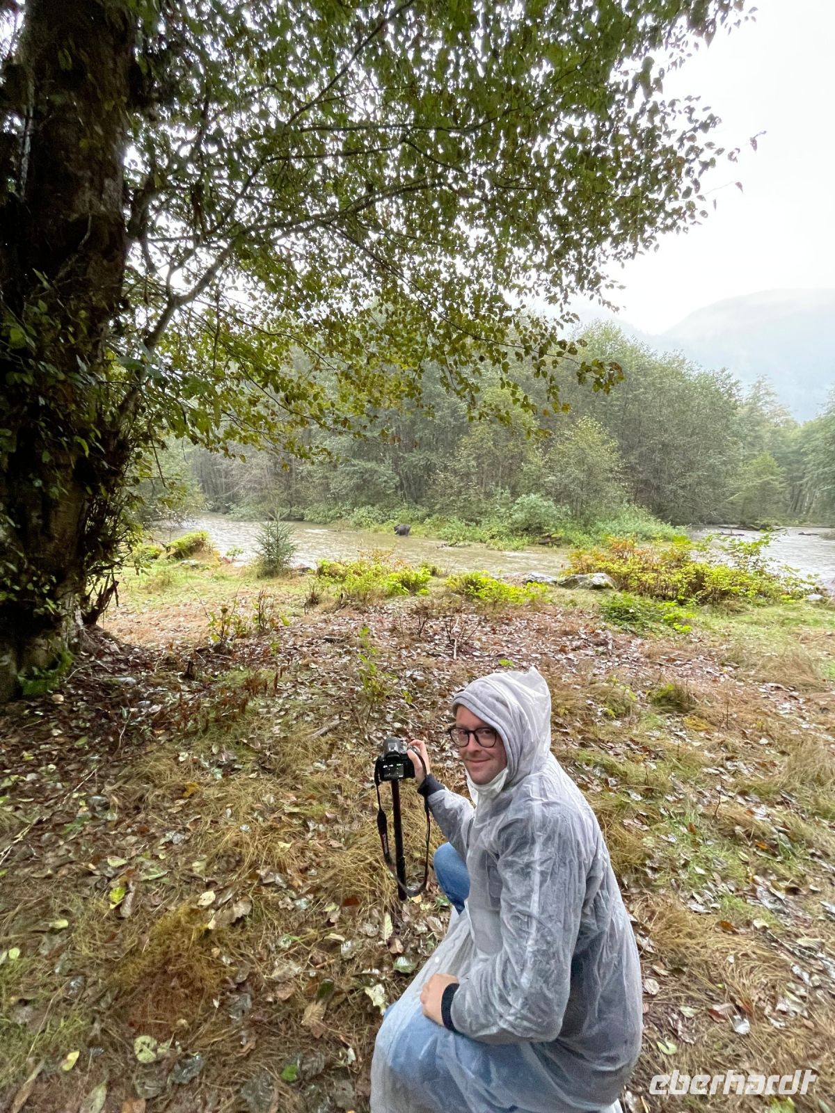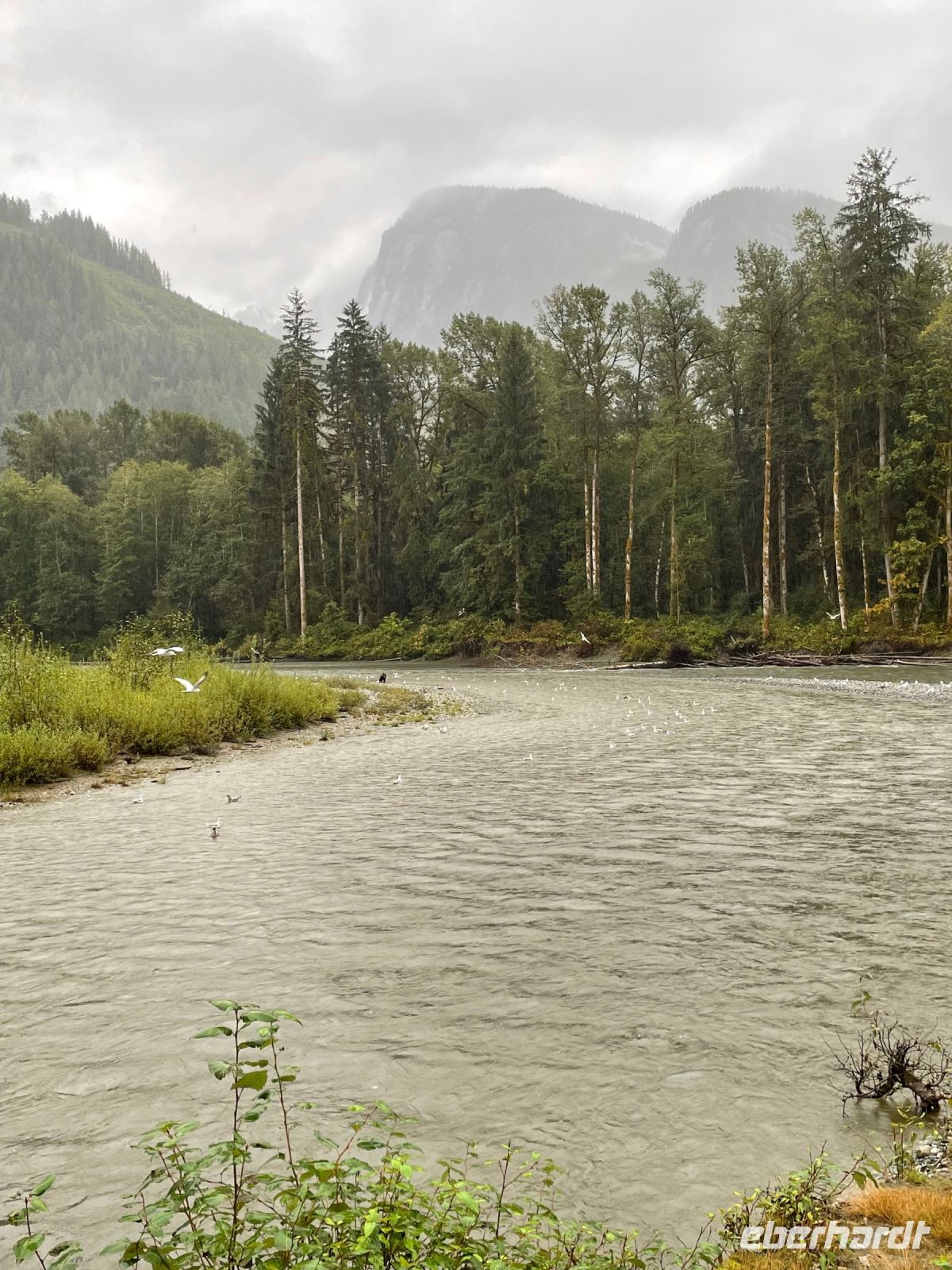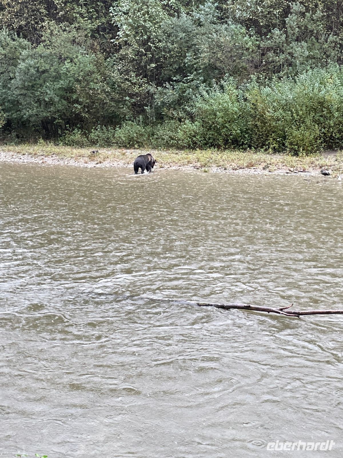 An unserem zweiten Tag auf Quadra Island haben wir die Wahl zwischen einer Bärenbeobachtung oder einer Kayaktour. Außerdem bieten sich individuelle Spaziergänge aufgrund der idyllischen Lage der Unterkunft an. Fast alle entscheiden sich für die knapp achtstündige Bärenbeobachtung und brechen gegen 11Uhr auf in Richtung angrenzendes Festland von British Columbia, da es nur dort Grizzlybären gibt. Wir starten bei strömenden Regen unsere zweistündige Bootsfahrt durch die malerische Discovery Bay. Begleitet werden wir von Heike – einer deutschsprachigen Naturkundlerin. Sie erzählt uns viel über die Tierwelt der Region. Für uns ein deutliches Upgrade der gebuchten Tour. Unterwegs ist der Wellengang mal stärker und mal schwächer. Größtenteils aber ruhig wie auf einem See. Am Ende des Fjordes angekommen, steigen wir vom Boot in einen Kleinbus um. Von nun an führen uns 2 Nativ People zu den Bären. Sie sind bewaffnet mit Pfefferspray… nur zur Sicherheit. Wir fahren kurz ins kleine Visitorcenter, wo wir nochmal auf die Toilette gehen sollen, denn für die nächsten 3 Stunden im Wald wäre es zu gefährlich. Danach fahren wir die beiden ersten Plattformen an und sehen leider nix. Doch ab der 3. Plattform sehen wir schon auf der Fahrt dahin ein Bär im Wald verschwinden… dieser taucht kurze Zeit später 25m vor unserer Kameralinse wieder auf. Wir sind begeistert! Doch das wars noch lange nicht. Wir sehen auf der anderen Seite vom Flussufer einen Bär wie er frisst. Kurze Zeit später wird er von einem anderen Bären verscheucht der auf unserer Flussseite seinen Lachs fing und nun dem anderen Bären den Fisch wegnehmen wollte. Dieser verschwand im Gebüsch und tauchte später weiter links von unserer Bärenaussichtsplattform wieder auf. Er schwimmt fast vor unserer Nase entlang… der Abstand beträgt weniger als 15m. Das ganze Spektakel zieht sich ca. eine Stunde lang hin, bis wir weiter zur nächsten Aussichtsstelle fahren und dort wieder einen Bären sehen können. Selbst auf dem Rückweg zum Boot kreuzt nochmal ein Bär unseren Weg. Was für eine tolle Tierbeobachtung! Das viele Geld hat sich zum Glück für alle Gäste gelohnt. Nun beginnt unsere 2-stündige Rückfahrt nach Quadra Island. Nach dem Abendessen spendiert uns Reiseleiterin Nadja noch eine Runde Rotwein und somit sitzen wir in gemütlicher Runde zusammen und werten die Erlebnisse des Tages aus.