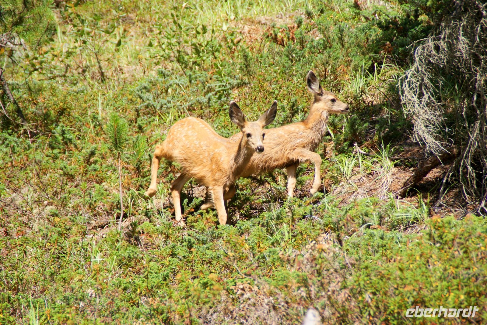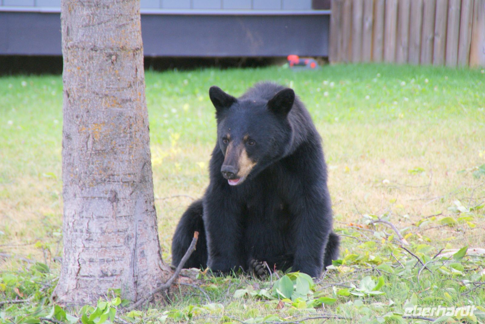 Am frühen Morgen waren einige Kojoten oder gar Wölfe in der Nähe zu hören und deren Geheule hat dann doch so manchen aus dem Schlaf gerissen. Nichtsdestotrotz: Entspannung ist das Motto des Tages. So schläft ein jeder aus wie er kann oder möchte, frühstückt genüsslich und lässt die Seele baumeln. Am späten Vormittag trifft sich der Großteil der Gruppe und wandert mit uns gemeinsam den „Interpretive Trail“ am See entlang. Warnschilder weisen darauf hin, dass auch Bären den Weg nutzen. Deren Hinterlassenschaften sind für uns deutlich sichtbar entlang unserer schönen Route. So streifen wir durch die herrliche Natur mit Blick auf den Tyaughton Lake und befinden uns so mitten in der Wildnis Kanadas. Es bleibt sportlich. Einige von uns stechen per Kanu auf den See hinaus. Gemächlich paddeln wir am Ufer entlang und schauen uns die schönen Wochenend-oder Ferienhäuser an, die noch vereinzelt in der Nachbarschaft ansässig sind. Wieder ist ein Wolf oder Kojote zu hören…eine interessante Kulisse. Wir sehen einen Schwarzbären auf einem Grundstück, der aber dann schnell das Weite sucht. Im seichten Wasser gibt es herrliche Spiegelungen der Blockhütten und Bäume am Ufer und die wunderschöne Natur Kanadas gibt sich und uns die Ehre. Nachmittags sitzen wir in gemütlicher Runde auf der Wiese unserer Anlage, als plötzlich zwei junge Grizzlybären auftauchen, in unmittelbarer Nähe ein Wespennest ausgraben, ein Bad im See nehmen und wieder im Wald verschwinden-wir bleiben sprachlos zurück. Wir haben gehofft, Bären zu sehen, dass diese direkt durch die Anlage spazieren, damit hat niemand gerechnet. Abends lassen wir unseren Aufenthalt mit einem erneut tollen Abendessen in der Lodge ausklingen, welches exklusiv für uns serviert wird.
