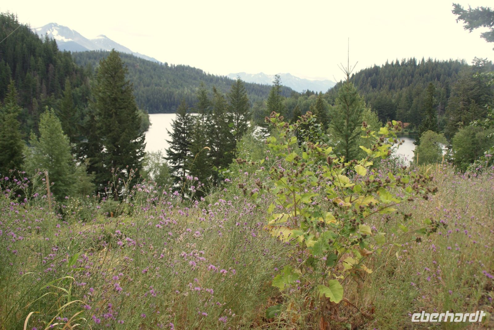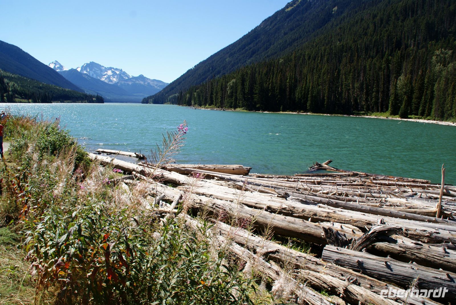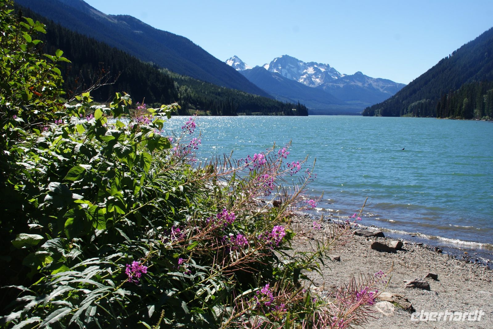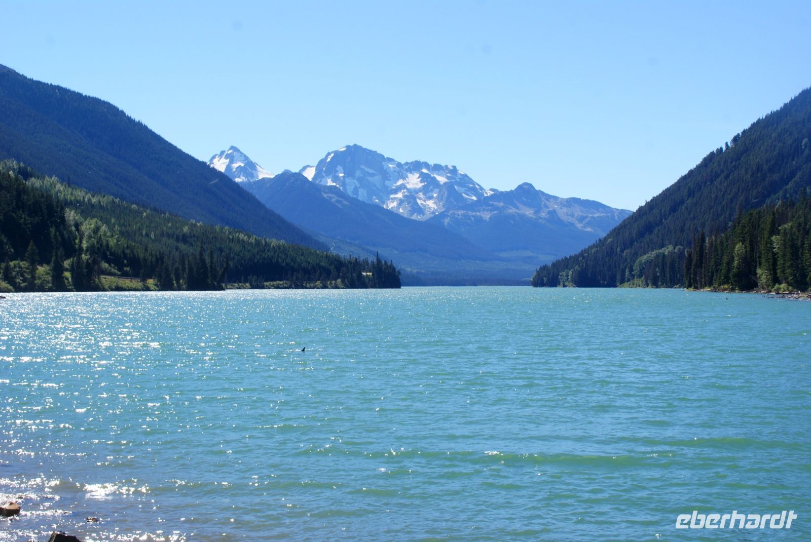 Ein letztes Mal frühstücken wir exklusive in der Tyax Lodge, in der wir nun wirklich die einzigen Gäste sind. So richtig weg möchte hier eigentlich niemand. Die Ruhe, das Panorama, die netten Mitarbeiter, die Erlebnisse…all das haben wir sehr genossen und könnten noch Tage bleiben. Reisen wir also weiter. Die Sonne lacht und das herrliche Wetter bietet uns eine Bilderbuchkulisse. Wieder zurück am 50 Km langen Carpenter Lake erfreuen wir uns an der tollen Landschaft und dem Smaragdgrün des Sees, der stets an unserer Seite bleibt. Mittags halten wir in Lillooet und kaufen für unser heutiges Mittagspicknick ein. Dieses genießen wir am 22Km langen Seton Lake, an dessen Ufer Picknicktische-und Bänke für uns bereitstehen. Eine schönere Kulisse kann es ja nicht geben. Gut verköstigt ziehen wir weiter, um schon bald am genauso idyllischen Duffy Lake zu halten. Hier hat sich viel Treibholz gesammelt, was auch wieder für viele schöne Fotomotive sorgt. Kurz vor Ankunft in Whistler noch ein Stopp am One Mile Lake bei mittlerweile 35 Grad, lässt uns dann doch ein wenig unter der Hitze ächzen. Unser Tagesziel Whistler liegt unmittelbar bevor und als das Ziel erreicht ist, sind wir doch ein bisschen vom urbanen Leben erschlagen. So direkt aus der Natur ins pure Leben zu fallen, fühlt sich mittlerweile schon fremd an. Der bekannte Skiort zieht offensichtlich auch im Sommer viel junges Publikum an, welches mit Mountainbikes per Seilbahn den Berg hinauffährt um sich von dort in die Tiefe zu stürzen. Wir belassen es beim Schlendern durch die belebte Fußgängerzone und deren zahlreiche Geschäfte. Der Abend verläuft italienisch und so lassen wir es uns im Restaurant Quattro schmecken und schlendern danach noch durch die lebhafte Fußgängerzone.