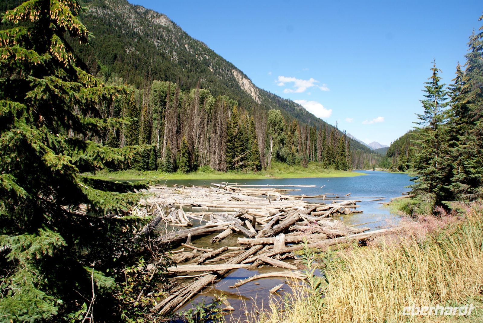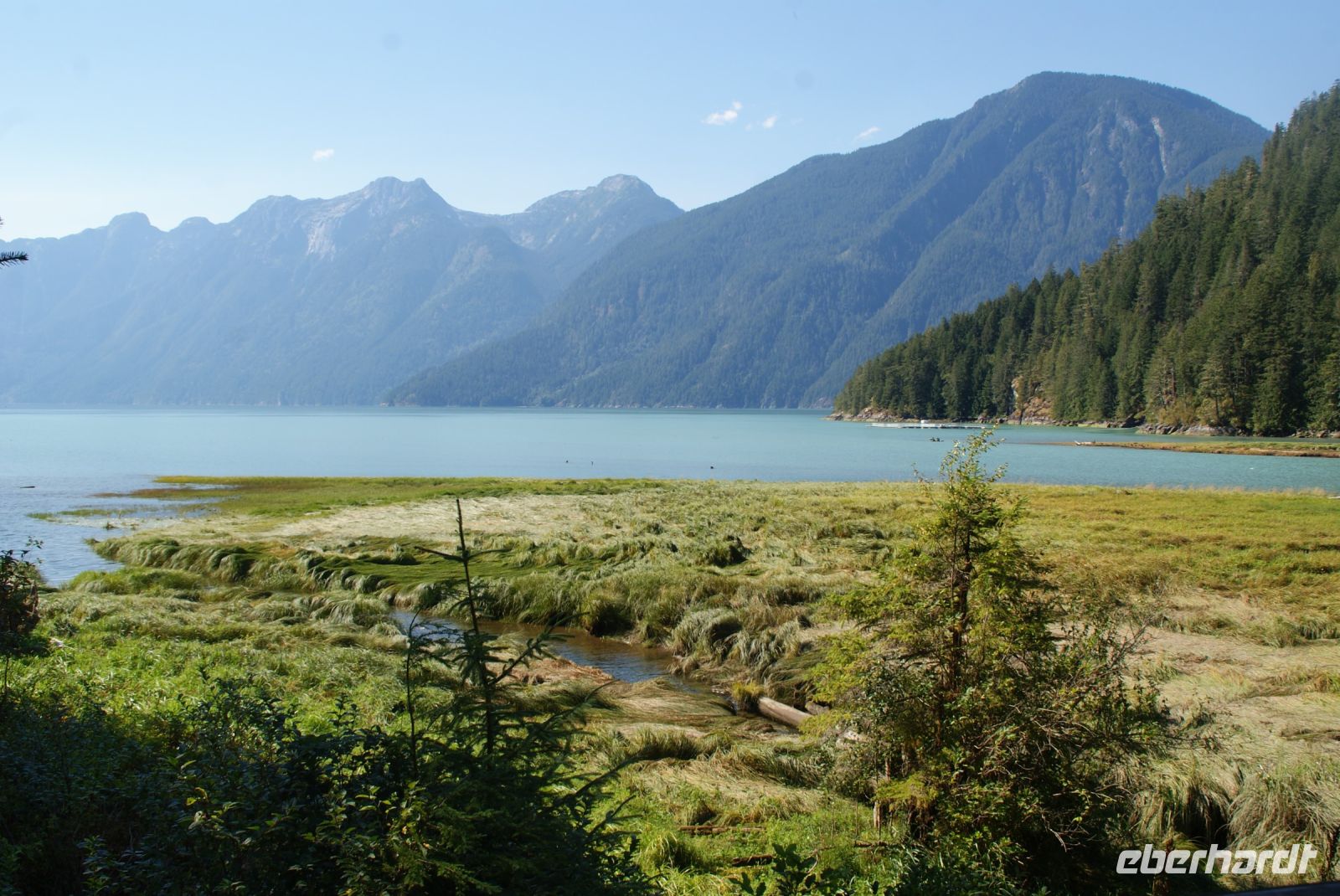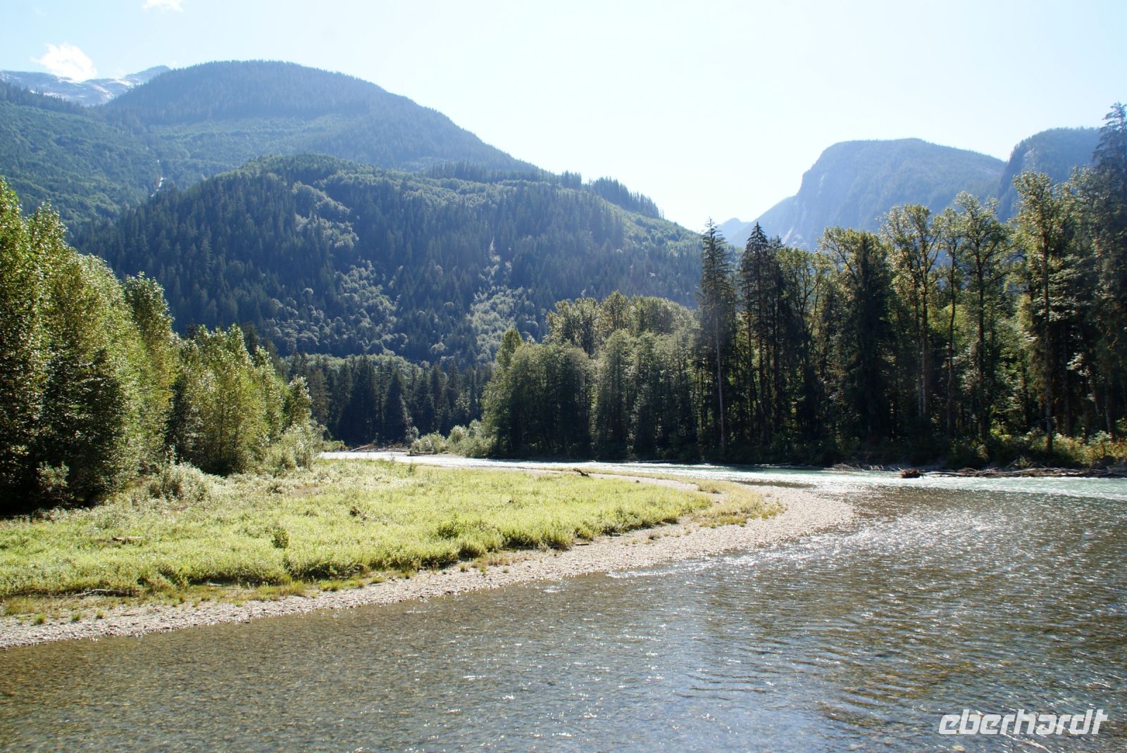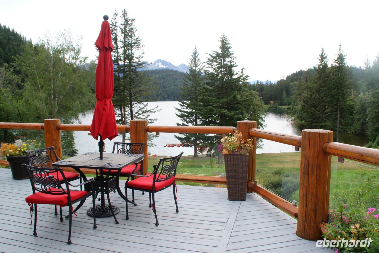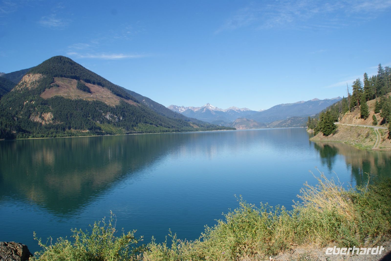 Ein letztes Mal frühstücken wir exklusive in der Tyax Lodge, in der wir nun wirklich die einzigen Gäste sind. So richtig weg möchte hier eigentlich niemand. Die Ruhe, das Panorama, die netten Mitarbeiter, die Erlebnisse…all das haben wir sehr genossen und könnten noch Tage bleiben. Reisen wir also weiter. Die Sonne lacht und das herrliche Wetter bietet uns eine Bilderbuchkulisse. Wieder zurück am 50 Km langen Carpenter Lake erfreuen wir uns an der tollen Landschaft und dem Smaragdgrün des Sees, der stets an unserer Seite bleibt. Mittags halten wir in Lillooet und kaufen für unser heutiges Mittagspicknick ein. Dieses genießen wir am 22Km langen Seton Lake, an dessen Ufer Picknicktische-und Bänke für uns bereitstehen. Eine schönere Kulisse kann es ja nicht geben. Gut verköstigt ziehen wir weiter, um schon bald am genauso idyllischen Duffy Lake zu halten. Hier hat sich viel Treibholz gesammelt, was auch wieder für viele schöne Fotomotive sorgt. Kurz vor Ankunft in Whistler noch ein Stopp am One Mile Lake bei mittlerweile 35 Grad, lässt uns dann doch ein wenig unter der Hitze ächzen. Unser Tagesziel Whistler liegt unmittelbar bevor und als das Ziel erreicht ist, sind wir doch ein bisschen vom urbanen Leben erschlagen. So direkt aus der Natur ins pure Leben zu fallen, fühlt sich mittlerweile schon fremd an. Der bekannte Skiort zieht offensichtlich auch im Sommer viel junges Publikum an, welches mit Mountainbikes per Seilbahn den Berg hinauffährt um sich von dort in die Tiefe zu stürzen. Wir belassen es beim Schlendern durch die belebte Fußgängerzone und deren zahlreiche Geschäfte. Der Abend verläuft italienisch und so lassen wir es uns im Restaurant Quattro schmecken und schlendern danach noch durch die lebhafte Fußgängerzone.