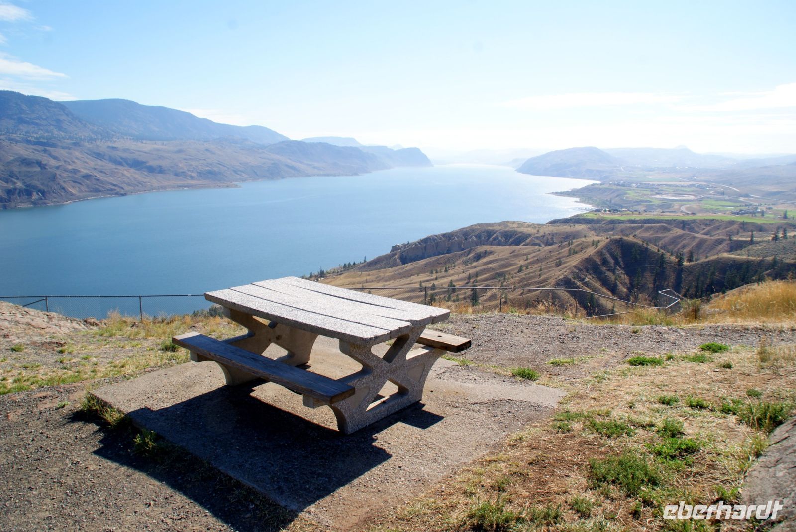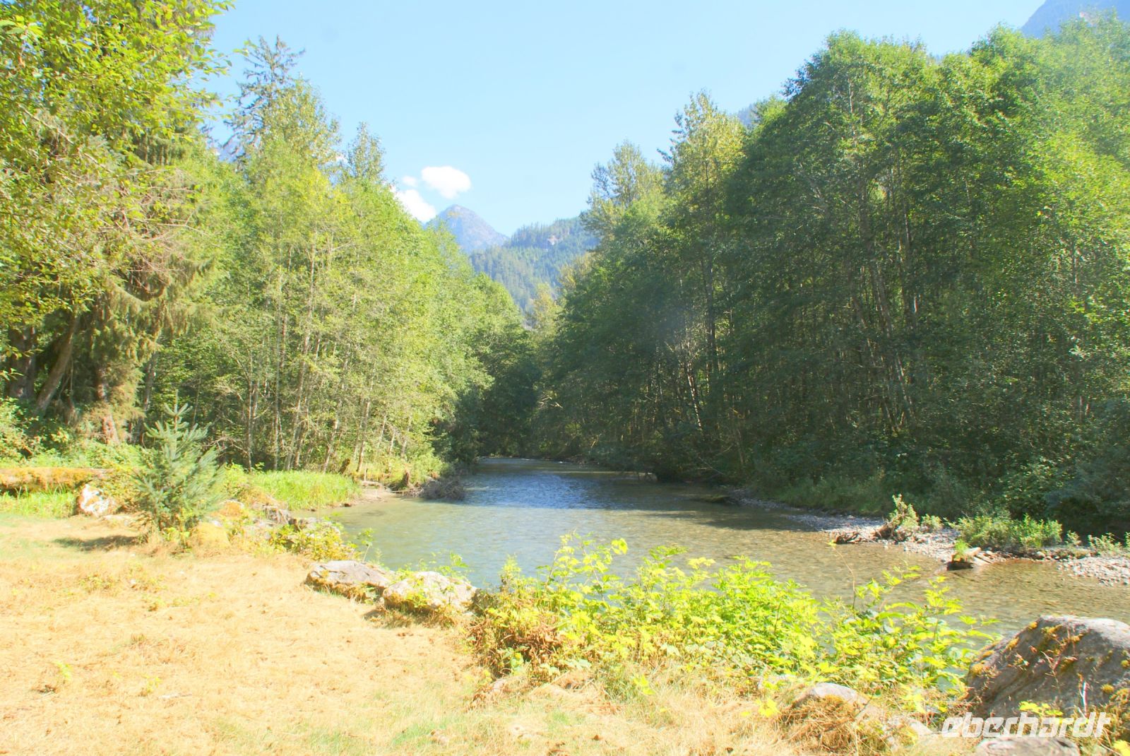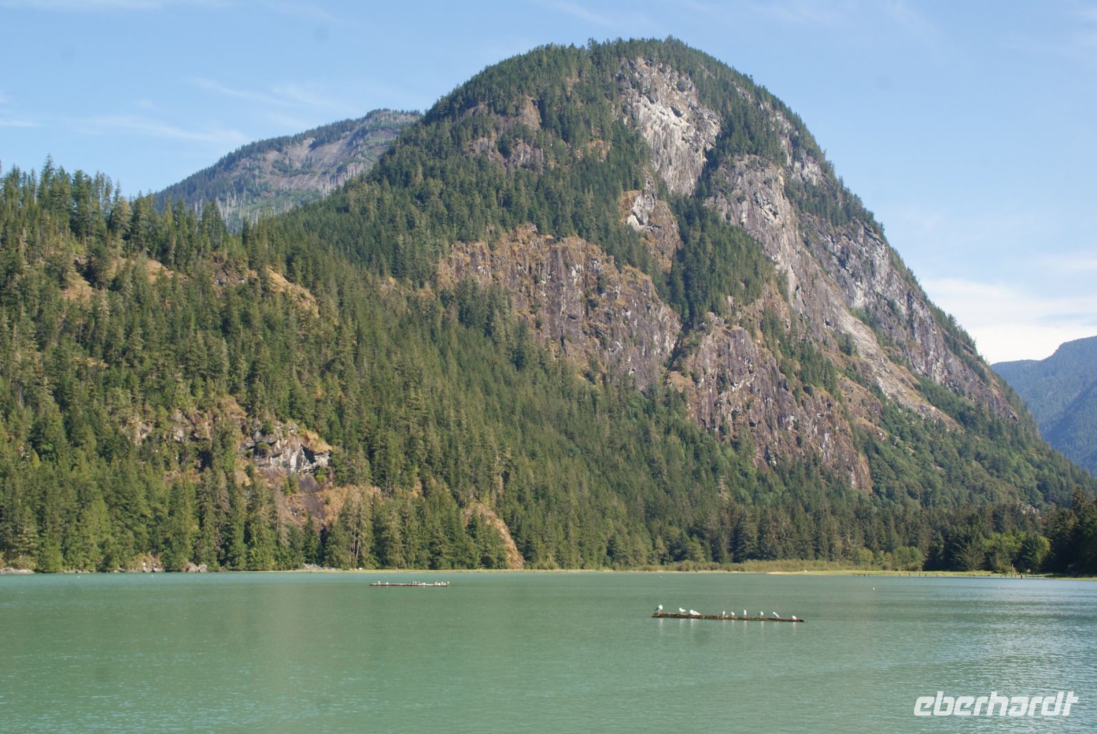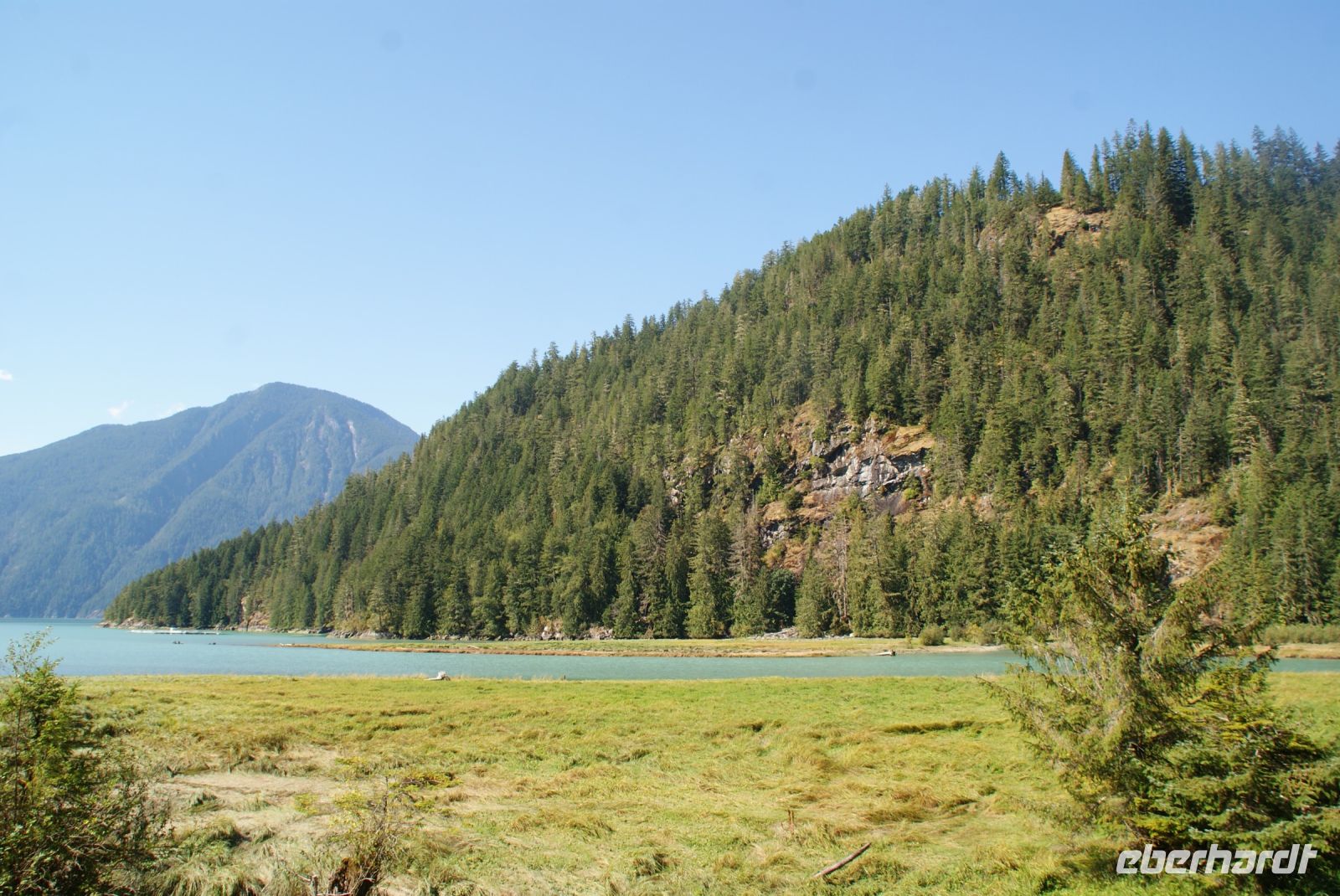 Ein letztes Mal frühstücken wir exklusive in der Tyax Lodge, in der wir nun wirklich die einzigen Gäste sind. So richtig weg möchte hier eigentlich niemand. Die Ruhe, das Panorama, die netten Mitarbeiter, die Erlebnisse…all das haben wir sehr genossen und könnten noch Tage bleiben. Reisen wir also weiter. Die Sonne lacht und das herrliche Wetter bietet uns eine Bilderbuchkulisse. Wieder zurück am 50 Km langen Carpenter Lake erfreuen wir uns an der tollen Landschaft und dem Smaragdgrün des Sees, der stets an unserer Seite bleibt. Mittags halten wir in Lillooet und kaufen für unser heutiges Mittagspicknick ein. Dieses genießen wir am 22Km langen Seton Lake, an dessen Ufer Picknicktische-und Bänke für uns bereitstehen. Eine schönere Kulisse kann es ja nicht geben. Gut verköstigt ziehen wir weiter, um schon bald am genauso idyllischen Duffy Lake zu halten. Hier hat sich viel Treibholz gesammelt, was auch wieder für viele schöne Fotomotive sorgt. Kurz vor Ankunft in Whistler noch ein Stopp am One Mile Lake bei mittlerweile 35 Grad, lässt uns dann doch ein wenig unter der Hitze ächzen. Unser Tagesziel Whistler liegt unmittelbar bevor und als das Ziel erreicht ist, sind wir doch ein bisschen vom urbanen Leben erschlagen. So direkt aus der Natur ins pure Leben zu fallen, fühlt sich mittlerweile schon fremd an. Der bekannte Skiort zieht offensichtlich auch im Sommer viel junges Publikum an, welches mit Mountainbikes per Seilbahn den Berg hinauffährt um sich von dort in die Tiefe zu stürzen. Wir belassen es beim Schlendern durch die belebte Fußgängerzone und deren zahlreiche Geschäfte. Der Abend verläuft italienisch und so lassen wir es uns im Restaurant Quattro schmecken und schlendern danach noch durch die lebhafte Fußgängerzone.