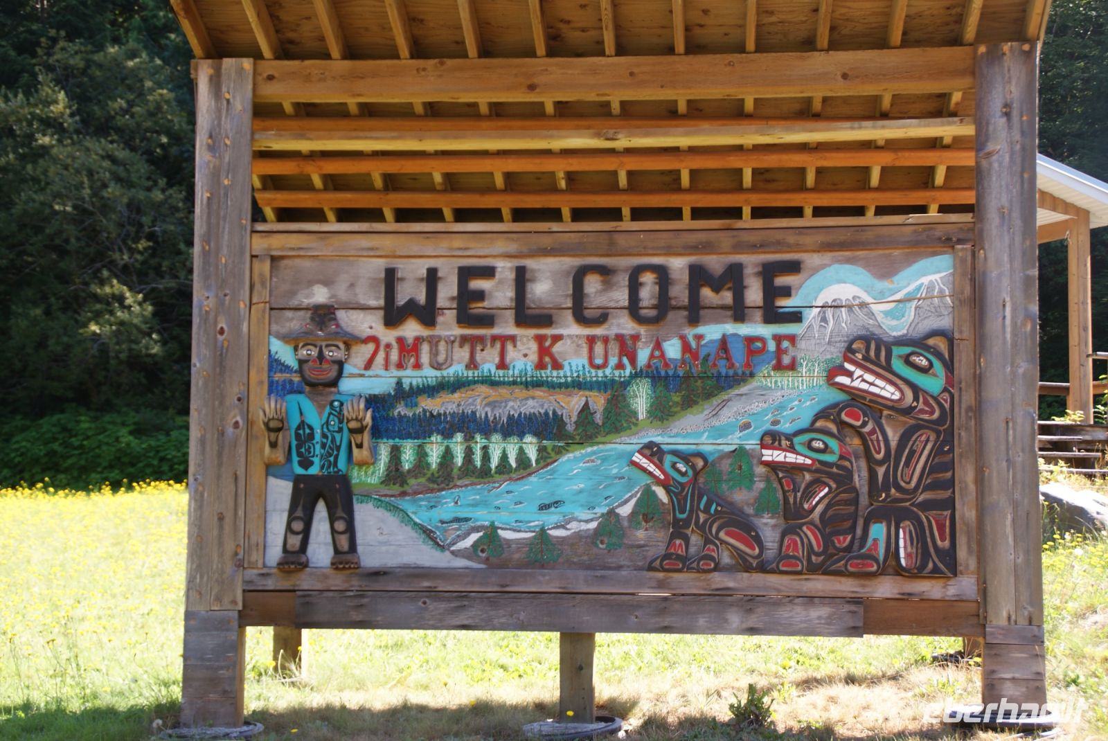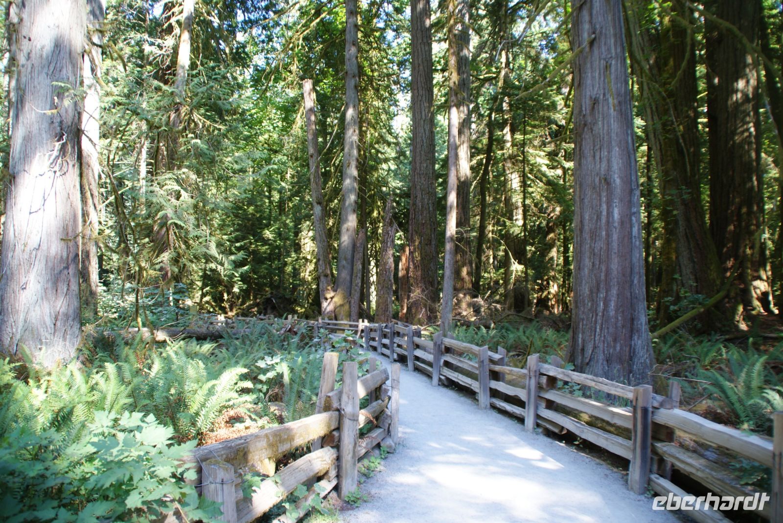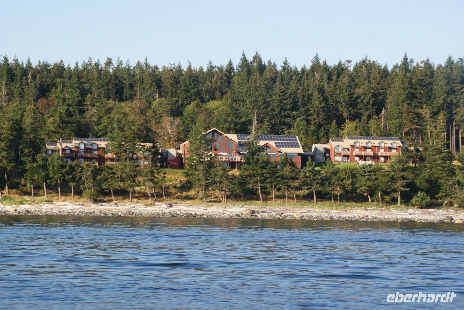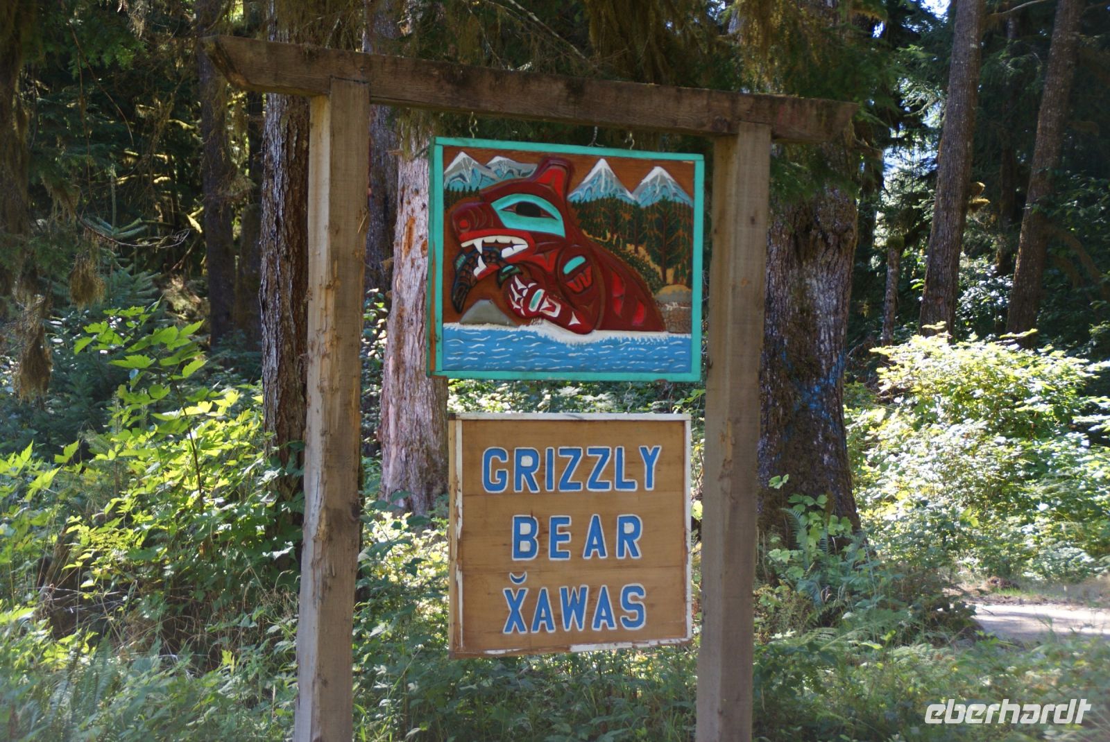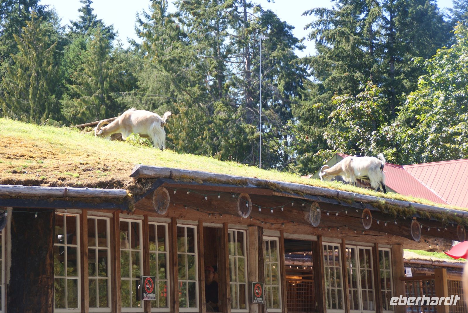 Die quirlige Stadt Whistler verlassen wir alle wieder gerne und es zieht uns zurück in die Natur. Diese erreichen wir auch noch kurzer Zeit, halten an den Alexander Falls (Fällen), die wie ein Brautschleierwasserfall aussehen. Am Tantalus Lookout auf 300 m Höhe haben wir ein herrliches Panorama auf den vor uns liegenden See mit Gebirge im Hintergrund, der Gipfel mit Gletschern bedeckt sind. Zu den folgenden Shannon Falls spazieren wir idyllisch durch den Wald und haben auch hier wieder ein tolles Fotomotiv. An der Horseshoe Bay angekommen, nehmen wir die Fähre nach Vancouver Island. Die Überfahrt dauert 1,40 Std. und wir verbringen die Zeit geschützt an der frischen Seeluft und bei absolutem Kaiserwetter kann es nicht schöner sein. Herrliches Bergpanorama, dazu die tiefblaue Bucht, was will man mehr! Auf Vancouver Island angekommen, halten wir beim Coombs, welches bekannt ist für seine Ziegen auf dem Dach! Und tatsächlich- zwei Ziegen grasen auf dem begrünten Dach des großen Shops und sind ein echter Hingucker. Im Anschluss halten wir an der Cathedral Cove im McMillan Provincial Park, wo es die berühmten Mammutbäume zu bestaunen gilt. Einem schönen Waldpfad folgend, sehen wir jahrhundertalte Zedern und Douglasien, deren ältestes Exemplar 800 Jahre alt sein soll. Diese hat eine Höhe von 76 m und einen Umfang von 9 m. Absolut beachtlich und man fühlt sich –plötzlich nichtig und klein! Die letzte Fähre des Tages führt uns nach 15 Minuten zur Quadra Island, wo wir in der Tsa Kwa Luten Lodge für zwei Nächte einziehen. Erneut irgendwo im nirgendwo nächtigen wir nun mit Blick auf die vor uns liegende Bucht und ein schöneres Panorama kann es nicht geben. Abends speisen wir hier in gemütlicher Runde und sind schon aufgeregt, was uns bei der morgigen Bärenbeobachtung erwarten wird.