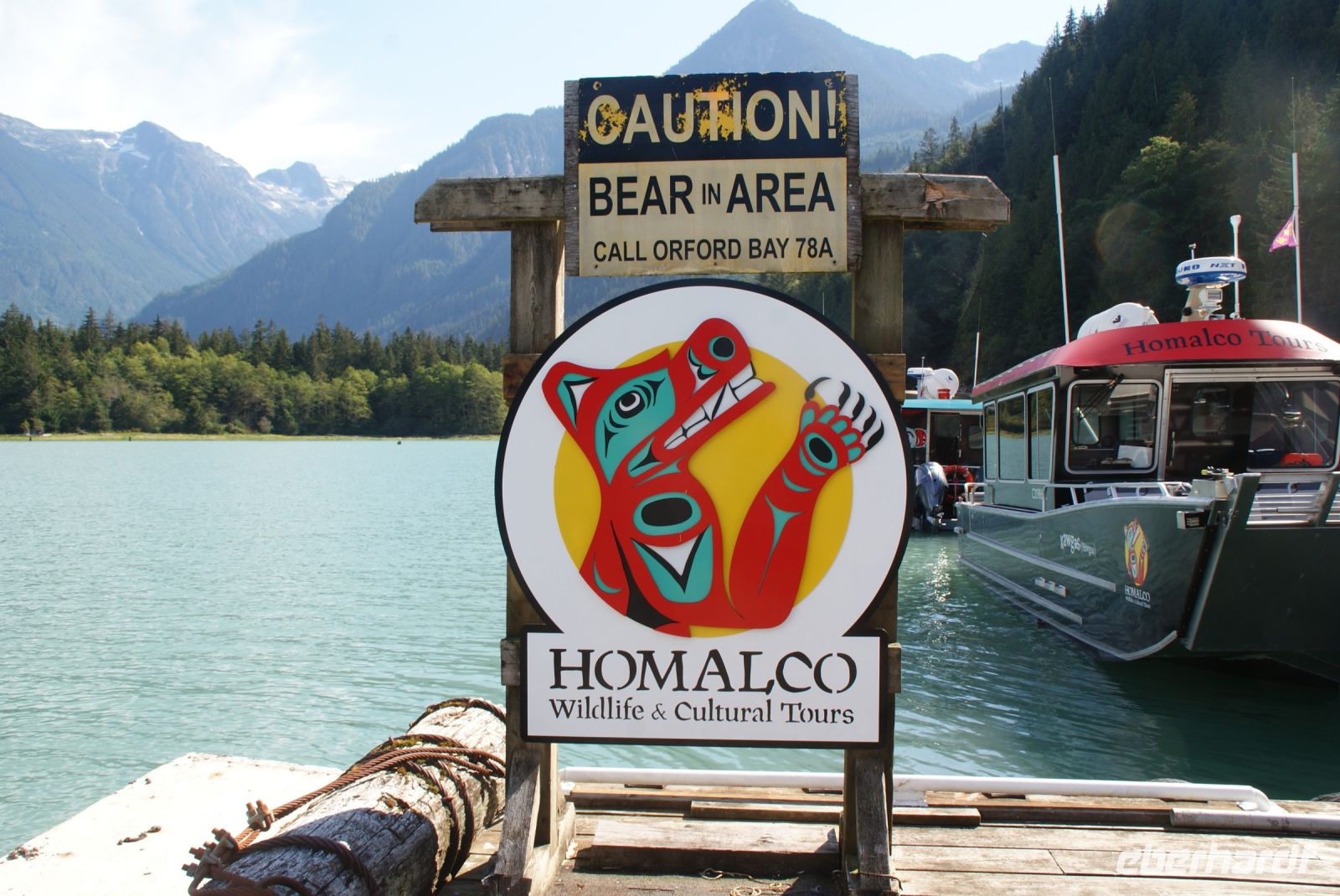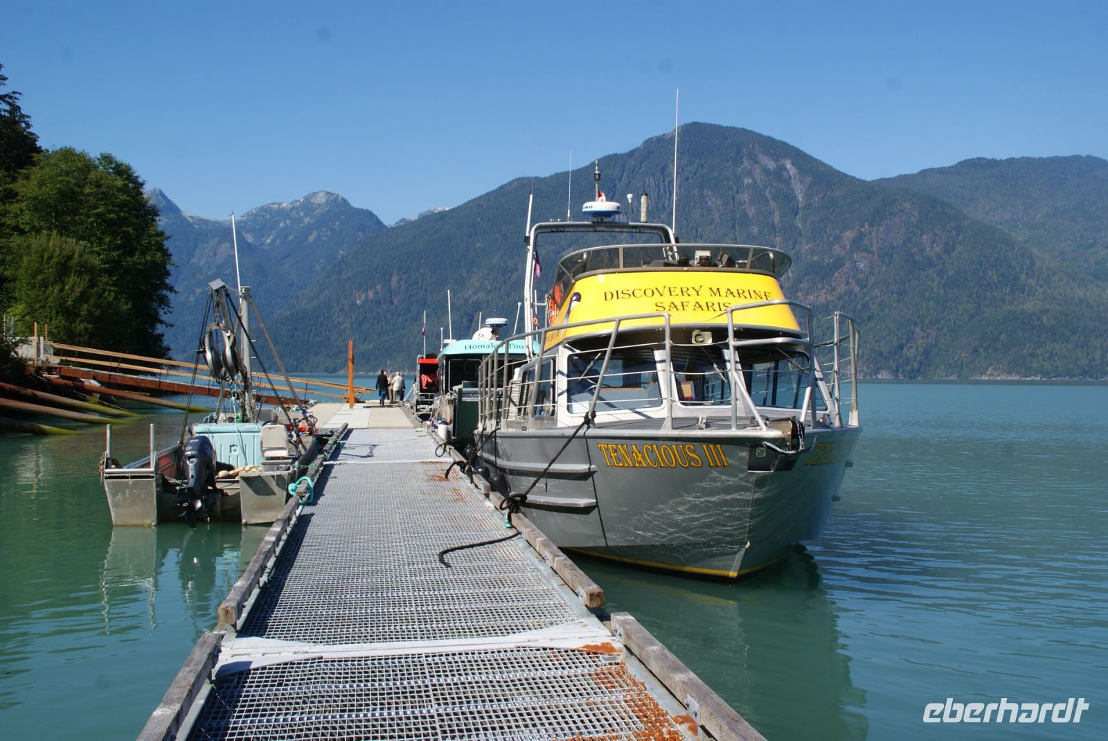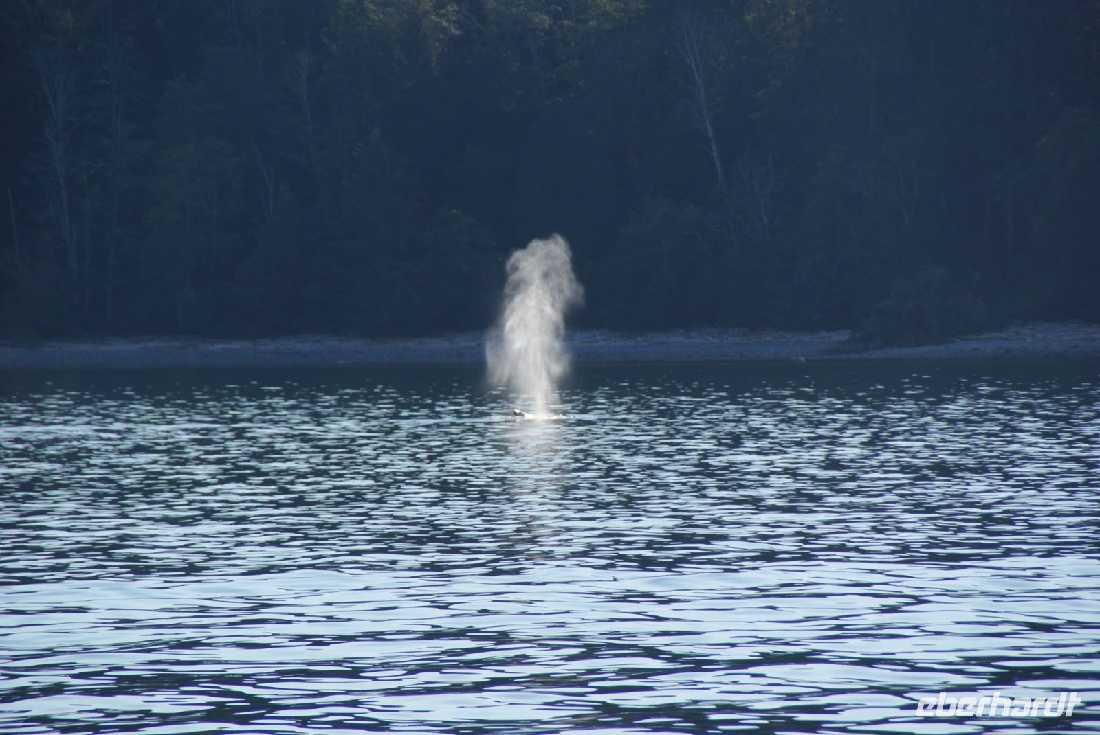 Der heutige Morgen verspricht erneut einen herrlichen Sommertag und so starten wir nach einem kanadischen Holzfällerfrühstück Richtung Hafen, wo wir von Steve und Damon und deren Schiff an Bord genommen werden. Nach gründlicher Sicherheitseinweisung fahren wir gute zwei Stunden auf ruhigem Gewässer bis zu der Stelle, wo wir mit der Bärenbeobachtung starten. Zunächst erfolgt ein rustikaler Mittagssnack auf einer Plattform mitten in der kanadischen Wildnis gelegen. Anschließend erhalten wir einen eigenen Bus und mit Guide Helen, Bärenspezialistin und First Nation Barry als Fahrer (dazu noch Steve) geht es auf Bärenbeobachtung. Wir besteigen nach kurzer Zeit die erste Plattform und sehen zunächst nichts. Kurz vor der zweiten Plattform entdecken wir plötzlich einen Grizzlybären, der in den Fluss prescht und sich einen riesigen Lachs fängt. Welch ein Beginn-wir sind begeistert. Nachdem wir die zweite Plattform bestiegen haben (diese ist bestens mit einem Zaun und Tür gesichtert), sehen wir einen weiteren Bären, der durch das niedrige Wasser schnorchelt und kläglich scheitert beim Versuch einen Lachs zu erlegen. All dies beobachten wir aus nächster Nähe-welch ein Erlebnis. Im Laufe unserer insgesamt drei-stündigen Bärentour sehen wir noch eine Bärin mit Jungtier, die aufrecht auf zwei Beinen in unsere Richtung schaut und uns neugierig beäugt. Einfach toll! Am Nachmittag geht es wieder zurück per Schiff und mit unseren Guides halten wir nun Ausschau nach Buckelwalen. Wir sehen zwei davon und verweilen eine ganze Weile, immer auf der Suche nach deren Fontäne. Seelöwen gesellen sich auch noch dazu, sodass der heutige Tag mit fantastischem Wetter und sommerlichen Temperaturen ein rundum wunderbares und unvergessenes Erlebnis war, welches wir sicher nicht missen wollen. Zurück in der Lodge tauschen wir unsere Erlebnisse bei einem leckeren Abendessen aus.