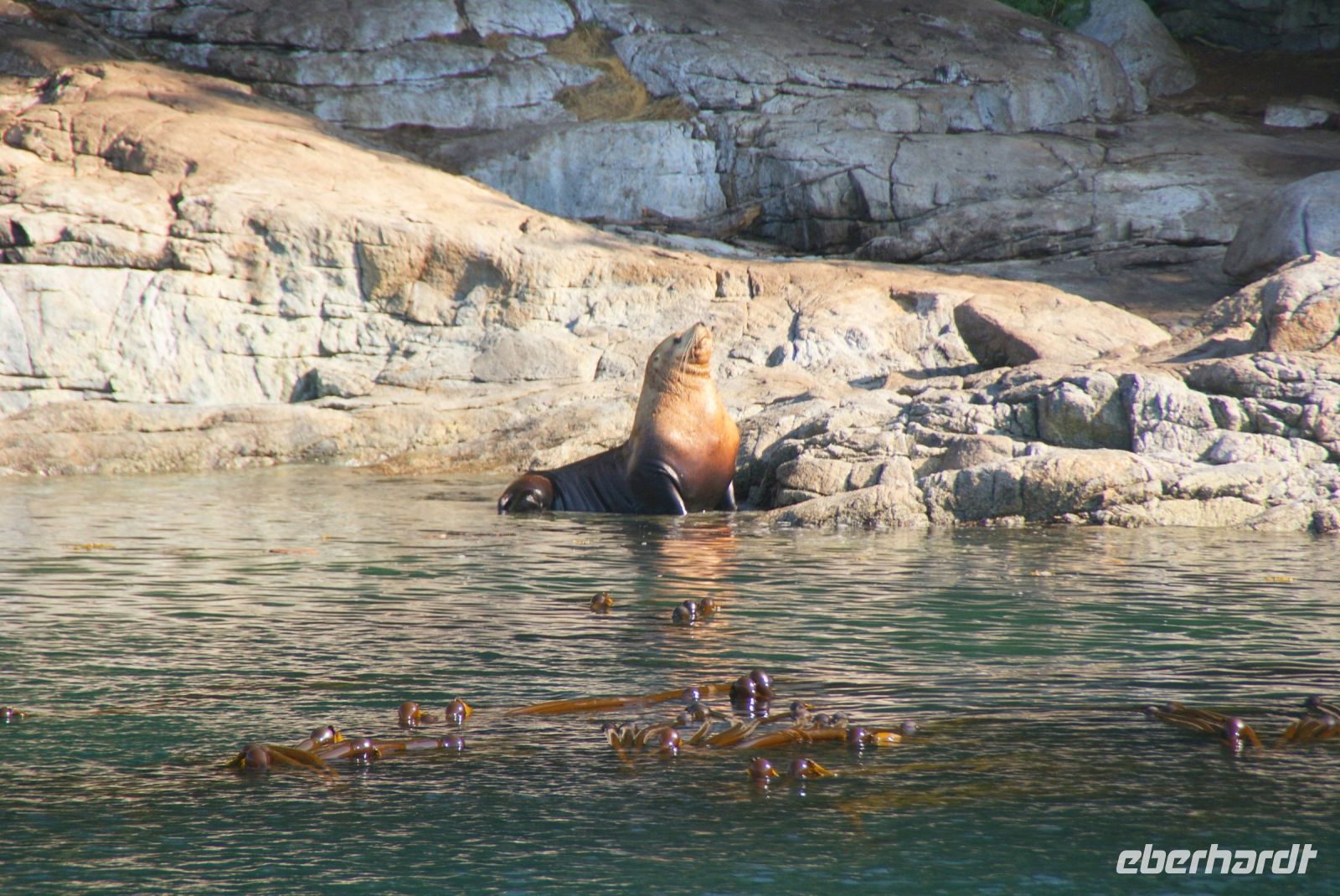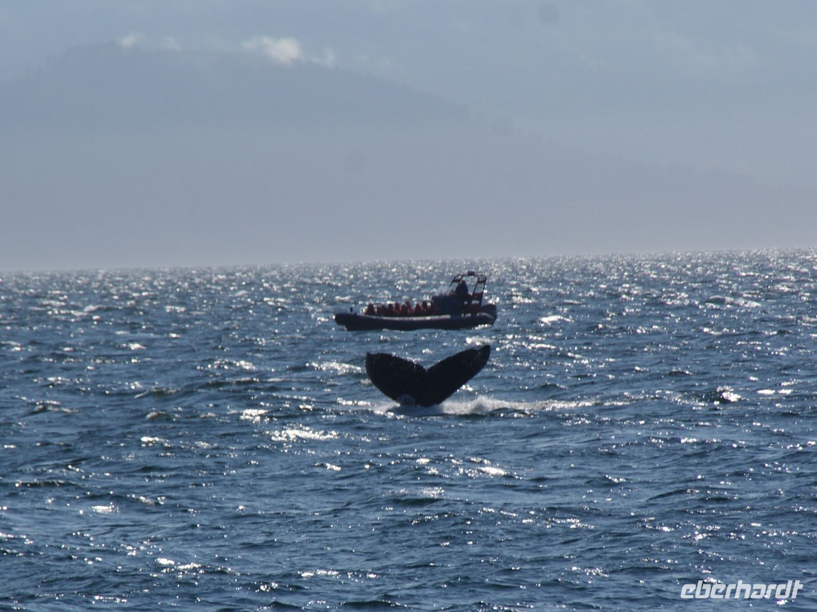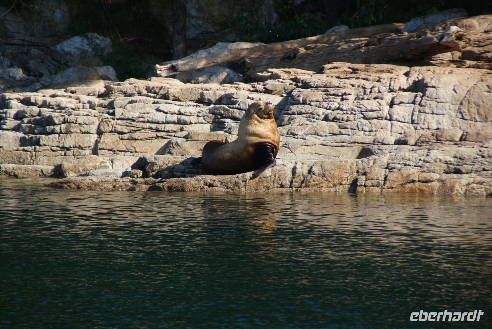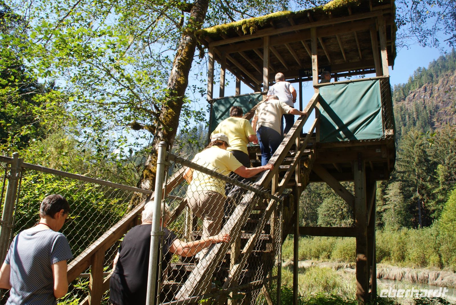 Der heutige Morgen verspricht erneut einen herrlichen Sommertag und so starten wir nach einem kanadischen Holzfällerfrühstück Richtung Hafen, wo wir von Steve und Damon und deren Schiff an Bord genommen werden. Nach gründlicher Sicherheitseinweisung fahren wir gute zwei Stunden auf ruhigem Gewässer bis zu der Stelle, wo wir mit der Bärenbeobachtung starten. Zunächst erfolgt ein rustikaler Mittagssnack auf einer Plattform mitten in der kanadischen Wildnis gelegen. Anschließend erhalten wir einen eigenen Bus und mit Guide Helen, Bärenspezialistin und First Nation Barry als Fahrer (dazu noch Steve) geht es auf Bärenbeobachtung. Wir besteigen nach kurzer Zeit die erste Plattform und sehen zunächst nichts. Kurz vor der zweiten Plattform entdecken wir plötzlich einen Grizzlybären, der in den Fluss prescht und sich einen riesigen Lachs fängt. Welch ein Beginn-wir sind begeistert. Nachdem wir die zweite Plattform bestiegen haben (diese ist bestens mit einem Zaun und Tür gesichtert), sehen wir einen weiteren Bären, der durch das niedrige Wasser schnorchelt und kläglich scheitert beim Versuch einen Lachs zu erlegen. All dies beobachten wir aus nächster Nähe-welch ein Erlebnis. Im Laufe unserer insgesamt drei-stündigen Bärentour sehen wir noch eine Bärin mit Jungtier, die aufrecht auf zwei Beinen in unsere Richtung schaut und uns neugierig beäugt. Einfach toll! Am Nachmittag geht es wieder zurück per Schiff und mit unseren Guides halten wir nun Ausschau nach Buckelwalen. Wir sehen zwei davon und verweilen eine ganze Weile, immer auf der Suche nach deren Fontäne. Seelöwen gesellen sich auch noch dazu, sodass der heutige Tag mit fantastischem Wetter und sommerlichen Temperaturen ein rundum wunderbares und unvergessenes Erlebnis war, welches wir sicher nicht missen wollen. Zurück in der Lodge tauschen wir unsere Erlebnisse bei einem leckeren Abendessen aus.