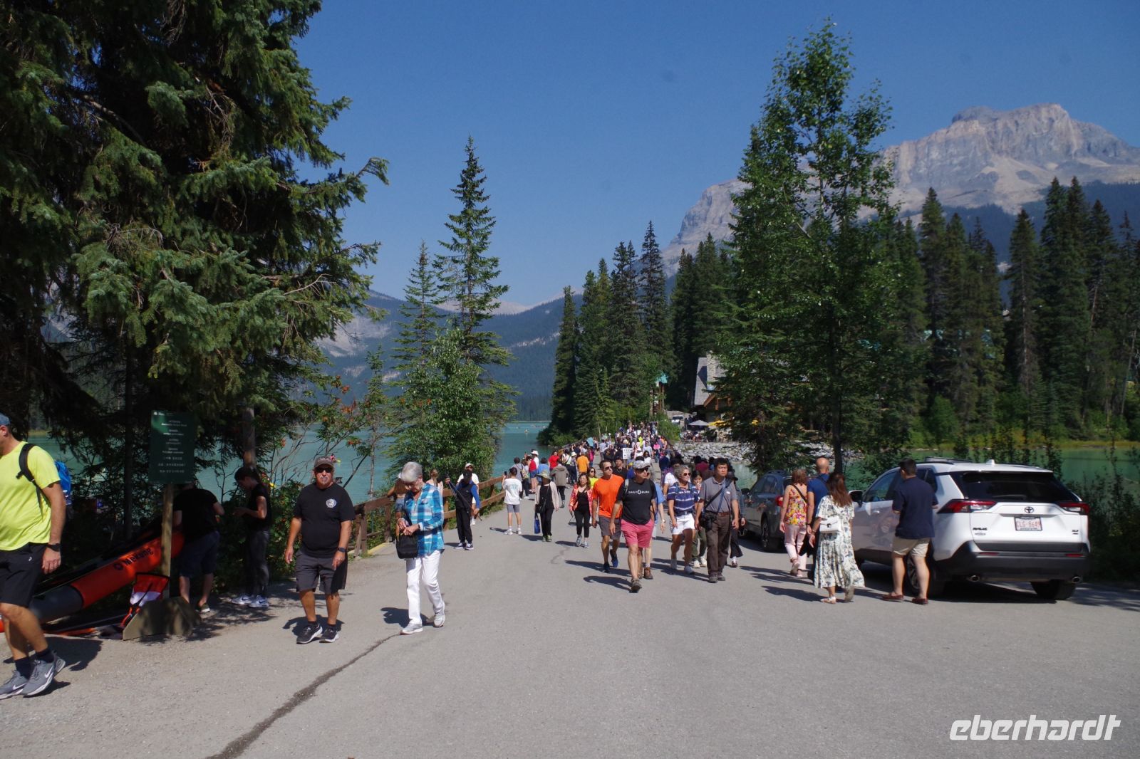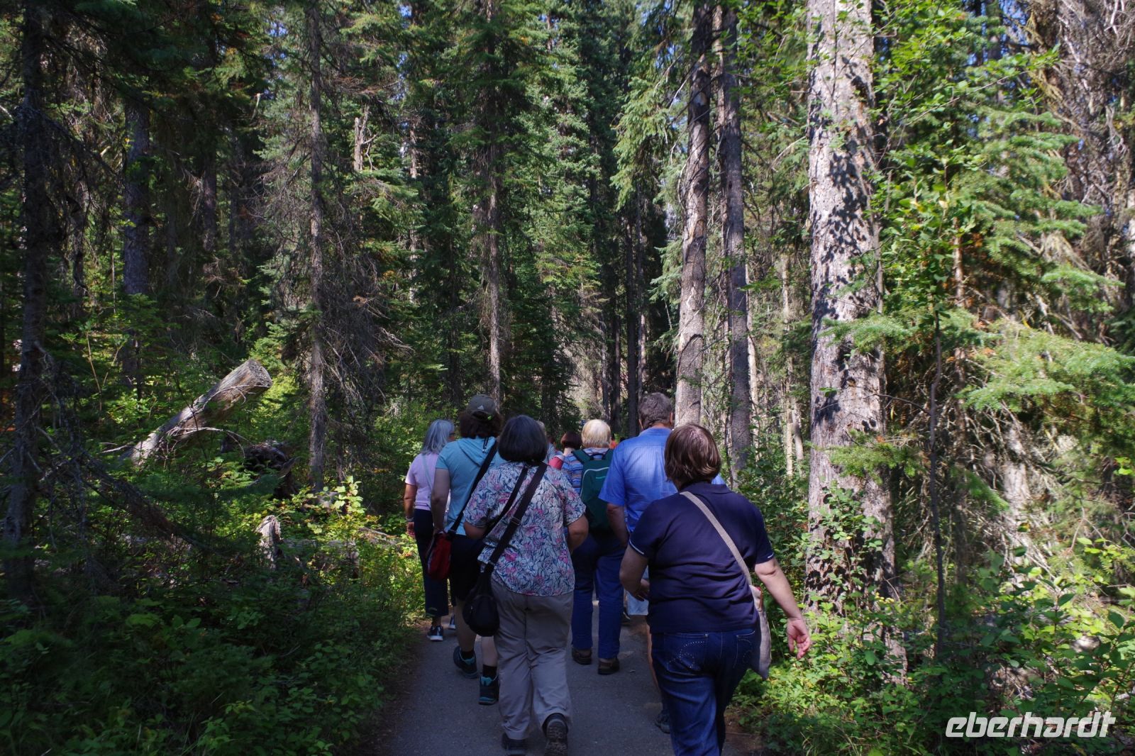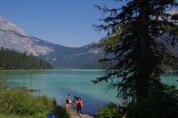 Aber das war natürlich noch nicht alles für heute – Unsere Route führt uns weiter in den angrenzenden Yoho-Nationalpark, und zwar zum idyllischen Emerald Lake, zu Deutsch - Smaragd See. Wir unternehmen in aller Ruhe einen schönen Spaziergang entlang des Sees, laufen noch ein Stückchen durch ein Waldgebiet, durch dessen Bäume immer wieder das Kristallklare Wasser zum Vorschein kommt – ein Traum. Unsere Gruppe kommt immer mehr in untereinander in Kontakt und schon am zweiten Reisetag haben wir eine spitzen Gruppendynamik. Gegen Nachmittag treten wir mit wahnsinnigen Eindrücken die Rückreise in Richtung Banff an. Dort angekommen, genießen wir an unserem zweiten Abend ein köstliches, kanadisches Steak. Mit vollgeschlagenem Bauch ging es für einige noch in Richtung Stadtzentrum, um noch etwas zu Bummeln oder etwas Flüssignahrung zu sich zu nehmen ;-).