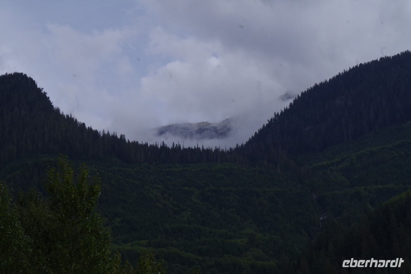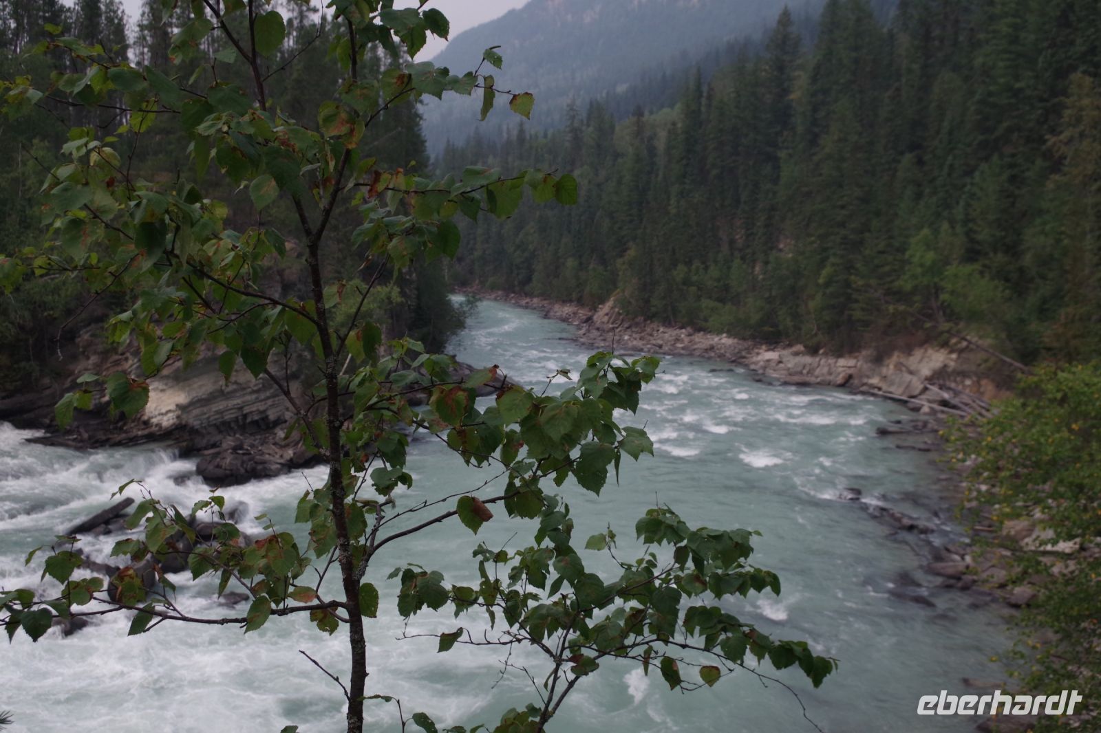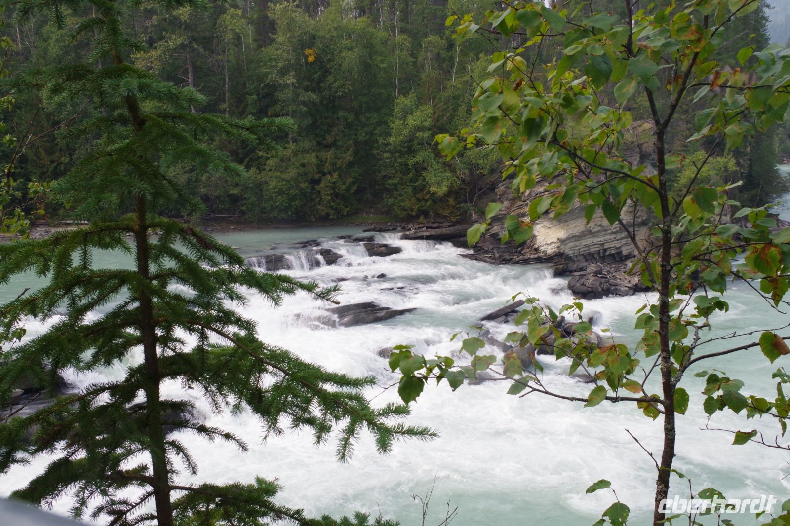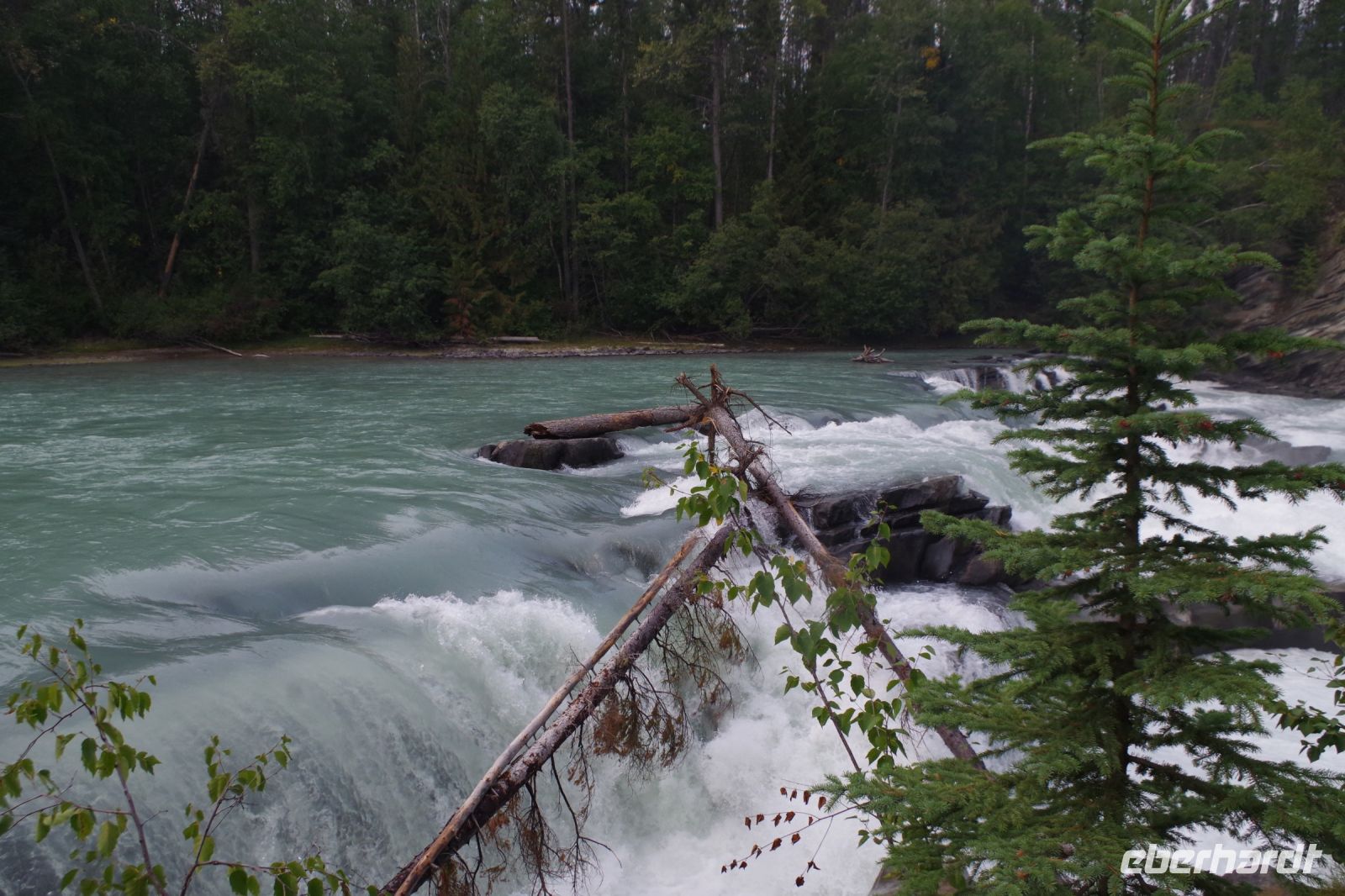 Jetzt sind wir erstmal eine Weile unterwegs und werden wie gewohnt mit einem Stück Schoki von Nadja verwöhnt. Das nächste beeindruckende Stück Natur, was wir uns anschauen, ist der gigantische Mount Robson, welcher der höchste Berg der Rocky Mountains ist. Seine schneebedeckte Spitze ragt in eine stolze Höhe von 3954m in den Himmel. Kaum steigen wir aus dem Reisebus aus, bemerken wir hier zum ersten Mal Anzeichen der noch immer andauernden, katastrophalen Waldbrände. Die Luft riecht nach Rauch, die Augen brennen bei einigen leicht und die Spitze des imposanten Mount Robsons ist bei eigentlich klarem Himmel, in einer diesigen Rauchwolke versteckt. Ab heute startet auch das umgestellte Reiseprogramm, denn wir bewegen uns so langsam in Nähe in Richtung Waldbrandgebiete, die natürlich immer noch hunderte von Kilometern entfernt sind und von uns sicherheitsgemäß, mit großem Bogen umfahren werden. So langsam verlassen wir die Rocky Mountains und fahren über die Grenze nach British Columbia, wo wir unsere Uhren noch einmal um eine weitere Stunde nach hinten drehen müssen. Nach einer weiteren langen Fahrt, bei der wir unterwegs noch einen Stopp an den Reargard Wasserfällen machen, mit großer Hoffnung auf wilde Lachse zu treffen, erreichen wir dann endlich den Wells Gray Provincial Park. Natürlich ohne Lachse gesehen zu haben, wie soll es auch anders sein. Hier unternehmen wir einen Spaziergang zu den Spahat Falls, der in zwei Stufen etwa 75 Meter durch eine enge Schlucht in die Tiefe stürzt. In den nächsten 30 Minuten erreichen wir dann auch unser Tagesziel Clearwater, wo wir die kommende Nacht verbringen.