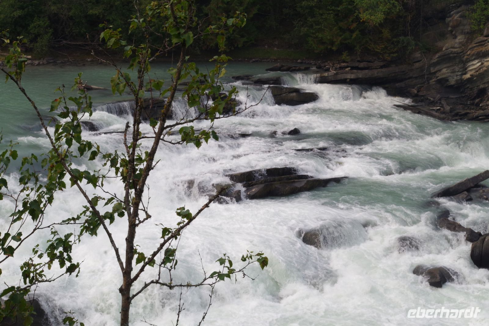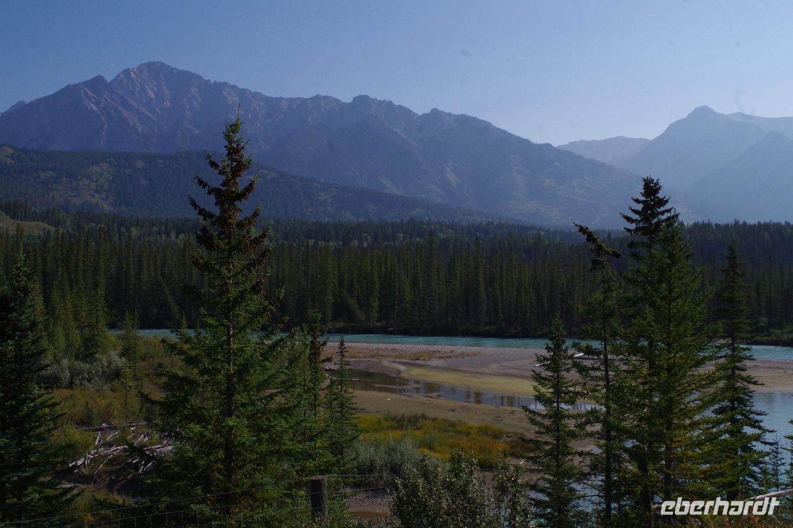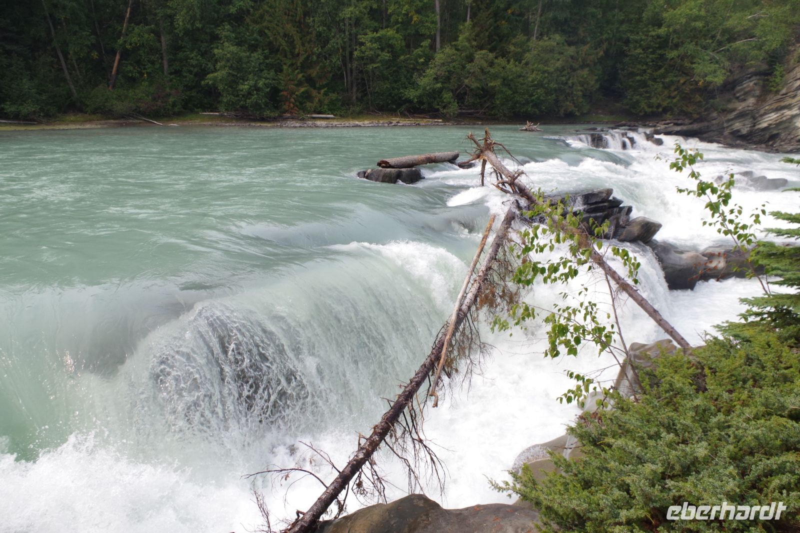Jetzt sind wir erstmal eine Weile unterwegs und werden wie gewohnt mit einem Stück Schoki von Nadja verwöhnt. Das nächste beeindruckende Stück Natur, was wir uns anschauen, ist der gigantische Mount Robson, welcher der höchste Berg der Rocky Mountains ist. Seine schneebedeckte Spitze ragt in eine stolze Höhe von 3954m in den Himmel. Kaum steigen wir aus dem Reisebus aus, bemerken wir hier zum ersten Mal Anzeichen der noch immer andauernden, katastrophalen Waldbrände. Die Luft riecht nach Rauch, die Augen brennen bei einigen leicht und die Spitze des imposanten Mount Robsons ist bei eigentlich klarem Himmel, in einer diesigen Rauchwolke versteckt. Ab heute startet auch das umgestellte Reiseprogramm, denn wir bewegen uns so langsam in Nähe in Richtung Waldbrandgebiete, die natürlich immer noch hunderte von Kilometern entfernt sind und von uns sicherheitsgemäß, mit großem Bogen umfahren werden. So langsam verlassen wir die Rocky Mountains und fahren über die Grenze nach British Columbia, wo wir unsere Uhren noch einmal um eine weitere Stunde nach hinten drehen müssen. Nach einer weiteren langen Fahrt, bei der wir unterwegs noch einen Stopp an den Reargard Wasserfällen machen, mit großer Hoffnung auf wilde Lachse zu treffen, erreichen wir dann endlich den Wells Gray Provincial Park. Natürlich ohne Lachse gesehen zu haben, wie soll es auch anders sein. Hier unternehmen wir einen Spaziergang zu den Spahat Falls, der in zwei Stufen etwa 75 Meter durch eine enge Schlucht in die Tiefe stürzt. In den nächsten 30 Minuten erreichen wir dann auch unser Tagesziel Clearwater, wo wir die kommende Nacht verbringen.