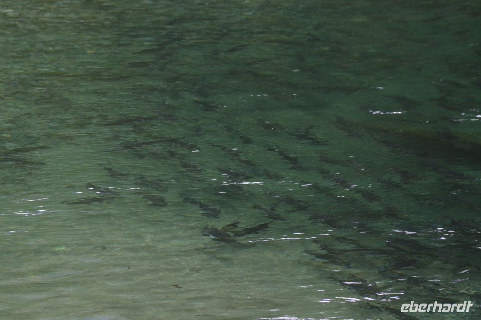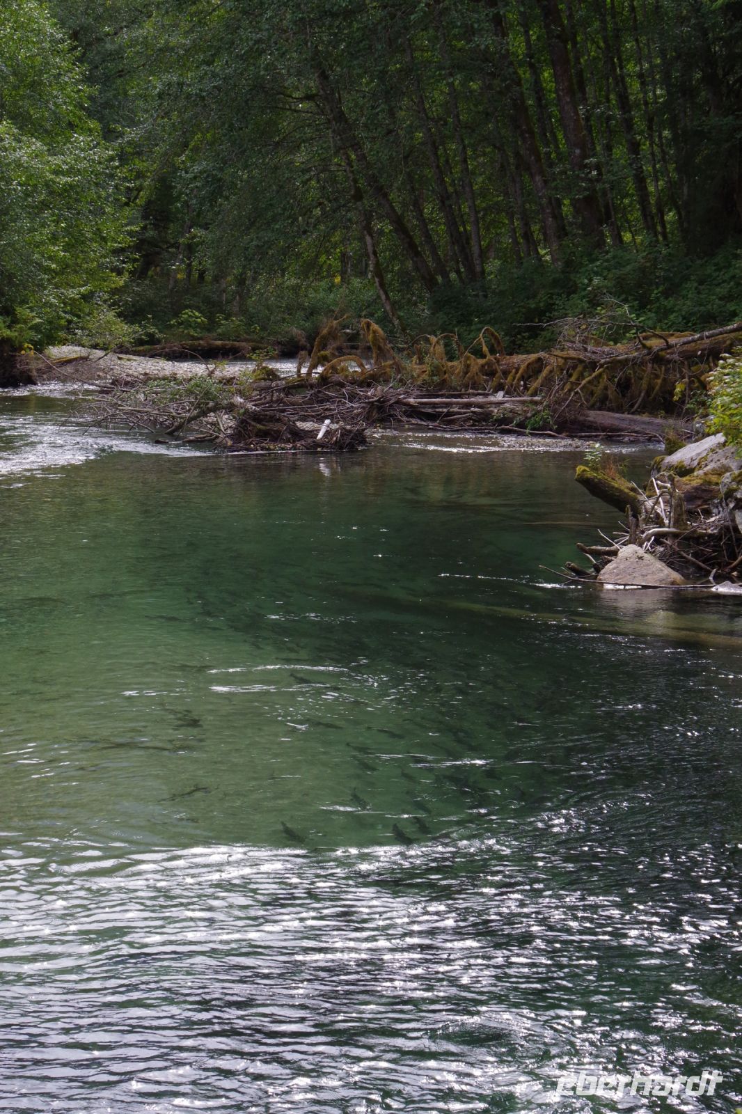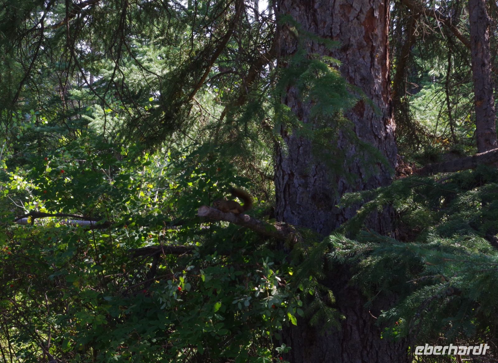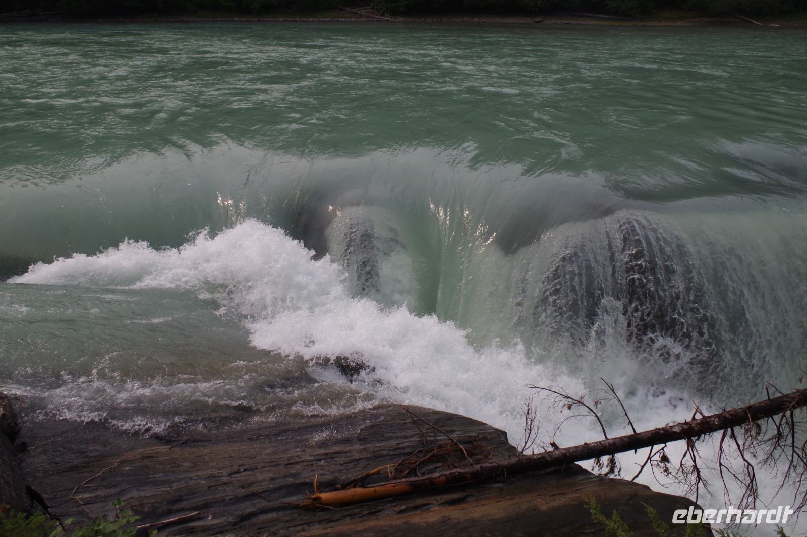 Jetzt sind wir erstmal eine Weile unterwegs und werden wie gewohnt mit einem Stück Schoki von Nadja verwöhnt. Das nächste beeindruckende Stück Natur, was wir uns anschauen, ist der gigantische Mount Robson, welcher der höchste Berg der Rocky Mountains ist. Seine schneebedeckte Spitze ragt in eine stolze Höhe von 3954m in den Himmel. Kaum steigen wir aus dem Reisebus aus, bemerken wir hier zum ersten Mal Anzeichen der noch immer andauernden, katastrophalen Waldbrände. Die Luft riecht nach Rauch, die Augen brennen bei einigen leicht und die Spitze des imposanten Mount Robsons ist bei eigentlich klarem Himmel, in einer diesigen Rauchwolke versteckt. Ab heute startet auch das umgestellte Reiseprogramm, denn wir bewegen uns so langsam in Nähe in Richtung Waldbrandgebiete, die natürlich immer noch hunderte von Kilometern entfernt sind und von uns sicherheitsgemäß, mit großem Bogen umfahren werden. So langsam verlassen wir die Rocky Mountains und fahren über die Grenze nach British Columbia, wo wir unsere Uhren noch einmal um eine weitere Stunde nach hinten drehen müssen. Nach einer weiteren langen Fahrt, bei der wir unterwegs noch einen Stopp an den Reargard Wasserfällen machen, mit großer Hoffnung auf wilde Lachse zu treffen, erreichen wir dann endlich den Wells Gray Provincial Park. Natürlich ohne Lachse gesehen zu haben, wie soll es auch anders sein. Hier unternehmen wir einen Spaziergang zu den Spahat Falls, der in zwei Stufen etwa 75 Meter durch eine enge Schlucht in die Tiefe stürzt. In den nächsten 30 Minuten erreichen wir dann auch unser Tagesziel Clearwater, wo wir die kommende Nacht verbringen.