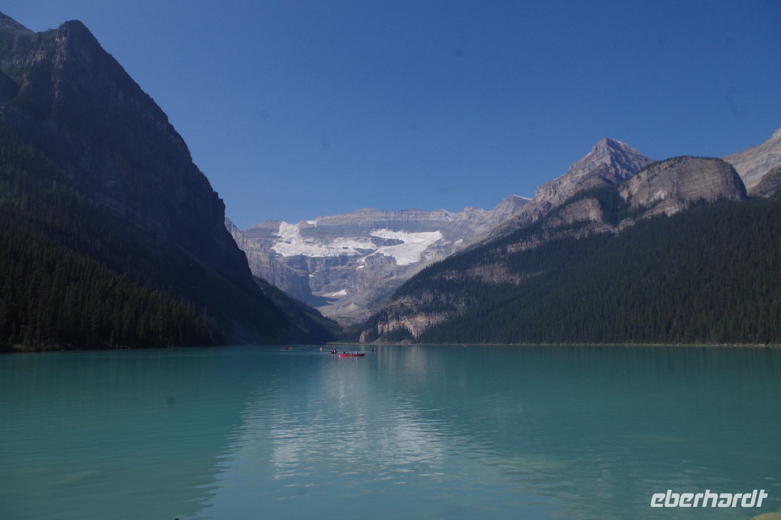Unsere Route führt uns bei wolkenfreiem Himmel und strahlender Sonne durch weites Blackfoot Terrain zum atemberaubenden Banff-Nationalpark. Die majestätischen Berggipfel beeindrucken uns schon aus der Ferne und wir fahren auf der wunderschönen Panoramastraße immer weiter in den Nationalpark hinein. Heute erkunden wir die verschiedenen Berg- und Gletscherseen. Zunächst halten wir am berühmten Lake Louise, der sich schon lang an internationale Bekanntheit erfreuen darf. Vor uns liegt eine spektakuläre Kulisse – ein kristallklarer, türkisfarbener See im Vordergrund, der Victoria Gletscher im Hintergrund und direkt am See angesiedelt, das imposanten Chateau Lake Louise, welches zur Luxus-Hotelkette Fairmont gehört. Die Route führt uns weiter zum Moraine Lake – hier unternehmen wir einen kleinen Aufstieg entlang des Rockpile Trails, um den besten Ausblick auf den See zu genießen und fleißig zu fotografieren. Auf dem Weg werden wir an einer Abzweigung (die wir natürlich nicht nehmen) von Bären gewarnt. Wir treffen lediglich auf ein paar niedliche Streifenhörnchen auf dem Weg. Und ja, der Aufstieg lohnt sich wirklich! Ein tiefblauer See erwartet uns, umringt von großen Nadelbaumen, die einen tollen Kontrast bilden.