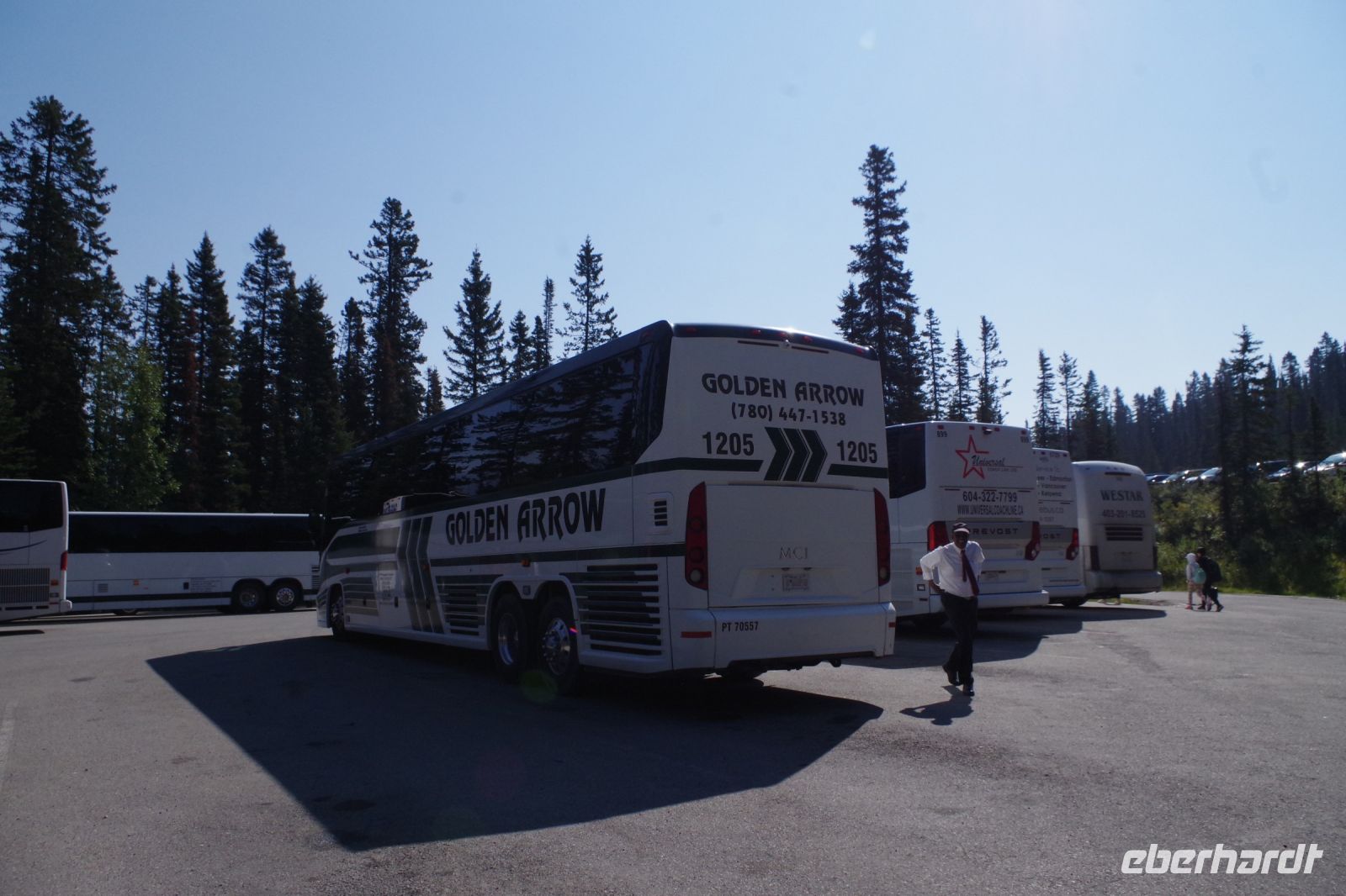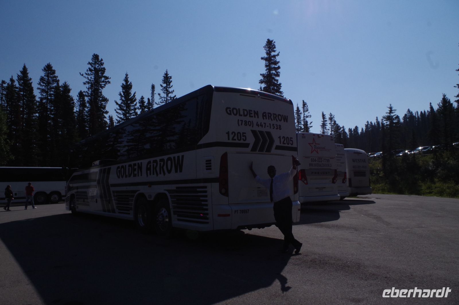 Heute heißt es schon wieder bye bye Banff – wir brechen auf in Richtung Jasper Nationalpark. Auf dem Icefields Parkway, einer der schönsten Panoramastraßen in Kanada, welche den Banff Nationalpark mit dem Jasper Nationalpark verbindet, fahren wir durch spektakuläre Bergketten zunächst bis zum Krähenfuß-Gletscher. Früher reichten mehrere Eisströme des Gletschers bis in Tal und erinnerten als Gesamtbild an einen Krähenfuß – daher der Name. Seitdem ist der Gletscher leider ziemlich geschmolzen, so dass die Namensherkunft ohne die Hintergrundinformation nicht mehr so einfach abgeleitet werden kann. Gleich nebenan, am Bow Lake, in welchen das geschmolzene Wasser des Krähenfuß-Gletschers fließt, konnte ich die Gruppe von einem ersten Gruppenfoto überzeugen – und es war gar nicht mal so leicht alle bei dieser großartigen Kulisse einzufangen... Nächster Halt = Peyto Lake. Dieser ist ganze 2,8 Kilometer lang, bis zu 800 Meter breit und umgeben von majestätischen Gipfeln mit dunkelgrünen Waldhängen. Nach einer kleinen Stärkung an einer Raststätte, steuern wir unser nächstes Etappenziel an – wir fahren zum beeindruckende Columbia Eisfeld und bestaunen den imposanten Athabasca-Gletscher - eine der sechs Hauptzungen des Eisfeldes. Die Naturgewalt beeindruckt uns und lässt die Fotoapparaten mal wieder ordentlich glühen. Im Anschluss halten wir am strahlend blauen Athabasca Fluss. Hier unternehmen wir eine sanfte Rafting Tour mit unserem Guide Harrison. Natürlich wollte niemand nass werden und Harrison gab sich die größte Mühe, dies an den einzelnen Stromschnellen auch so umzusetzen. Ganz trocken blieben wir allerdings trotzdem nicht, was dann doch ziemlich lustig für alle wurde. Ein sehr schöner und abwechslungsreicher Programmpunkt mit durchgehendem Panoramablick. Unterwegs schippern wir sogar an unserer nächsten Unterkunft, den Beckers Chalets, vorbei und freuen uns bereits aus der Ferne auf die kommenden zwei Nächten inmitten der Natur. Vorher machen wir noch einen kurzen Halt im Jasper Liquor Store, damit wir den idyllischen Ausblick vom Balkon unserer Blockhütten bei einem Glas Bier oder Wein auch in vollen Zügen genießen können. Abgerundet wird der perfekte Tag bei einem köstlichen 3-Gang Menü im urigen Hotelrestaurant.