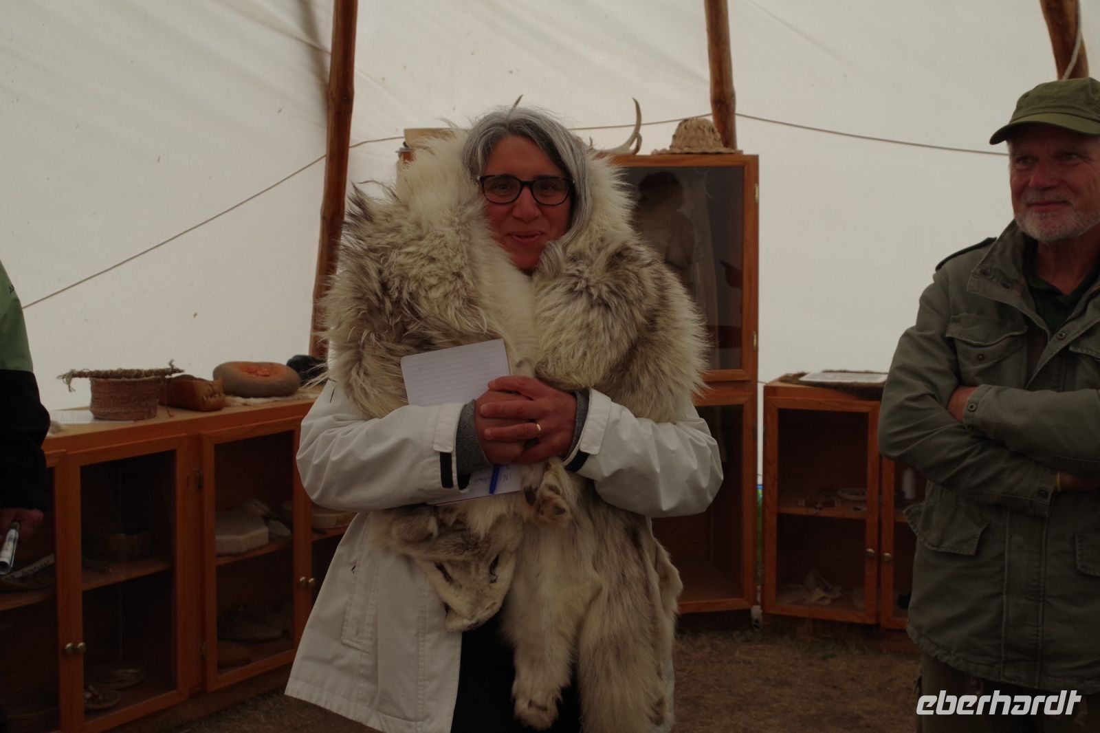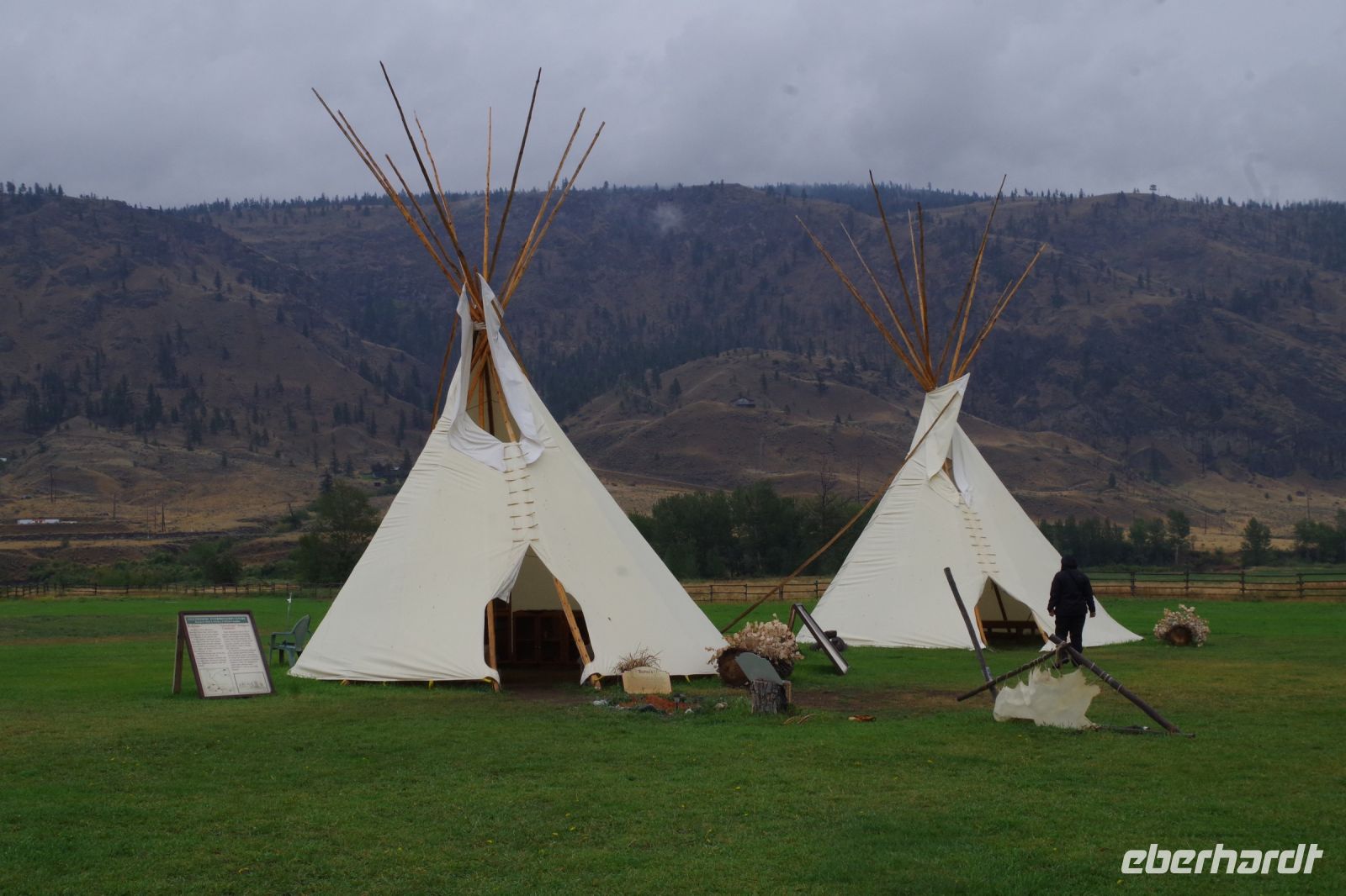 Heute gestaltet sich der Tag ganz nach dem Motto „Der Weg ist das Ziel“. Das Wetter ist für den heutigen Tag mal nicht so gut angesagt, angeblich soll es sogar regnen und das, obwohl es in der Region seit knapp 3 Monaten nicht einmal geregnet hat. Aber den größten Teil des Tages verbringen wir heute im Bus, daher ist der eine Regentag definitiv zu verkraften. Der Höhepunkt des sechsten Reisetages ist der Besuch der Hat Creek Ranch, ein lebendiges Museum, das uns in die Geschichte der Region und der First Nation eintauchen lässt. Unser junger Guide Payton, der gerade mal 15 Jahre alt ist und den Job neben der Schule ganz frisch auf der Ranch gestartet hat, zeigt und erklärt uns im eindrucksvollen Tipi etwas über verschiedene Jagdinstrumente, Bräuche und Heilmittel der Ureinwohner. Etwas befremdlich wird es, als er einigen ganz stolz ein Bären-, Wolfs- oder Kojotenfell um die Schultern legt, was in der indigenen Kultur natürlich als nette Geste gemeint ist und mit Stolz getragen wird. Im Anschluss gehen wir noch in das gegenübergelegene, alte Hotel und erfahren hier mehr über das Leben in der Zeit des Goldrausches. Früher kostete eine Nacht im Hotel nur einen Dollar, allerdings war dies das Doppelte eines durchschnittlichen Tagesgehaltes eines Arbeiters. Nadja und ich verabschieden uns etwas früher von der Gruppe, die das Freilichtmuseum oder den Souvenirshop ;-) noch individuell erkunden kann, um ein Picknick für alle vorzubereiten. Es gab reichlich zu essen - von Bagels & kanadischem „Brot“, über Wurst- und Käsespezialitäten bis hin zu süßen und salzigen Snacks – dazu gibt es ein landestypisches Canadian Dry Ginger Ale für alle.