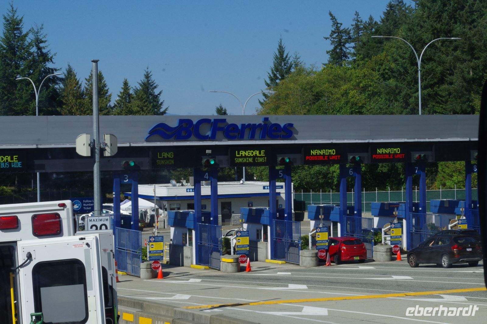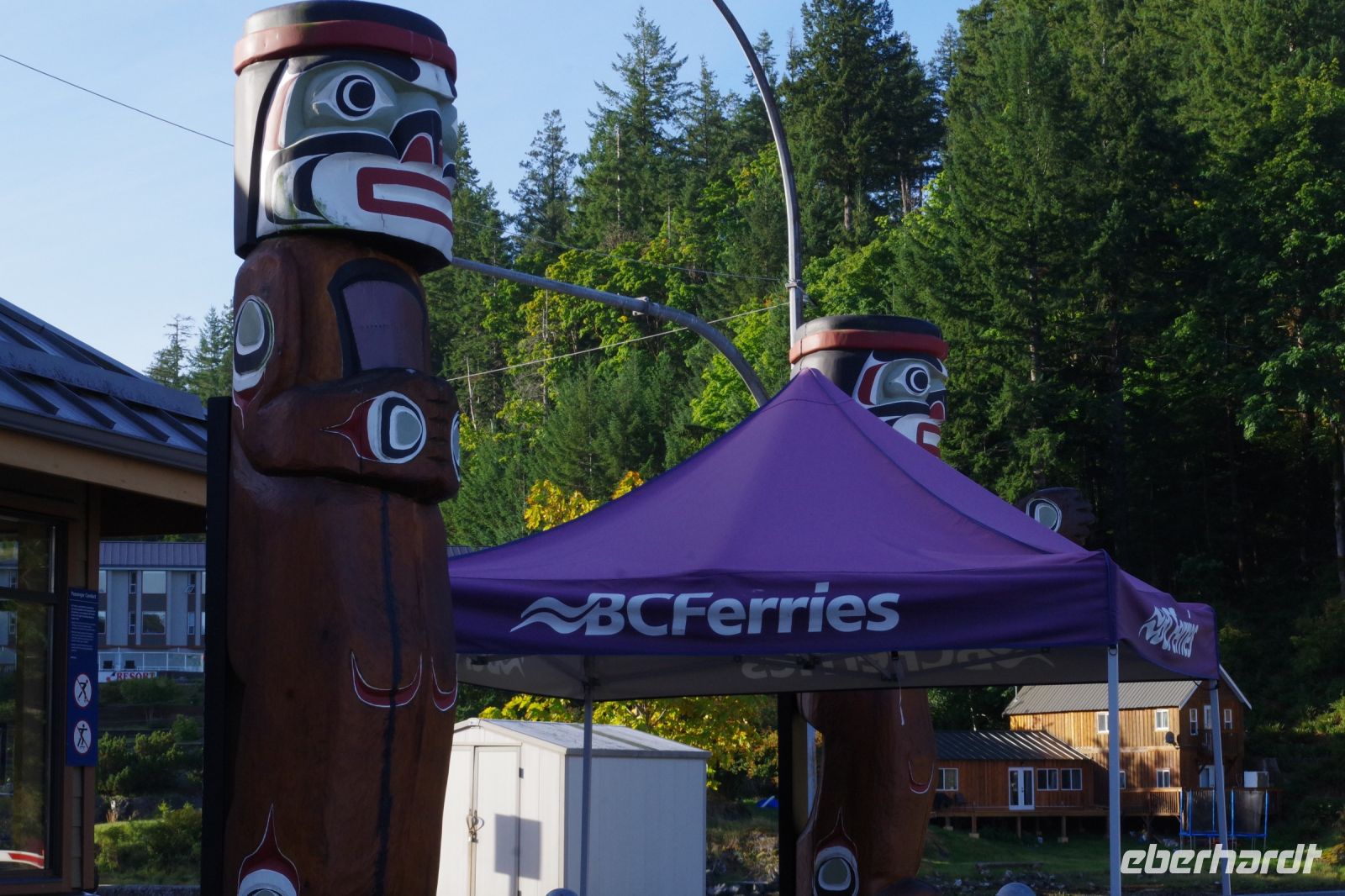 Die anschließende Fahrt von Whistler nach Horseshoe Bay über den „Sea to Sky Highway“ führt uns über malerischen Straßen, entlang der Küste und bietet atemberaubende Ausblicke auf den Pazifik. An den Shannon Falls bereiten Nadja und ich nochmal ein Picknick mit den Resten des Vortages vor, so dass alle gestärkt sind. Buschauffeur Ali hatte bisher weder privat noch mit einer Reisegruppe das Vergnügen nach Vancouver Island überzusetzen. Dementsprechend kennt er auch nicht den Fährhafen bzw. die Einfahrt zum (wirklich schlecht ausgeschilderten) Fährhafen und das Navi schickt uns leider wiederholt an die falsche Stelle – Es bricht eine leichte Unruhe aus. Pünktlichkeit ist nämlich maßgebend, denn ansonsten verlieren wir unserer Reservierung und damit unseren Platz an Bord – und da lässt BC Ferries auch nicht mit sich verhandeln. Daher gab Nadja Vollgas und erklärte Ali in Windeseile den Weg zur Einfahrt – ich sage nur: „faster, faster Ali!“ ;-) Wir schaffen es just in time. Während der Fährüberfahrt nach Nanaimo auf Vancouver Island genießen alle den Ausblick vom Sonnendeck auf den Pazifik und die malerischen Berglandschaften. Zwar werden wir wieder mit strahlendem Sonnenschein belohnt, allerdings windet es ganz schön stark, so dass alle das Oberdeck mit einer leichten Sturmfrisur verlassen.