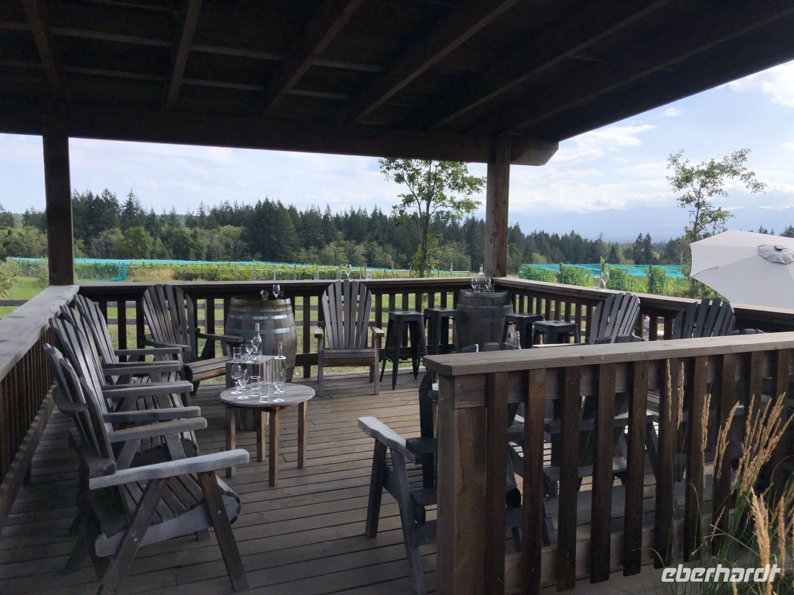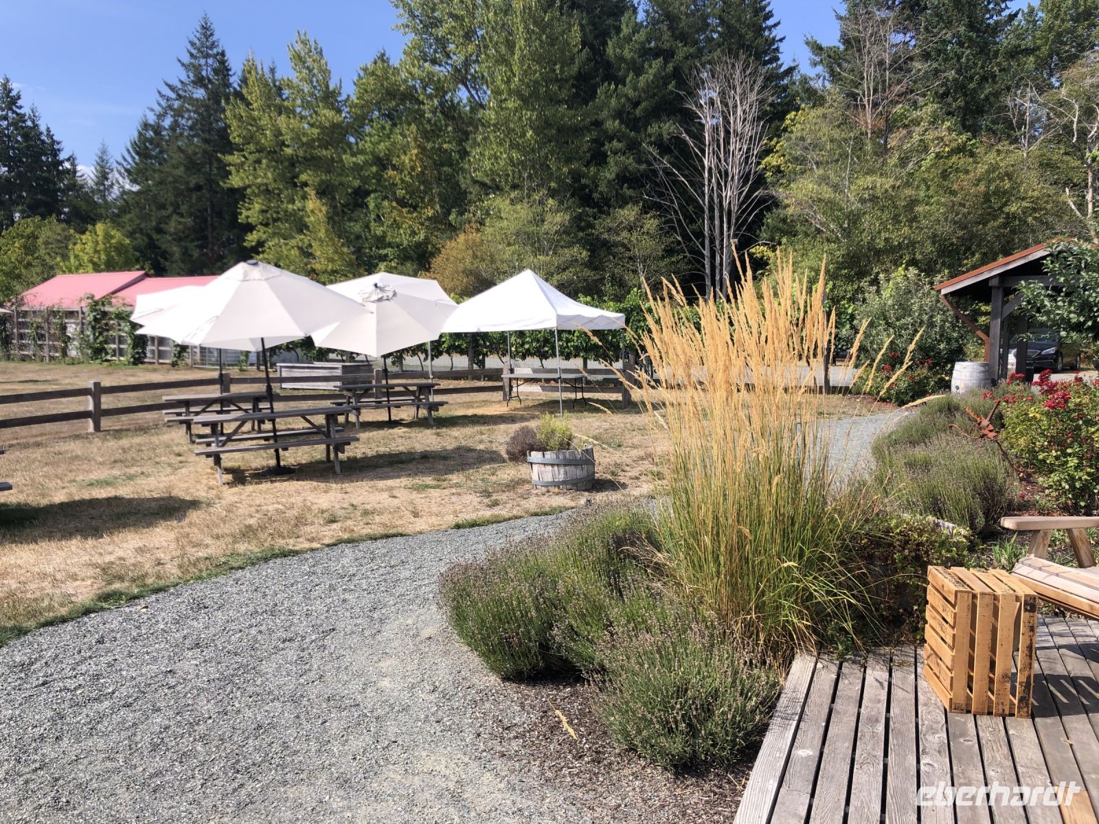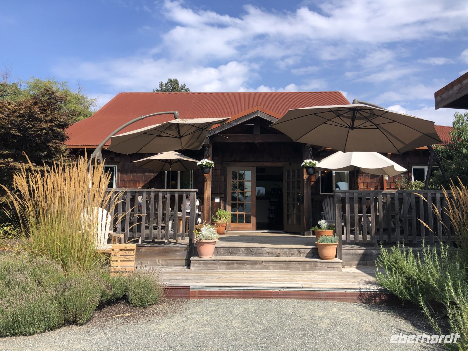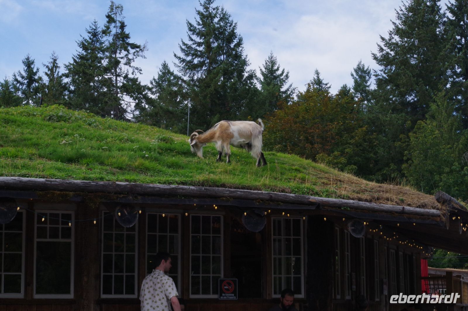 Erneut startet der Tag mit einem reichlichen Teller Bacon, Eier und Toast. Wir verlassen den erholsamen Ort Parksville. Ursprünglich war der Besuch des McMillan Provincial Parks geplant, dieser ist leider aufgrund der Waldbrände noch für die gesamte Saison für Besucher geschlossen. Am Vortag organisieren Nadja und ich bereits eine Alternative, damit der Besuch eines Urwaldes mitsamt seinen Jahrhunderte Jahre alten Bäumen, worauf sich schon viele gefreut haben, nicht gänzlich wegfällt. Also steuern wir den nahegelegenen Heritage Forest an, wo wir einen entspannten Rundgang durch den Wald unternehmen und treffen hier auf gigantische Lebensbäume, Tannen, Douglasien und vieles mehr - ihr Baum- und Pflanzenexperten wisst es besser ;-). Nachdem wir uns kurzzeitig in dem Wald „verlaufen“ und wieder an einer bekannten Stelle ankommen, erreichen wir den Reisebus natürlich trotzdem und steuern das nächste Ziel, nämlich das Hippiedorf Koombs, an. Hier ist Zeit für einen Mittagssnack und etwas Shopping in der skurrilen Markthalle. Das Dach der Markthalle besteht aus einer großen Rasenfläche, auf der einige Ziegen leben und fleißig das Gras wegknabbern. Im Anschluss wartet eine kleine Überraschung auf die Gruppe – außerplanmäßig besuchen wir das idyllische Beaufort Weingut in Courtenay, für eine Kostprobe, bestehend aus 5 verschiedenen Sorten. Die Terrasse, mit Blick auf die Weinreben, wurde schön für uns hergerichtet und wir genießen das großartige Ambiente, während wir den ökologisch angebauten und dafür zertifizierten Wein verkosten. Ich würde sagen, die Überraschung ist gelungen! Nächster Halt: Quadra Island. Nur eine kurze Fährüberfahrt von Campbell River entfernt, erreichen wir Quathiaski Cove auf der größten Insel der Discovery Islands. Wir machen uns auf den Weg zur einheimisch geführten Tsa-Kwa Luten Lodge, die allen Gästen super gefällt. Das gesamte Haus ist aus massiven Baumstämmen gebaut und im urigen, indigenen Design eingerichtet. Heute waren wir mal etwas früher mit dem Abendessen fertig, so war für einige noch Zeit, sich für ein Getränk in der Lobby zu treffen, um den Abend ausklingen zu lassen.