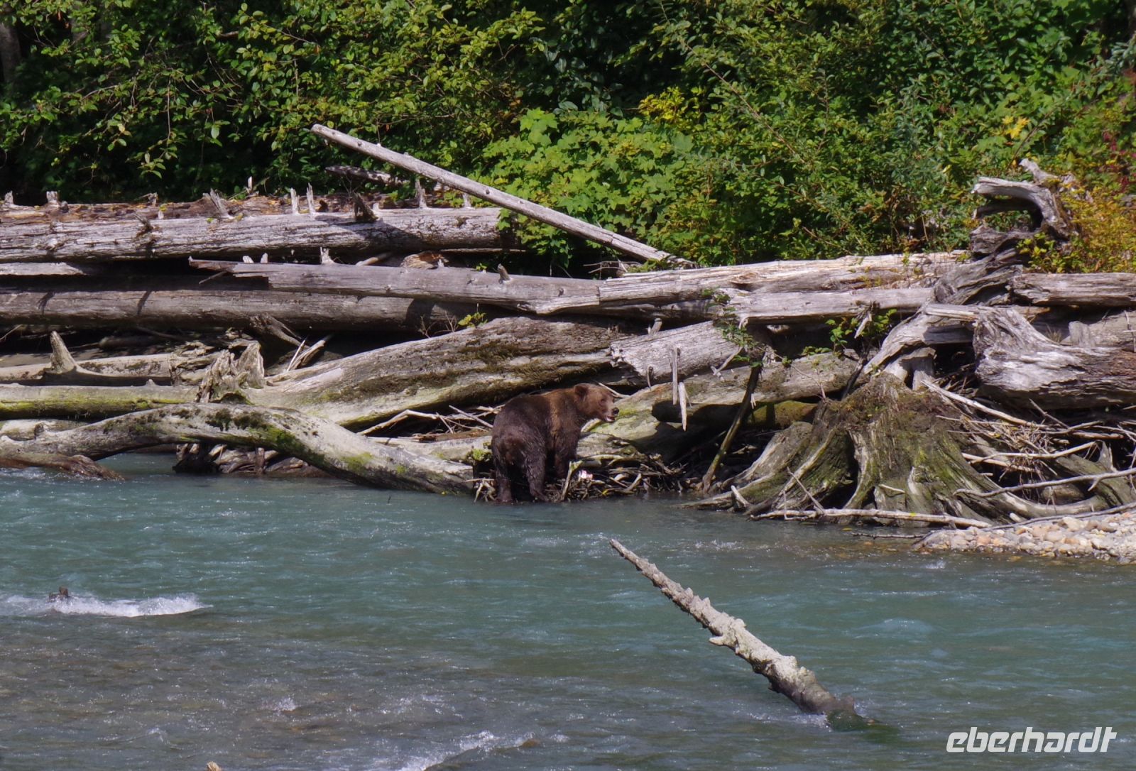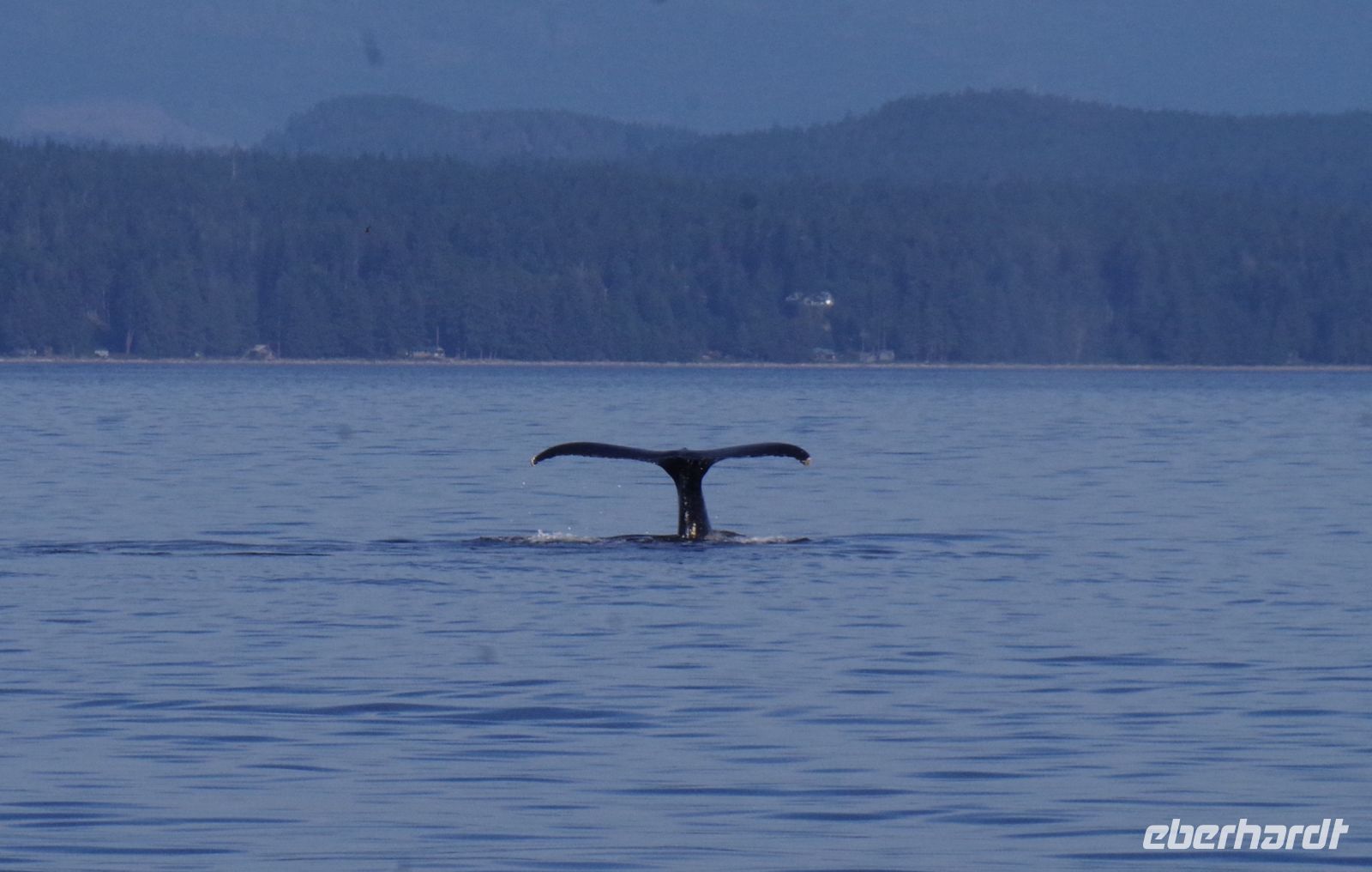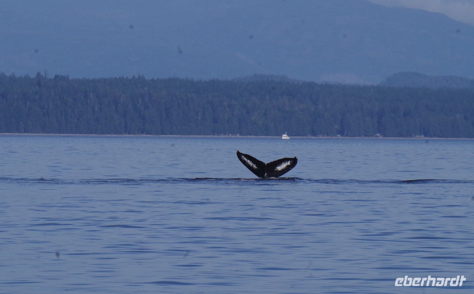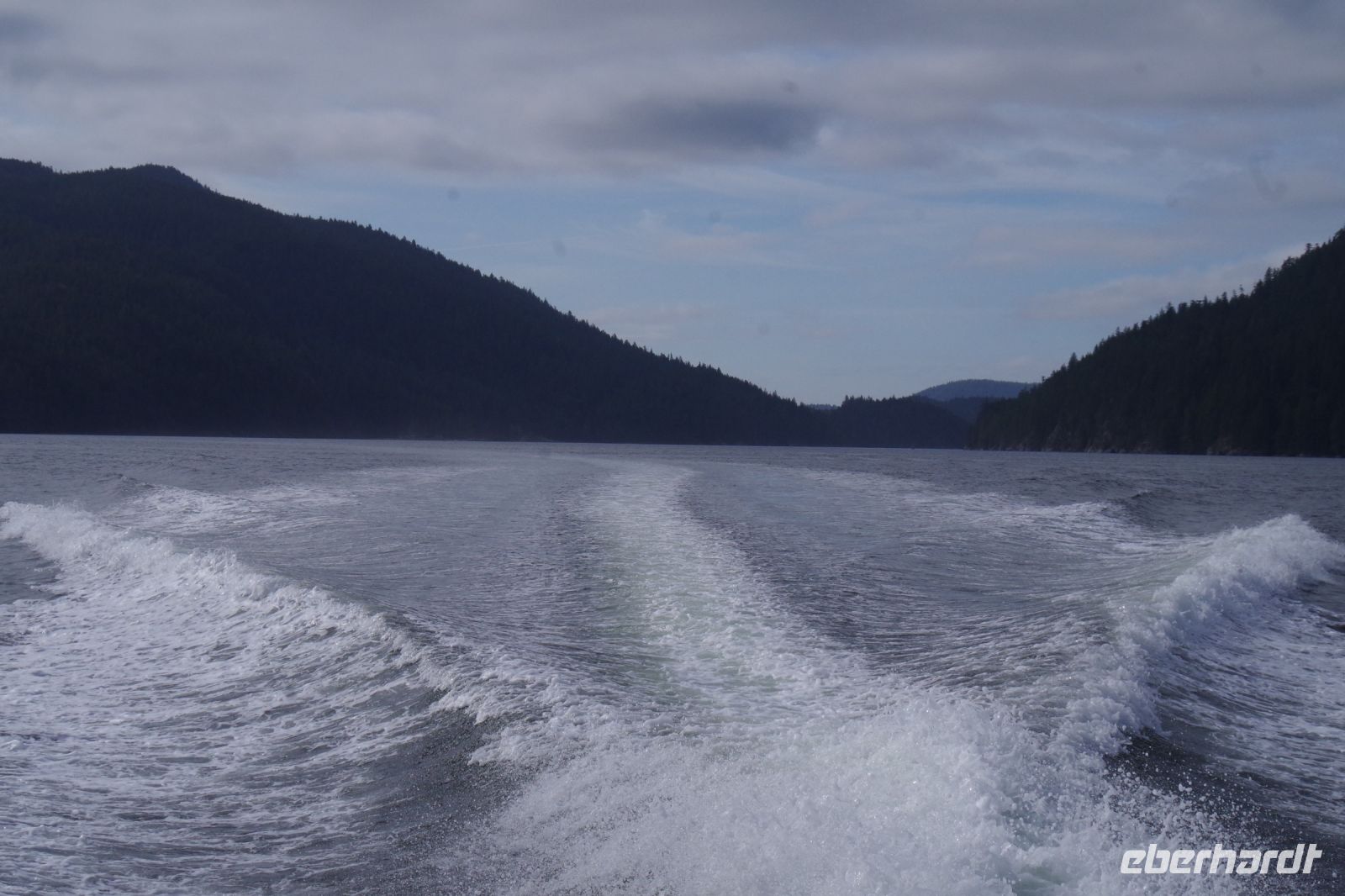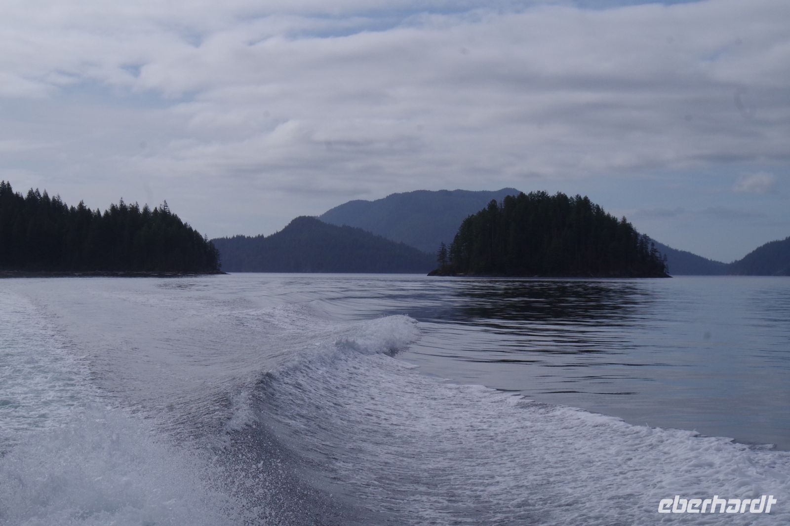 Heute ist es endlich so weit – der Tag, auf den sich der Großteil der Gruppe so gefreut hat. Es ist an dieser Stelle vielleicht nochmal wichtig zu erwähnen, dass wir noch immer noch eine recht überschaubare Anzahl kanadischer Tiere in freier Wildbahn gesehen haben, obwohl die Chancen eigentlich schon oft gut standen :-(. Bereits am frühen Morgen geht es für 10 Gäste, Nadja und mich zur Anlegestelle Quathiaski Cove. Hier warten wir auf das Boot, das uns für die nächsten Stunden beim Wale beobachten durch die Gewässer der Discovery Islands, bis ans Festland zur Orford Bay bringt. Tatsächlich sehen wir 2 Buckelwale, die geschmeidig durch das Wasser gleiten und immer wieder auftauchen, natürlich vorangekündigt durch einen explosionsartigen Luftausstoß der Wale. Wir fahren vorbei an zahlreichen unberührten und teilweise unbewohnten, dicht bewachsenen Inseln – Eine wahnsinnig schöne Natur, die dieses Land zu bieten hat. Nach knapp 3 Stunden auf dem Wasser, erreichen wir das Bärengebiet. Alle bekommen zunächst ein kleines Lunchpaket ausgehändigt, das sie sich in einem abgesicherten Bereich an einem schönen Picknickplatz, direkt am Wasser, gut schmecken lassen. Danach werden wir per Kleinbus abgeholt und gehen auf Expedition durch das Bärengebiet. Da wir bisher noch nicht einen einzigen Bären während der gesamten Reise gesehen haben, sind die Erwartungen hoch - Und wir werden nicht enttäuscht. Schon kurz bevor wir den ersten Aussichtsturm erreichen, erspähen wir schon einen weiblichen Grizzly Bären von Weitem. Nicht viel später, hören wir ein fürchterliches Jammern und bemerken ein kleines Grizzly Baby, welches verlassen auf der anderen Seite des Flusses hervorgerannt kommt. Wir schauen zu, wie der kleine Baby Bär versucht, den Fluss zu überqueren, um zu einer Mama zu kommen. Etwas hilflos und leicht abgetrieben von der Strömung, erreicht der Bär dann doch noch das andere Flussufer. Wir sind schon zu Anfang begeistert und werden Stopp für Stopp mit verschiedenen Bären von verschiedenen Blickperspektiven belohnt. Sogar die bisher ausgeblieben Lachse sehen wir in hoher Anzahl und einmal sogar. Doch nicht nur unsere Gäste erfreuen sich an den Lachsen, auch der ein oder andere Bär geht mal mehr und mal weniger geschickt auf Lachsjagd. Nachdem wir ca. 7 verschiedene Grizzlybären in Ihrer natürlichen Umgebung gesehen haben, geht vielen das Lächeln gar nicht mehr aus dem Gesicht und der Tag entpuppte sich zum vollen Erfolg und eines der Highlights unserer Reise. Doch der Tag ist noch nicht vorbei – die Rückfahrt und das gleichzeitige Whale Watching hat auch noch einiges zu bieten. Wir sehen zahlreiche Seelöwen und Robben sowie Delfine, die gemeinsam mit zwei Orcas auf und ab durch das Wasser gleiten – ein spektakulärer Anblick. Ein erlebnisreicher Tag neigt sich dem Ende und wir erreichen unsere Lodge am späteren Abend. Beim Abendessen erzählen die anderen 3 Gruppenmitglieder von Ihrem Tag, den sie mit Erkunden der wilden Schönheit, die ruhigen Buchten und die üppige Vegetation der Insel erkundeten.