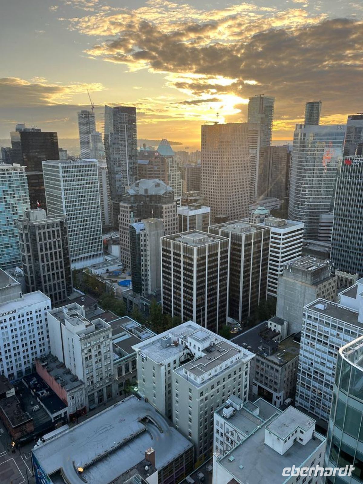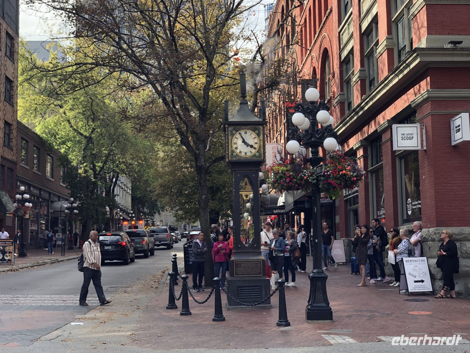 Wir erreichen Vancouver gegen Mittag und halten zunächst am Queen Elizabeth Park, wo alle einen gemeinsamen Spaziergang durch den Park mit Nadja unternehmen und einen atemberaubenden Blick auf die Stadt genießen. Als nächstes steht Granville Island auf dem Programm, worauf sich schon viele Gäste gefreut haben. Auf der kleinen Künstlerinsel gibt es etwas mehr Zeit, um eine Kleinigkeit zum Mittag zu essen, durch die verschiedenen Boutiquen zu schlendern oder die Aussicht auf Vancouvers Skyline vom Hafen aus zu genießen. Auf dem Markt gibt es zahlreiche verschiedene Imbisse, darunter sogar einen Bratwurststand. Auf dem Weg ins Zentrum fahren wir über die Camber Brücke und erreichen die Altstadt, auch Gastown genannt, auf der anderen Seite Vancouvers. Pünktlich um 16 Uhr stoppen wir an der antiken Dampfuhr, aus der gerade die britische Big Bang Musik ertönt. Wir haben Glück mit dem Timing, denn die Uhr ertönt nur jeweils zur vollen Stunde. Wir bewegen uns weiter in Richtung Hafen und fahren an dem gigantischen Mehrzweckgebäude Canada Place vorbei, der das Messe- und Kongresszentrum, das 5-Sterne Pan Pacifik Hotel sowie das weltweit erste IMAX-Kino und vieles mehr beherbergt. Dazu dient der Canada Place als Anlegestelle für die riesigen, amerikanischen Kreuzfahrtschiffe, deren Routen überwiegend nach Alaska und Hawaii führen. Eigentlich haben wir vor die Stadtrundfahrt mit einem Besuch am Stanley Park abzuschließen, doch uns wir wieder ein Strich durch die Rechnung gemacht. Aufgrund einer Vollsperrung auf der einzigen Zufahrtsstraße zum Park, geraten wir in einen Stau, der sich in nächster Zeit nicht aufzulösen scheint. Daher brechen wir die Route ab, entfliehen über eine Seitenstraße aus dem Stau und drehen noch eine kleine Runde durch die verschiedenen Einkaufsstraßen Vancouvers, bevor es zum Check-In in das zentral am Hafen gelegene Hotel geht, wo wir die kommende Nacht verbringen. Ein wahrhaftiges Highlight wartet diesen Abend noch auf uns – ein Abschiedsessen im Top of Vancouver Restaurant mit spektakulärem Blick auf die Stadt. Das Restaurant befindet sich in 167m und ähnelt einem Ufo, das sich auf dem Dach eines Wolkenkratzers befindet. Wir erreichen das Restaurant zum Sonnenuntergang und können das Farbenspiel bei einem 360 Grad Blick und einem exquisiten Abendessen bewundern. Wir verabschieden uns offiziell von Nadja, die einen tollen Job während der gesamten Reise gemacht hat und auch ich bekomme sehr nette Zeilen von unserer lieben Reisegruppe gewidmet. Ein toller Tag mit einzigartigem Tagesabschluss geht zu ende. Jetzt heißt es Koffer packen, denn morgen treten wir die Heimreise an.