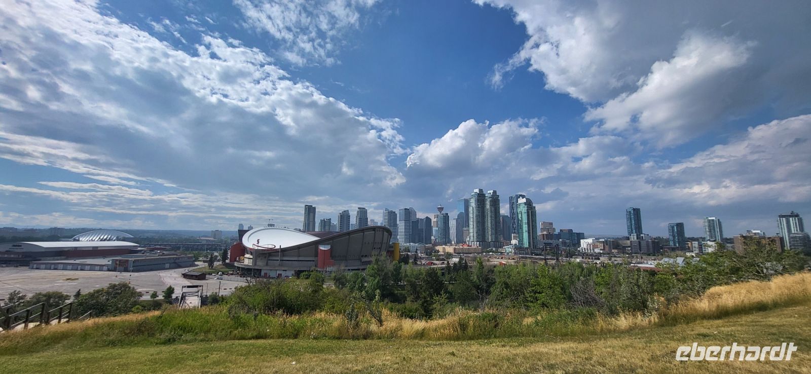 Aus den verschiedensten Regionen Deutschlands kommend, treffen wir uns am Frankfurter Flughafen, um gemeinsam mit mir, Susanne Schirmann, Eberhardt TRAVEL Reisebegleiterin, in den wunderschönen Westen Kanadas zu fliegen. 7535 Km und knappe 9 Stunden weiter, landen wir in Calgary, wo wir von Reiseleiter Wolfgang und und Busfahrer John freundlich empfangen werden. Schon geht es los Richtung Innenstadt, der Downtown von „Cow Town“,wie Calgary auch scherzhaft genannt wird. Damit wir einen ersten Eindruck der sogenannten Ölhauptstadt Kanadas mit ca. 1 Mio. EW erhalten, unternehmen wir eine orientierende Stadtrundfahrt. Aus der Ferne sehen wir bereits den 190 m hohen Calgary Tower und passieren das Bow Building, das höchste Gebäude der Stadt. Vorbei am alten und neuen Rathaus, sehen wir auch das King Edward Hotel, welches das älteste Hotel Calgarys ist. Busfahrer John fährt uns wieder etwas aus Downtown und den Wolkenkratzern hinaus und so erkunden wir den Stadtteil Inglewood mit vielen schönen Lokalen und kleinen Straßen. Hier sehen wir auch Fort Calgary, wo die heutige Metropole einst entstand. Unser nächster Stopp erfolgt unterhalb des sogenannten Schottenhügels, den wir in wenigen Gehminuten erreichen. Dieser erhielt seinen Namen, da dessen Bewohner einen kostenfreien Blick auf das Stampede Rodeo Stadion werfen können und von wo man einen herrlichen Blick über die Skyline von Calgary erhaschen kann. Auch der sogenannten Saddledom, der die Form eines Sattels hat und eine Eventhalle für verschiedene Zwecke ist, ist hier gut zu sehen. Auf unserer Weiterfahrt sehen wir noch die schöne Stephenstreet, die Fußgängerzone, wo heute am Samstag viel Betrieb ist. Anschließend checken wir in unserem zentralen Westin Hotel ein und speisen heute Abend im Restaurant Earl’s Kitchen & Bar, welches sich fußläufig in der Nähe befindet. Nach einem sehr schmackhaften Abendessen spazieren wir noch durch die lebhafte Fußgängerzone vorbei am Calgary Tower, der nun auch schön beleuchtet ist und lassen das quirlige Flair der Stadt auf uns wirken.