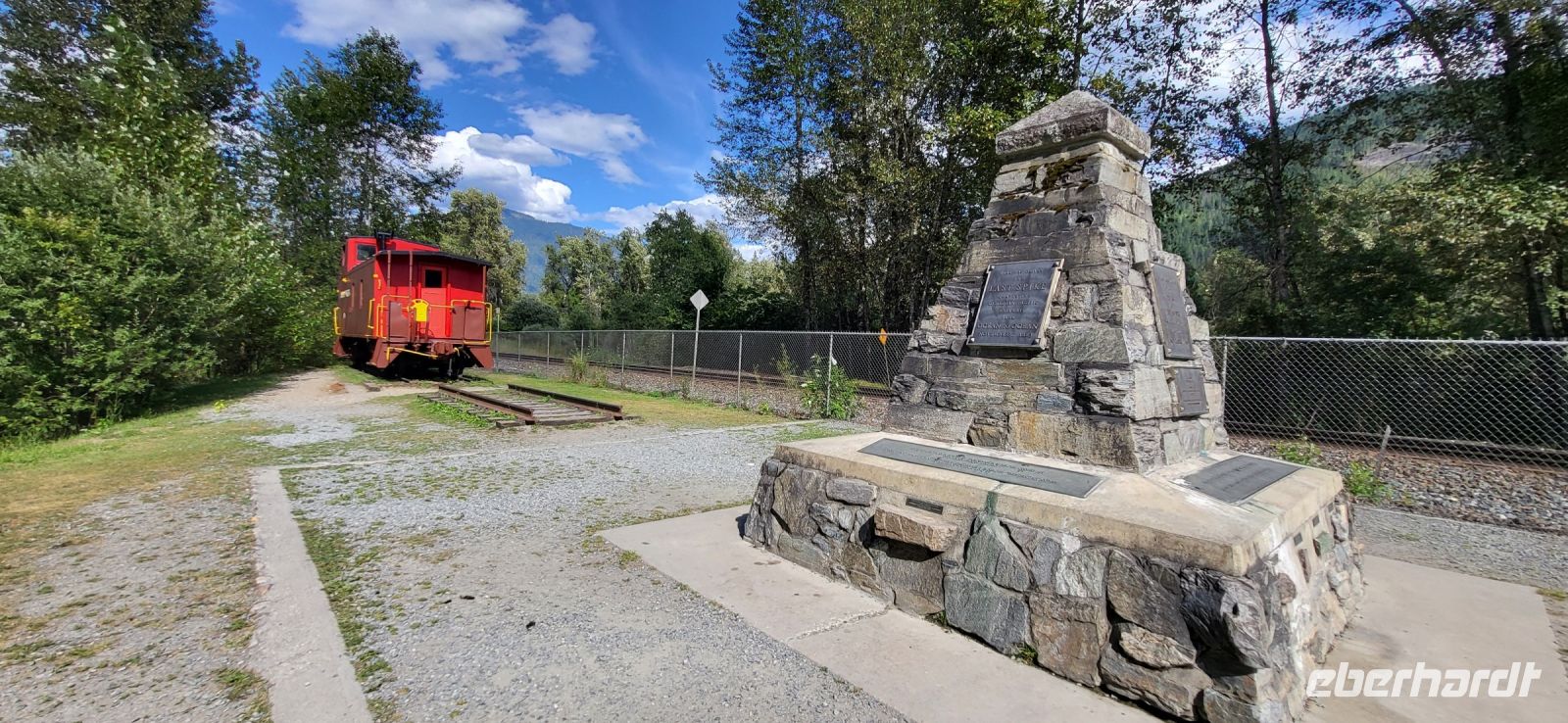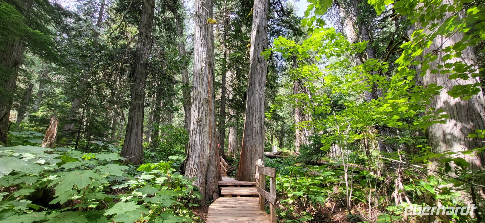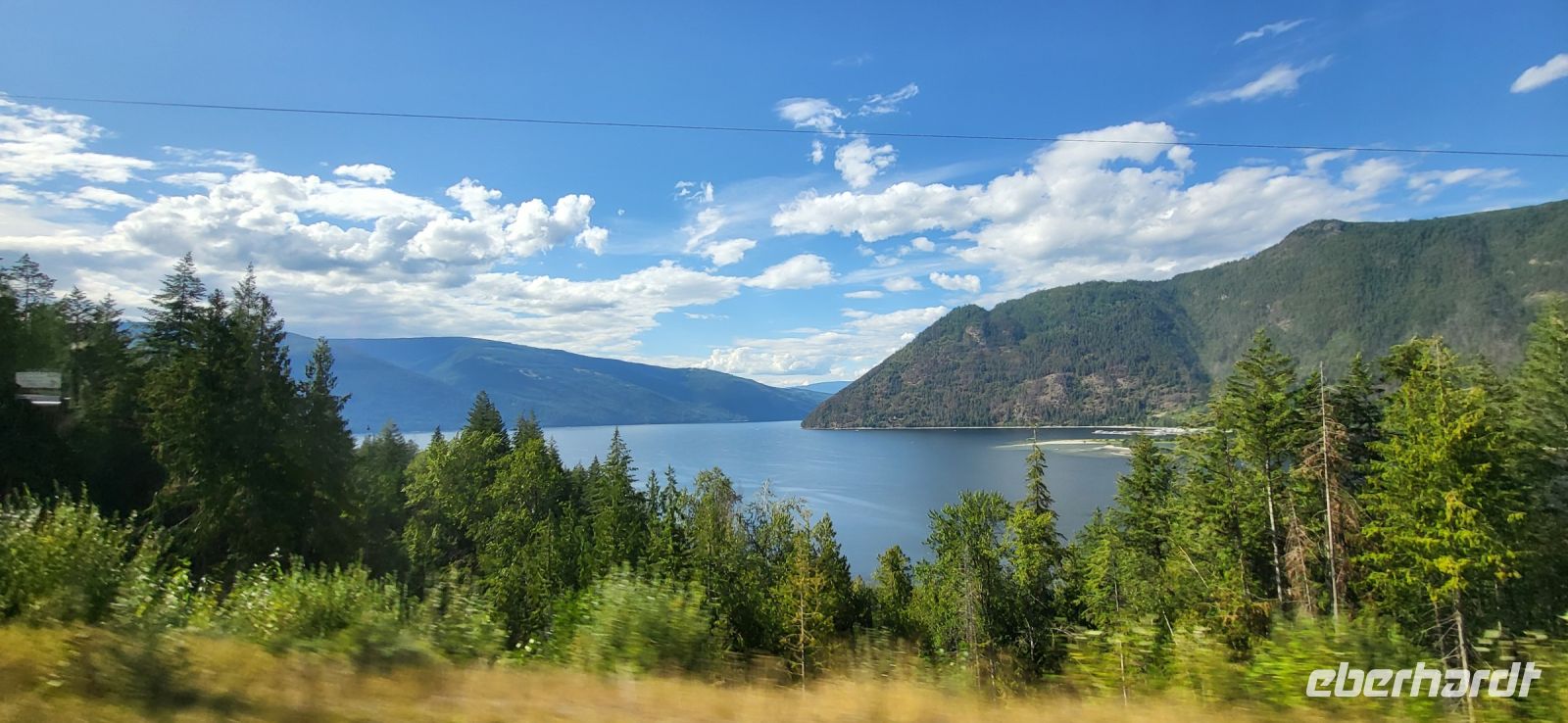 Nach einer erholsamen Nacht und einem fürstlichen Frühstück im Lake Louise Inn verlassen wir den bekannten Skiort und ziehen weiter zum sogenannten Spiral Tunnel. Hier haben wir das große Glück, dass genau jetzt ein Zug zu sehen ist, wie er sich durch den Tunnel bergauf schlängelt. Kurz darauf erreichen wir den „Smaragd See“. Am Emerald Lake angekommen unternehmen wir einen schönen Spaziergang am See entlang, dessen smaragdgrünes Wasser eine wunderschöne Fotokulisse bietet. Erneut profitieren wir von den frühen Morgenstunden, denn es ist noch leer und nur wenige Touristen außer uns unterwegs. Die Kulisse, die Spiegelung des Sees, einfach ein „magic moment“, den wir in uns aufnehmen und auch auf zahlreichen Fotos festhalten. Der nächste Halt erfolgt am Spiral Tunnel und haben dort das große Glück gleich zwei Züge hintereinander zu sehen, die sich durch den Tunnel bergauf quälen. Weiter geht es zur sogenannten Naturbrücke „Natural Bridge“, durch die sich der Bow River kämpft. Ein erneut herrliches Naturspektakel, eingebettet in die Bergwelt der Rocky Mountains. Am Giant Cedar Boardwalk unternehmen wir einen schönen Spaziergang zu den Baumriesen und befinden uns unweit der Straße inmitten wunderbarer Natur. Ein gut ausgebauter Holzweg führt und zu den Giganten und wir haben viel Spaß damit, diese gemeinsam mit uns auf einem Foto zu verewigen. Historisch wird es erneut bei Last Spike, hier wurde vermeintlich der letzte Nagel in die Eisenbahnschienen gehauen und somit die Fertigstellung der Eisenbahnlinie von Quebec und Montreal im Osten und Vancouver im Westen 1885 besiegelt. Am späten Nachmittag und 450 Km weiter erreichen wir Kamloops, wo sich uns ein völlig neues Landschaftsbild bietet. Die Natur ist nun karger und wesentlich trockener. Hier liegt der besondere South Thompson Inn, der idyllisch am Fluss gelegen ist. Amüsiert nehmen wir das Warnschild auf der Zufahrt zur Kenntnis, welches auf hier lebende Schildkröten hinweist. Ein schönes BBQ Dinner auf der gemütlichen Terrasse am Thompson River rundet einen weiteren erlebnisreichen Tag ab.