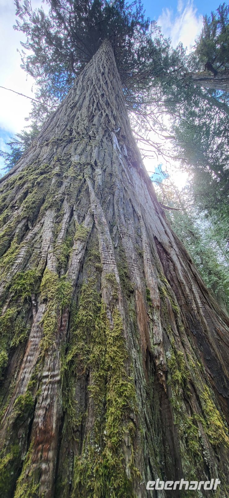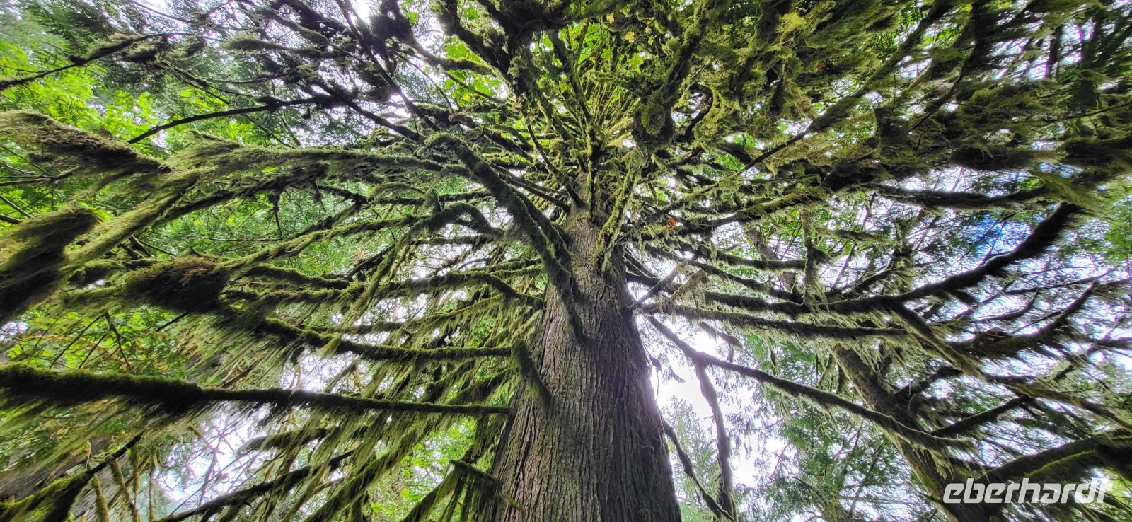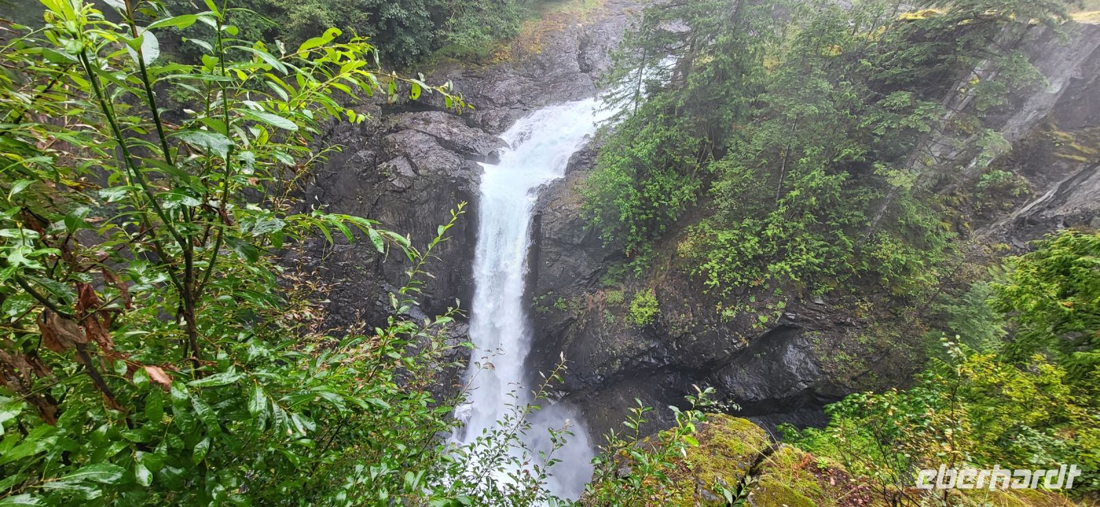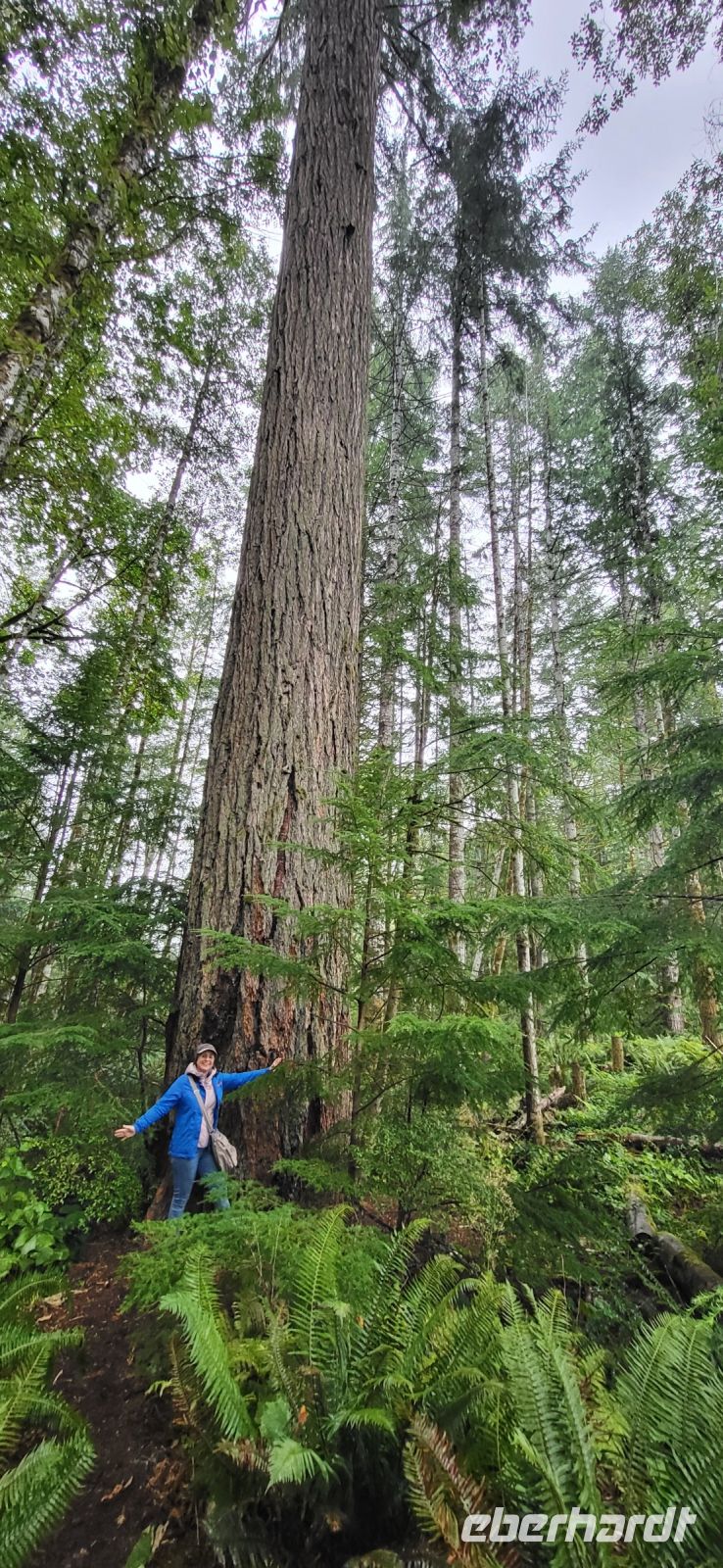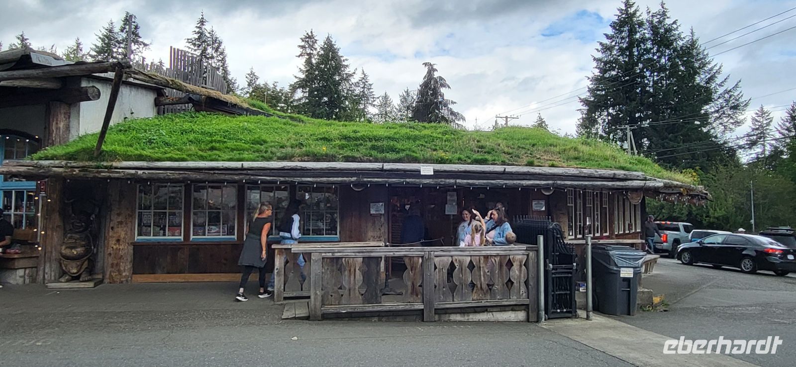 Heute frühstücken wir mal außer Haus und bekommen im Crêpe Montagne herrliche Crêpes serviert. Da das Lokal exklusiv für uns am frühen Morgen geöffnet hat, machen wir es uns gemütlich und speisen genüsslich. Kurz darauf verlassen wir das noch verschlafene Whistler und begeben uns Richtung Küste. Gerne hätten wir einen Blick auf die 2600 m hohen Tantalus Mountains geworfen, aber leider liegen diese heute tief hinter den Wolken. Dafür unternehmen wir einen schönen Spaziergang zu den Shannon Falls, ein Wasserfall, der wie ein Schleier in die Tiefe fällt und herrlich im Wald gelegen ist. Bald darauf haben wir bereits die sogenannte Horseshoe Bay vor uns, die vielen Wochenendausflügler nutzen um mit dem Boot hinauszufahren. Unsere anschließend 1,5-stündige Fährüberfahrt mit BC Ferries bringt uns bei besten Wetterbedingungen und knapp 60 Km weiter nach Vancouver Island. Diese ist die 11. größte Insel Kanadas und an Platz 43 der größten Inseln weltweit. Mit 420 km Länge vergisst man vor Ort, dass man sich auf einer Insel befindet. Nach Ankunft im beschaulichen Örtchen Nanaimo fahren wir zum Old Country Market in Coombs, der berühmt dafür ist, dass es hier die Ziegen auf dem Dach grasen. Tatsächlich-dort angekommen, sehen wir auch prompt einen Ziegenbock hoch oben auf. Im Anschluss halten wir an der Cathedral Cove im McMillan Provincial Park, wo es die berühmten Mammutbäume zu bestaunen gilt. Einem schönen Waldpfad folgend, sehen wir jahrhundertalte Zedern und Douglasien, deren ältestes Exemplar 800 Jahre alt sein soll. Diese hat eine Höhe von 76 m und einen Umfang von 9 m. Absolut beachtlich und man fühlt sich winzig zwischen all den Baumriesen. Am späten Nachmittag erreichen wir Campbell River und unsere nächste Unterkunft für die kommenden zwei Nächte, welche direkt an einem der vielen Ausläufern des Pazifiks gelegen ist.