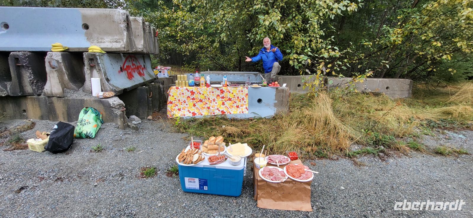 Nachdem wir nochmals die Ruhe in der Tyax Lodge zum Frühstück genossen haben, verlassen wir die Wildnis und es geht erneut am 60 Km langen Carpenter Lake entlang. Es herrscht eine mystische Stimmung. Die Berge liegen in Wolken verhangen um uns herum und es hat mächtig abgekühlt. In Lillooet kaufen wir für unser heutiges Mittagspicknick ein und bevor wir dies genießen, statten wir dem Duffy Lake einen Besuch ab. Da unser Bus eine ungeplante Pause benötigt, verbinden wir dies und bauen unser Picknick auf. So genießen wir dies mitten in der Natur der Coastal Mountain und erreichen gut gestärkt das heutige Kontrastprogramm, was nun auf uns wartet. In Whistler angekommen, bietet sich uns eine komplett andere Welt zur heutigen Fahrt durch unberührte Natur. Der mehr als quirlige Ort mit 12.000 Einwohnern liegt auf 670 m Höhe und wurde durch sein Skigebiet im Rahmen der olympischen Winterspiele von 1988 bekannt. Noch heute erinnern die olympischen Ringe in der Fußgängerzone daran. Diese spazieren wir für eine erste Orientierung entlang und sind ein wenig überfordert mit den vielen Menschen, die hier zeitgleich mit uns unterwegs sind. Abends speisen wir genüsslich im Restaurant Caramba und schlendern anschließend noch durch die nun beleuchtete Fußgängerzone.