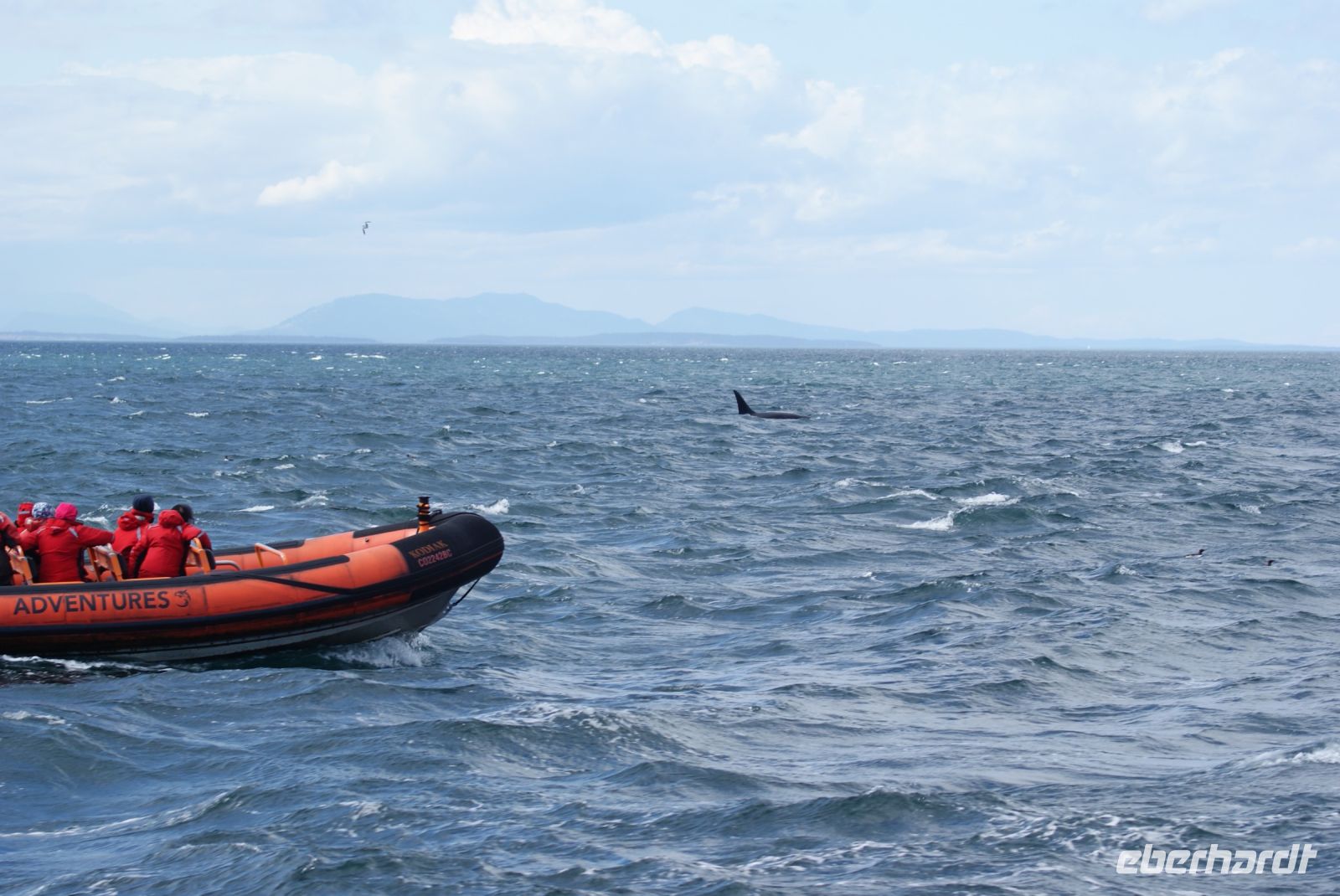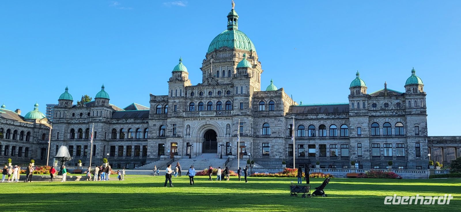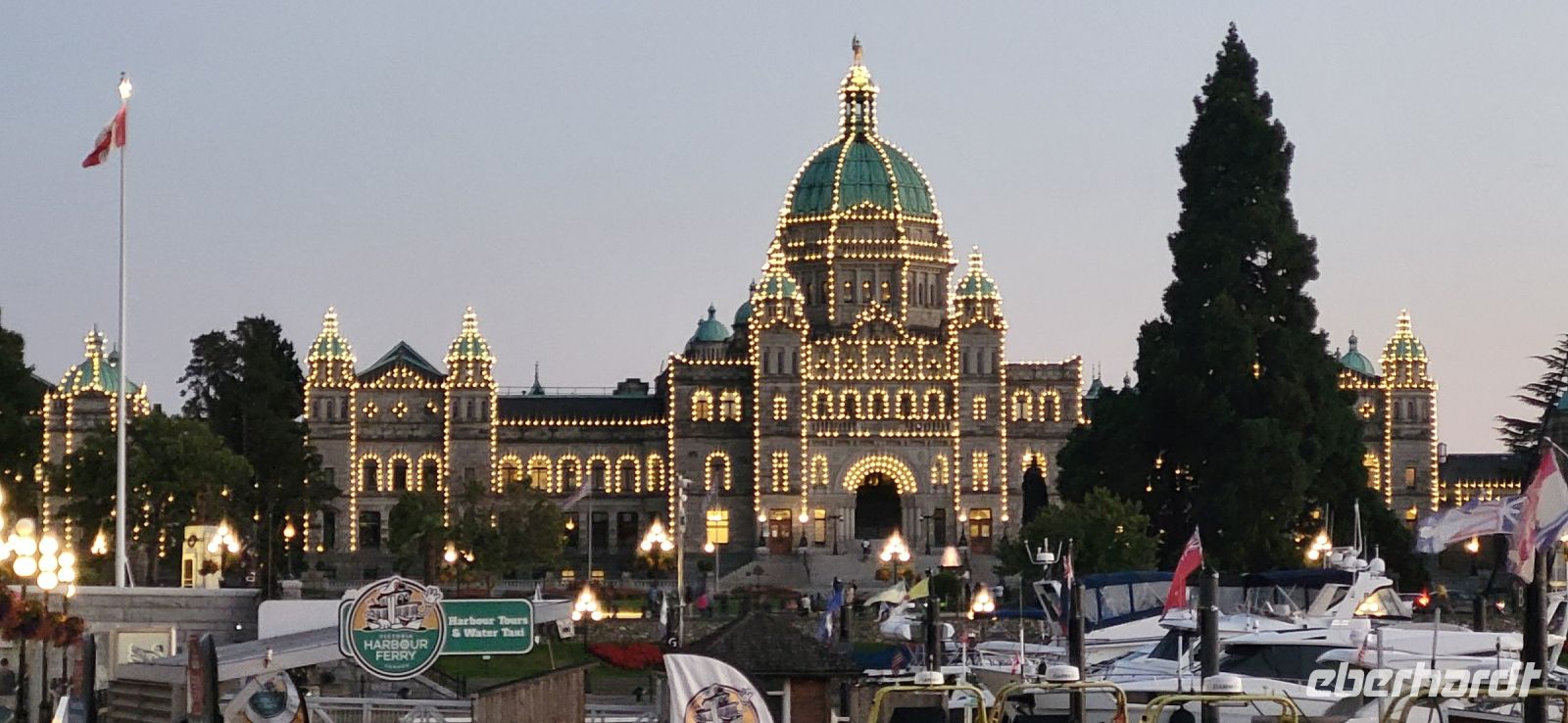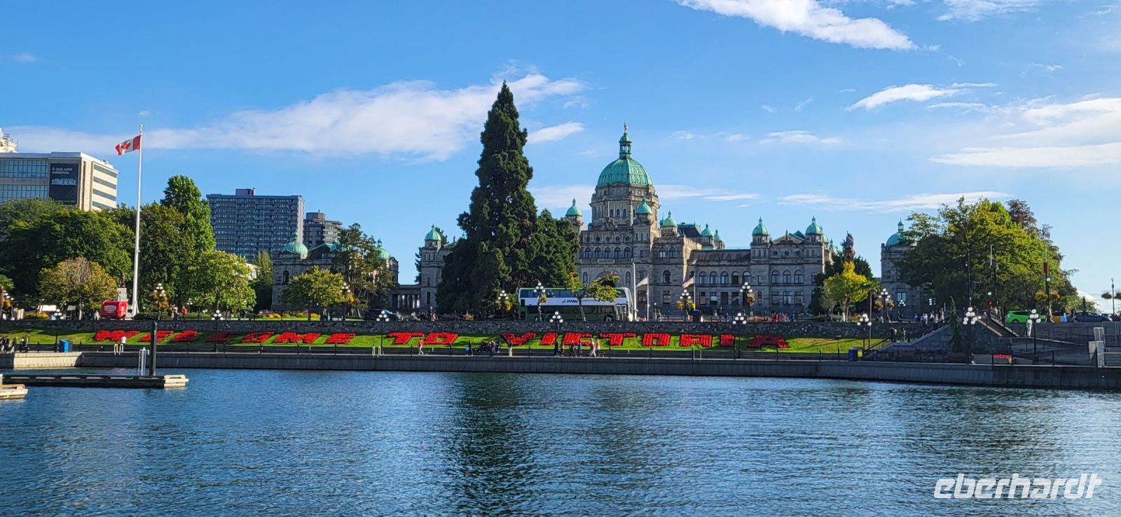 Die Reise führt uns weiter nach Victoria, in die Hauptstadt von British Columbia. Die Sonne hat den Himmel wieder für sich erobert und so freuen wir uns alle über herrliches Wetter, bei dem natürlich alles nochmals so viel schöner aussieht! Auf einen ersten Spaziergang begeben wir uns in Chemainus, eine alte Holzindustriestadt, in der viele schöne historische Bauten und tolle Wandgemälde auf uns warten. Mittags erreichen wir Victoria, unternehmen eine orientierende Stadtrundfahrt und finden uns pünktlich zum Check-in im Walbeobachtungsbüro ein. Am frühen Nachmittag starten wir zum Whale Watching. Bei etwas stürmischerer See als sonst gewohnt, fahren wir ein ganzes Stück hinaus und befinden uns sogar schon in US-Gewässern mit gegenüberliegender Küste, bis wir einige Orcas entdecken. Mit viel Ah und Oh werden diese seitens der Beobachter begrüßt und es ist sicherlich für alle ein tolles Erlebnis. Hier verharren wir einige Zeit, bevor es zurück zur Küste geht. Unterwegs sehen wir noch einige Seehunde, die es sich an Land gemütlich gemacht haben. Nach 3-Stunden auf hoher See kehren wir an Land zurück und verbringen den Abend bei einem schmackhaften Abendessen im Milestones am Hafen mit anschließendem Spaziergang durch das nächtliche und herrlich beleuchtete