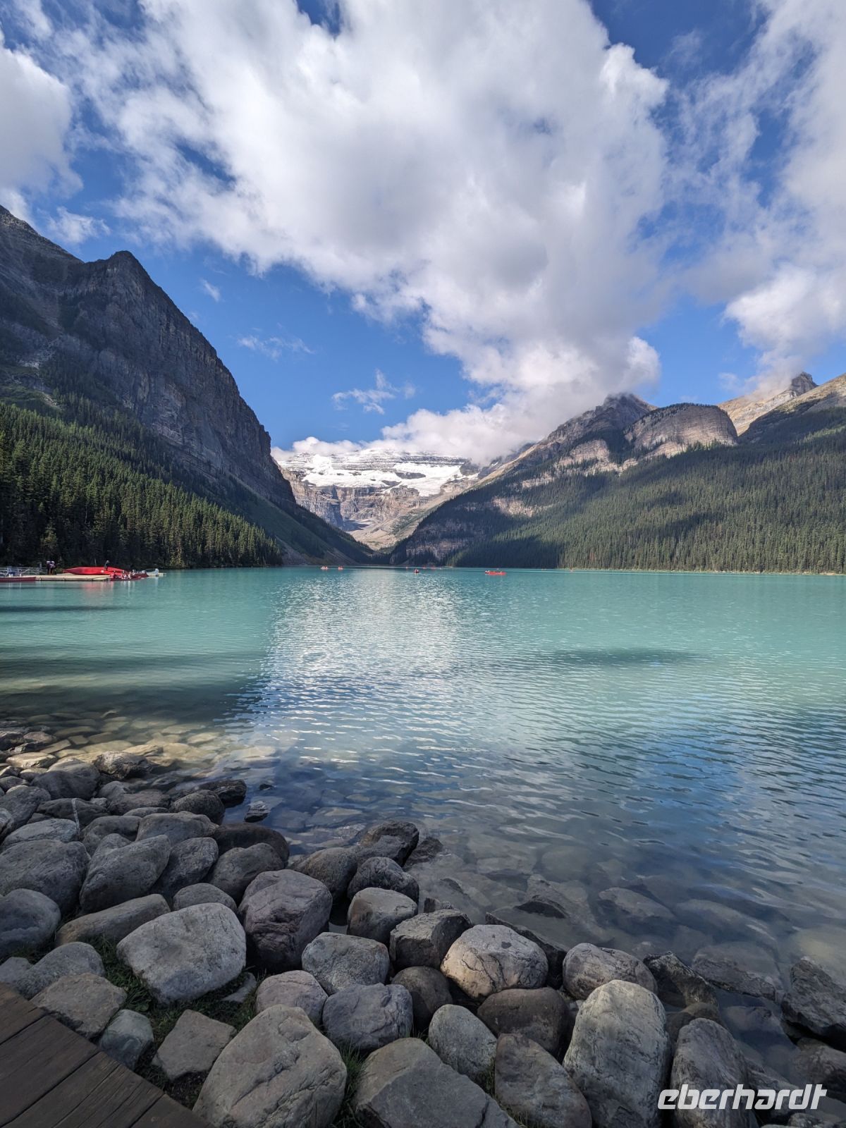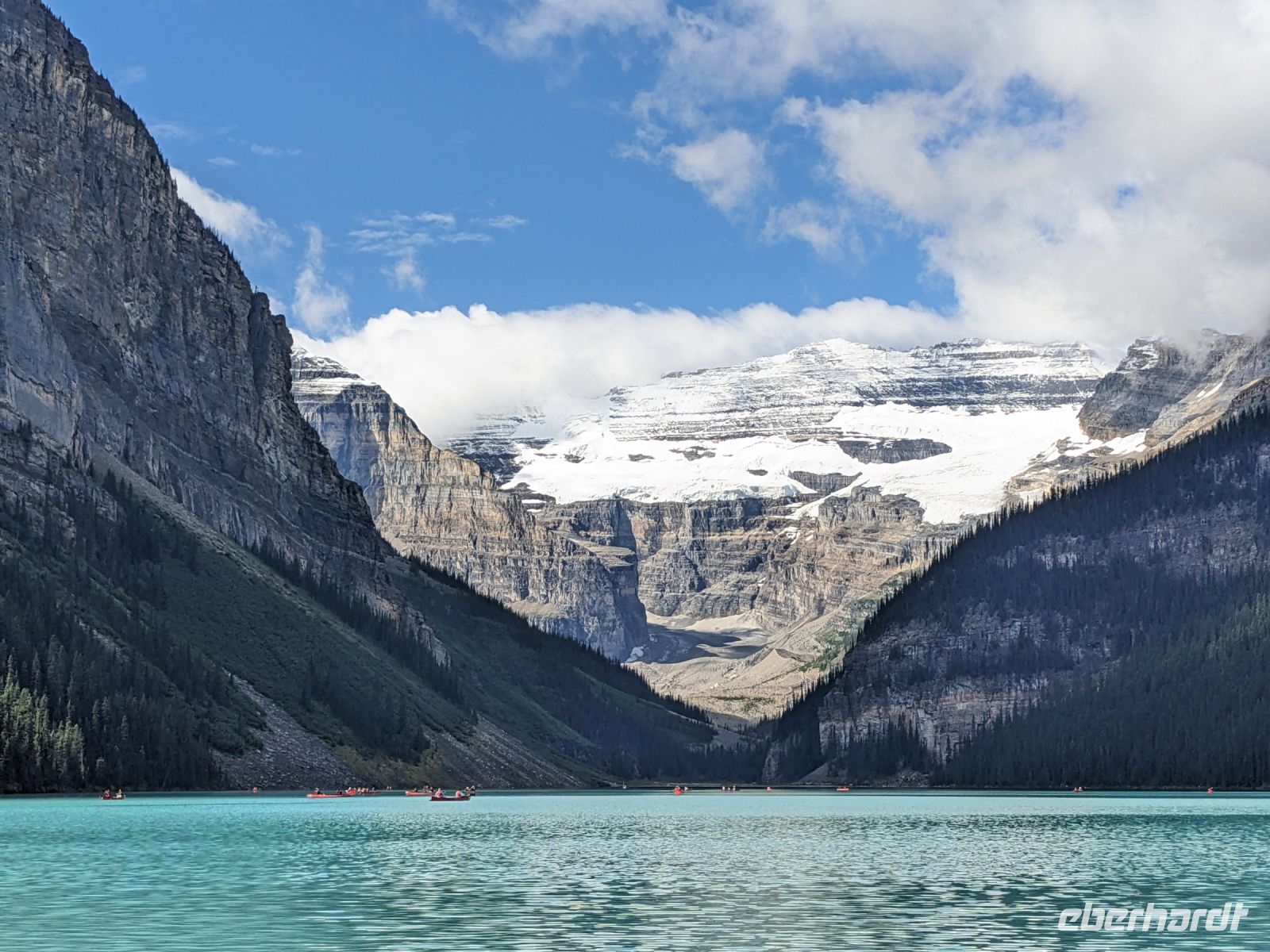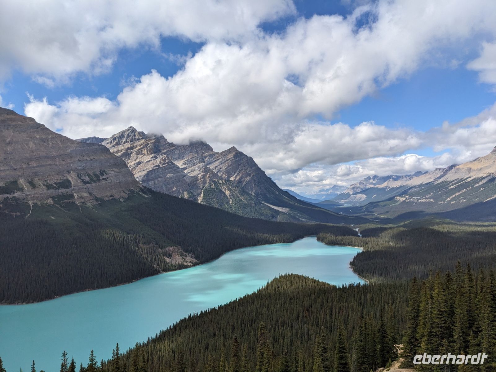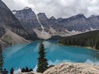 Bei bestem Wetter erkundeten wir heute, nach einem kurzen Stopp bei den Bow Falls in Banff selbst, einige der Highlights des Banff Nationalparks. Fokus lag hier vorrangig auf den beeindruckenden Seen. Der erste, den wir heute zu sehen bekamen, war der malerisch von Bergen umgebene Lake Louise. Während sich bereits die ersten Kanuten in ihren roten Wasserschlitten zeigten, genossen wir den Blick auf das Panorama. Es durften natürlich ein paar Erinnerungsfotos nicht fehlen! Anschließend fuhren wir weiter zum Lake Morraine. Vor allem vom Rock Pile (kleiner Aussichtshügel) aus hatte man eine tolle Sicht auf die einzigartige leuchtende Farbe des Sees. Zum Mittagessen folgte dann - typisch kanadisch - ein kleines Picknick an einem Bachlauf, bevor wir unsere Erkundungstour fortsetzten. Entlang des Icefield Parksways fuhren wir bis zum Peyto Lake, welcher, auf Nachfrage hin, für viele den Höhepunkt darstellte. Grund dafür war der fantastische Blick vom Aussichtspunkt aus. Der See schmiegt sich perfekt in die Landschaft ein und wirkt wie ein Ausschnitt aus einem Gemälde. Auf dem Rückweg nach Banff legten wir noch zwei kurze Stopps ein. Dies war zum einen am Bow Lake und zum anderen am Crow Glacier View Point. Wieder in Banff angekommen, machten wir uns kurz im Hotel frisch, bevor wir zum Abendessen in Earl`s Bistro einkehrten.