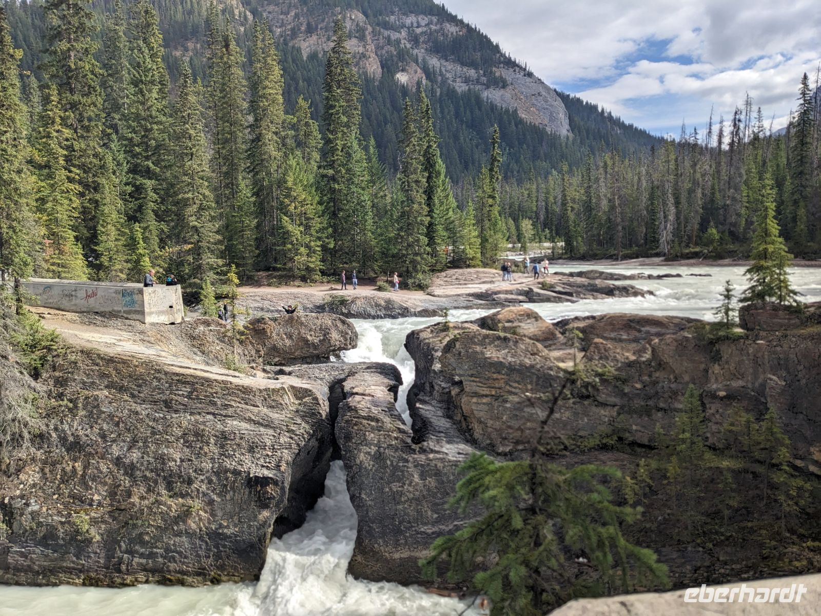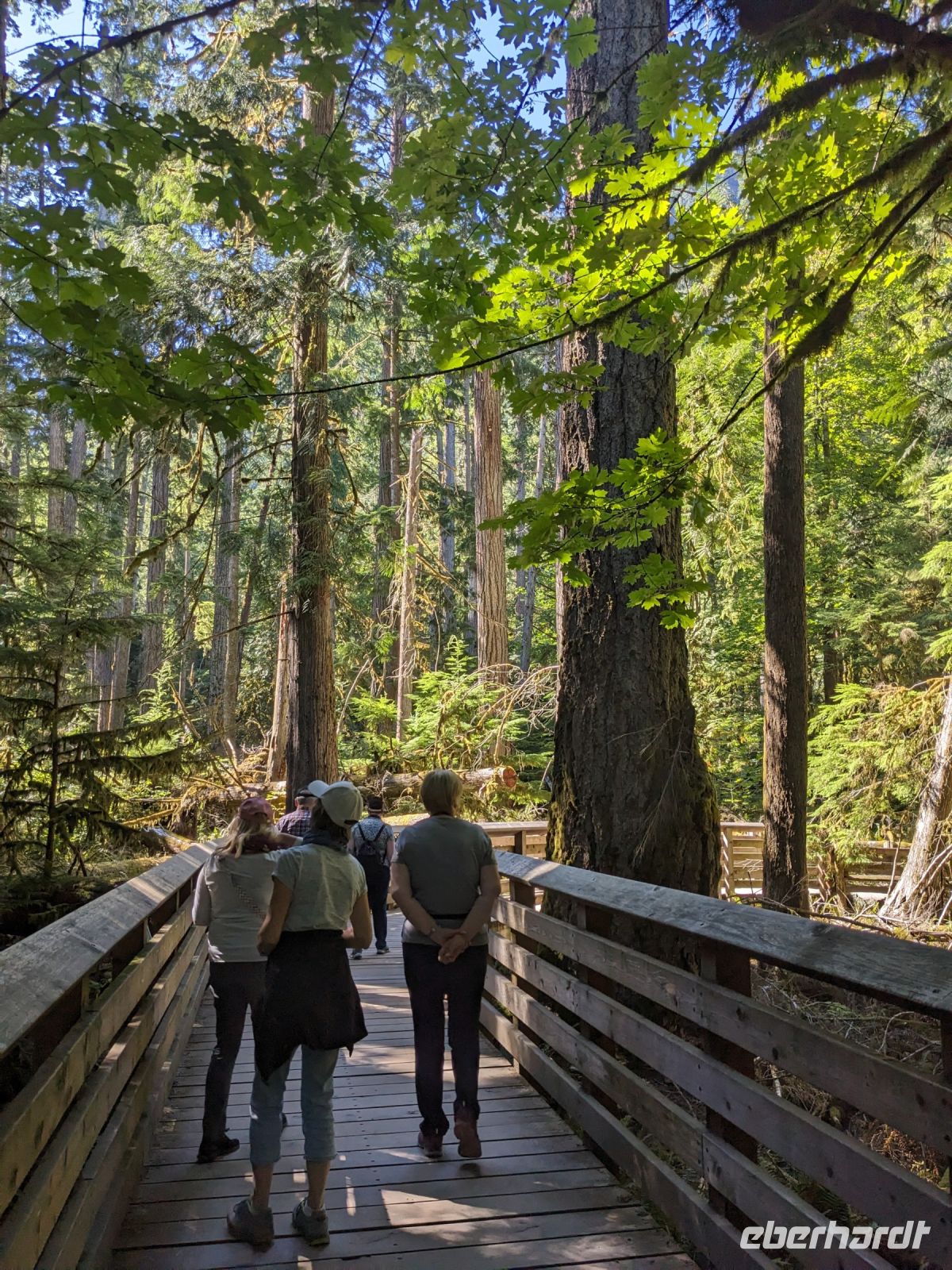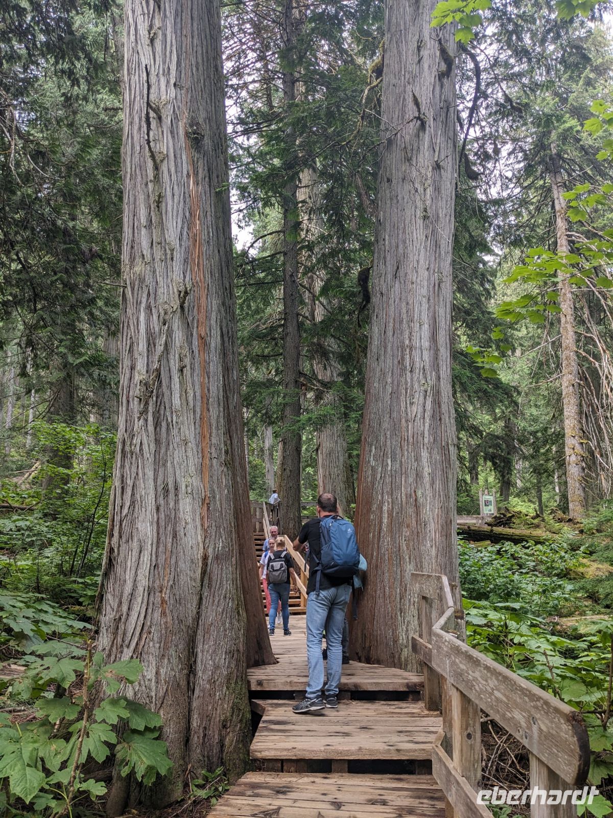 Auf dem Highway 1 in Richtung Kamloops durchquerten wir drei Nationalparks und legten zudem diverse Stopps entlang der Strecke ein. Ganz auf den Spuren der Eisenbahn waren Spuren eben jener nie weit von uns entfernt. Erster Halt war der Lower Spiral Tunnel, ein Eisenbahntunnel, der ganz versteckt im Bergmassiv und Wald kaum auszumachen ist. Ein interessanter Fun Fact, den uns Marion mit auf den Weg gegeben hat, war, dass es sogar Züge gibt, die schauen vorn schon raus, wenn der hintere Teil noch auf der anderen Tunnelseite zu sehen ist. Weiter ging die Fahrt zum Emerald Lake, welcher vor allem durch seine tolle Spiegelung hervorsticht. Nach etwas Freizeit, in der wir bei einem kleinen Spaziergang das Seeufer erkunden konnten, führte uns der heutige Tag weiter zur Natural Bridge, also einer natürlichen Brücke. Hier hat sich das Wasser seinen Weg durch die Felsen erkämpft und ein einzigartiges Phänomen erschaffen. Damit verließen wir den Yoho-Nationalpark. Im Besucherzentrums des Rogers Pass, welcher zum Glacier Nationalpark gehört, gab es viele Informationen zur heimischen Flora und vor allem Fauna. Kurz vor Revelstoke im Mount Revelstoke Nationalpark machten wir noch einen kleinen Spaziergang im Giant Cedar Walk mit seinen gigantischen und hunderte Jahre alten Zedernbäumen. Wenn diese Bäume reden könnten, wie viele Menschen sie schon haben vorbeilaufen sehen ... Zum (späten) Mittagessen hatten wir etwas Zeit in der Stadt Revelstoke. Anschließend fuhren wir weiter zum Eagles Pass mit dem Last Spike Monument. Hier wurde der letzte Nagel der transkontinentalen Eisenbahn von Ost nach West eingeschlagen, was ihn zu einer historisch wichtigen Stätte des Handels und des Fortschritts der nordamerikanischen Besiedlung macht. Nach dieser Vielzahl an Eindrücken kehrten wir am frühen Abend im urigen South Thompson Inn in Kamloops ein.