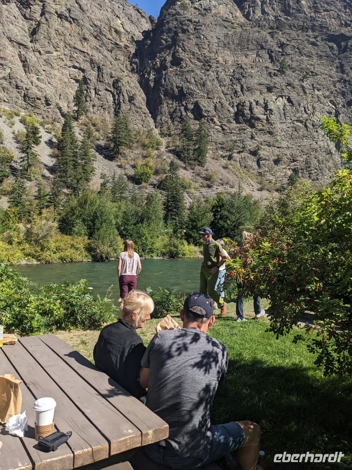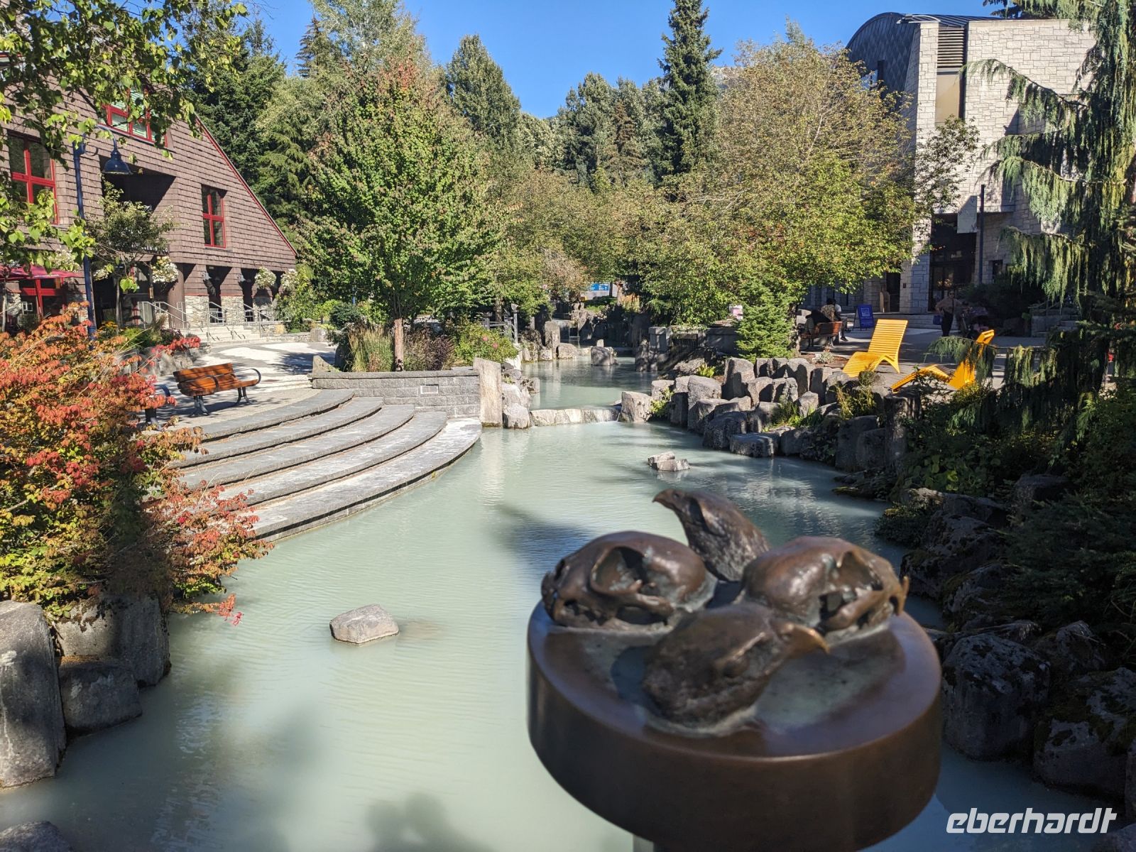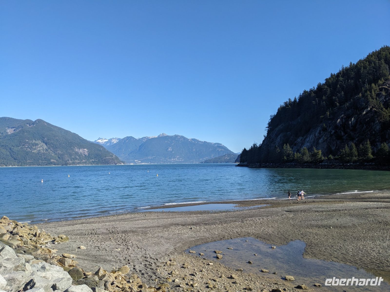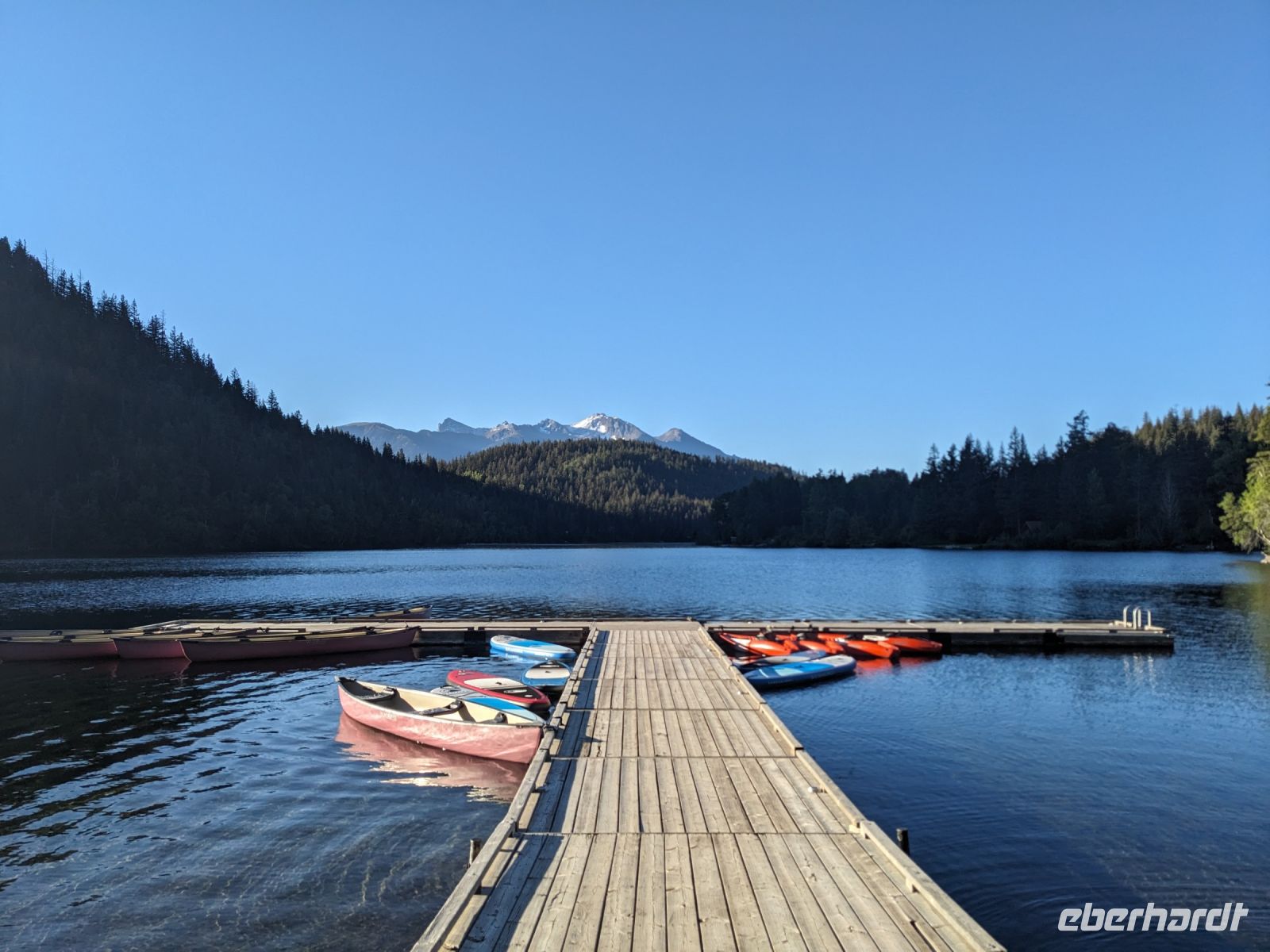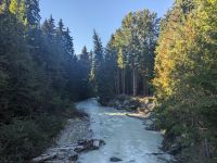 Leider mussten wir uns an diesem Morgen von unserer wunderschönen Tyax Lodge verabschieden und nahmen die Straße am Carpenter Lake zurück nach Lillooet. Auf dem Weg machten wir noch einen kurzen Stopp am Staudamm zum See. Bei der a.bun.dance Bäckerei in der Stadt gab es dann einen leckeren Snack und ein Getränk unserer Wahl. Das Picknick folgte kurze Zeit später an der Seton River Picknick Area. Einige von uns hatten hier sogar das Glück einen Bären zu sehen, welcher einfach gemütlich seiner Wege ging und uns Menschen nicht weiter beachtete. Entlang der Duffey Road gelangten wir schließlich zum malerischen Duffey Lake, in dem wir unsere Füße etwas erfrischen konnten. Von dort war es nun nicht mehr weit, bis wir in Whistler einfuhren. Wir nahmen eine etwas ausschweifende Runde mit dem Bus zum Hotel, sodass wir bereits einen ersten Eindruck von diesem typisch nordamerikanischen Wander-/Skiort bekommen konnten. Bei einem kleinen orientierenden Spaziergang, nach dem Check-In im Pinnacle Hotel, besuchten wir die Fußgängerpassage bis zum Olympischen Platz mit seinen ikonischen olympischen Ringen als beliebtes Fotomotiv. Hier trennten sich dann unsere Wege - einige zogen auf eigene Faust los, andere kamen mit Marion und mir noch auf einen ausgedehnteren Spaziergang durch Whistler. Später trafen wir uns dann alle zusammen wieder zum Abendessen. Aufgrund unserer geräuschintensiven Tischnachbarn waren wir dann zügig fertig und lauschten noch einem der regelmäßig stattfindenden kostenfreien Konzerte auf dem Olympischen Platz.