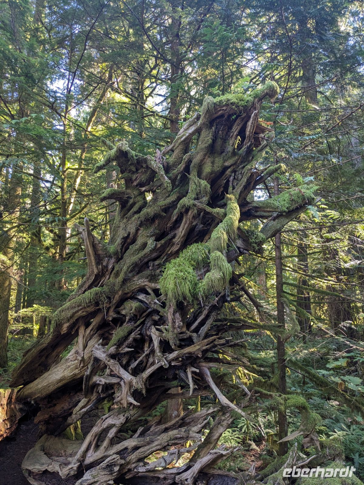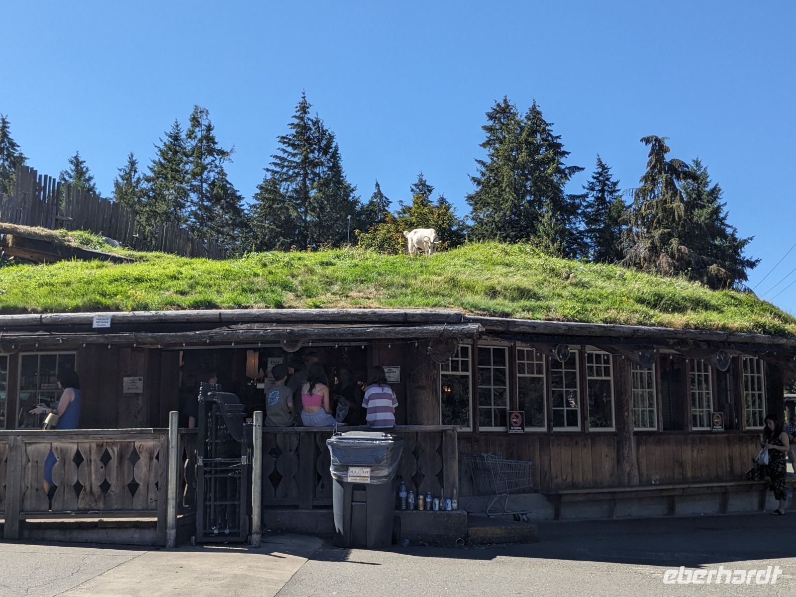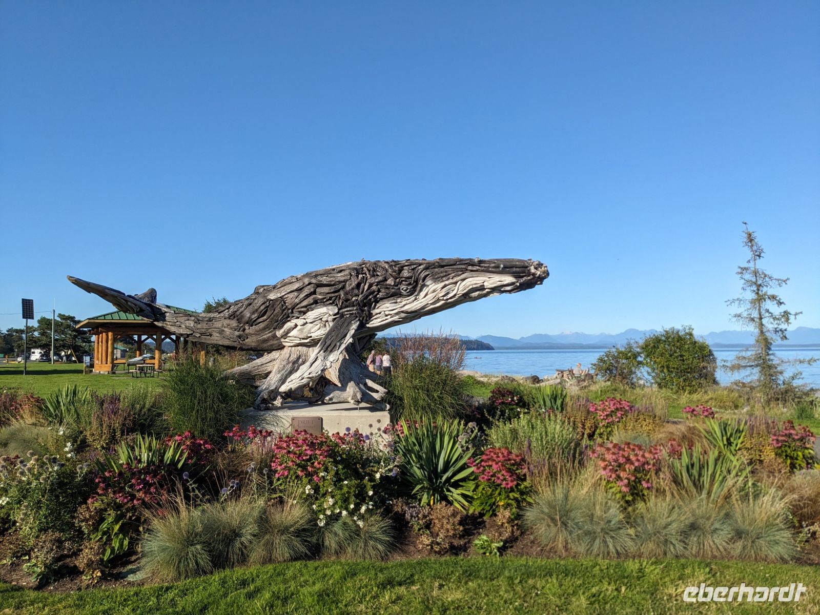 Der Tag startete mit einem etwas anderem Frühstück als sonst- statt einem Frühstücksbüfett, wie sonst, erwarteten uns herzhafte Crêpes in einem nahegelegenen Bistro unweit des Hotels. Während dieses leckeren Frühstücks hatte Don bereits unsere Koffer verladen. Unsere Rundreise führte uns weiter in Richtung Fährstation nach Vancouver Island. Wir machten noch zwei Stopps auf dem Weg: einen am Tantalus Lookout mit Blick auf ein malerisches Bergpanorama und einen zweiten am Porteau Cove, ein beliebter Spot für Taucher und Bootsfahrer. Schließlich erreichten wir die Fähre und nach einem reibungslosen "Einstieg" verbrachten wir die nächsten 1,5 Stunden mit der Bewunderung der vorbeiziehenden Landschaft. Selbst ein paar Buckelwale ließen sich blicken. Angekommen auf der Insel war unser erster Halt in Coombs bei den `Goats on the roof`, einer Attraktion bei der man Ziegen beim Grasen auf dem Dach einer Markthalle beobachten kann. Nicht weit davon entfernt lag dann der MacMillan Park, auf dessen Spazierwegen entlang der hunderte Jahre alten Douglasien wir uns diese Giganten in Ruhe anschauten. Letzter Stopp vor dem Comfort Inn, unserem Hotel in Campbell River, war eine Parkbucht am Küstenweg der Stadt. Besonders sehenswert sticht hier der aus Treibholz gefertigte Wal in Auge. Nach einer kurzen Pause im Hotel kamen wir zum gemeinsamen Abendessen wieder zusammen. Das Restaurant Quay West beeindruckte hier vor allem mit seinen großen Panoramafenstern hinaus zum Hafen