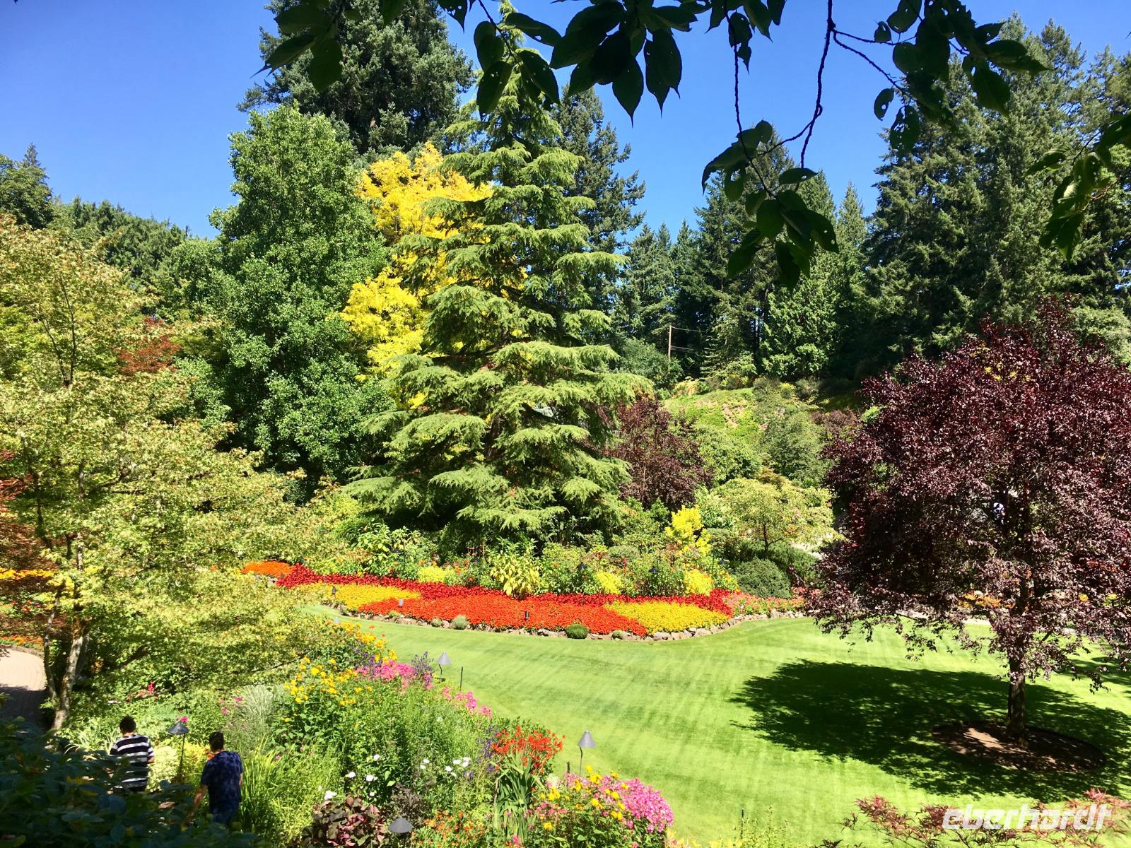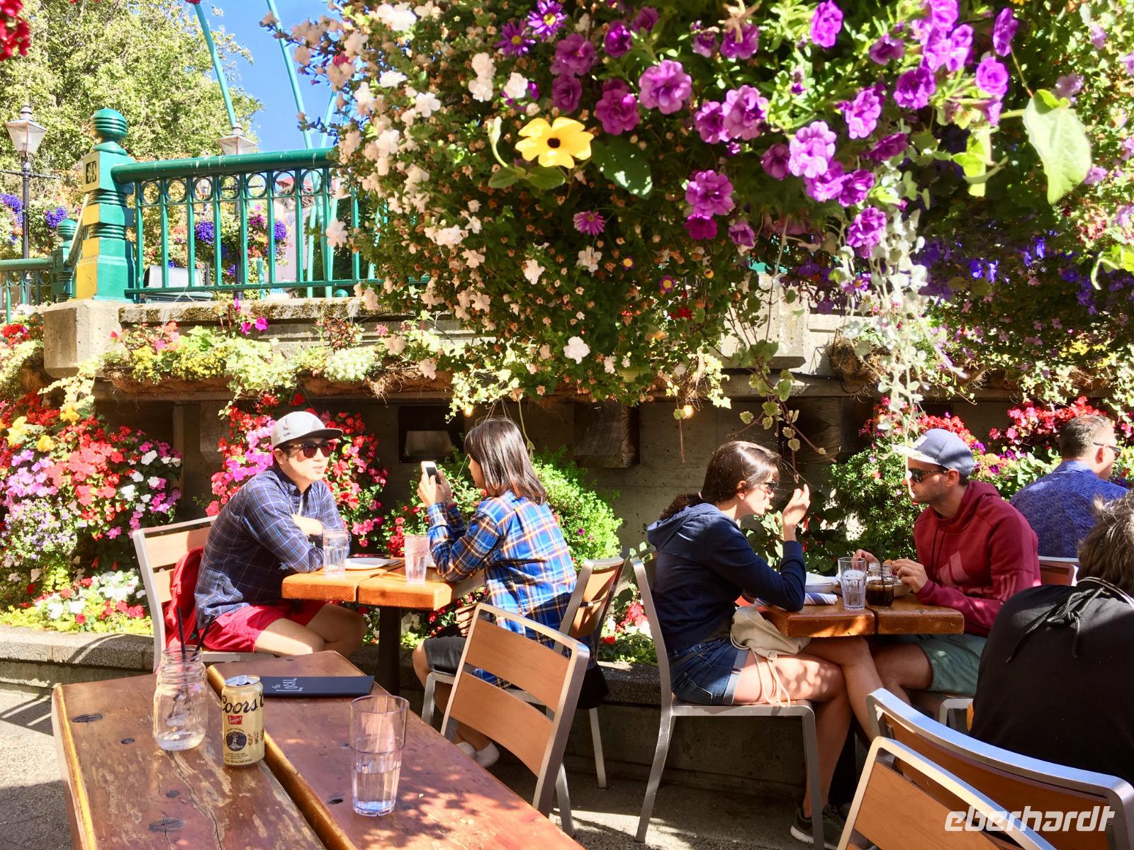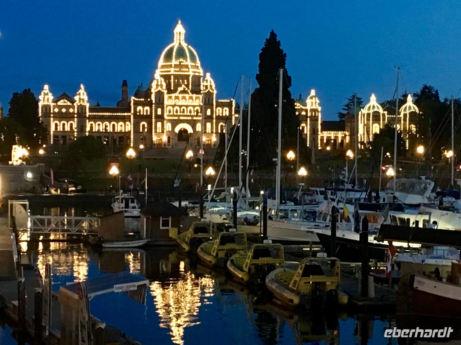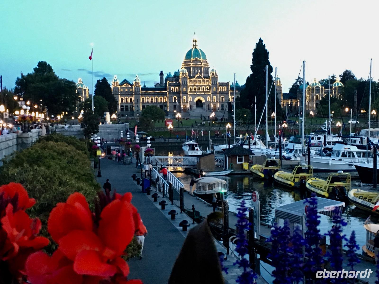 Heute fahren wir bereits um 8:30 Uhr ab, denn heute geht es auf die Insel von Vancouver. Unser Fahrer ist der Tango-tanzende Hermann aus Chile. Auf der Fahrt zur Faehre werden wir nun in das Leben der pazifischen Lachse eingefuehrt. Gleich 5 Arten gibt es aber der tiefrote, wilde Sockey, sei der beste Lachs um mit nach Hause zu nehmen. Nun steht uns aber die schoene Faehreueberfahrt vor. Die Ueberfahrt auf die Insel dauert 1 Stunde und 35 Minuten. Auf der Insel angekommen fahren wir gleich zu den Butchart Gaerten. Schoen haben wir uns die Gaerten vorgestellt aber auf diese Pracht waren wir nicht vorbereitet. Nun verstehen wir aber, weshalb 1 Million Menschen diesen Ort jaehrlich aufsuchen. Die verschiedenen Gaerten sind einfach toll. Der haengende Garten mit seinen riesen Begonien, der versunkene Garten mit der Ausgewogenheit und seinem Teich und Wasserspiel, der Farngarten, der Rosengarten mit seinen 250 Arten von Rosen und 2500 Pflanzen, der Japanische Garten der unser Leben bereichert, der franzoesische Garten mit seinem herrlichen Ausblick und der bezaubernde italiensiche Garten mit seinem perfekten Chaos, alle Gaerten sind so verschieden und so schoen angelegt man moechte einfach hier bleiben. Wir haben jedoch noch was vor, also steigen wir wieder in unseren Bus und lassen uns in die Stadt fahren. Dort steigen wir in Chinatown aus und machen einen Stadtrundgang zu Fuss. Hermann freut sich sehr ueber das ueppige Trinkgeld und bringt unsere Koffer und Taschen gewissenhaft und professionel ins Hotel. Chinatown ist sehr interessant und die Gassen hier sind sehr eng. Auch hier gibt es wieder nette Geschichten und Anekdoten ueber das Leben hier in Victoria unter dem Joch des Haengerichters Sir Mathiew Bailly Begbie. Die bunten Haeuser von Victoria lassen uns staunen; wo man wohl solche Farben kaufen kann ? Das alles macht sehr durstig, also finden wir auch bald schon mal ein Pub mit einer blumenuebersaeten Terasse. Danach geht unser Stadtrundgang weiter und bringt uns beim Gerichtshof vorbei auf die Government Street die uns runter ans Meer zum Hafen fuehrt. Das Parlament und das Empress Hotel dominieren den Hafen. Die Boote, Schiffe, Jachten, Faehren und Flugzeuge bereichern die Szene. Nun horchen wir noch der lustigen und tragischen Agatha Christy Geschichte von Romeo und Juliette zu, welche zur Jahrhundertwende in Victoria gespielt hat. Es ist das Leben und Sterben des grossen Architekten Francis Rattenburry auch liebevoll Ratzibutzi genannt. Jetzt ist es aber Zeit, dass wir in unser Hotel gehen. Die Koffer haben ihren Weg in die Zimmer bereits gefunden und die Schluessel zu unseren Zimmern bekommen wir auch bald. Victoria ist abends wunderschoen, wenn auch eigenartig beleuchtet und Gaukler, Kuenstler und Artisten beleben die Stadt, aus den Pubs und Restaurants ertoent Musik man weiss gar nicht, wo man einkehren soll. Wir werden in einem feinen Lokal direkt am Hafen erwartet. Mmmh.