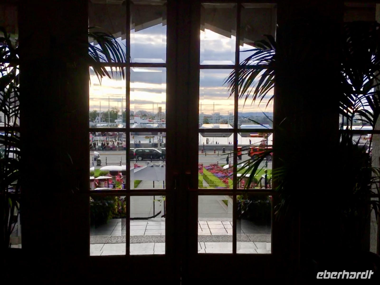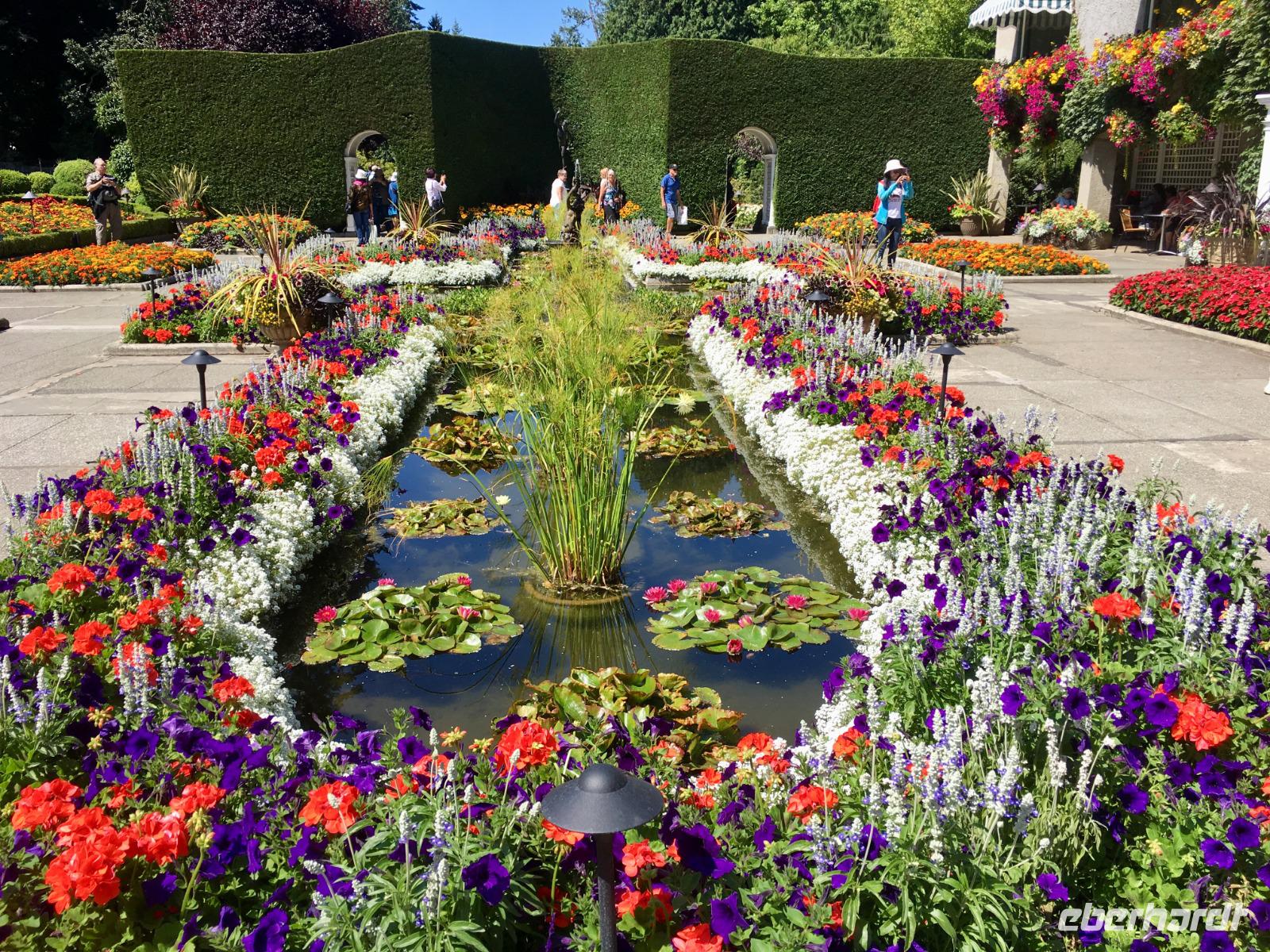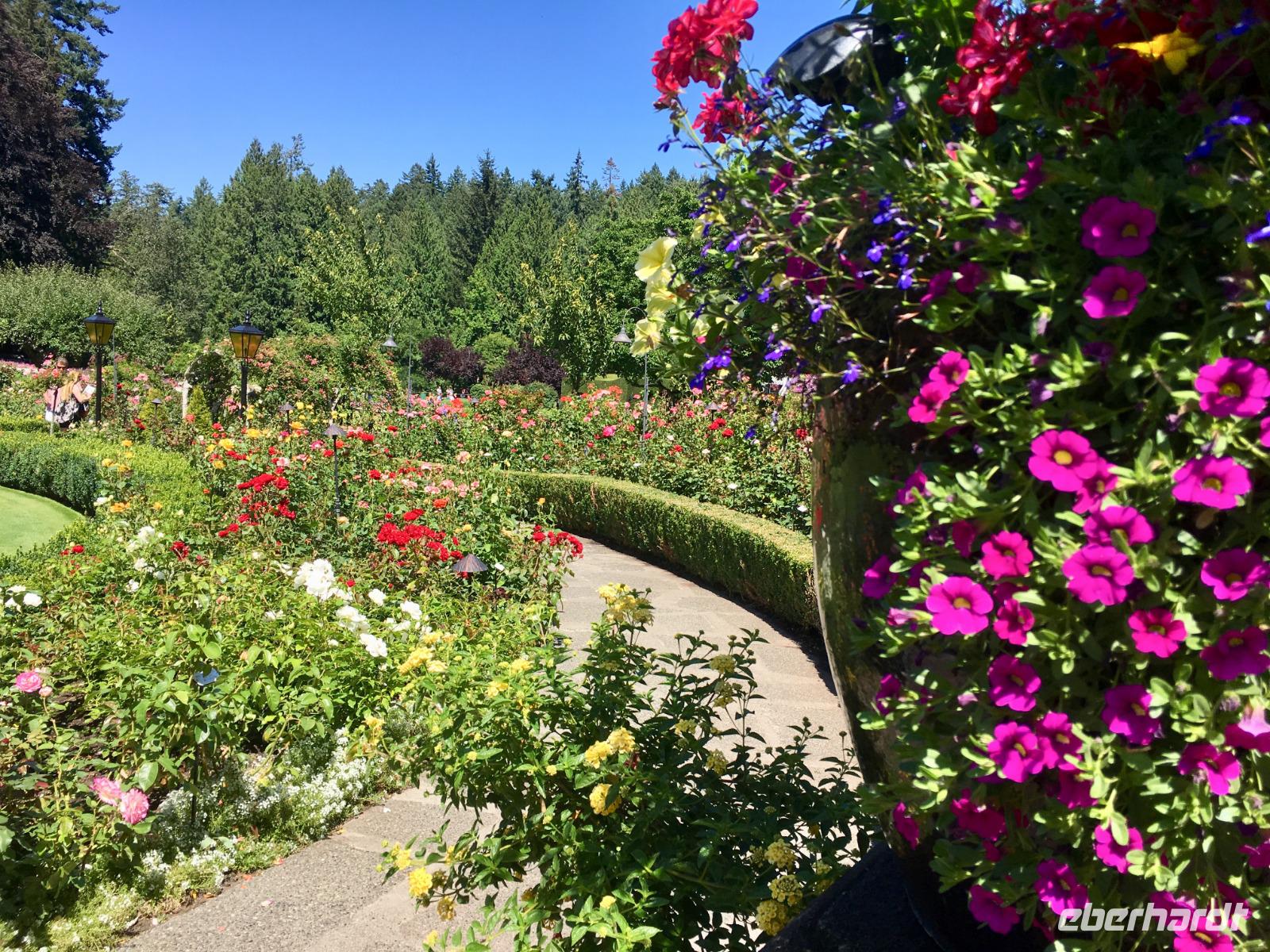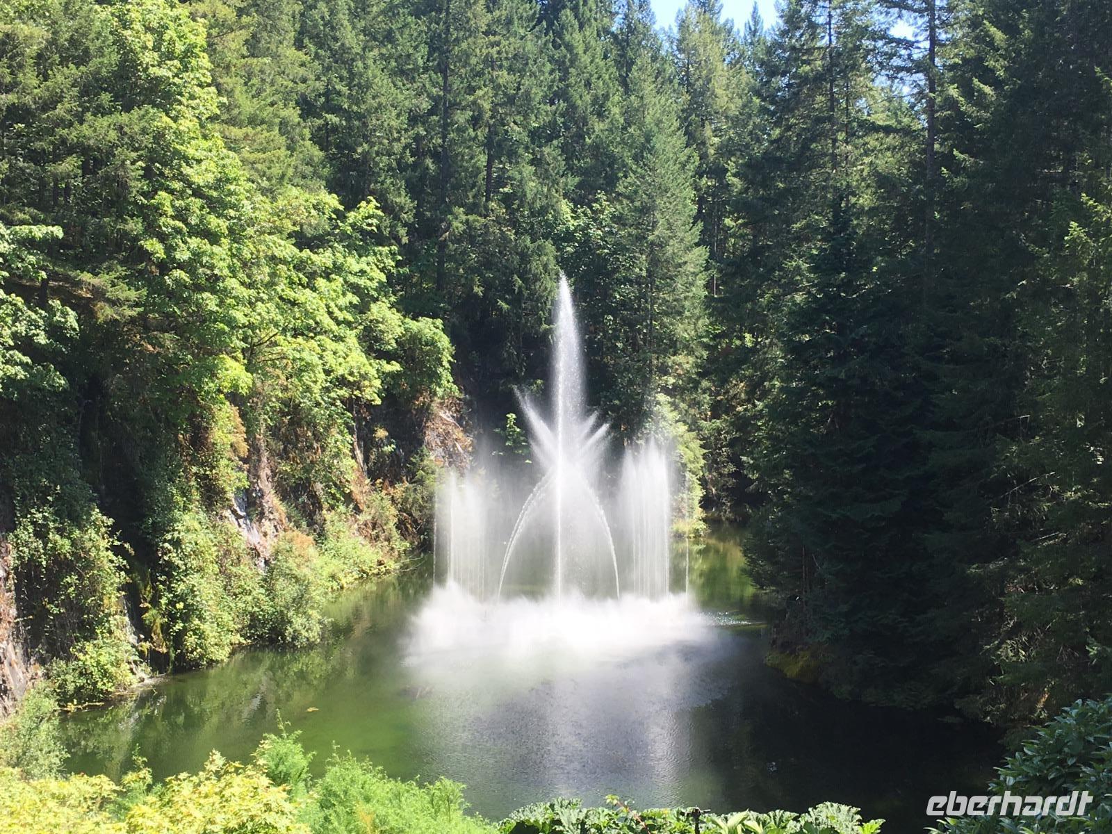 Heute fahren wir bereits um 8:30 Uhr ab, denn heute geht es auf die Insel von Vancouver. Unser Fahrer ist der Tango-tanzende Hermann aus Chile. Auf der Fahrt zur Faehre werden wir nun in das Leben der pazifischen Lachse eingefuehrt. Gleich 5 Arten gibt es aber der tiefrote, wilde Sockey, sei der beste Lachs um mit nach Hause zu nehmen. Nun steht uns aber die schoene Faehreueberfahrt vor. Die Ueberfahrt auf die Insel dauert 1 Stunde und 35 Minuten. Auf der Insel angekommen fahren wir gleich zu den Butchart Gaerten. Schoen haben wir uns die Gaerten vorgestellt aber auf diese Pracht waren wir nicht vorbereitet. Nun verstehen wir aber, weshalb 1 Million Menschen diesen Ort jaehrlich aufsuchen. Die verschiedenen Gaerten sind einfach toll. Der haengende Garten mit seinen riesen Begonien, der versunkene Garten mit der Ausgewogenheit und seinem Teich und Wasserspiel, der Farngarten, der Rosengarten mit seinen 250 Arten von Rosen und 2500 Pflanzen, der Japanische Garten der unser Leben bereichert, der franzoesische Garten mit seinem herrlichen Ausblick und der bezaubernde italiensiche Garten mit seinem perfekten Chaos, alle Gaerten sind so verschieden und so schoen angelegt man moechte einfach hier bleiben. Wir haben jedoch noch was vor, also steigen wir wieder in unseren Bus und lassen uns in die Stadt fahren. Dort steigen wir in Chinatown aus und machen einen Stadtrundgang zu Fuss. Hermann freut sich sehr ueber das ueppige Trinkgeld und bringt unsere Koffer und Taschen gewissenhaft und professionel ins Hotel. Chinatown ist sehr interessant und die Gassen hier sind sehr eng. Auch hier gibt es wieder nette Geschichten und Anekdoten ueber das Leben hier in Victoria unter dem Joch des Haengerichters Sir Mathiew Bailly Begbie. Die bunten Haeuser von Victoria lassen uns staunen; wo man wohl solche Farben kaufen kann ? Das alles macht sehr durstig, also finden wir auch bald schon mal ein Pub mit einer blumenuebersaeten Terasse. Danach geht unser Stadtrundgang weiter und bringt uns beim Gerichtshof vorbei auf die Government Street die uns runter ans Meer zum Hafen fuehrt. Das Parlament und das Empress Hotel dominieren den Hafen. Die Boote, Schiffe, Jachten, Faehren und Flugzeuge bereichern die Szene. Nun horchen wir noch der lustigen und tragischen Agatha Christy Geschichte von Romeo und Juliette zu, welche zur Jahrhundertwende in Victoria gespielt hat. Es ist das Leben und Sterben des grossen Architekten Francis Rattenburry auch liebevoll Ratzibutzi genannt. Jetzt ist es aber Zeit, dass wir in unser Hotel gehen. Die Koffer haben ihren Weg in die Zimmer bereits gefunden und die Schluessel zu unseren Zimmern bekommen wir auch bald. Victoria ist abends wunderschoen, wenn auch eigenartig beleuchtet und Gaukler, Kuenstler und Artisten beleben die Stadt, aus den Pubs und Restaurants ertoent Musik man weiss gar nicht, wo man einkehren soll. Wir werden in einem feinen Lokal direkt am Hafen erwartet. Mmmh.