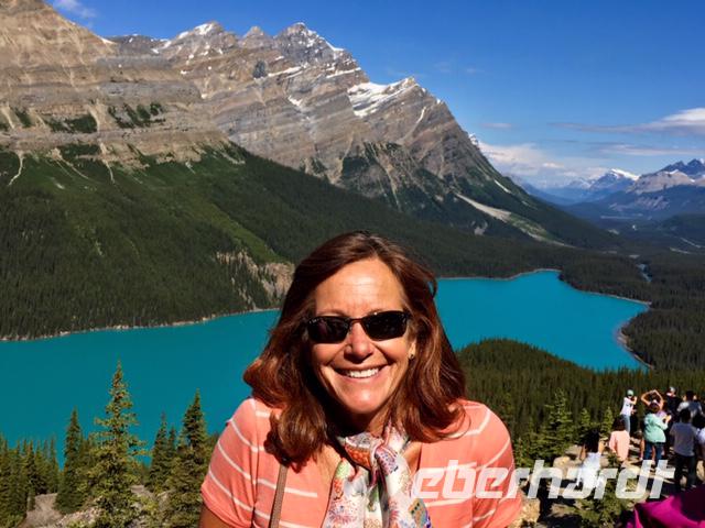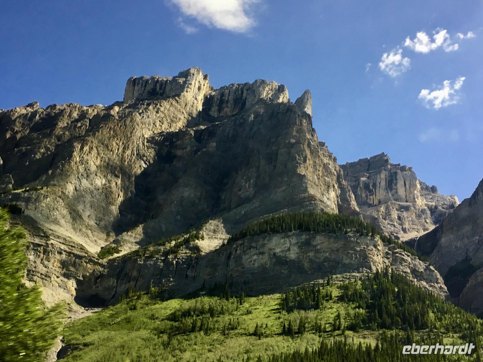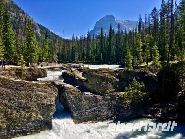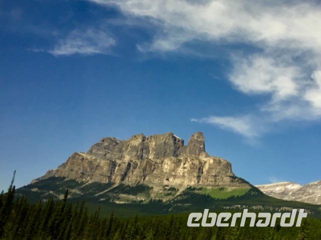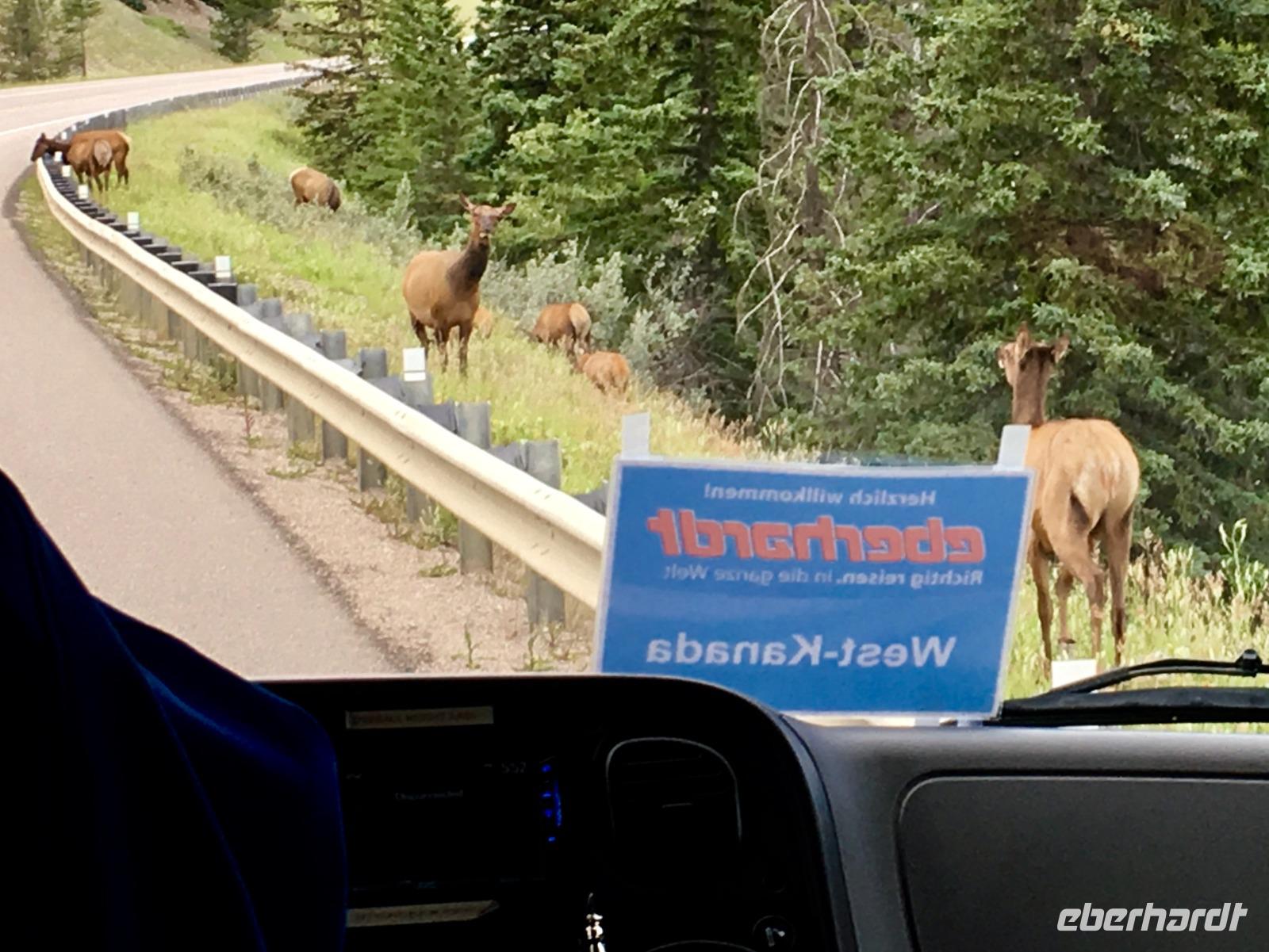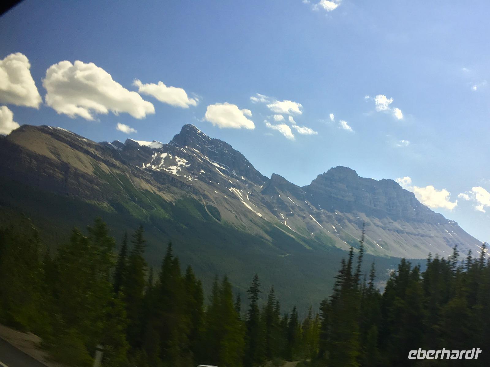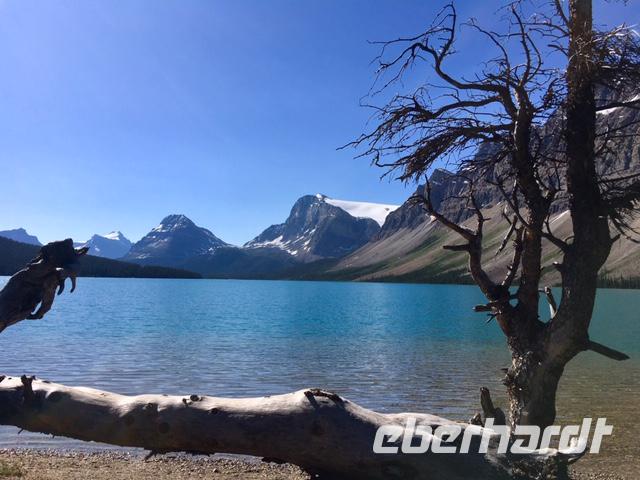 Nichts Schoeneres als aufwachen, in die Berge zu schauen und blauen Himmel zu sehen. Die meisten sind bereits um 6 Uhr in der Frueh unterwegs, um Fotos von dem rosafarbenen Victoria Gletscher zu erhaschen. Der See liegt ganz ruhig und die Spiegelung ist perfekt. Das Fruehstuecksbuffet ist wieder wunderbar, besonders die Smoothies, die wecken alle Geister. Vorerst fahren wir heute mit Hugh zur beruehmten Filmszene des Films Doktor Shiwago. Wir sehen sie fast, die gute Lara wie sie ihrem Omar Sherif zuwinkt. Nun gehts aber ab in Richtung Yoho National Park. Bei den Spiral Tunnels halten wir an, sehen leider gerade keinen Zug in dem Tunnelsystem, wir sind ja auch in Ka-na-da, aber wir schauen uns das Schauspiel auf einem Modell an. Was fuer eine wunderbare Fahrt nach Emerald Lake. Ehe wir beim See ankommen halten wir noch bei der Natuerlichen Bruecke. Unsere Kameras laufen heute auf Hochtouren, denn wir knipsen viele Bilder von der steinernen Naturbruecke die sich ueber den Kicking Horse River spannt und von den umliegenden Bergen. Bald sind wir bei Emerald Lake, er glitzert smaragdgruen wie auf den Postkarten. Beim See angekommen wollen wir nun gleich spazieren gehen. Auf der anderen Seite des Sees picknicken wir nun das Eingekaufte, Eberhardt spendiert heute das Dessert und den Whisky dazu. Zurueck im Bus ist nun Siesta-time angesagt. Erst bei Banff werden wir wieder geweckt da wir heute noch den Miniwanka und den Two Jack Lake anschauen moechten. Vielleicht sehen wir ja auch ein paar Krummhornschafe. Wir sind nicht die einzigen die spaet nachmittags auf eine Krummhornschaf-Pirsch gehen. Sogar Hugh, unser Fahrer, macht heute ein Foto. Nicht von den versteckten Krummhornschafen oder von den Seen, sondern von den vielen Autos die hier geparkt sind ! Es ist ein sonniger warmer Tag heute und alle stroemen zu den Seen. So haben sich die Krummhornschafe auch verzogen und wir geniessen die Sicht auf das schoene Panorama. Nun gehts weiter nach Banff hinein, wo wir auch aussteigen koennen um uns dieses niedliche Bergdorf anzuschauen. Unterdessen checkt Elisabeth uns im Hotel ein, organisiert die Koffer und Taschen und trifft uns danach wieder im Dorf. Wir fahren dann gemeinsam in einem Bus zum Hotel und einige unter uns besuchen danach auch gleich die Thermalbaeder. Das Abendessen ist heute in einem eigenen Saal mit wunderbarer Aussicht. Der Steak ist der Menu-Sieger des Tages und der offerierte kanadische Wein schmeckt auch sehr fein dazu. Danke Eberhardt ! So schnell wird es 10 Uhr nachts und draussen ist es noch taghell. Ein wunderschoener Tag in den Rocky Mountains verabschiedet sich bald und die grossen Zimmer mit herrlicher Sicht auf Mount Rundl rufen uns schon. Gute Nacht und schoene Traeume von smaragdgruenen Seen.