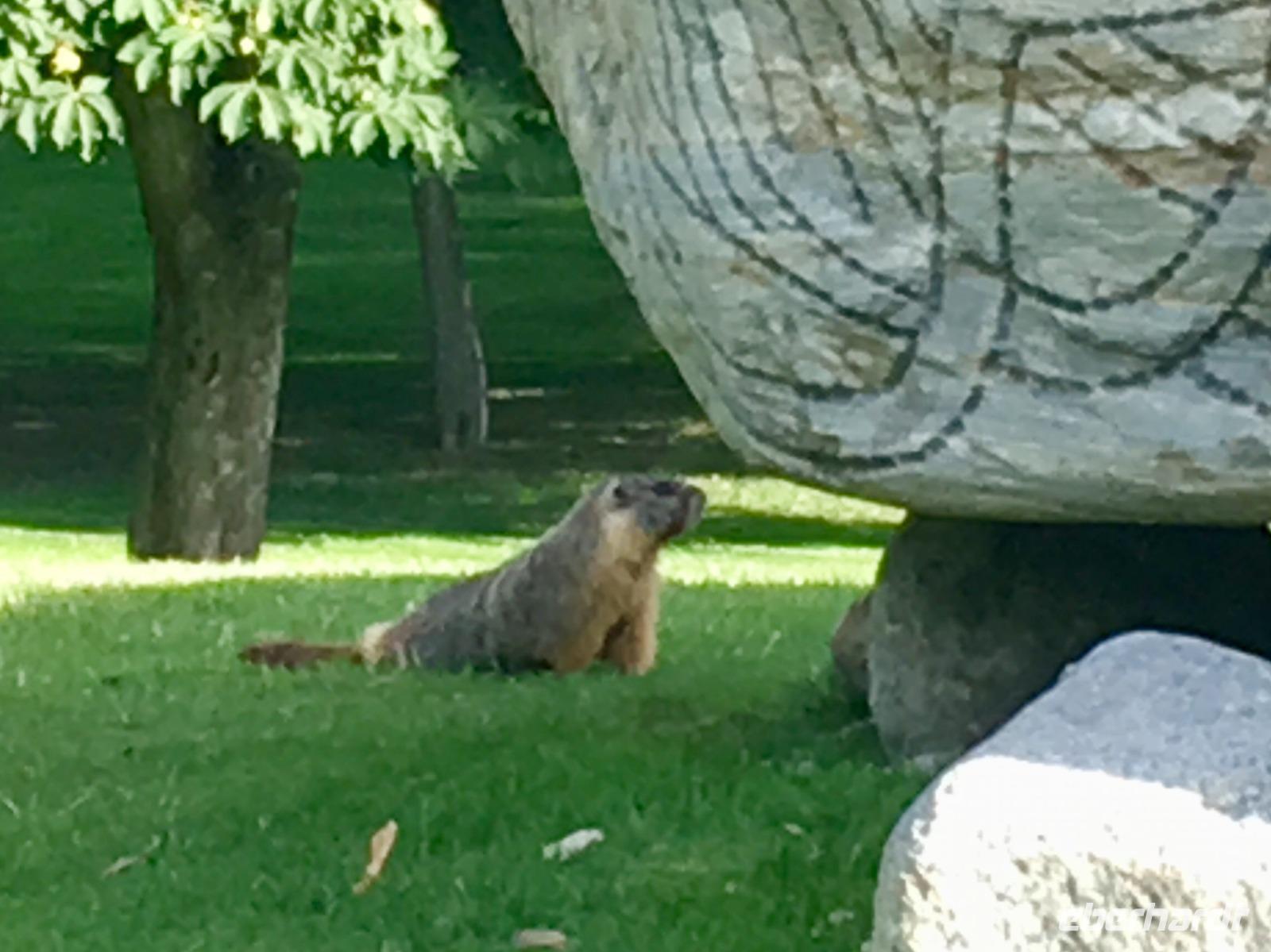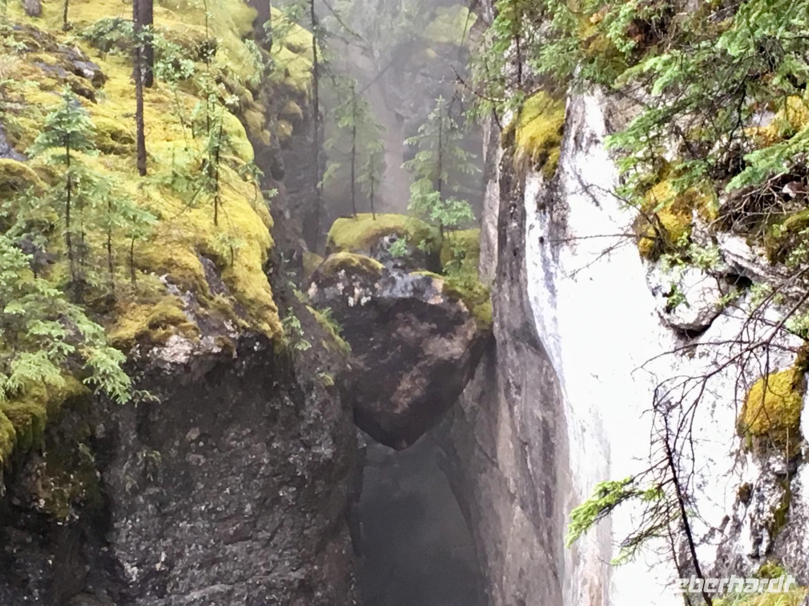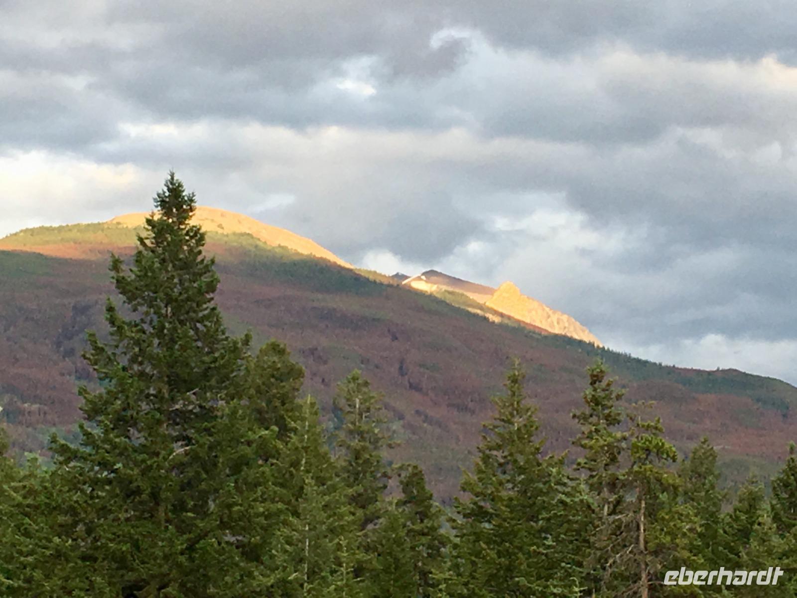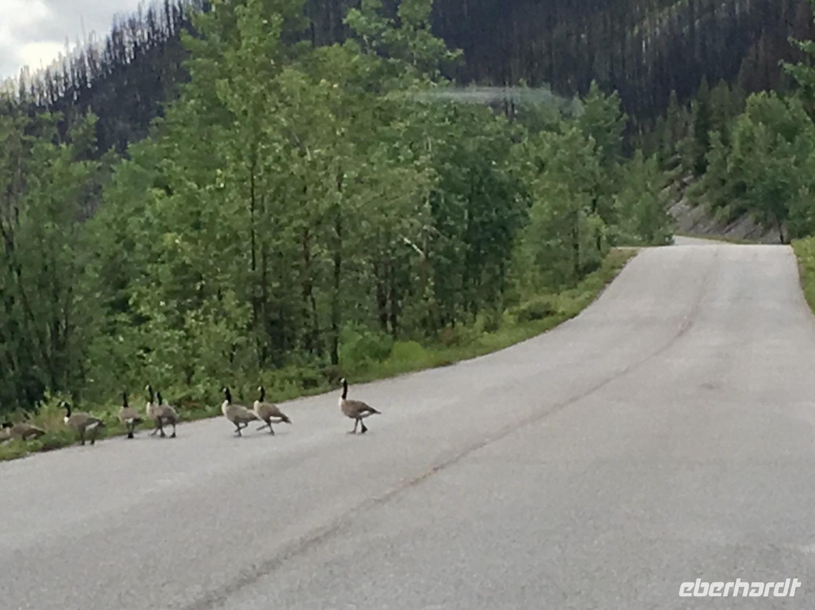 Nichts Schoeneres als aufwachen, in die Berge zu schauen und blauen Himmel zu sehen. Die meisten sind bereits um 6 Uhr in der Frueh unterwegs, um Fotos von dem rosafarbenen Victoria Gletscher zu erhaschen. Der See liegt ganz ruhig und die Spiegelung ist perfekt. Das Fruehstuecksbuffet ist wieder wunderbar, besonders die Smoothies, die wecken alle Geister. Vorerst fahren wir heute mit Hugh zur beruehmten Filmszene des Films Doktor Shiwago. Wir sehen sie fast, die gute Lara wie sie ihrem Omar Sherif zuwinkt. Nun gehts aber ab in Richtung Yoho National Park. Bei den Spiral Tunnels halten wir an, sehen leider gerade keinen Zug in dem Tunnelsystem, wir sind ja auch in Ka-na-da, aber wir schauen uns das Schauspiel auf einem Modell an. Was fuer eine wunderbare Fahrt nach Emerald Lake. Ehe wir beim See ankommen halten wir noch bei der Natuerlichen Bruecke. Unsere Kameras laufen heute auf Hochtouren, denn wir knipsen viele Bilder von der steinernen Naturbruecke die sich ueber den Kicking Horse River spannt und von den umliegenden Bergen. Bald sind wir bei Emerald Lake, er glitzert smaragdgruen wie auf den Postkarten. Beim See angekommen wollen wir nun gleich spazieren gehen. Auf der anderen Seite des Sees picknicken wir nun das Eingekaufte, Eberhardt spendiert heute das Dessert und den Whisky dazu. Zurueck im Bus ist nun Siesta-time angesagt. Erst bei Banff werden wir wieder geweckt da wir heute noch den Miniwanka und den Two Jack Lake anschauen moechten. Vielleicht sehen wir ja auch ein paar Krummhornschafe. Wir sind nicht die einzigen die spaet nachmittags auf eine Krummhornschaf-Pirsch gehen. Sogar Hugh, unser Fahrer, macht heute ein Foto. Nicht von den versteckten Krummhornschafen oder von den Seen, sondern von den vielen Autos die hier geparkt sind ! Es ist ein sonniger warmer Tag heute und alle stroemen zu den Seen. So haben sich die Krummhornschafe auch verzogen und wir geniessen die Sicht auf das schoene Panorama. Nun gehts weiter nach Banff hinein, wo wir auch aussteigen koennen um uns dieses niedliche Bergdorf anzuschauen. Unterdessen checkt Elisabeth uns im Hotel ein, organisiert die Koffer und Taschen und trifft uns danach wieder im Dorf. Wir fahren dann gemeinsam in einem Bus zum Hotel und einige unter uns besuchen danach auch gleich die Thermalbaeder. Das Abendessen ist heute in einem eigenen Saal mit wunderbarer Aussicht. Der Steak ist der Menu-Sieger des Tages und der offerierte kanadische Wein schmeckt auch sehr fein dazu. Danke Eberhardt ! So schnell wird es 10 Uhr nachts und draussen ist es noch taghell. Ein wunderschoener Tag in den Rocky Mountains verabschiedet sich bald und die grossen Zimmer mit herrlicher Sicht auf Mount Rundl rufen uns schon. Gute Nacht und schoene Traeume von smaragdgruenen Seen.