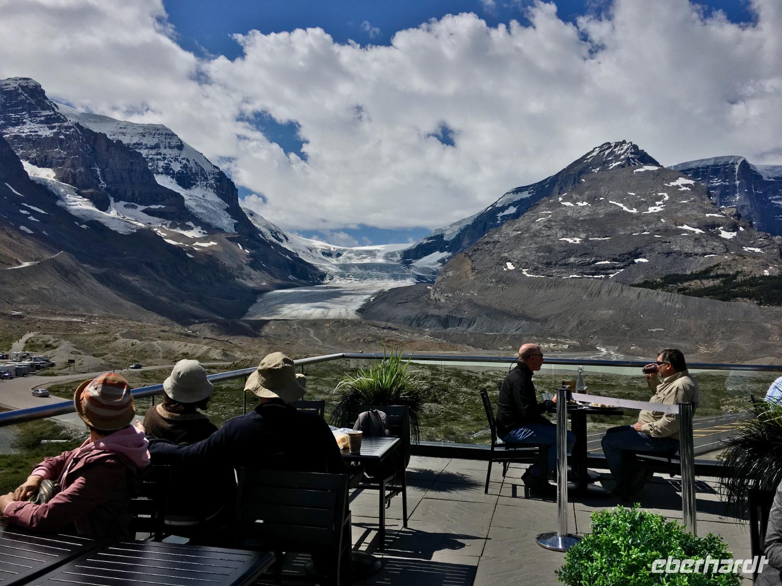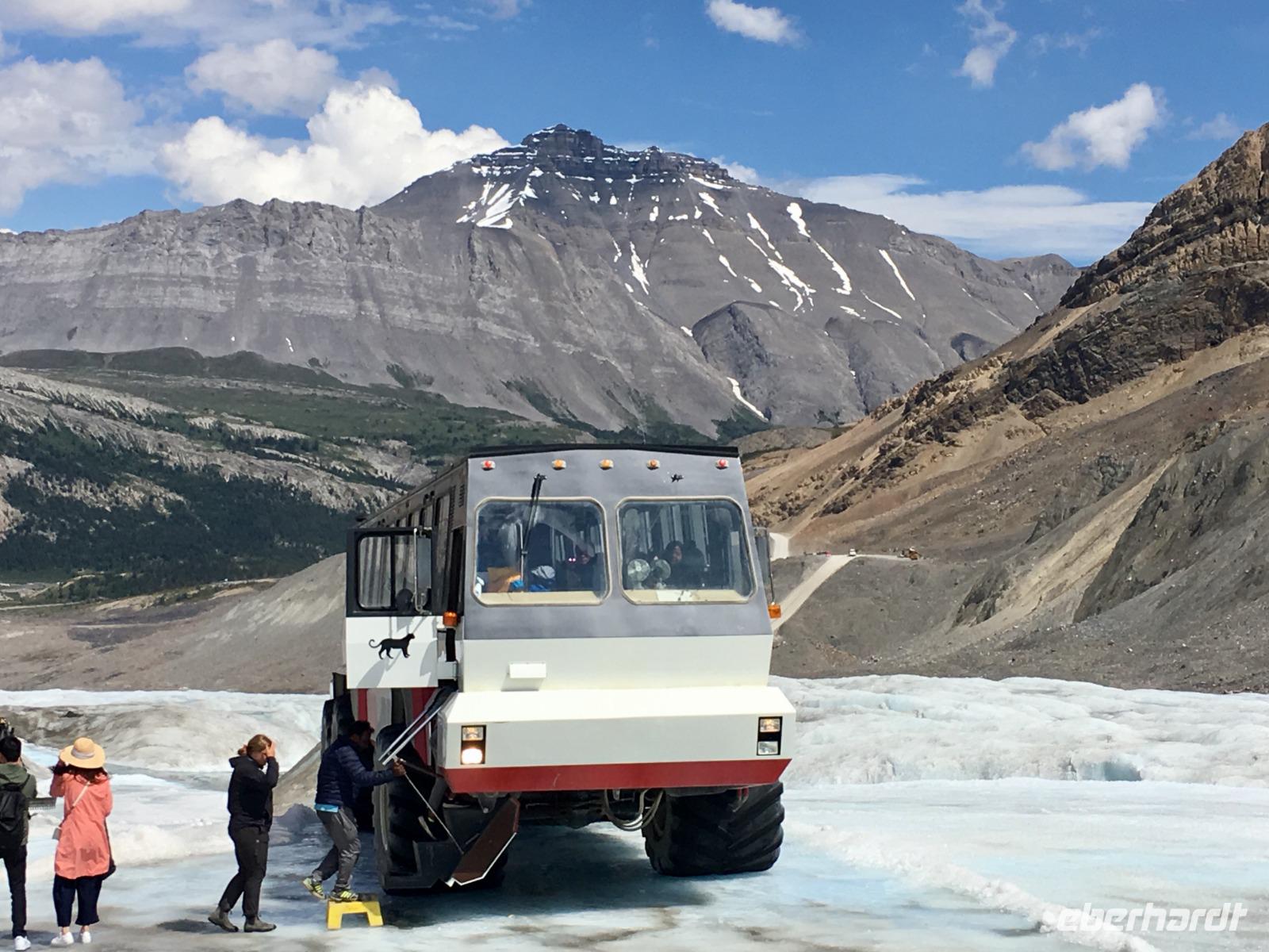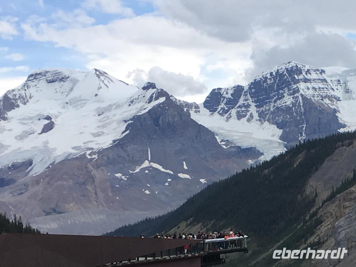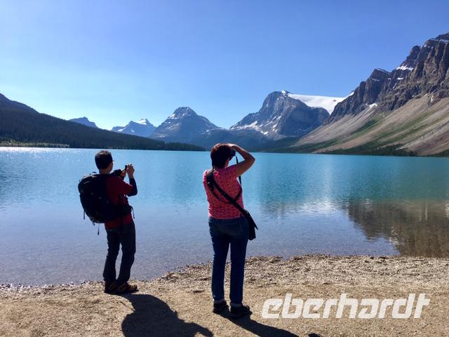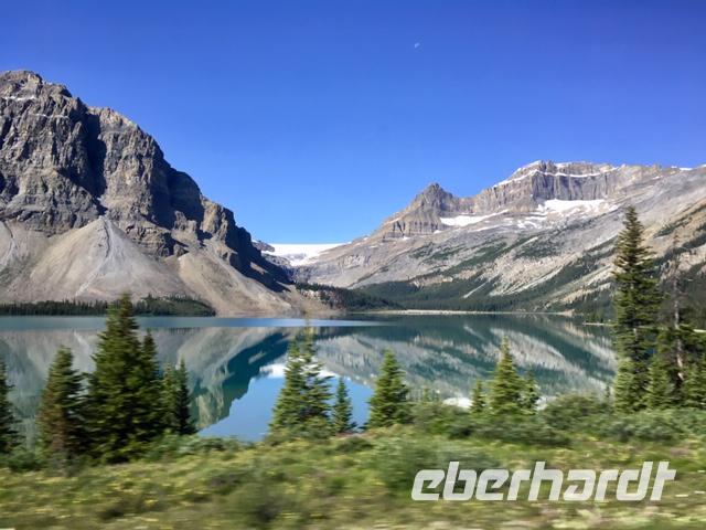 Heute fahren wir bei praechtigstem Sonnnschein auf die beruehmte Icefield Parkway. Diese Strasse gehoert zu den schoensten Strassen der Welt und wir geniessen die maechtigen Berge die sich hier aneinander reihen. Tuerkisblaue Seen liegen still im Walde und glitzernde Gletscher schauen auf uns herunter. Heute hoeren wir einiges ueber die Kultur der Ersten Nationen, ueber den Goldrausch in BC und Yukon, ueber die Chinesen und deren Leben in BC und die legendaere berittene Polizei. Ploetzlich haelt Hugh den Bus an, wir stehen schon vor unserem ersten Gletscher. Der Kraehenfuss-Gletscher. Das ist ein toller Fotostop. Gleich danach steigen wir wieder aus um vom Bow See in den Bann gezogen zu werden. Wir knipsen die allerschoensten Fotos von Bow Lake und seinem Gletscher. Viele machen auch den Iphone-Fotokurs mit, denn mit dieser perfekten Spiegelung und den bunten Steinen im Wasser bietet sich das an. Bald muessen wir jedoch wieder weiter, denn der Weg zum Columbia Icefeld ist noch eine atemberaubende Stunde entfernt. Vorerst gibts jedoch noch einen Halt, denn der Peto Lake will mit seiner Farbe alle anderen Seen uebertrumpfen. Ja, es gelingt ihm heute ganz deutlich. Liebe Leser, schauen Sie sich die Bilder von Peto Lake an ich bin gespannt ob Sie dieselbe Bewertung geben. Wir koennen unser Glueck kaum fassen, denn das Wetter spielt so herrlich mit, dass wir einfach begeistert sind von den tollen Ansichten. Der Hoehepunkt des heutigen Tages kommt nahe. Uns erwartet eine Fahrt mit dem Icecoach auf dem Athabasca Gletscher des Columbia Eisfeldes. Es ist ein wunderbares Erlebnis hier oben auf dem ewigen Eis zu stehen. Die Flaeschen werden nun mit dem Ewig-jung-Wasser gefuellt ehe es wieder Zeit wird mit dem Cruiser zum Besucherzentrum zurueck zu kehren. 5 koreanische Gaeste haben jedoch in «unserem» Cruiser Platz genommen und sie koennen es einfach nicht vestehen, weshalb sie nun wieder aussteigen sollten um «ihren» Cruiser zu finden. Nach langer Diskussion verlassen sie den Bus und alle Gaeste haben nun Platz sich zu setzen. Zurueck im Besucherzentrum besteigen wir einen anderen Bus um auf einer glaesernen Terrasse, welche hoch ueber einem Tal gelegen ist, unseren Mut zu testen. Bestanden, zurueck zum Ausgangspunkt und weiter zu Hugh. Noch eine kleine Kaffeepause bei Stewart und dann gehts direkt nach Jasper. Ploetzlich sehen wir Autos auf der Autobahn stehen, wir fahren langsam vorbei und erblicken auf der linken Seite des Busses einen Schwarzbaer. Ach wie lieblich er doch ausschaut. Nicht viel weiter sehen wir eine ganze Herde Wapiti-Damen mit ihren Zoeglingen, sie grasen alle geduldig neben der Autobahn. Bald danach gelangen wir in unsere Jasper Park Lodge. Ein wahrlich schmuckes 5 Sterne-Hotel, aus vielen Bungalows bestehend, mit seinem eigenen Bergsee und einer wunderbaren Sicht auf die Bergwelt. Das Abendessen schmeckt heute auch ganz vorzueglich und wir bleiben gerne 10 Tage .........ah, so sorry, 2 Naechte hier.