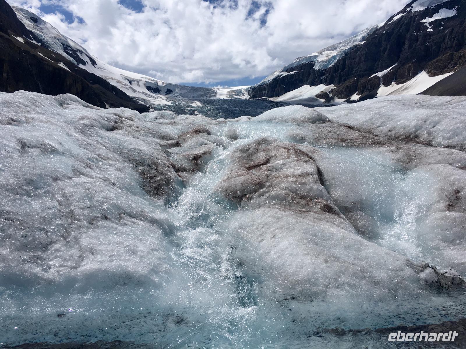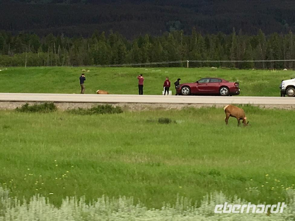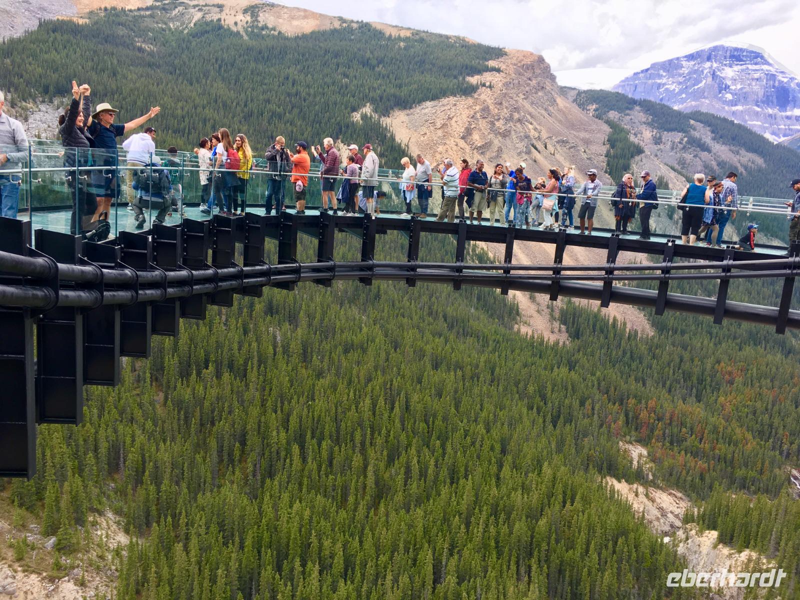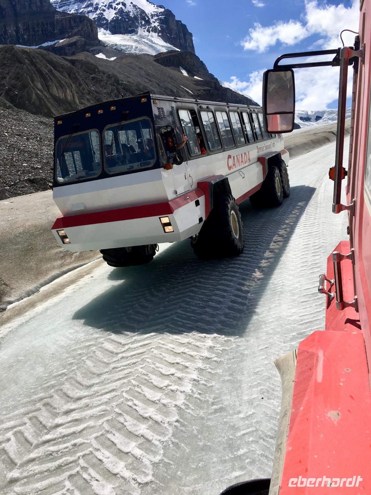Heute fahren wir bei praechtigstem Sonnnschein auf die beruehmte Icefield Parkway. Diese Strasse gehoert zu den schoensten Strassen der Welt und wir geniessen die maechtigen Berge die sich hier aneinander reihen. Tuerkisblaue Seen liegen still im Walde und glitzernde Gletscher schauen auf uns herunter. Heute hoeren wir einiges ueber die Kultur der Ersten Nationen, ueber den Goldrausch in BC und Yukon, ueber die Chinesen und deren Leben in BC und die legendaere berittene Polizei. Ploetzlich haelt Hugh den Bus an, wir stehen schon vor unserem ersten Gletscher. Der Kraehenfuss-Gletscher. Das ist ein toller Fotostop. Gleich danach steigen wir wieder aus um vom Bow See in den Bann gezogen zu werden. Wir knipsen die allerschoensten Fotos von Bow Lake und seinem Gletscher. Viele machen auch den Iphone-Fotokurs mit, denn mit dieser perfekten Spiegelung und den bunten Steinen im Wasser bietet sich das an. Bald muessen wir jedoch wieder weiter, denn der Weg zum Columbia Icefeld ist noch eine atemberaubende Stunde entfernt. Vorerst gibts jedoch noch einen Halt, denn der Peto Lake will mit seiner Farbe alle anderen Seen uebertrumpfen. Ja, es gelingt ihm heute ganz deutlich. Liebe Leser, schauen Sie sich die Bilder von Peto Lake an ich bin gespannt ob Sie dieselbe Bewertung geben. Wir koennen unser Glueck kaum fassen, denn das Wetter spielt so herrlich mit, dass wir einfach begeistert sind von den tollen Ansichten. Der Hoehepunkt des heutigen Tages kommt nahe. Uns erwartet eine Fahrt mit dem Icecoach auf dem Athabasca Gletscher des Columbia Eisfeldes. Es ist ein wunderbares Erlebnis hier oben auf dem ewigen Eis zu stehen. Die Flaeschen werden nun mit dem Ewig-jung-Wasser gefuellt ehe es wieder Zeit wird mit dem Cruiser zum Besucherzentrum zurueck zu kehren. 5 koreanische Gaeste haben jedoch in «unserem» Cruiser Platz genommen und sie koennen es einfach nicht vestehen, weshalb sie nun wieder aussteigen sollten um «ihren» Cruiser zu finden. Nach langer Diskussion verlassen sie den Bus und alle Gaeste haben nun Platz sich zu setzen. Zurueck im Besucherzentrum besteigen wir einen anderen Bus um auf einer glaesernen Terrasse, welche hoch ueber einem Tal gelegen ist, unseren Mut zu testen. Bestanden, zurueck zum Ausgangspunkt und weiter zu Hugh. Noch eine kleine Kaffeepause bei Stewart und dann gehts direkt nach Jasper. Ploetzlich sehen wir Autos auf der Autobahn stehen, wir fahren langsam vorbei und erblicken auf der linken Seite des Busses einen Schwarzbaer. Ach wie lieblich er doch ausschaut. Nicht viel weiter sehen wir eine ganze Herde Wapiti-Damen mit ihren Zoeglingen, sie grasen alle geduldig neben der Autobahn. Bald danach gelangen wir in unsere Jasper Park Lodge. Ein wahrlich schmuckes 5 Sterne-Hotel, aus vielen Bungalows bestehend, mit seinem eigenen Bergsee und einer wunderbaren Sicht auf die Bergwelt. Das Abendessen schmeckt heute auch ganz vorzueglich und wir bleiben gerne 10 Tage .........ah, so sorry, 2 Naechte hier.