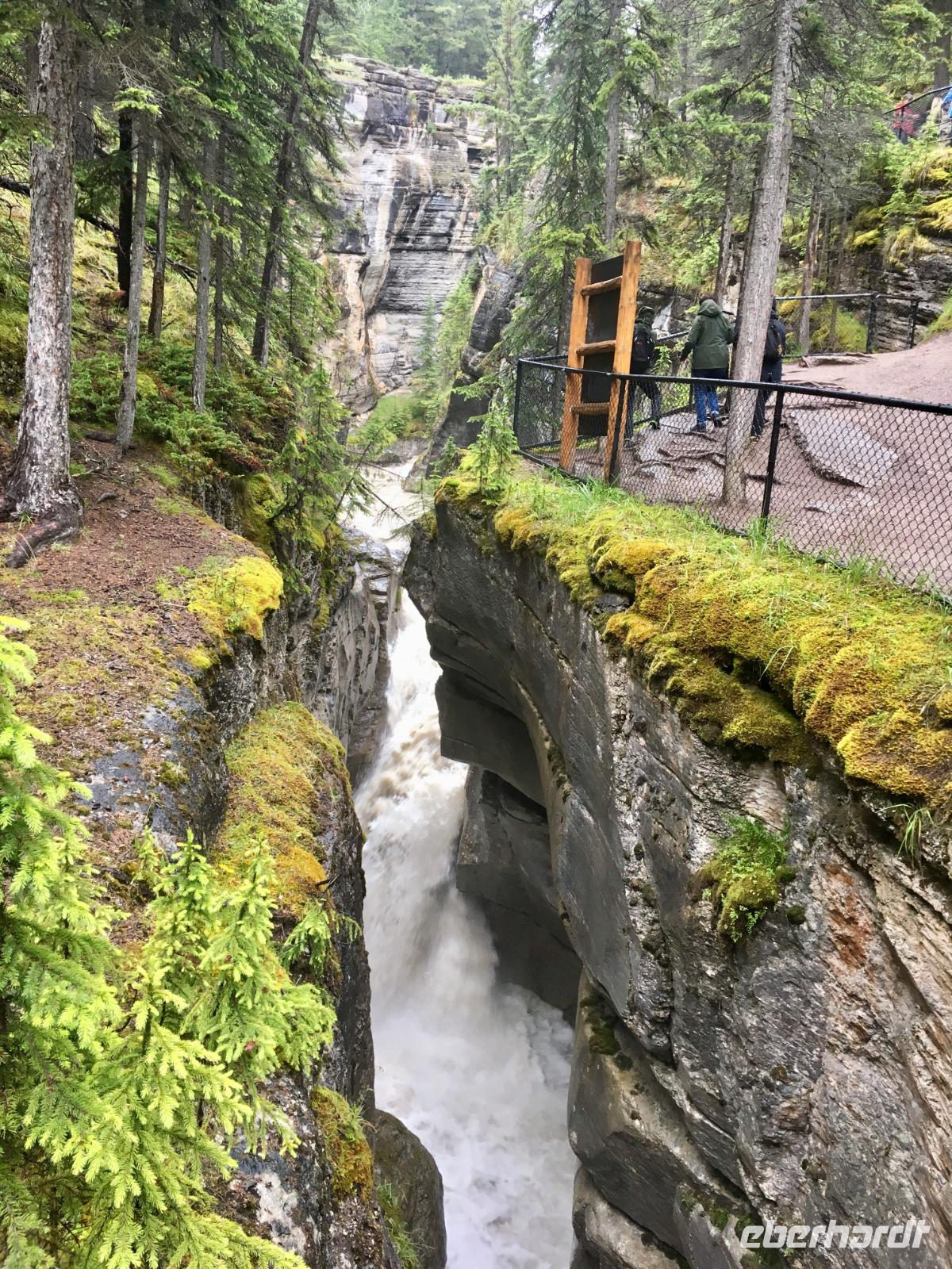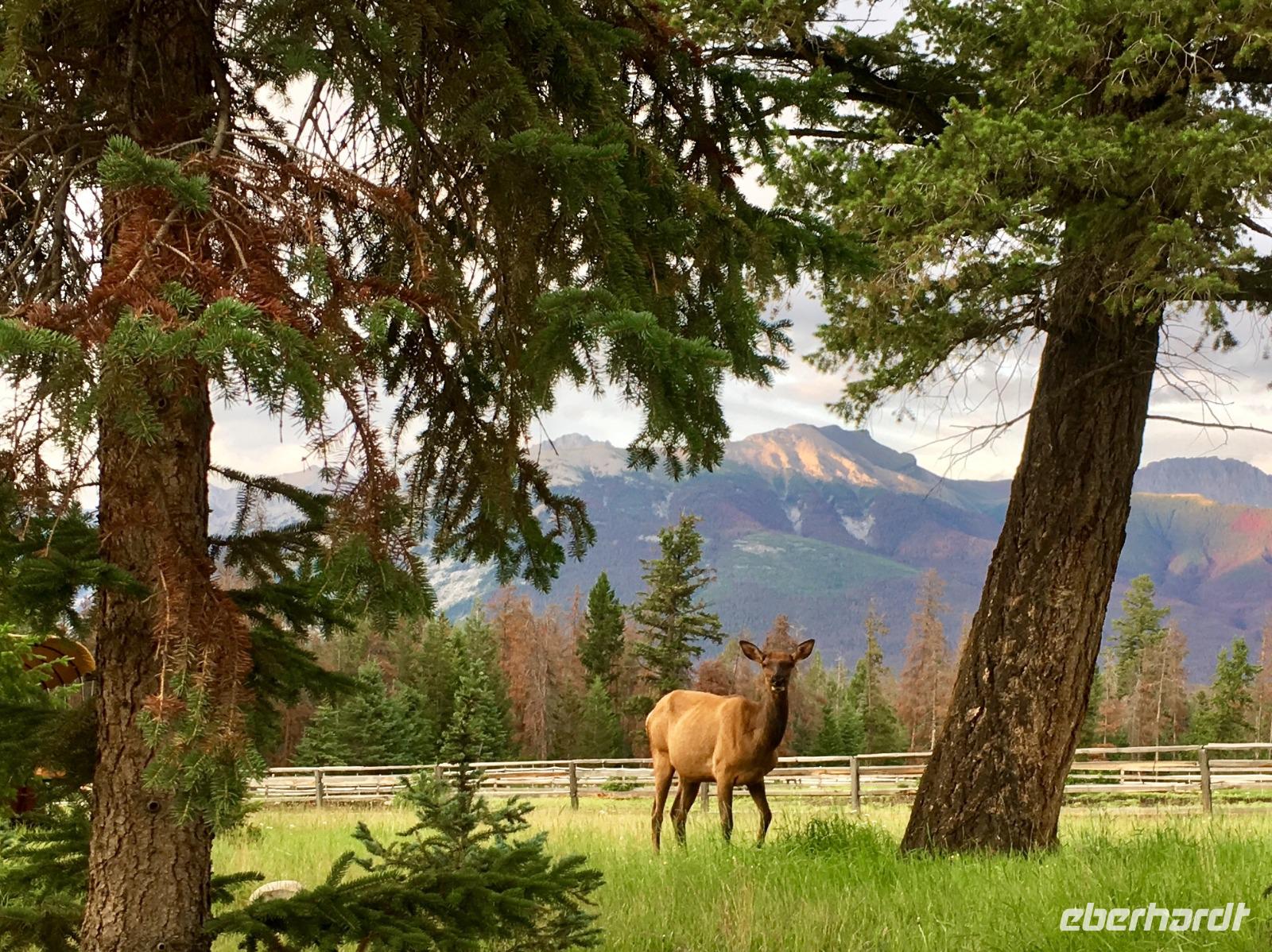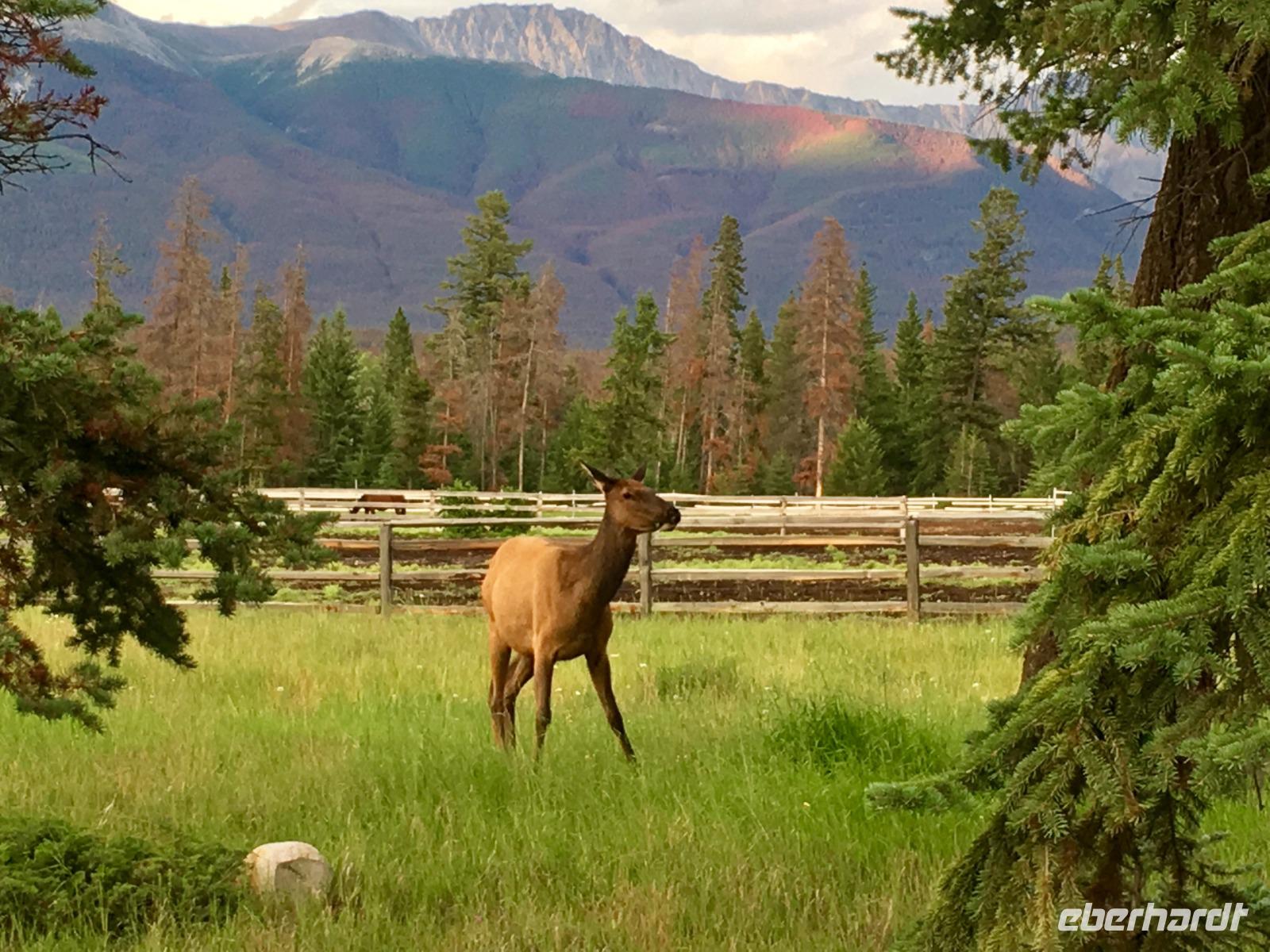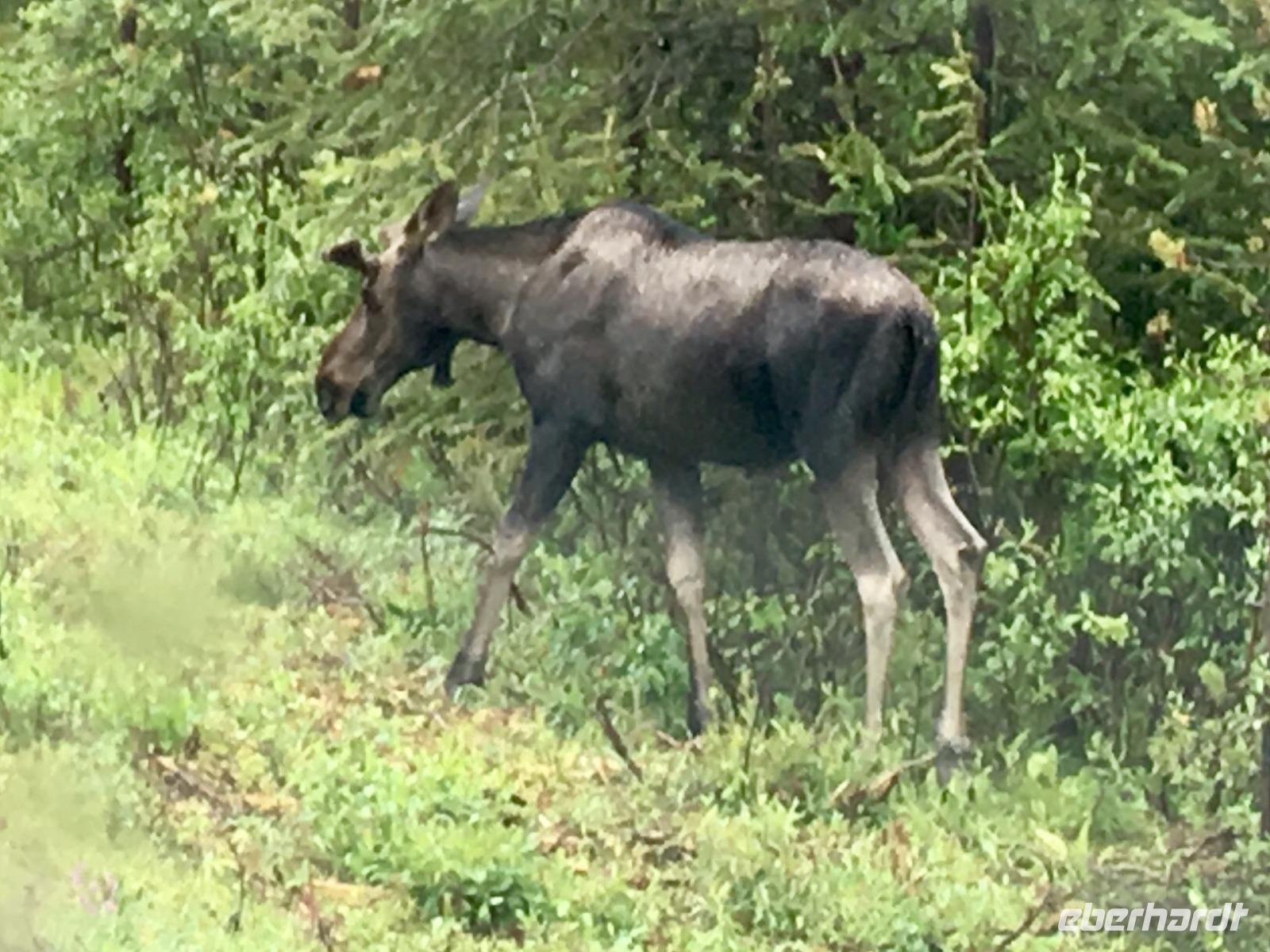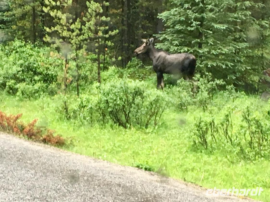 Miten in der Nacht ueberrasche ich mich selbst. Stehend im Bett, es blitzt und donnert, das Zimmer wird taghell erleuchtet und das Zischen des Blitzes erschrickt auch den tiefst schlafenden Baeren. 10 Minuten spaeter ist das Spektakel vorbei und die Traeume nebeln mich wieder ein. In diesem Hotel (zu normalen Weckzeiten !) aufwachen zu duerfen ist ein Erlebniss fuer sich. Die Ruhe, der stille See, die Loonies auf dem Wasser und Voegel die um die Wette zwitschern, schaut so das Paradies aus ? Die Wolken die den weiten Himmel bedecken, schauen sehr nach Regen aus, aber nichts laesst uns von unserem Tag abhalten. Nach dem wunderbaren Fruehstueck im Orso Restaurant mit der schoenen Aussicht auf den See, werden wir von Koshi 33, dem heutigen Fahrer, zum Maligne See fahren. Schon nach 20 Minuten Fahrt halten wir, da wir eine kleine Wanderung unternehmen wollen. Es ist bewoelkt und wir spazieren entlang des Maligne Flusses, bestaunen seine Schlucht und die 3 tollen Wasserfaelle. Gemeinsam gehts nun mit Koshi weiter zum Maligne See, dort steht auch schon unser Schiff bereit. Es schuettet nun wieder in Stroemen aber die Wolken liegen tief, sodass wir doch die Bergspitzen teilweise sehen koennen. Der Hoehepunkt dieser Schiffahrt ist Spirit Island. Die Insel der Einsicht ist eigentlich eine Halbinsel so wunderschoen und eindruecklich, dass es das meist fotografierte Motiv der Rockies ist. Man muss es einfach erlebt haben um die Schoenheit richtig zu erkennen. Kein Bild, in Sonne oder Regen kann die Emotion festhalten. Auf der Rueckfahrt nach Jasper sehen wir ihn, ein Moose-Junge. Er ist nun 2 Jahre alt und noch nicht ausgewachsen. Mit seinen langen Beinen stapft er schlaksig dem Strassenrand entlang auf der ewigen Suche von feinen Pilzchen und jungen Busch-Schuesslingen. Spaeter sehen wir auch noch das Weisskopfadler-Nest. Geladen mit neuen Eindruecken fahren wir nun gleich zurueck in die wunderschoene Jasper Park Lodge. Es hat nun aufgehoert zu regnen und viele unter uns, gehen auf den Spaziergang entlang des Beaupret-Sees gleich bei der Lodge. Danach fahren wir in den Ort hinein, machen ihn unsicher und landen danach im Pub wo wir schon eine Reservierung haben. Wir sitzen schoen im «in-Lokal» von Jasper und arbeiten uns krampfhaft durch die Bierkarte. Es ist naemlich eine Brauerei. Zuhause im schicken JPL gehen wir noch auf die Wapitisuche die uns auch gut gelingt. Schaut die Fotos an, es lohnt sich, besonders wenn man bedenkt, dass der Fotograf sich durch 1000 Moskitos gekaempft hat um die schoenen Bilder festzuhalten. Ohhh die weichen Betten rufen, jetzt aber schnell den Bierbauch und die verstochenen Beine schlafen legen, denn morgen in der Frueh gehts etwas zeitiger los.