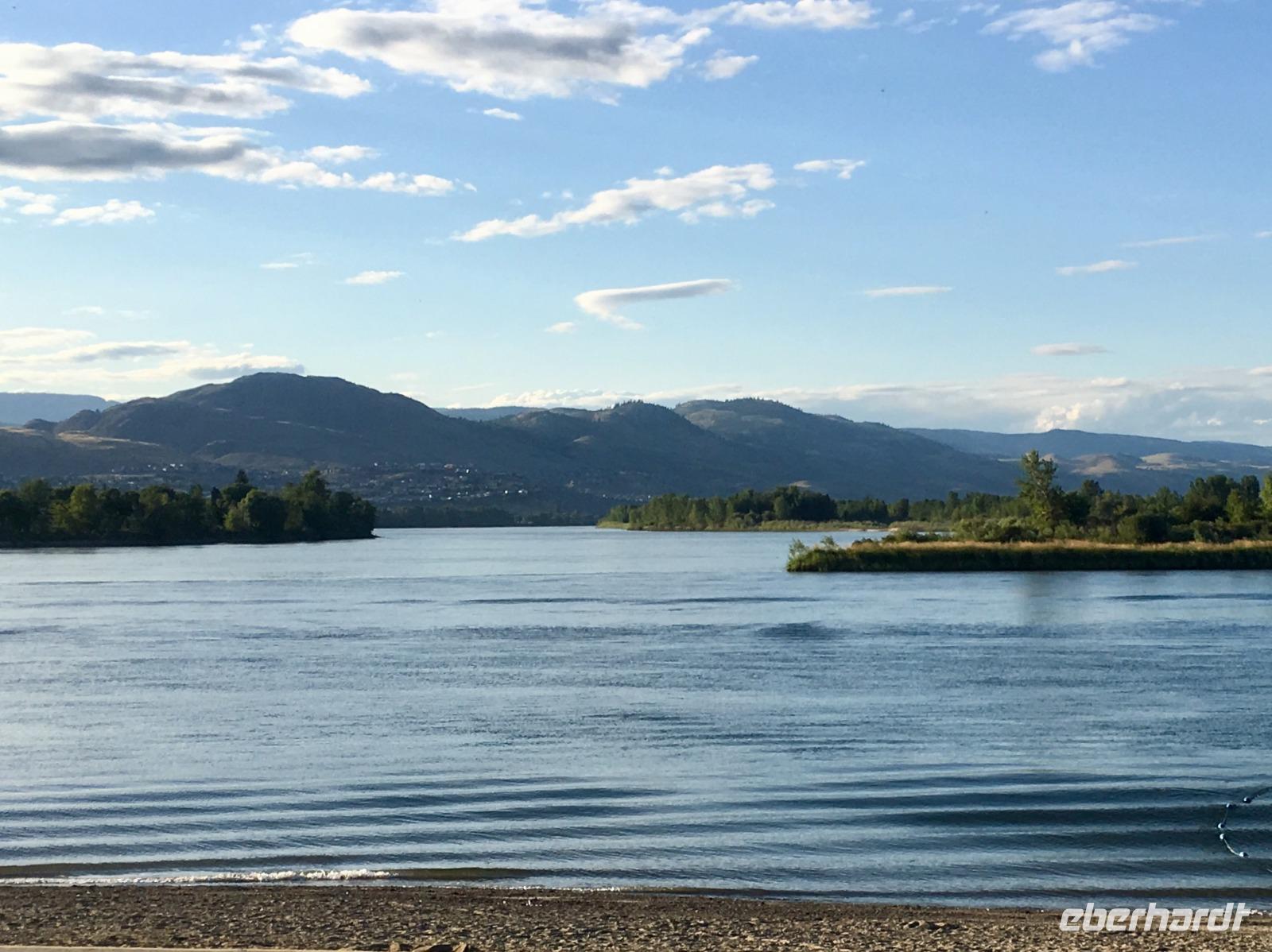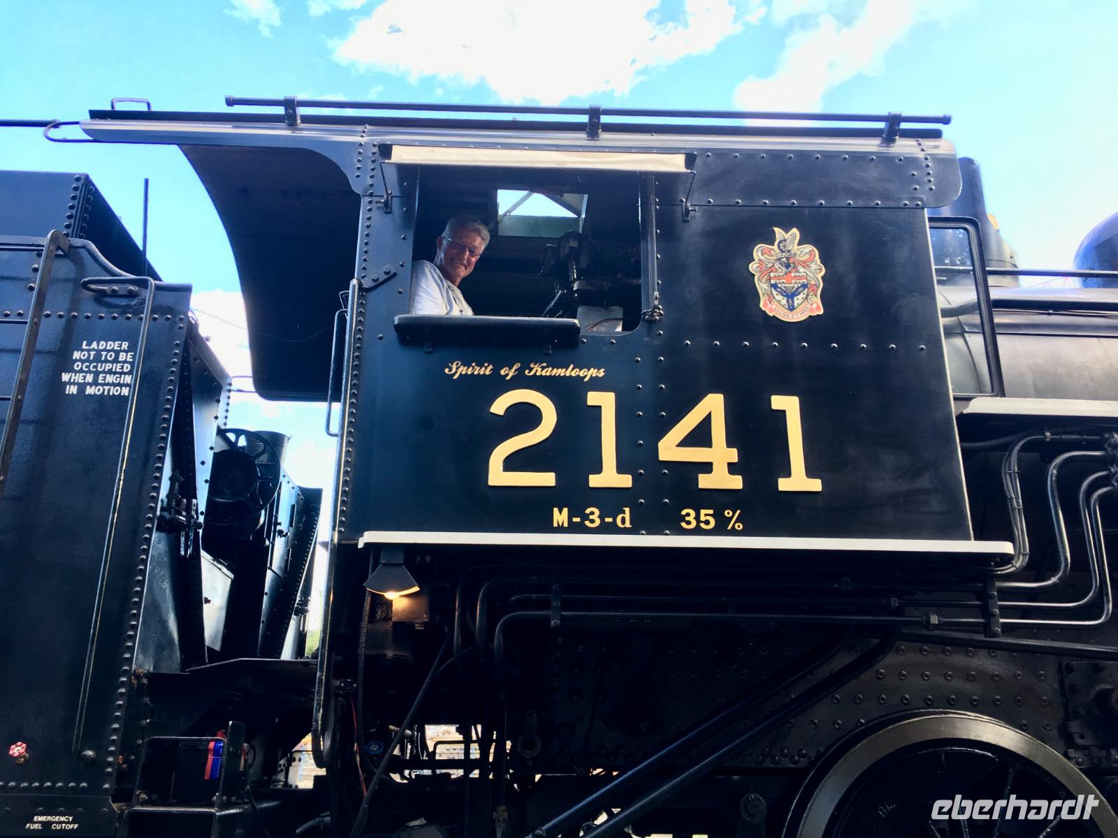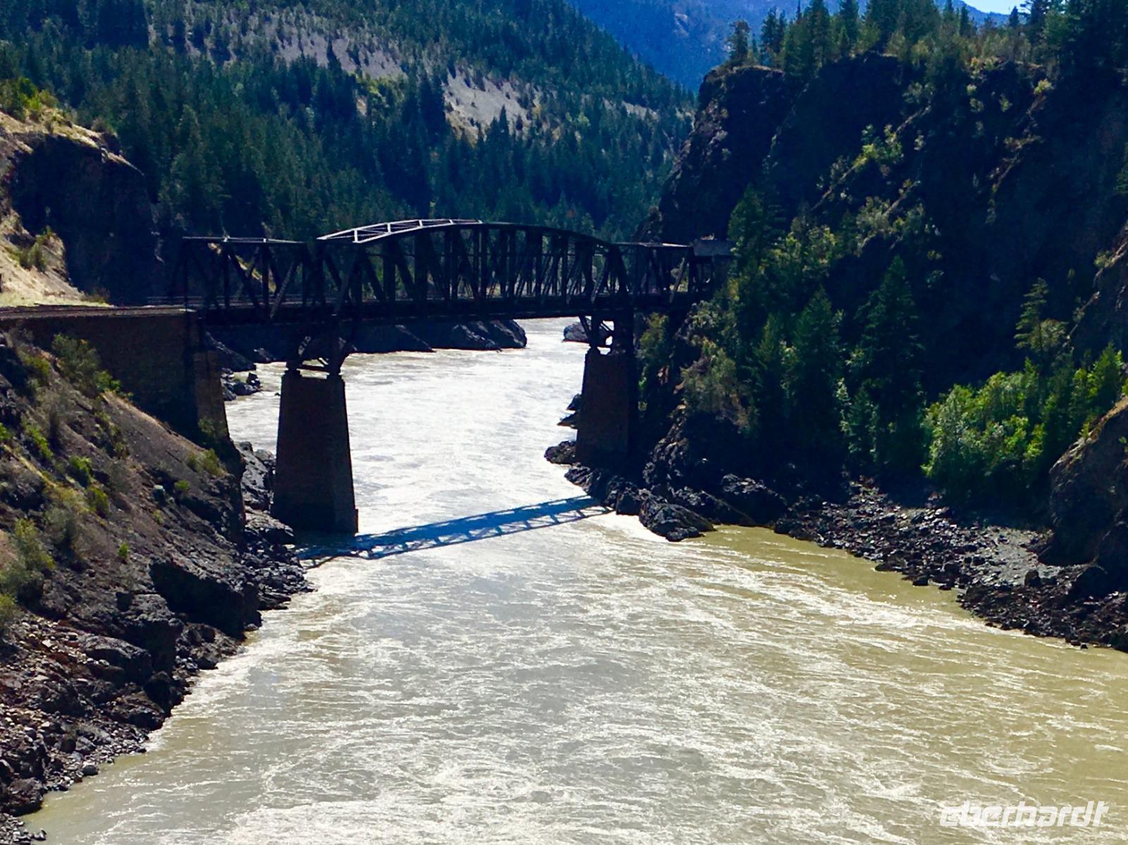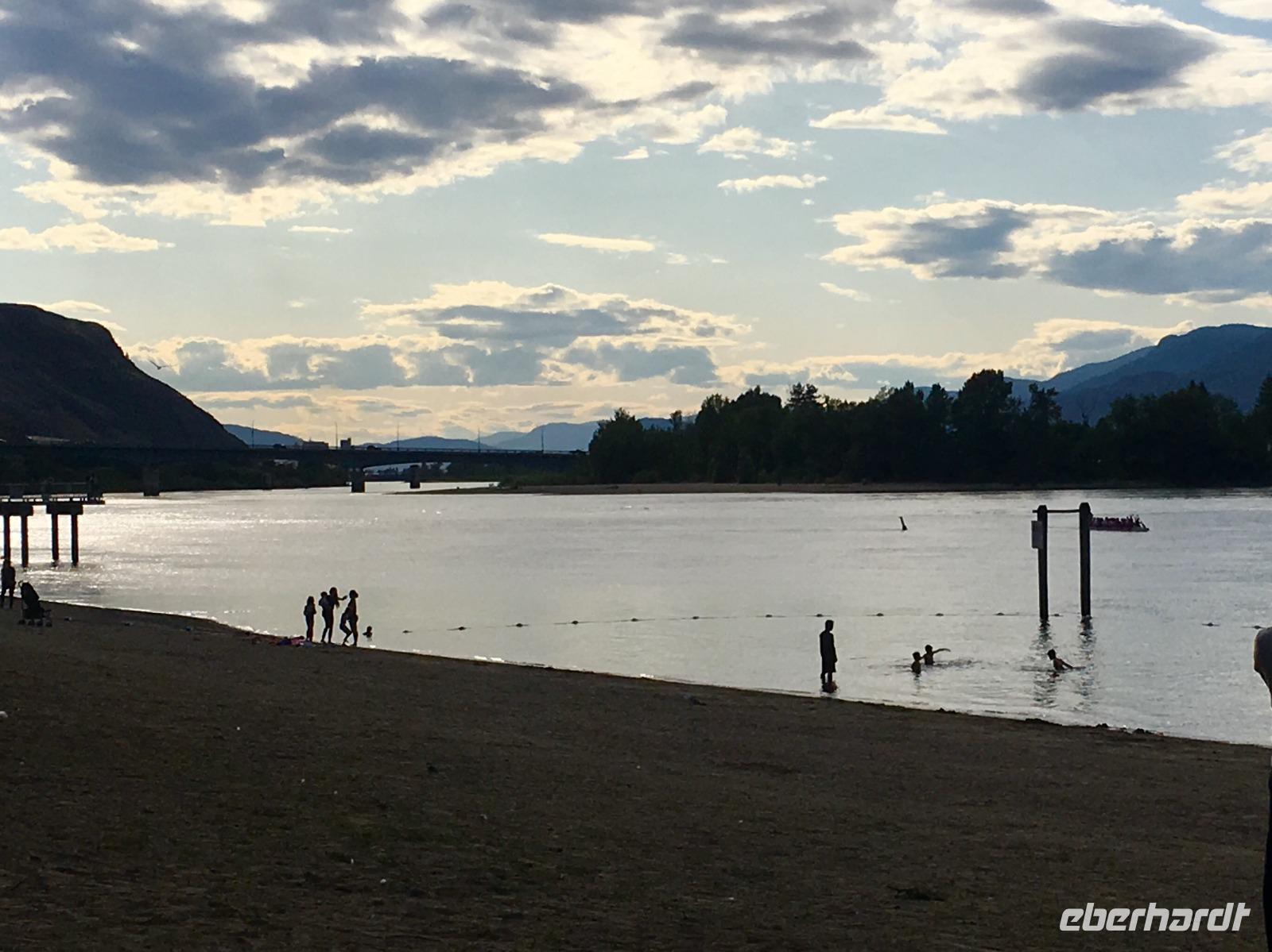 Die Sonne lacht, keine Wolke ist zu sehen, kein Ton zu hoeren. Halb verschlafen, besteigen wir den Bus, der uns zum Bahnhof von Jasper fuehrt. Heute beginnt ein ganz besonderer Teil unserer Reise. Denn fuer die naechsten 2 Tage fahren wir mit dem weltbekannten Rocky Mountaineer von Jasper nach Vancouver. Diese Bahnfahrt fuehrt uns heute aus den Rocky Mountains hinaus. Erst fahren wir, in einem Domwagen mit ledernen Sitzen, umhegt und vorzueglich betreut, ueber die Wasserscheide des amerikanischen Kontinents auf die westseite Kanadas. Vorbei an Bieberbauten verlassen wir nun Alberta und gelangen sang und klanglos nach Britisch Kolumbien. Ploetzlich ruft eine Zugbegleiterin, Baer to the right, Baer to the right. Alle Koepfe schnellen auf die rechte Seite (sprechen alle ploetzlich english ?) um den Schwarzbaeren zu sehen. Ruhe kehrt bald wieder ein und die naechste Aufregung ist das umstellen der Uhren. Der heutige Tag hat 25 Stunden, wir sind gerade wieder juenger geworden und haben eine Stunde mehr Spielzeit. Gelangen wir wieder in den Kindergarten wenn wir nun jahrelang gen Westen fahren ? Buegeln sich da alle Falten wieder glatt ? Item, der hoechste Berg Britisch Kolumbiens mit seinen 3954 Meter Hoehe ist auch heute bloss zu 2/3 zu sehen. Eine weisse Wolke umhuellt die Spitze des maechtigen Mount Robson. Von jetzt an werden die Berge immer niedriger, die Landschaft gruener und ueppiger. Der Fraser Fluss entspringt hier und biegt aber auch bald einmal gen Westen wobei wir suedlich fahren. Hier begegnen wir dem North Thompson Fluss der uns durch die Columbia Bergkette bis nach Kamloops begleitet. An Bord des Zuges werden wir verwoehnt wie Gott in Frankreich. Auf bequemen Sesseln sitzen wir in einem Panoramawagen. Draussen zieht die maechtige Natur vorbei wobei die chramanten, jungen Fahrtbegleiterinnen aus dieser Zugreise ein Erlebnis gestalten. Kulinarisch hochstehende Speisen schauen wie Bilder aus und werden begleitet von besten BC Weinen Gaumenfreude und Augenweide. Wir erfahren auch allerhand ueber Land und Leute dieses nun 150 Jahre alten Landes und warten immer mal wieder bis ein Gleis fuer die Weiterfahrt frei wird. Alle Gueterzuege der Canadien Pacific Railway haben Vorrang und sie fahren nicht nach einem Zeitplan. Wir sind bloss Gaeste auf diesen Schienen und so weiss man auch nie wann man genau ankommt. Zeit wird auf einmal unwichtig wir koennen so richtig loslassen und das Erlebnis dieser Zugreise einfach geniessen. In Kamloops beziehen wir unsere Zimmer in einem Hotel wo unsere Koffer bereits in den Zimmern stehen und gehen auch gleich zum Thompson Fluss hinunter. Nur eine unter uns geht in dem 18 graedigem Fluss schwimmen ehe wir auf der Seepromenade Kamloops spazieren gehen. Dieser Spaziergang und ein Bierchen spaeter, bringt uns wieder zurueck zu unseren Koffer.